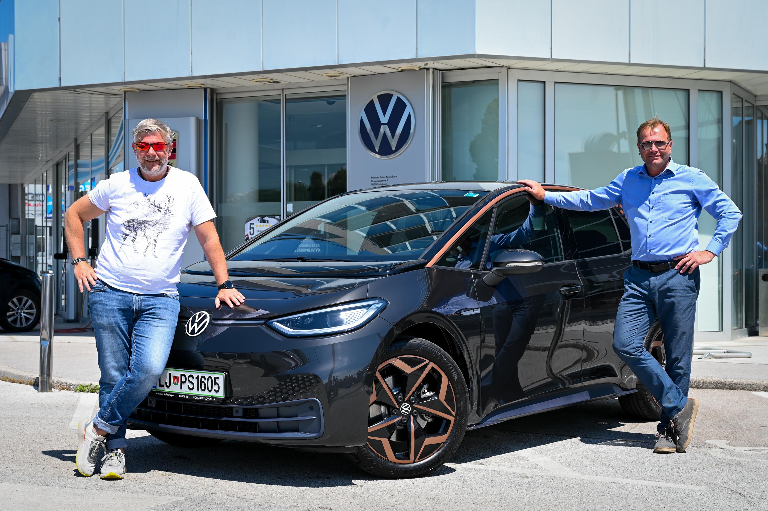 Odgovorni urednik Motorevije Blaž Poženel je ključe supertestnega modela volkswagen ID.3 pro v elegantni manganovo-sivi kovinski barvi z bakrenim okrasjem prejel iz rok Marka Škribe, direktorja znamke Volkswagen v podjetju Porsche Slovenija. Prvi mož slovenskega Volkswagna nam je avto v test predal z željo, da bomo v Motoreviji bralcem postregli z bogato vsebinsko izkušnjo, za katero je kot voznik električnega avtomobila prepričan, da bo v celoti zelo prepričljiva: