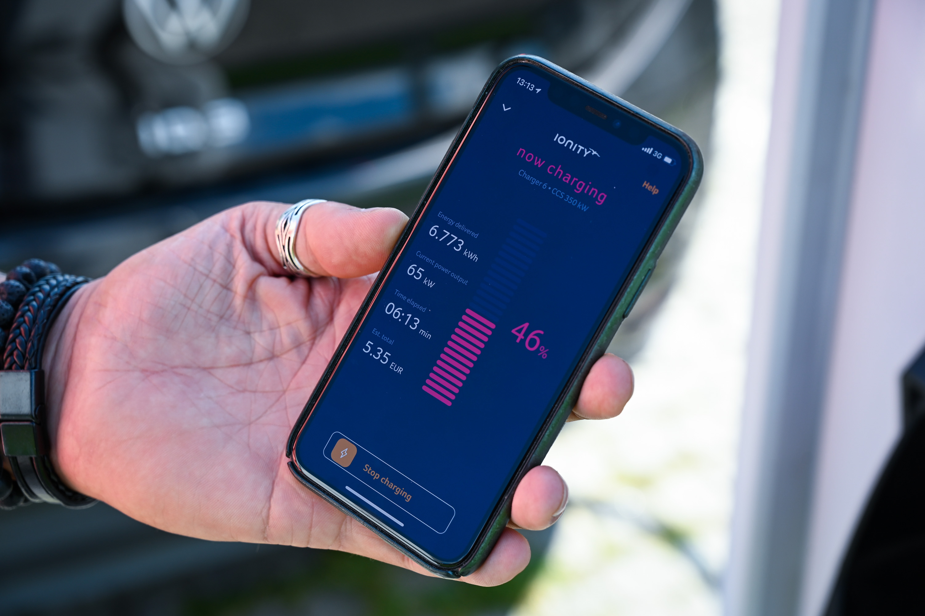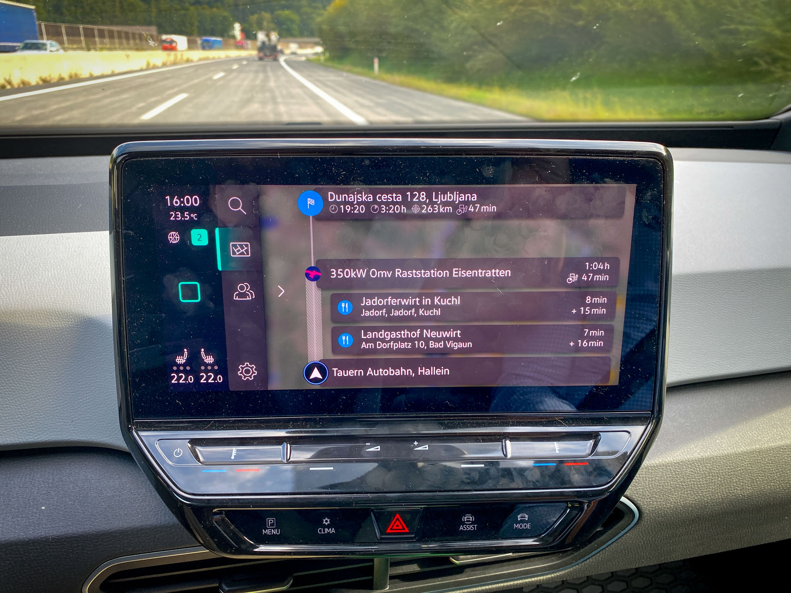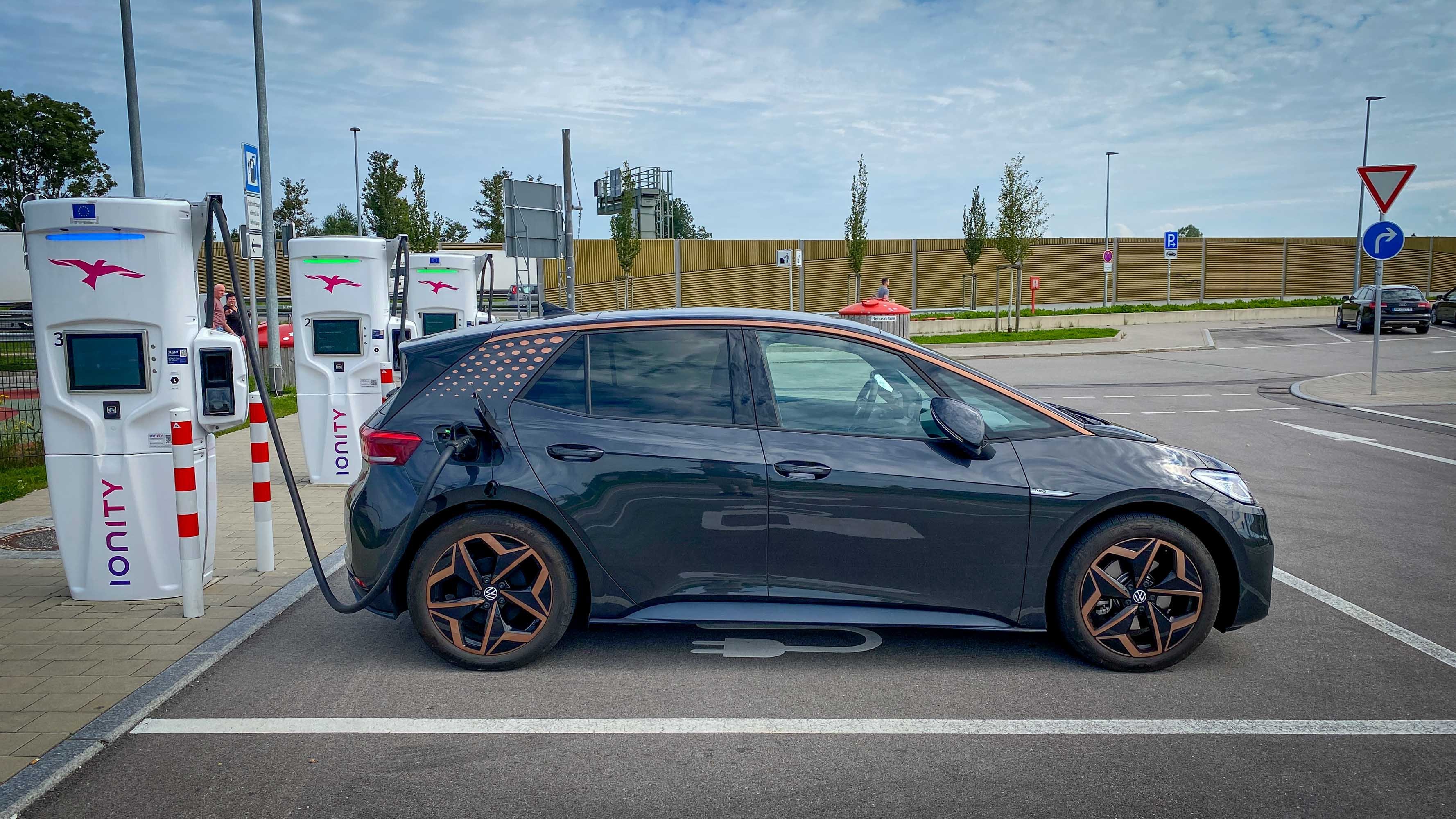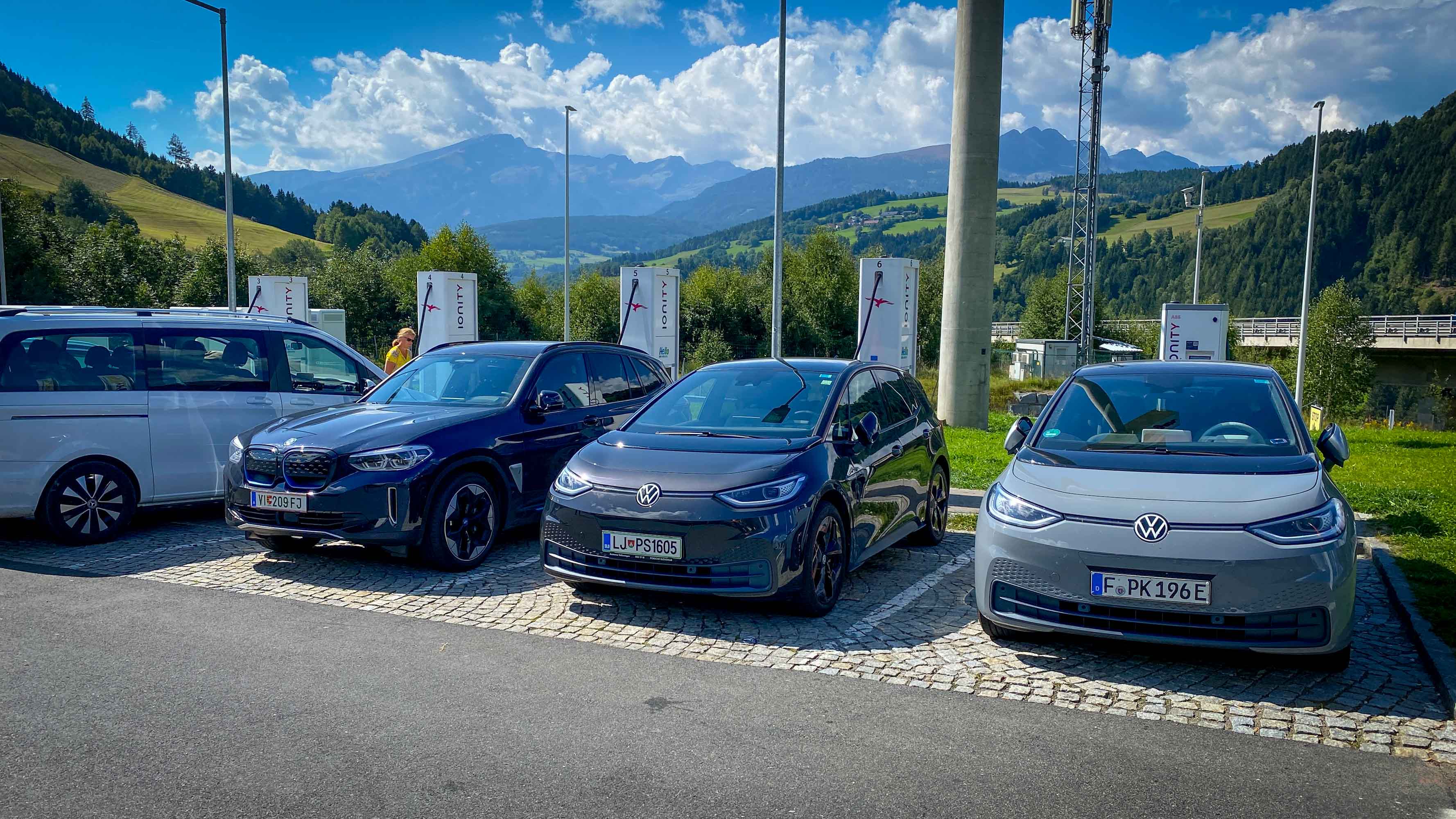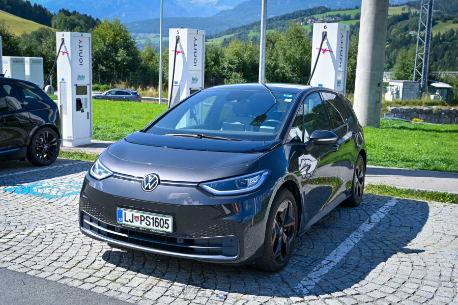 Potrdili smo navigacijski predlog našega električnega ID.3, ki je predvideval en polnilni postanek in se z malce negotovim občutkom odpeljali na pot s 86-odstotno zalogo elektrike v akumulatorju. Po 152 kilometrih vožnje smo se na avtocestnem počivališču Laggen blizu Gmünda ustavili na kosilu in še pred vzponom proti najvišji točki avtoceste A10 v smeri Salzburga ID.3 priključili na polnilnico Ionity. Ob priklopu je polnilna moč (na DC vtičnici) znašala znašala 92 kW, a je z zasedenostjo polnilnic in naraščanjem količine energije v akumulatorju hitro začela padati. V času kosila, natančneje v 54 minutah, smo v celoti napolnili energijsko shrambo ID.3. Pretočili smo 37,012 kWh elektrike in plačali 25,95 evra. Ob našem odhodu je bilo zasedenih vseh šest polnilnih mest, še štirje električni avtomobili pa so že čakali v vrsti na prosto vtičnico. Imeli smo srečo, saj bi lahko naš postanek, če bi prišli nekaj minut pozneje, trajal tudi precej dlje.