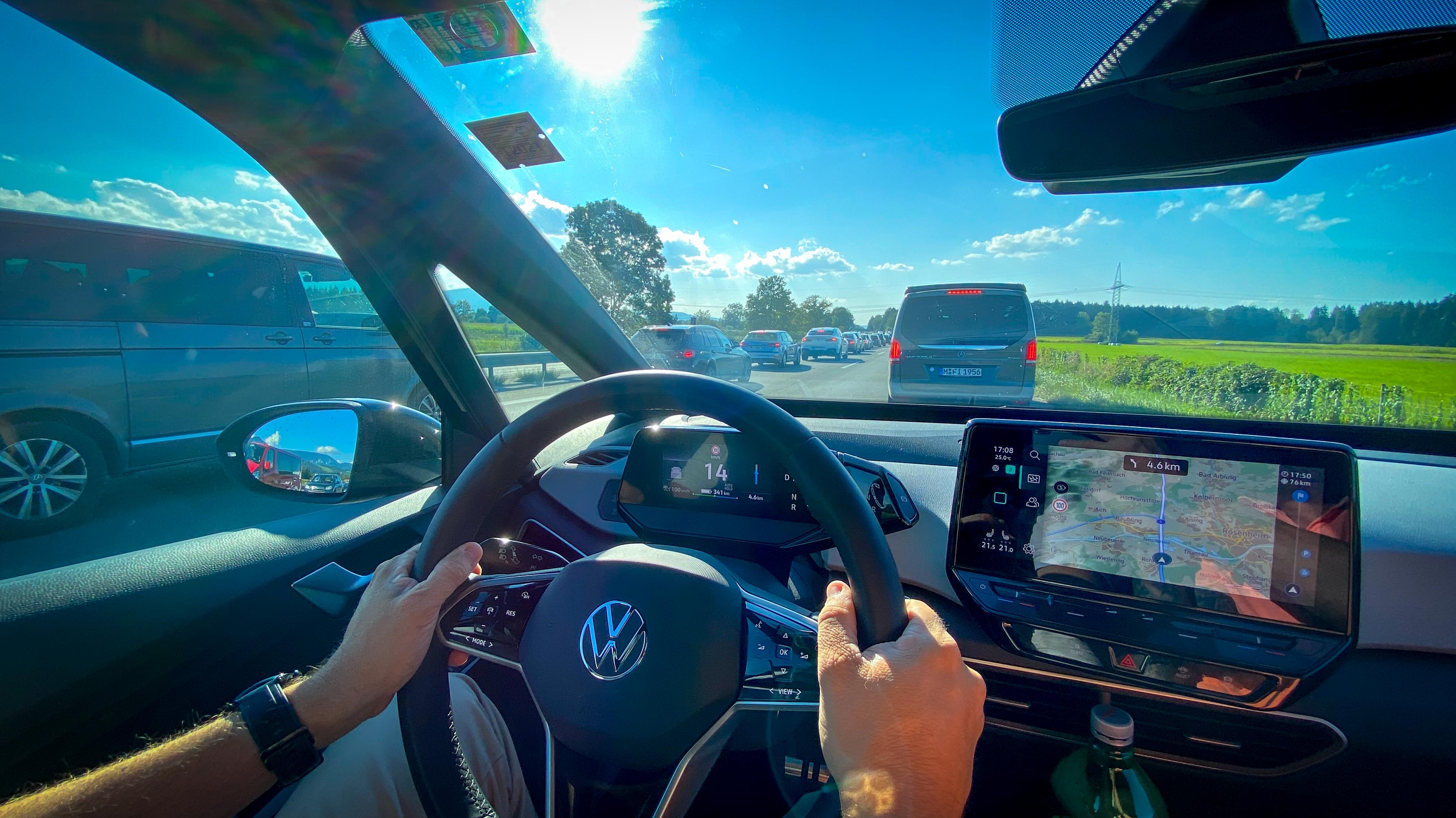 | Vožnja je na daljše razdalje ob pomoči Volkswagnovega potovalnega asistenta zelo udobna in predvsem v gostem prometu z zastoji zelo nestresna. ID.3 je odlično sledil prometu, v zastojih sam zaustavil in ponovno speljal. Umetna inteligenca zelo dobro združuje navigacijske podatke s prometnimi informacijami in neposrednim dogajanjem na cesti pred avtomobilom. V praksi to pomeni, da je že avto že pred zastojem začel zmanjševati hitrost, pravočasno je zaviral pred deli na cesti in glede na topografske podatke na spustih zaviral oziroma nastavljeno hitrost vzdrževal za čim boljši izkoristek rekuperacije. |