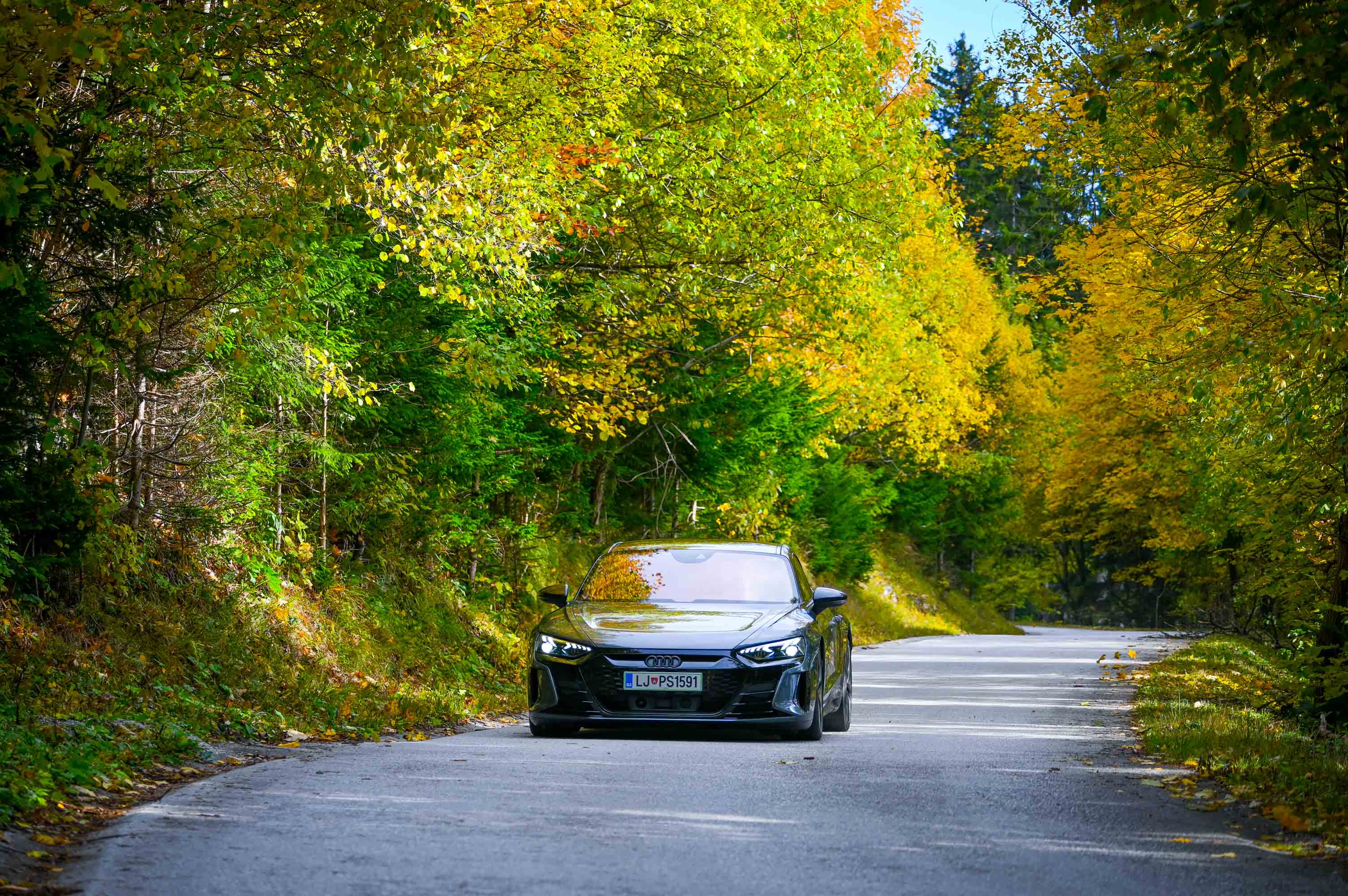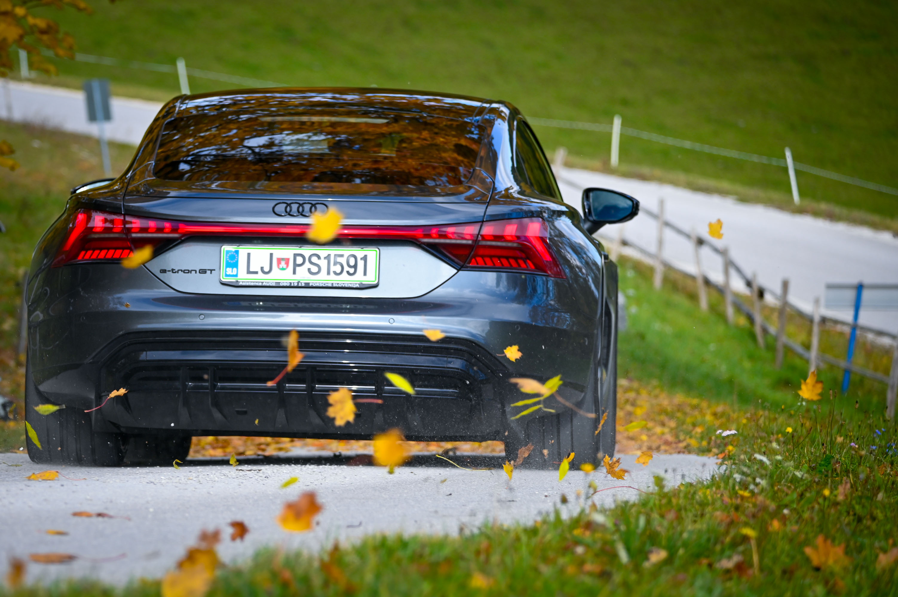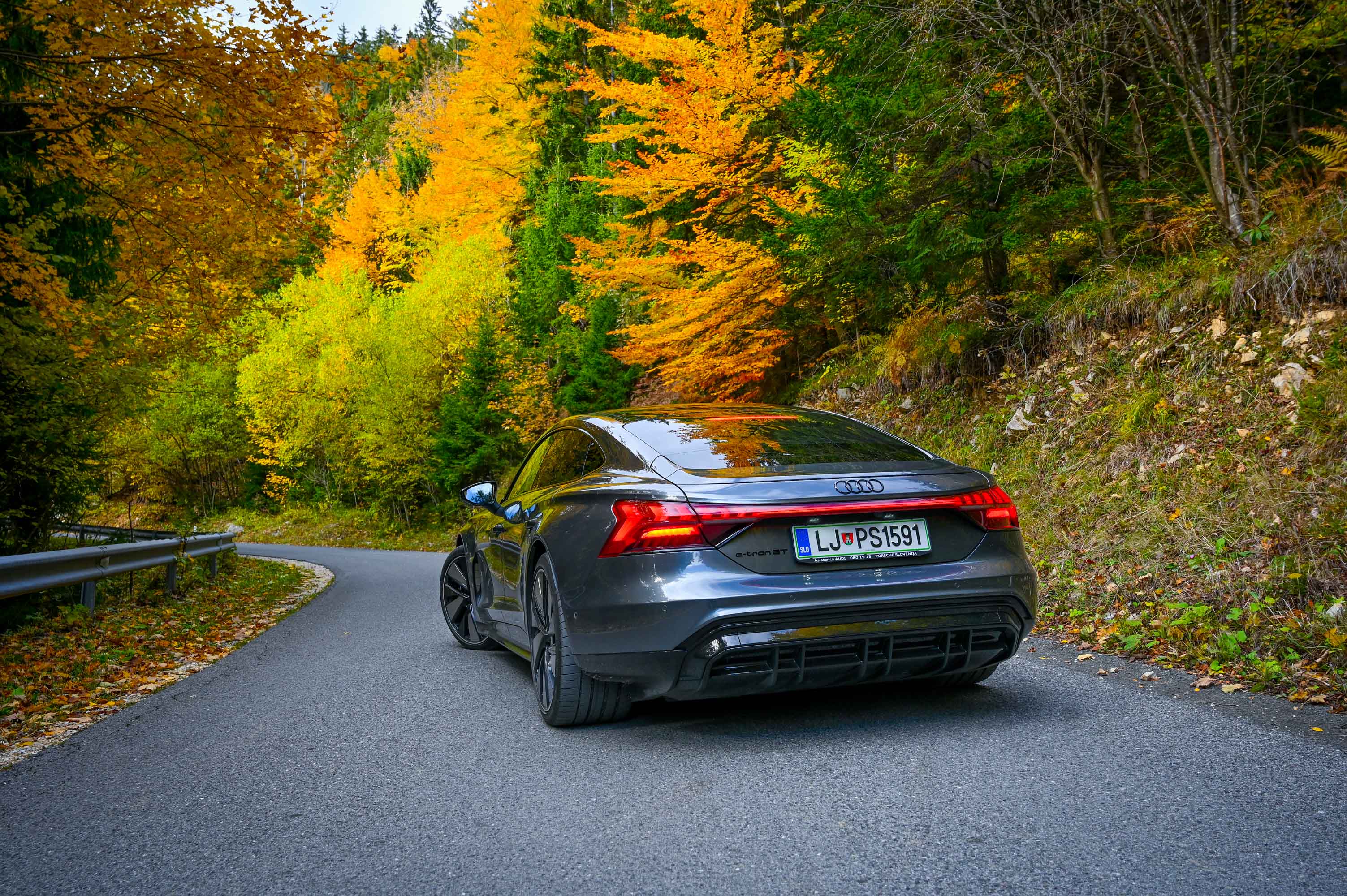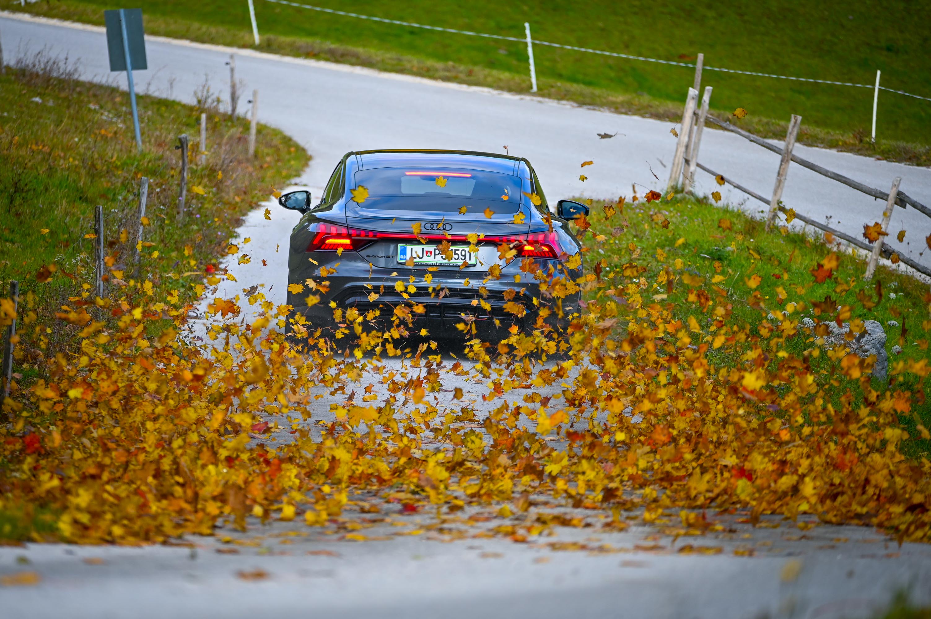 Ko smo v audiju e-tronu GT vklopili dinamični vozni program, je elektrika dobila nove razsežnosti. Zgodba o jeseni, ki naznanja konec nekega obdobja, je zažarela v najbolj čudovitih odtenkih. Potisk pri izhodu iz ovinka v naslednjo kratko ravnino je tako silovit, da je zračni tok izpod orjaškega difuzorja odpadlo listje razpihal skoraj do višine prvih vej drevesnih krošenj.