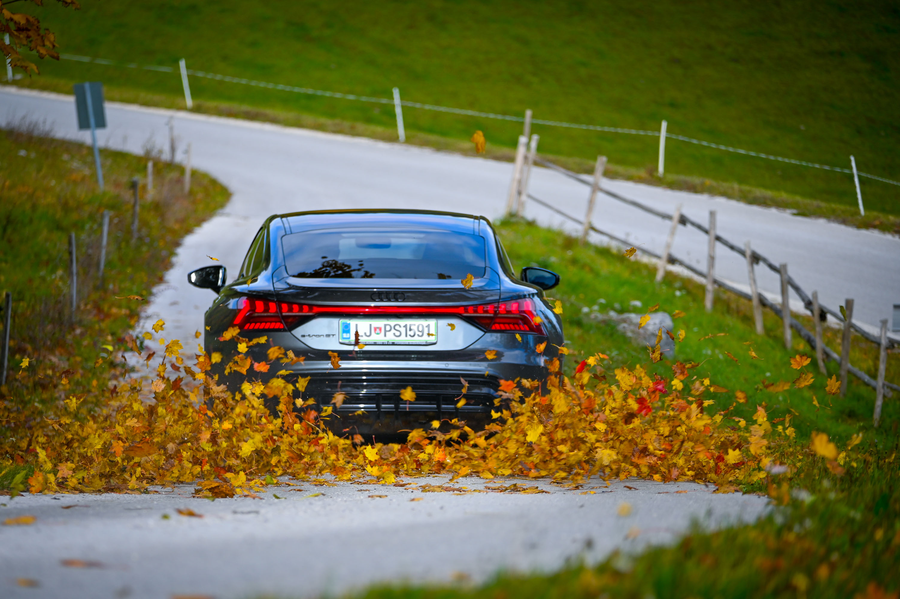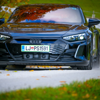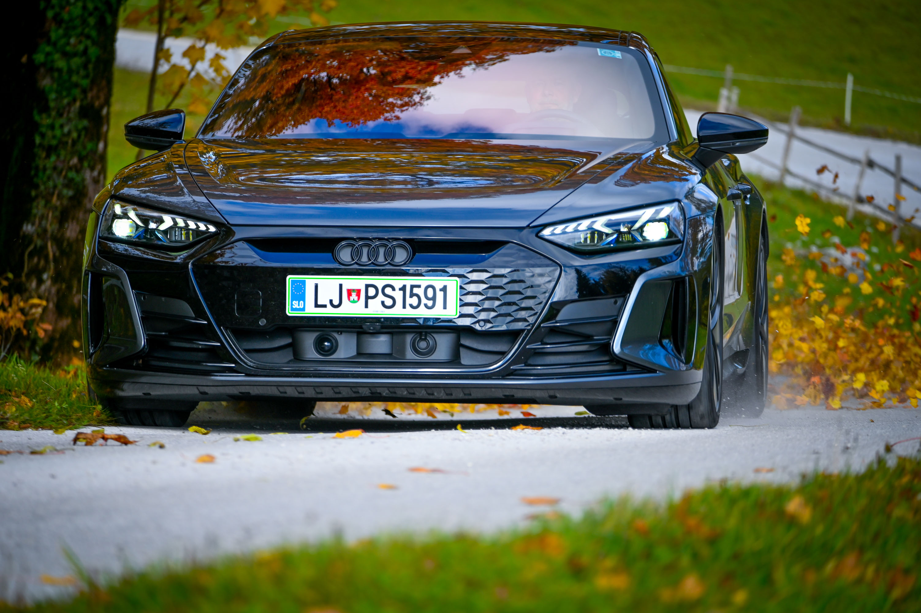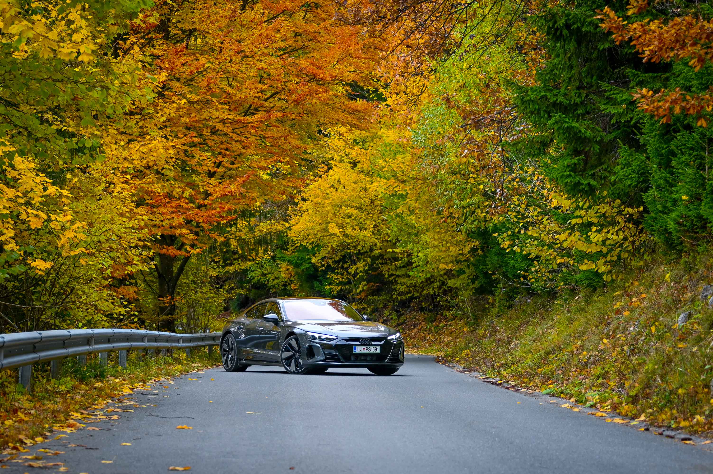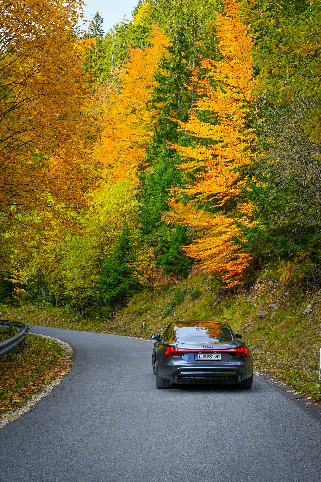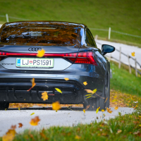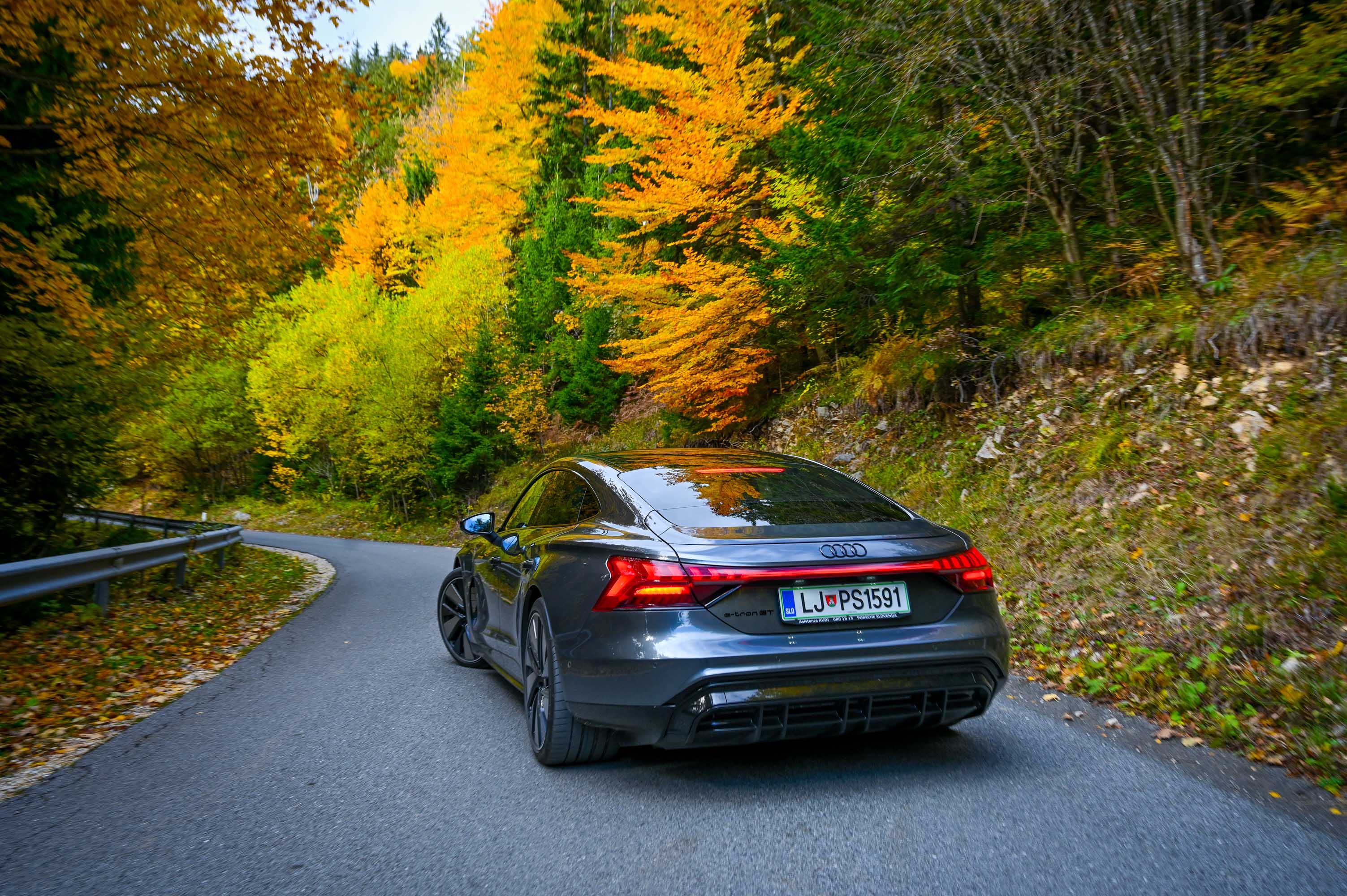Ko smo v audiju e-tronu GT vklopili dinamični vozni program, je elektrika dobila nove razsežnosti. Zgodba o jeseni, ki naznanja konec nekega obdobja, je zažarela v najbolj čudovitih odtenkih. Potisk pri izhodu iz ovinka v naslednjo kratko ravnino je tako silovit, da je zračni tok izpod orjaškega difuzorja odpadlo listje razpihal skoraj do višine prvih vej drevesnih krošenj.