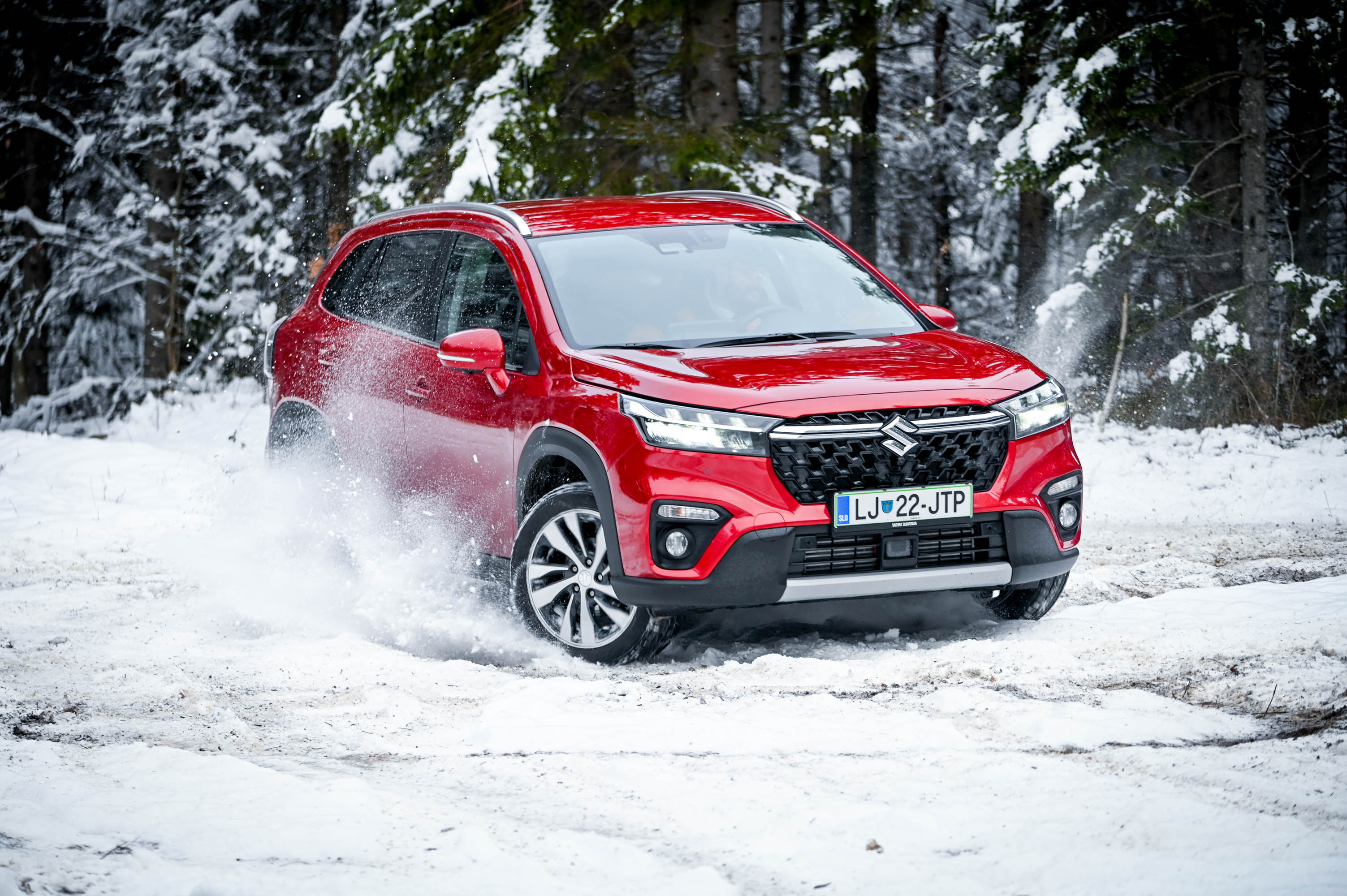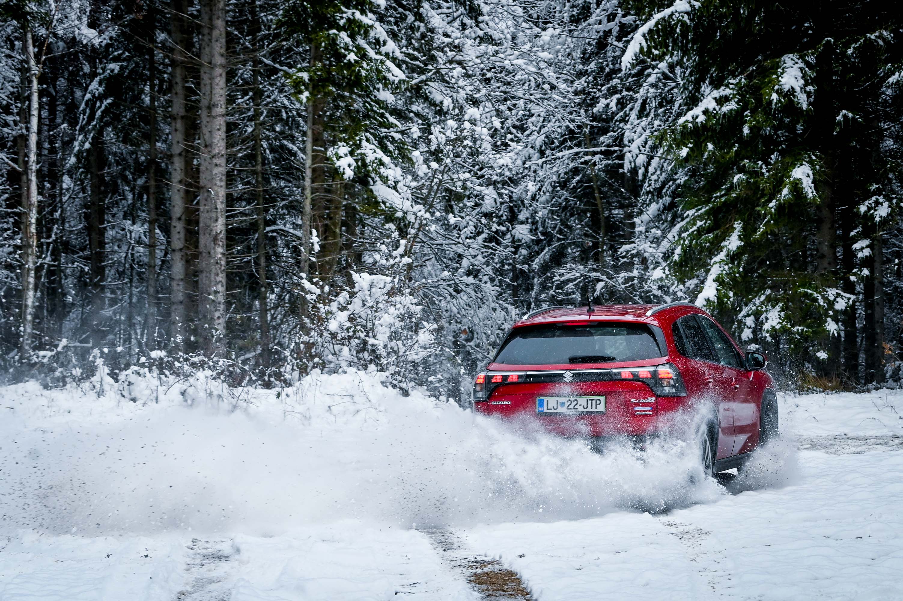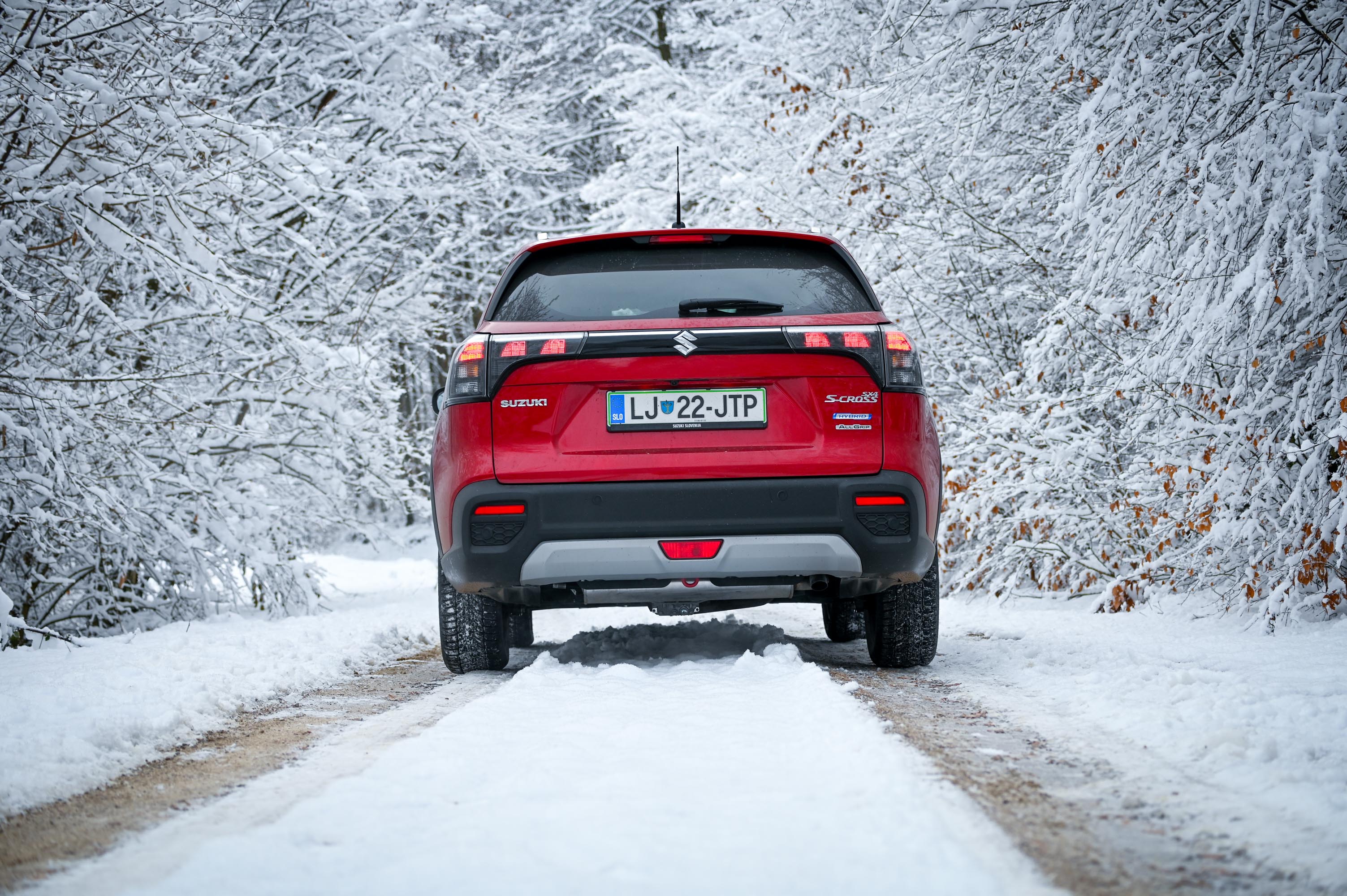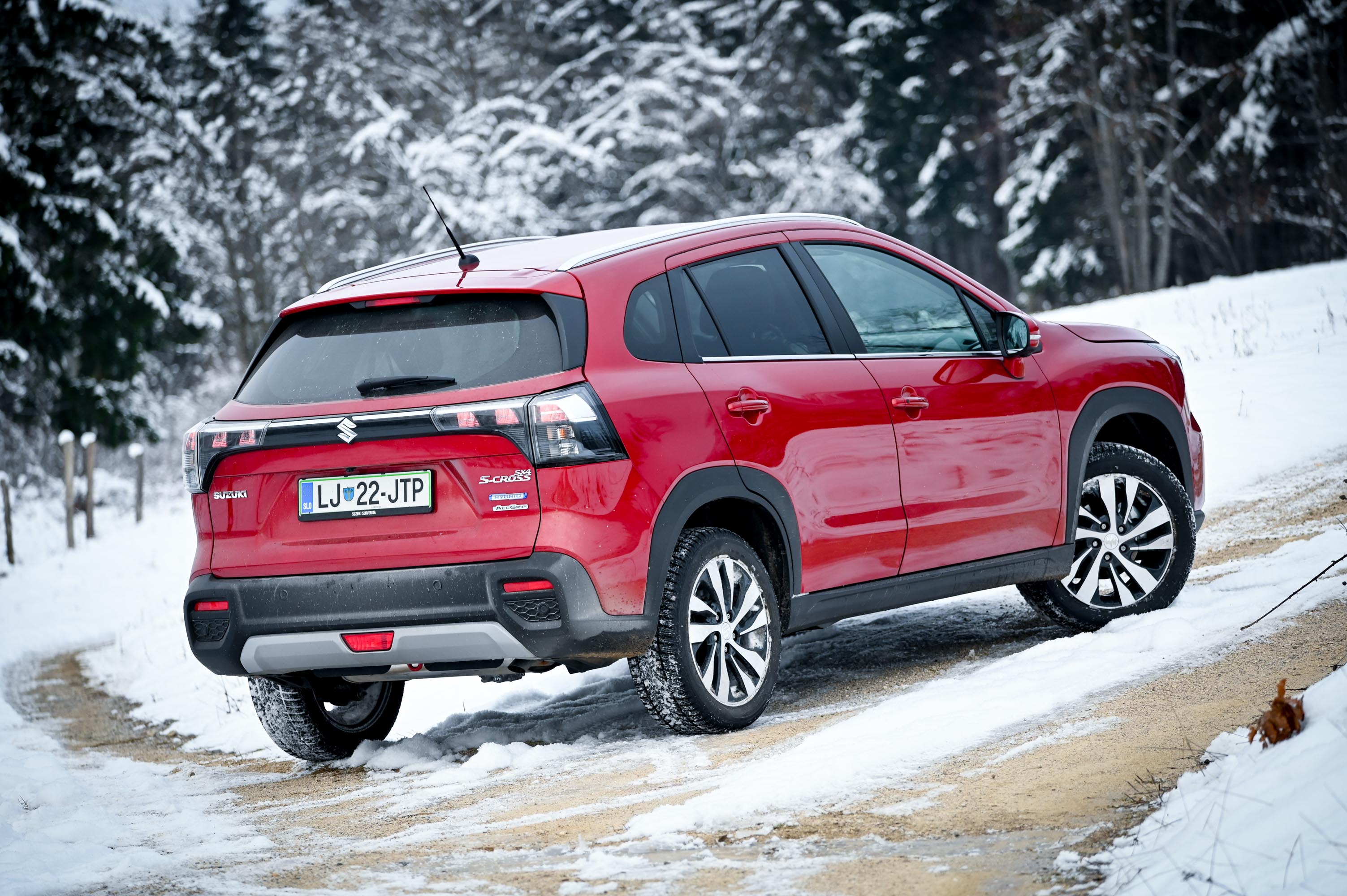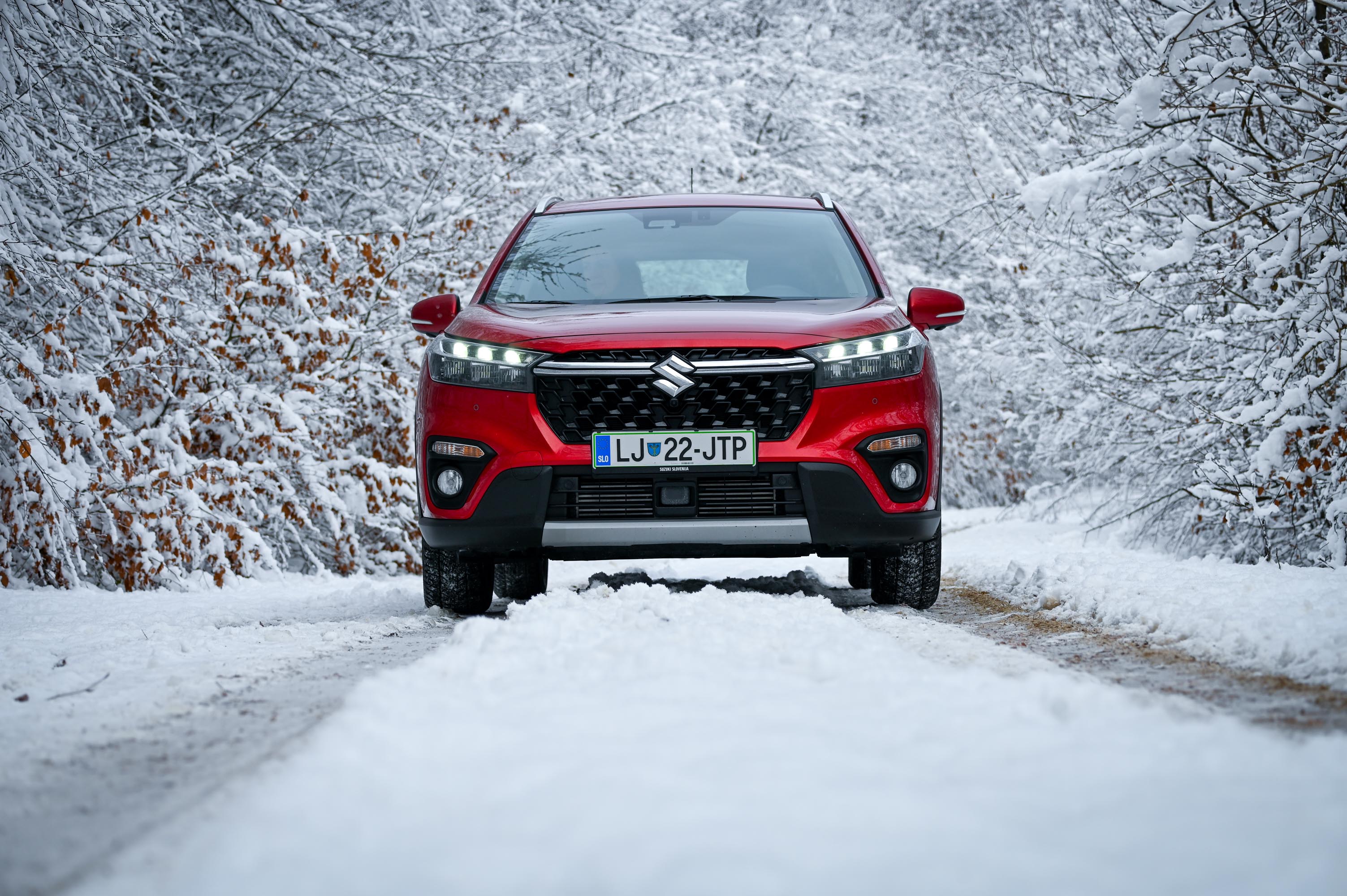 Preverjeni štirikolesni pogon ima štiri načine delovanja: samodejnega, športnega, snežnega in zaklenjenega, v katerem sredinska zapora poskrbi, da oba kolesna para dobita navor v razmerju 50:50. Zaklep deluje do hitrosti 60 km/h, potem se samodejno izklopi. Od pogona smo na zasneženih, poledenelih in strmih ter od tovornjakov razritih gozdnih cestah zahtevali veliko in tudi veliko dobili. Deluje zelo zanesljivo in odzivno, hkrati pa je za voznika povsem enostaven za uporabo, saj je treba le na vrtljivem stikalu izbrati način delovanja. Ob plezalskih sposobnostih in okretnosti bi v S-crossovih kolesnicah zardel tudi kakšen veliko bolj klen terenec. Še vedno pa se je treba zavedati, da kljub odličnemu pogonu to ni pravi terenec: onstran asfalta največjo omejitev predstavlja (pre)majhna oddaljenost od tal, ki znaša samo 18 centimetrov. Ob resnejših plezalnih podvigih v strmini bi zelo trpela sklopka, saj brez reduktorja ni mogoče na kolesa spraviti dovolj navora pri nizkih hitrostih. Škoda je tudi, da S-cross ni dobil sistema za pomoč pri spustu po strmini, ki ga premoreta vitara in ignis. Glede na značaj oziroma vozne zmogljivosti na slabših podlagah smo bili razočarani, da v prtljažniku ni prave rezervne pnevmatike, palec pa dvignemo za klasično mehansko ročno zavoro in možnost polnega izklopa sistema ESC.