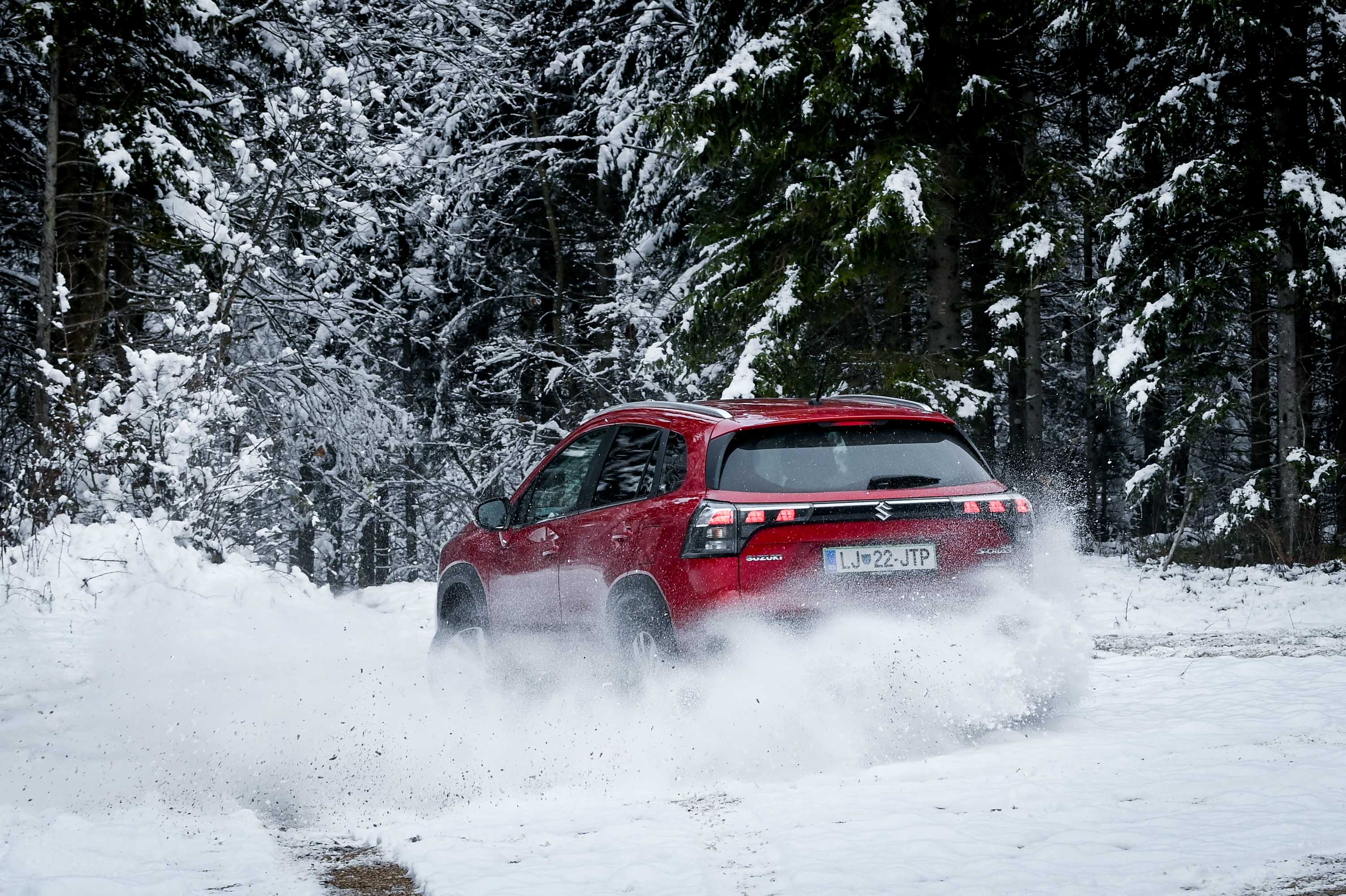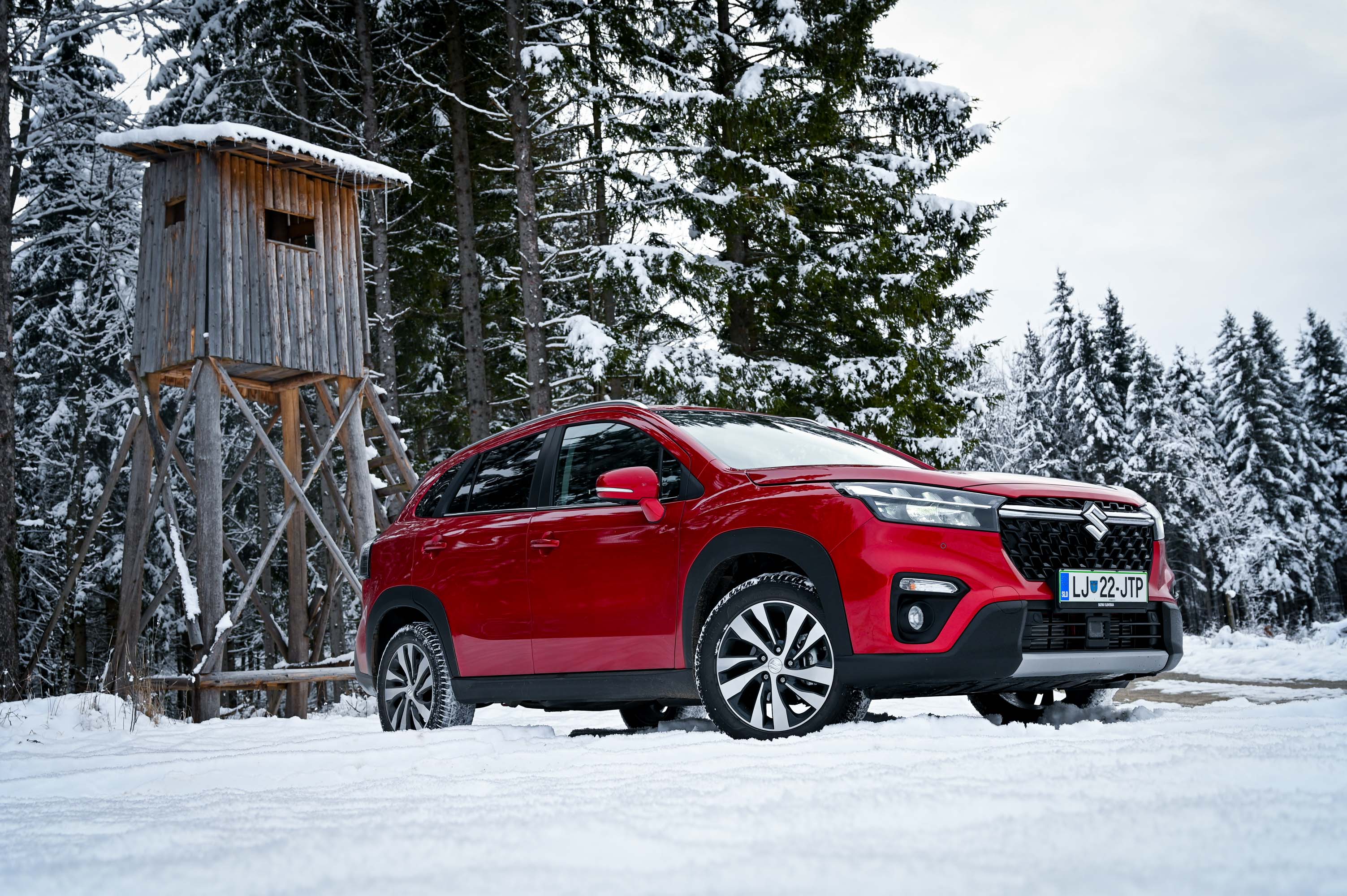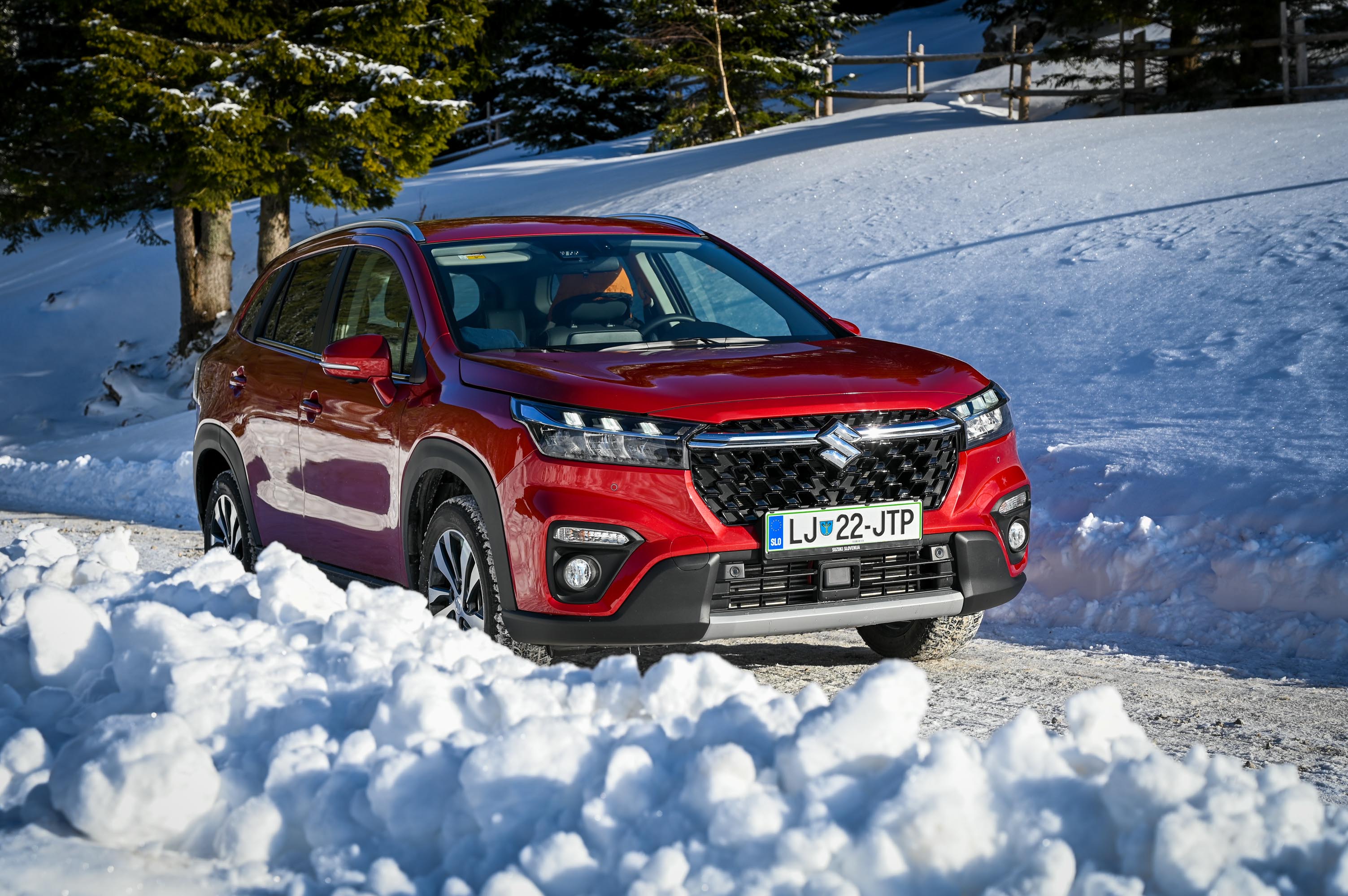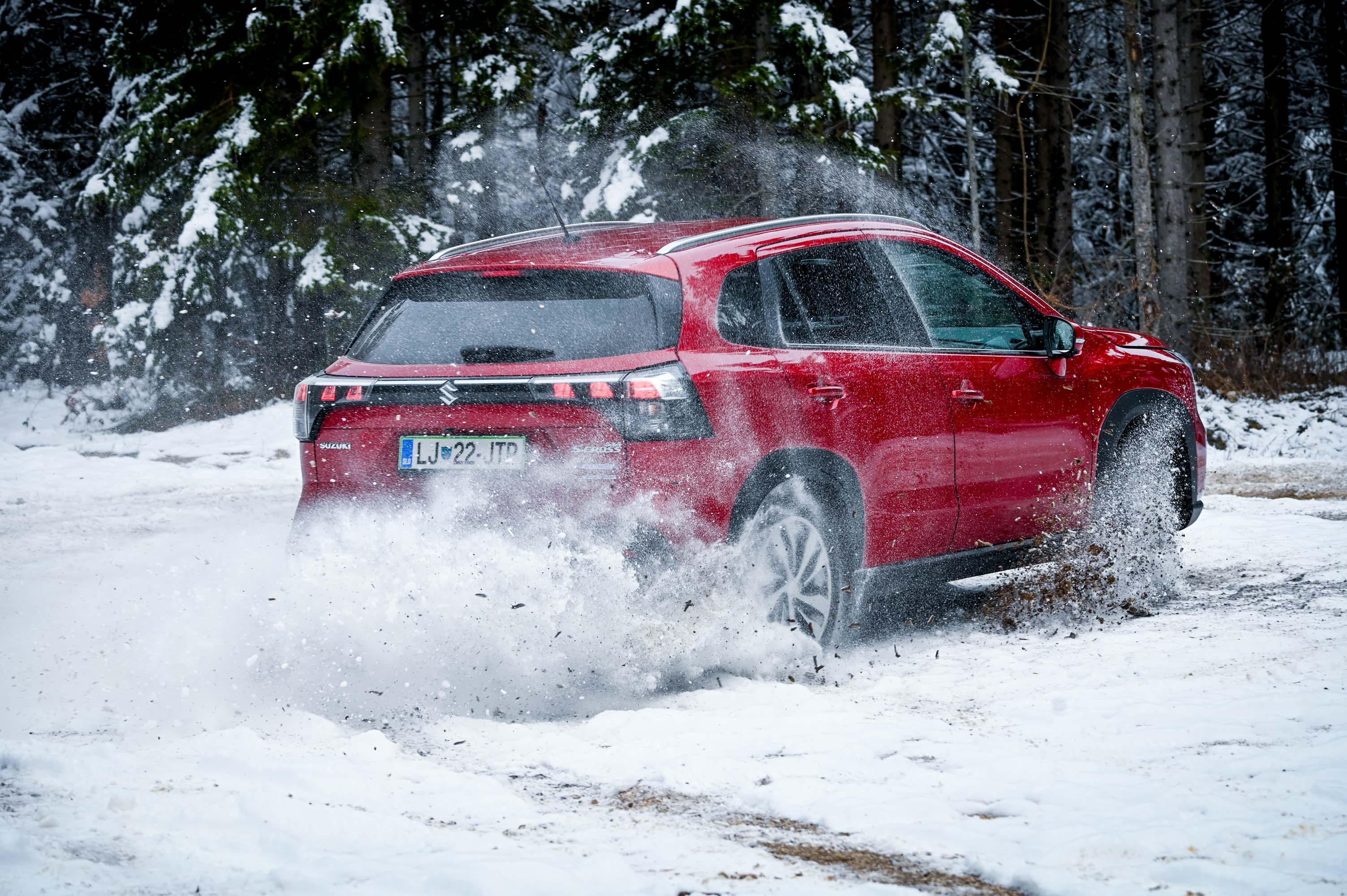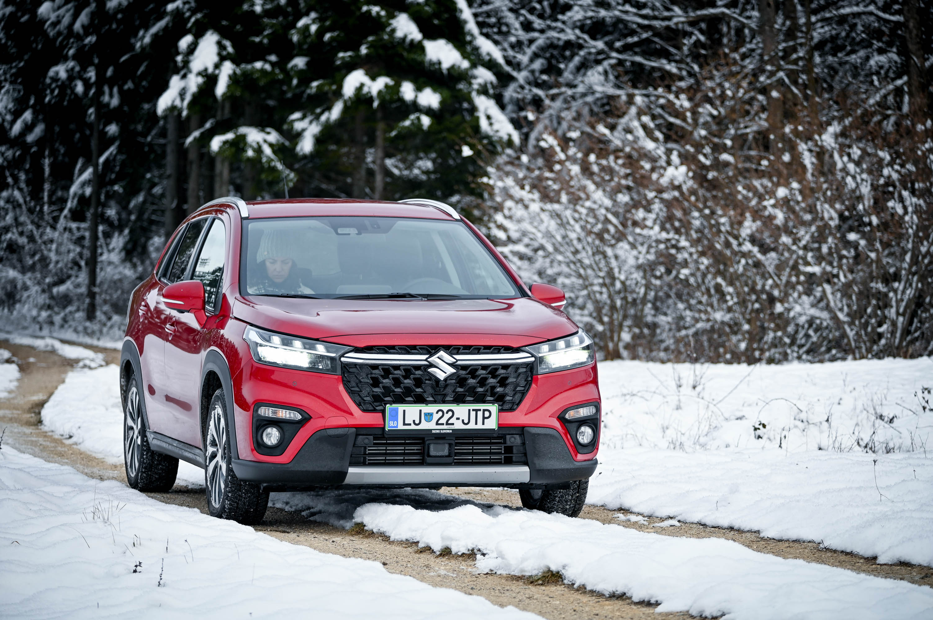 Preverjeni štirikolesni pogon ima štiri načine delovanja: samodejnega, športnega, snežnega in zaklenjenega, v katerem sredinska zapora poskrbi, da oba kolesna para dobita navor v razmerju 50:50. Zaklep deluje do hitrosti 60 km/h, potem se samodejno izklopi. Od pogona smo na zasneženih, poledenelih in strmih ter od tovornjakov razritih gozdnih cestah zahtevali veliko in tudi veliko dobili. Deluje zelo zanesljivo in odzivno, hkrati pa je za voznika povsem enostaven za uporabo, saj je treba le na vrtljivem stikalu izbrati način delovanja. Ob plezalskih sposobnostih in okretnosti bi v S-crossovih kolesnicah zardel tudi kakšen veliko bolj klen terenec. Še vedno pa se je treba zavedati, da kljub odličnemu pogonu to ni pravi terenec: onstran asfalta največjo omejitev predstavlja (pre)majhna oddaljenost od tal, ki znaša samo 18 centimetrov. Ob resnejših plezalnih podvigih v strmini bi zelo trpela sklopka, saj brez reduktorja ni mogoče na kolesa spraviti dovolj navora pri nizkih hitrostih. Škoda je tudi, da S-cross ni dobil sistema za pomoč pri spustu po strmini, ki ga premoreta vitara in ignis. Glede na značaj oziroma vozne zmogljivosti na slabših podlagah smo bili razočarani, da v prtljažniku ni prave rezervne pnevmatike, palec pa dvignemo za klasično mehansko ročno zavoro in možnost polnega izklopa sistema ESC.