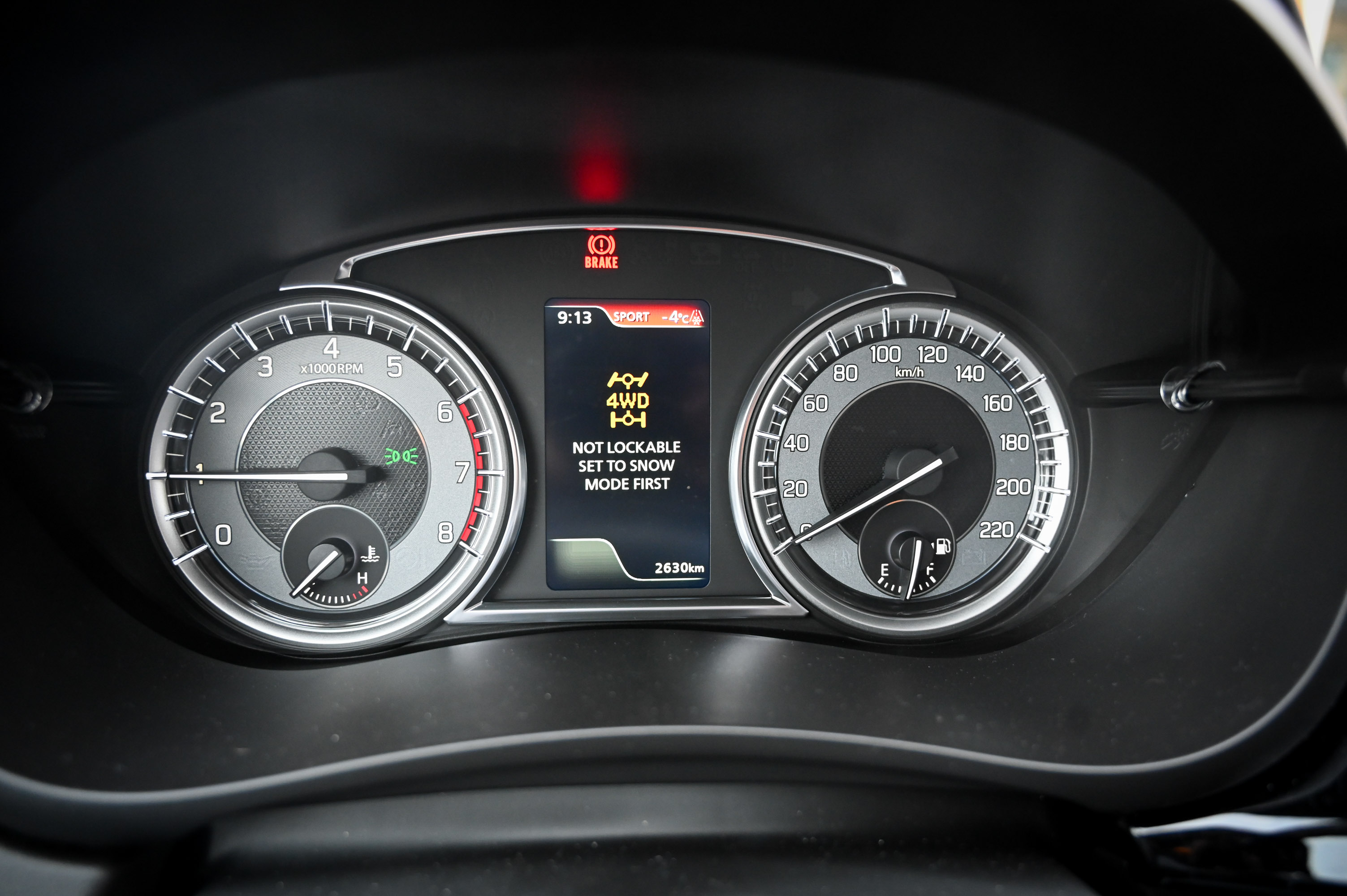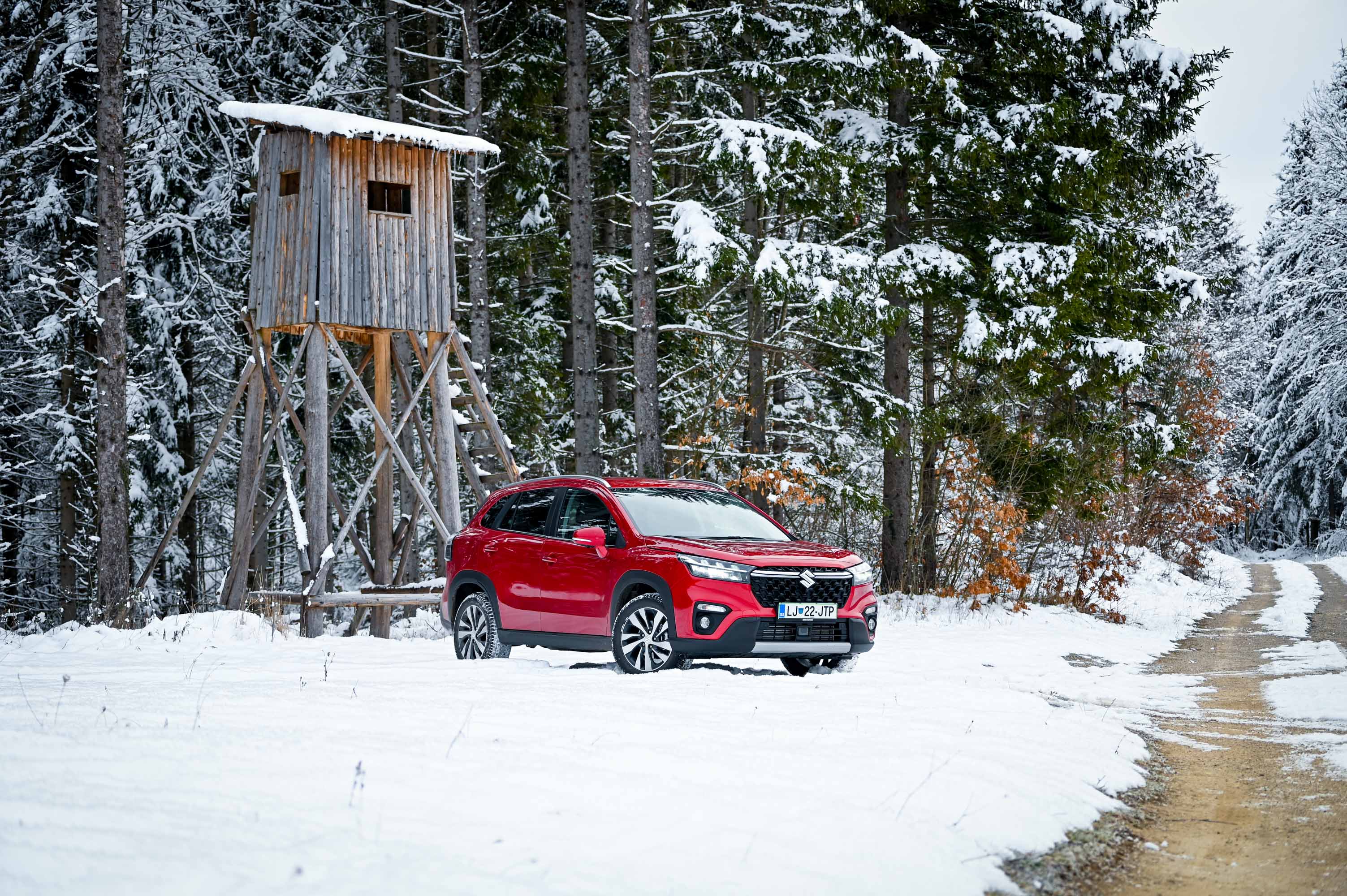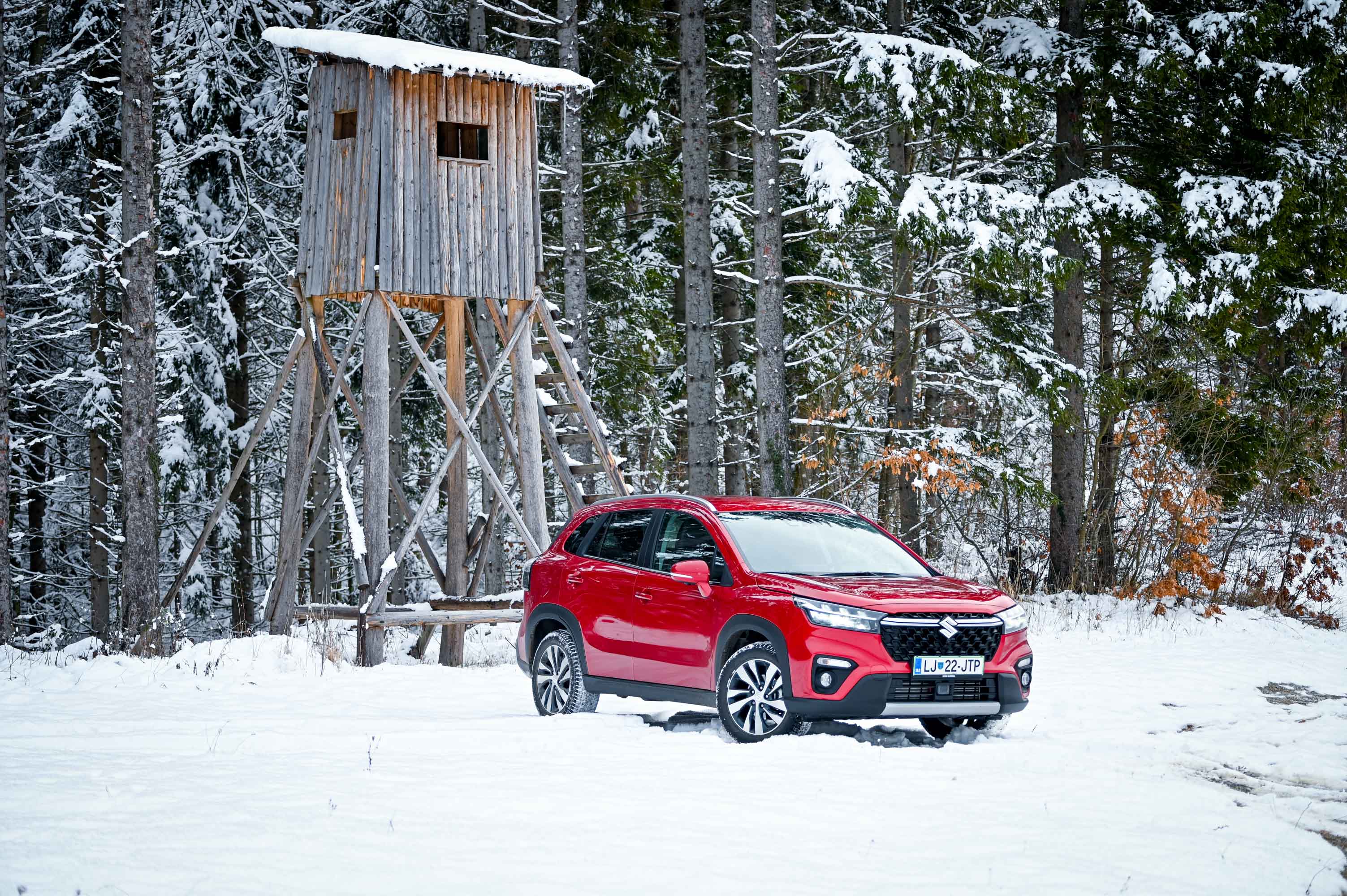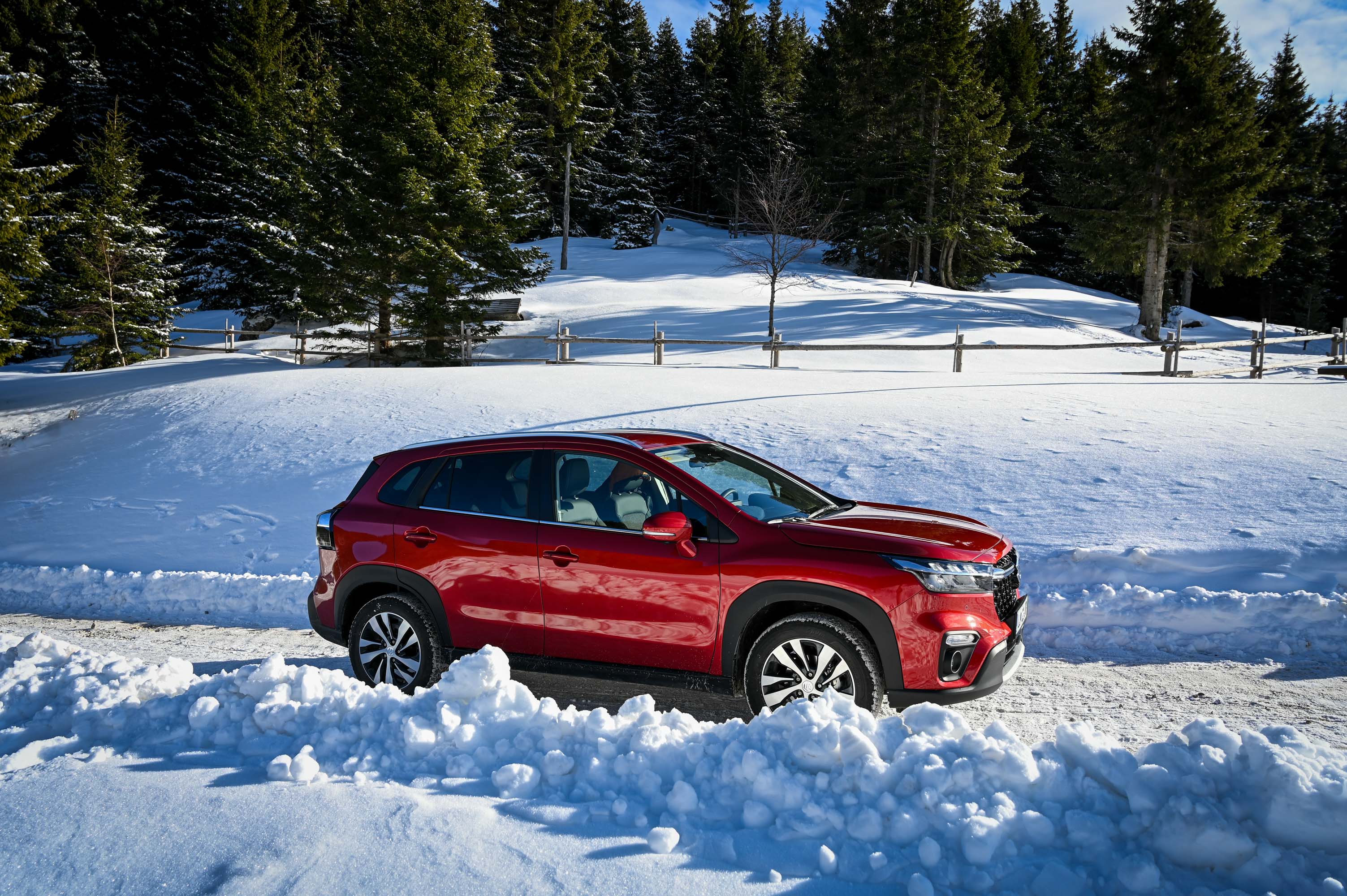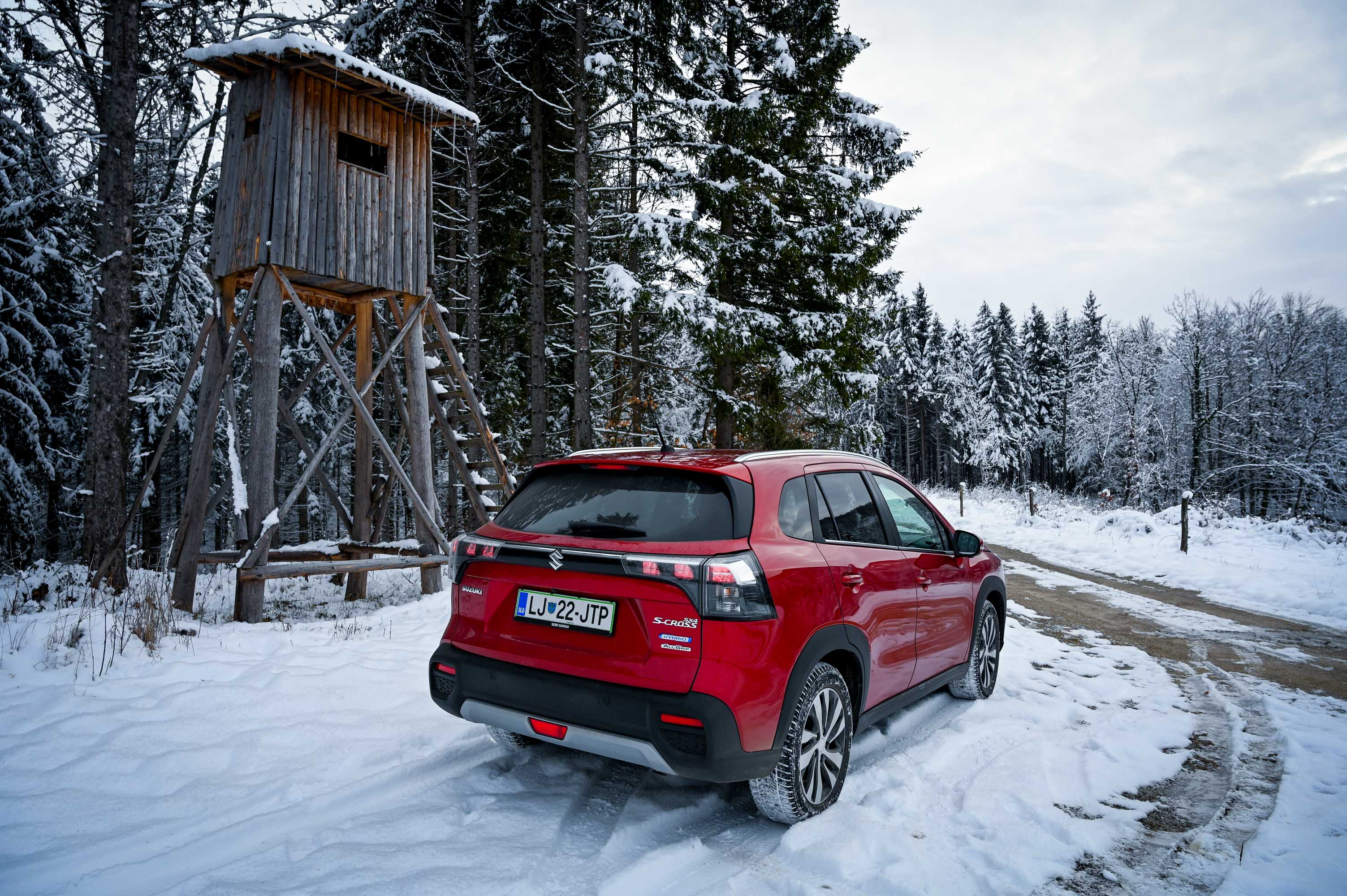Preverjeni štirikolesni pogon ima štiri načine delovanja: samodejnega, športnega, snežnega in zaklenjenega, v katerem sredinska zapora poskrbi, da oba kolesna para dobita navor v razmerju 50:50. Zaklep deluje do hitrosti 60 km/h, potem se samodejno izklopi. Od pogona smo na zasneženih, poledenelih in strmih ter od tovornjakov razritih gozdnih cestah zahtevali veliko in tudi veliko dobili. Deluje zelo zanesljivo in odzivno, hkrati pa je za voznika povsem enostaven za uporabo, saj je treba le na vrtljivem stikalu izbrati način delovanja. Ob plezalskih sposobnostih in okretnosti bi v S-crossovih kolesnicah zardel tudi kakšen veliko bolj klen terenec. Še vedno pa se je treba zavedati, da kljub odličnemu pogonu to ni pravi terenec: onstran asfalta največjo omejitev predstavlja (pre)majhna oddaljenost od tal, ki znaša samo 18 centimetrov. Ob resnejših plezalnih podvigih v strmini bi zelo trpela sklopka, saj brez reduktorja ni mogoče na kolesa spraviti dovolj navora pri nizkih hitrostih. Škoda je tudi, da S-cross ni dobil sistema za pomoč pri spustu po strmini, ki ga premoreta vitara in ignis. Glede na značaj oziroma vozne zmogljivosti na slabših podlagah smo bili razočarani, da v prtljažniku ni prave rezervne pnevmatike, palec pa dvignemo za klasično mehansko ročno zavoro in možnost polnega izklopa sistema ESC.