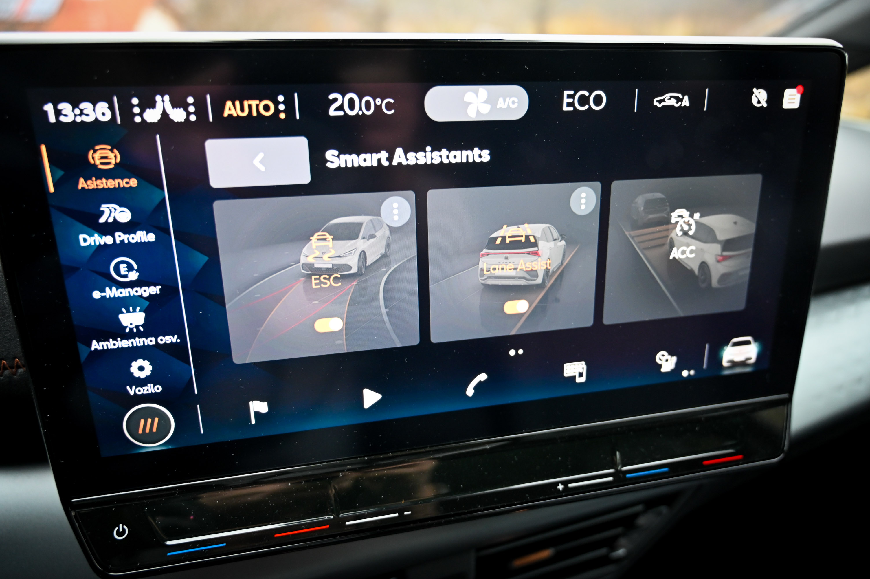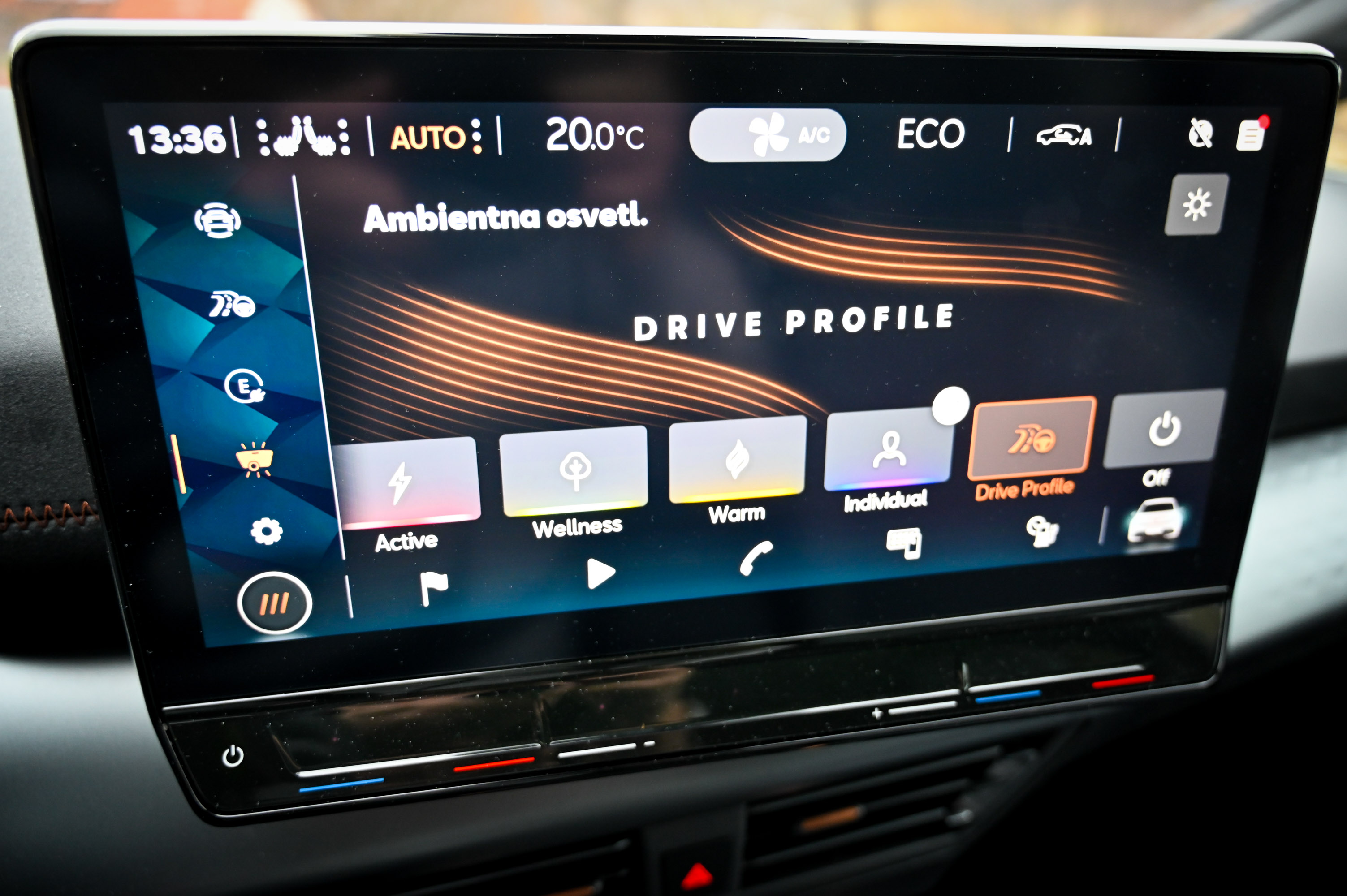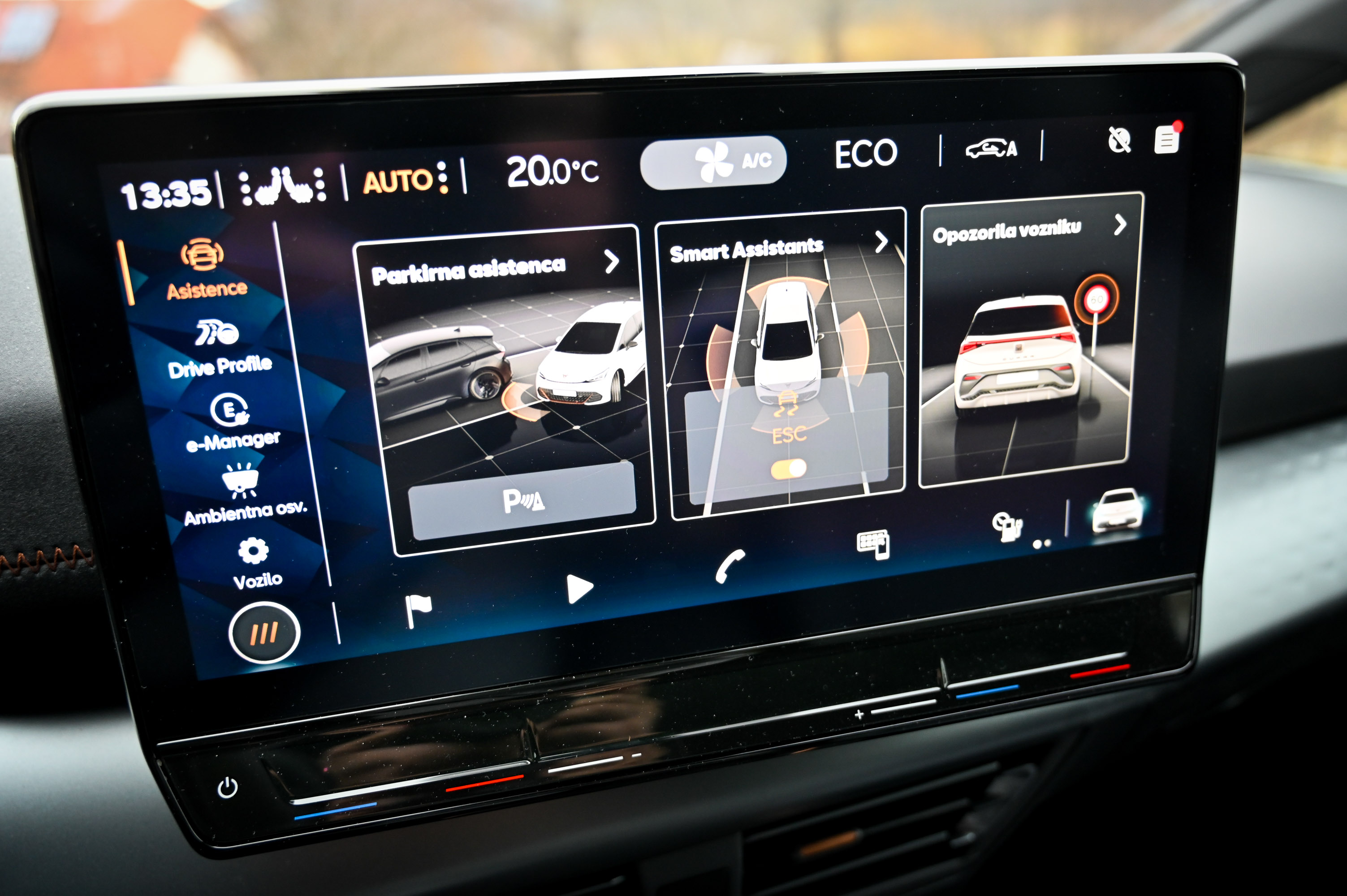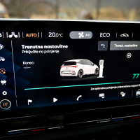 V kabini voznika pričaka znana arhitektura s satelitsko postavitvijo zaslonov iz modela ID.3. Gre za povsem digitalno vozniško okolje brez analognih stikal, ki od voznikov, vajenih klasičnih armaturnih plošč, zahteva nekaj prilagajanja. Meniji na 12-palčnem zaslonu so dobro pregledni, odzivnost zaslona je dovolj hitra in natančna, v pomoč pa je tudi v slovenščino dosledno prevedena digitalna vsebina zaslona.