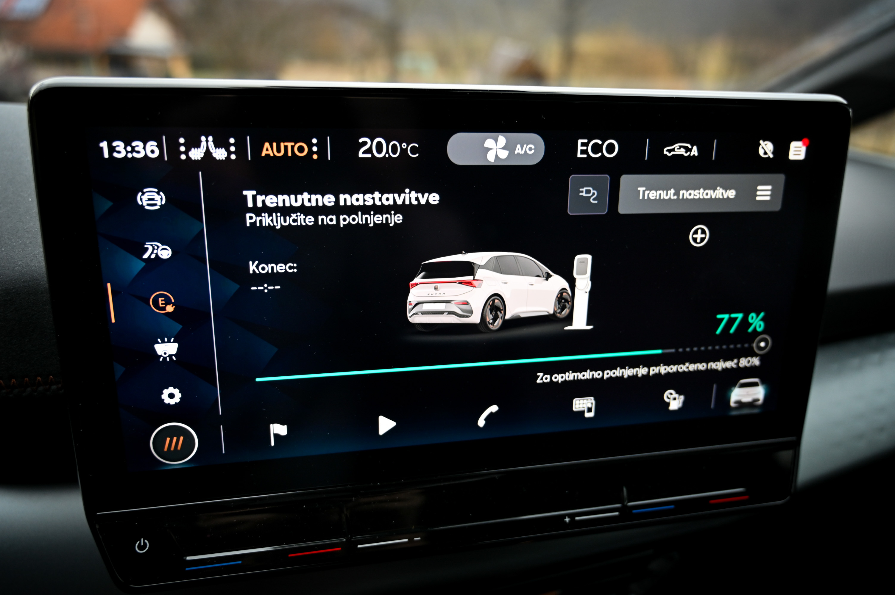 Zaradi udobja in učinkovitosti tudi pri naših vse milejših zimah vsekakor priporočamo dokup toplotne črpalke, ki stane dobrega tisočaka. Pri polnjenju velja izpostaviti, da energetska shramba take zmogljivosti že zahteva domačo polnilnico. Shajati se da sicer tudi brez nje, a se je treba zavedati, da bo iz običajne vtičnice čez noč born dobil le za okoli 100 kilometrov energije, z 11 kW polnilnikom pa bo tudi povsem izpraznjen akumulator zjutraj ponudil 300-kilometrski zimski doseg.