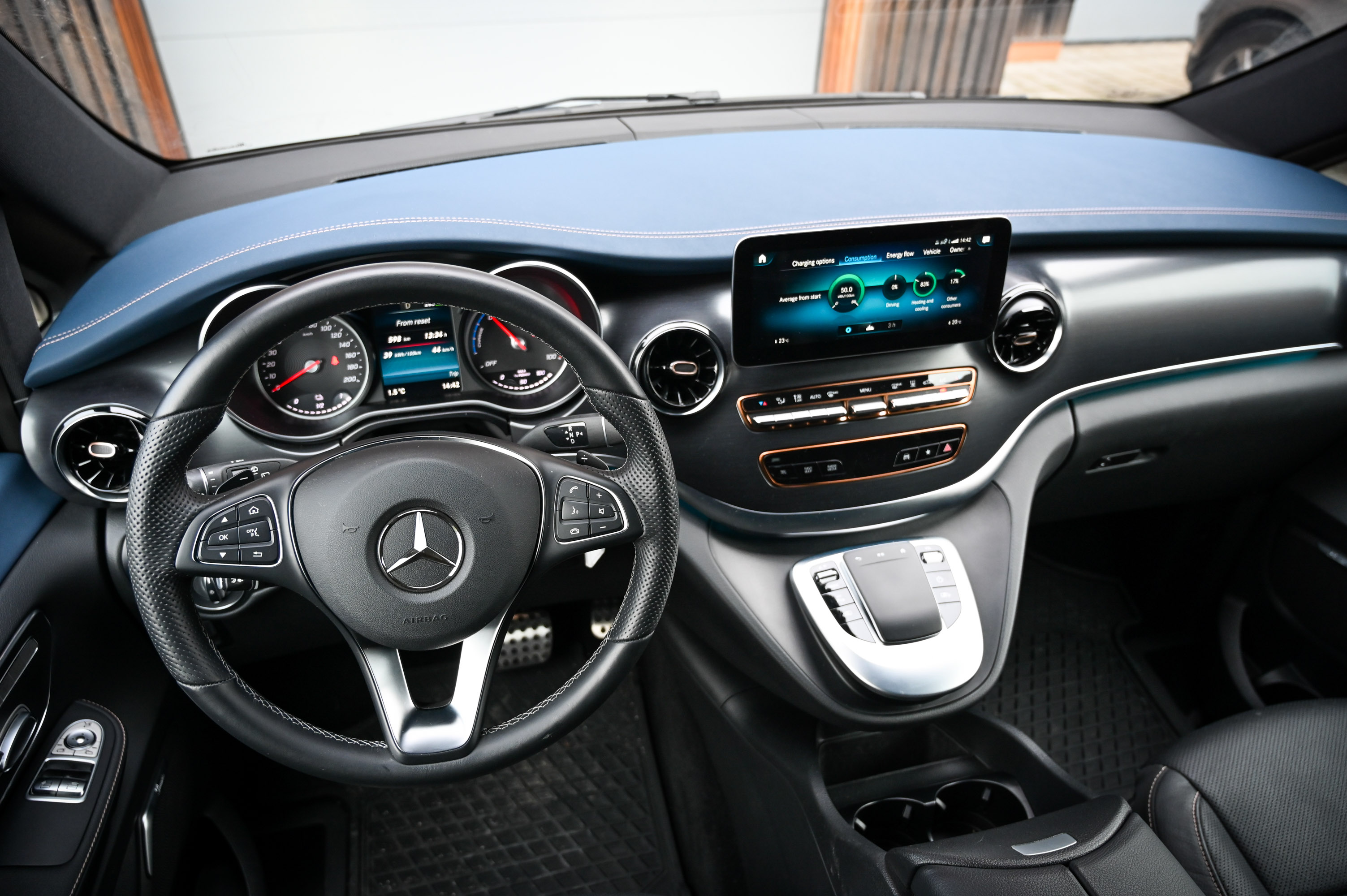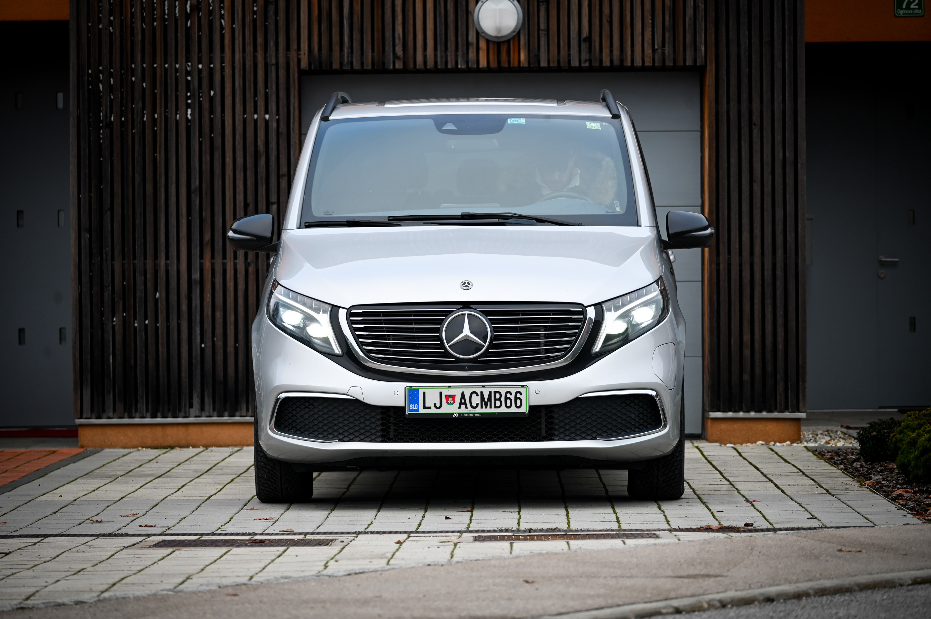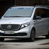 Omejen doseg z enim polnjenjem je namreč v nasprotju z osnovnim poslanstvom takšnega avtomobila: udobnim in razmeroma hitrim potovanjem na dolge razdalje za večje število potnikov. Da se razumemo: zelo udobno lahko voznik in še šest potnikov (preskusni EQV je imel ob prednjih sedežih nameščena še sedeža v drugi vrsti in klop za tri v tretji vrsti) potuje tudi s tem električnim mercedesom, zaplete pa se pri hitrosti in dolgih razdaljah. EQV 300 poganja asinhroni električni motor s 150 kW, ki je vgrajen nad prednjo premo in poganja prednji kolesi, pod tlemi potniške kabine pa je zajeten akumulatorski sklop z zmogljivostjo kar 100 kWh. V osebnem avtu bi takšna pogonska kombinacija poskrbela za zelo dolg doseg, ne pa tudi pri EQV, saj prazen tehta skoraj 2,7 tone, njegova aerodinamika pa je precej slabša kot pri osebnem avtu. Ko v enačbo vstavimo še zimske temperature, dobimo skoraj 40 kWh/100 km avtocestne porabe energije (pri zmernih potovalnih hitrostih), kar na avtocestnih potovanjih zadostuje le za nekaj več kot 200 km dosega. Mimogrede, na izmeničnih polnilnicah lahko EQV polnimo z 11 kW, na enosmernih pa s 100 kW.