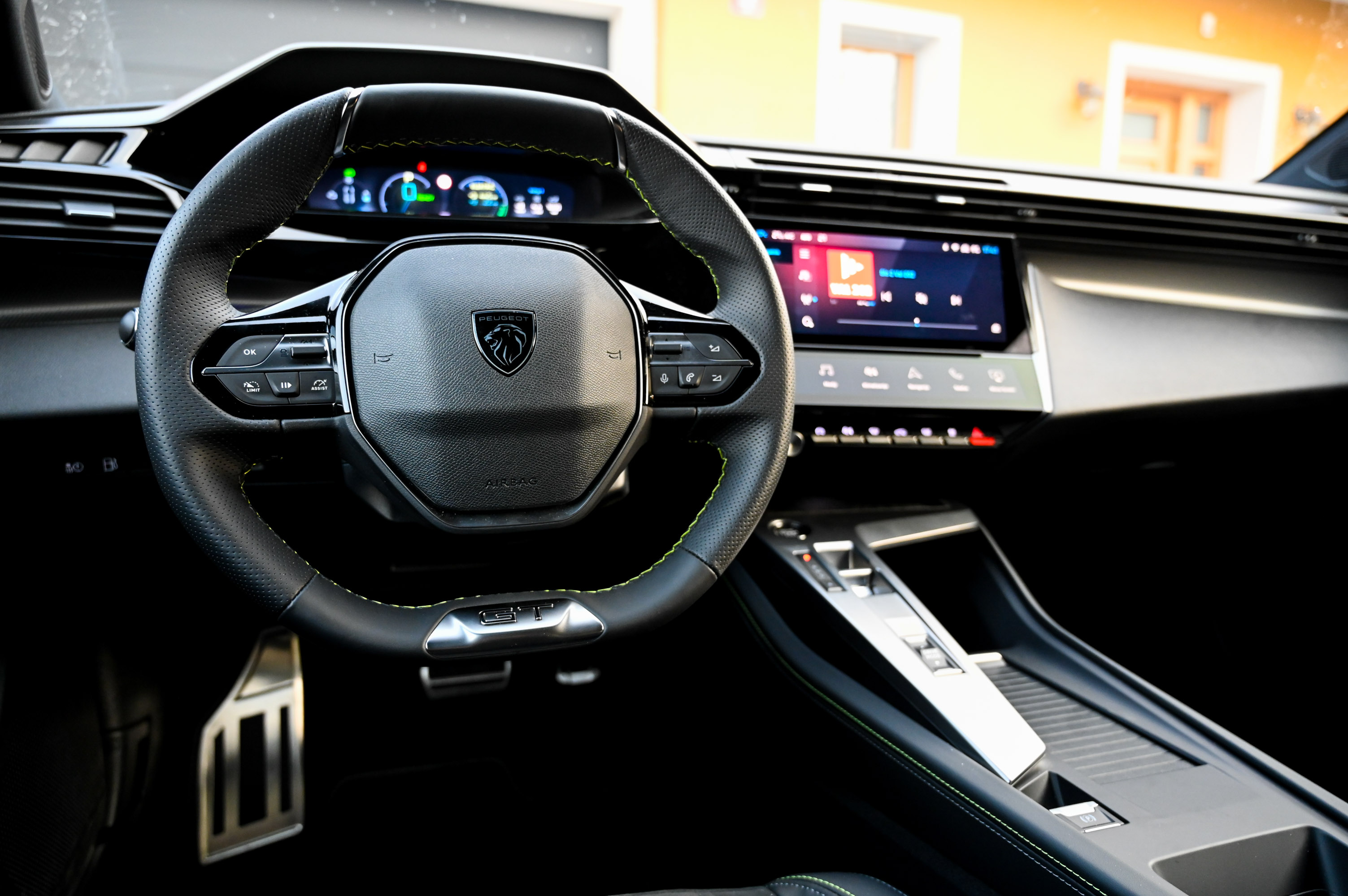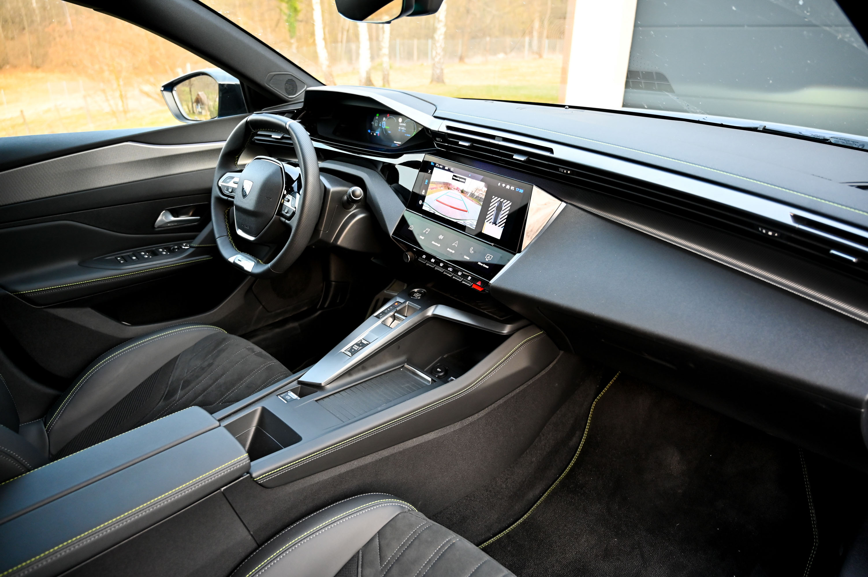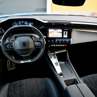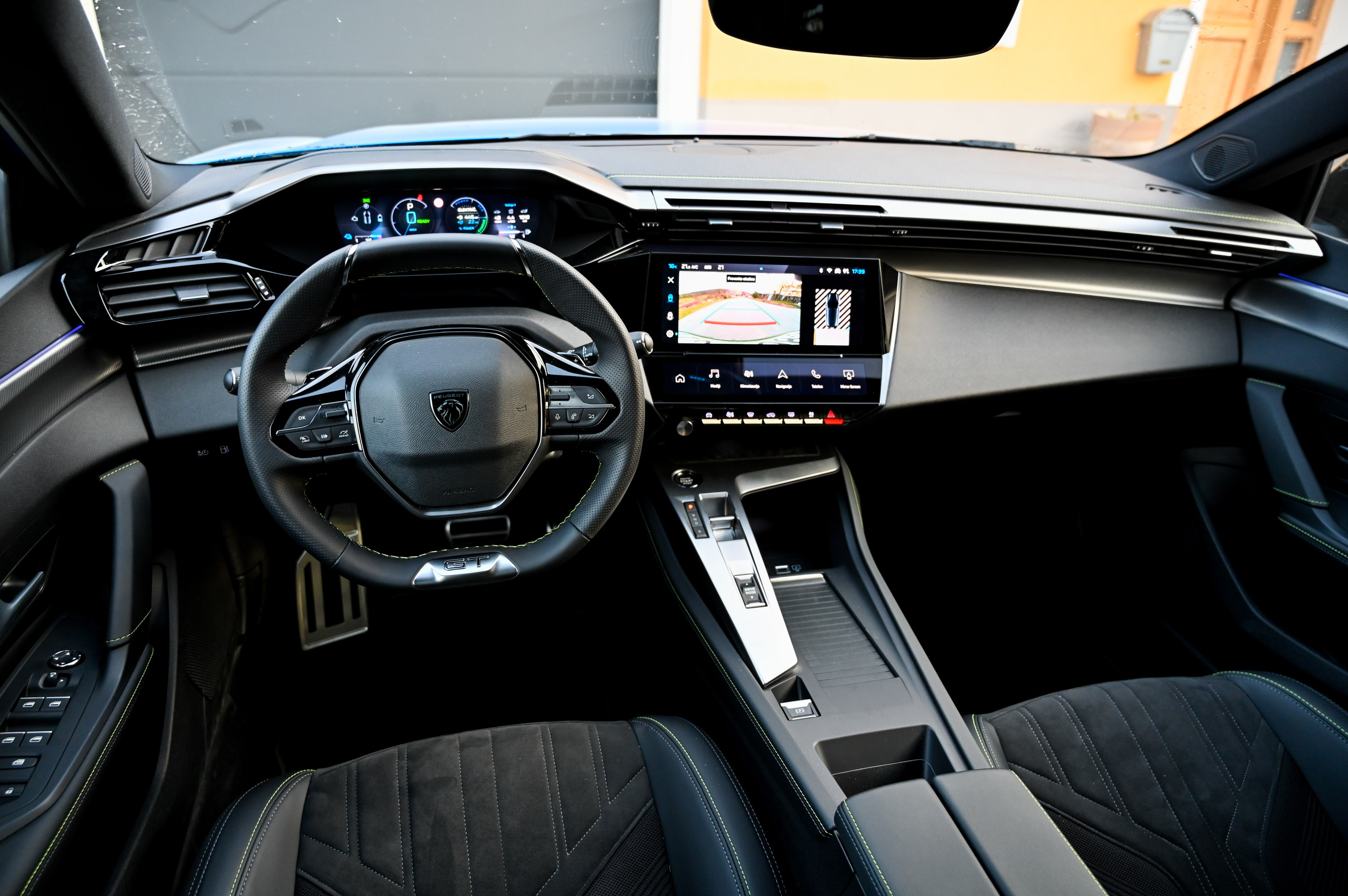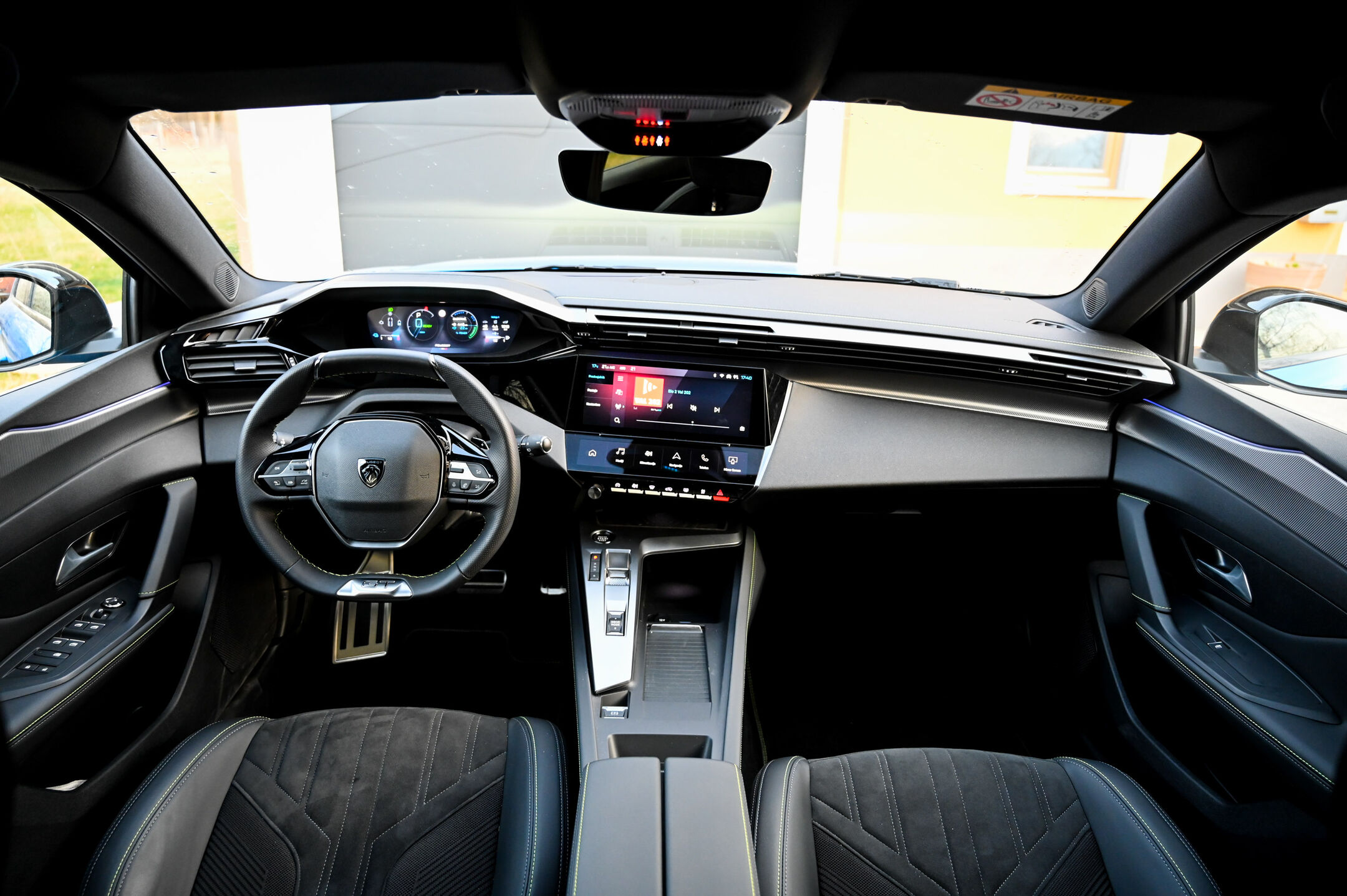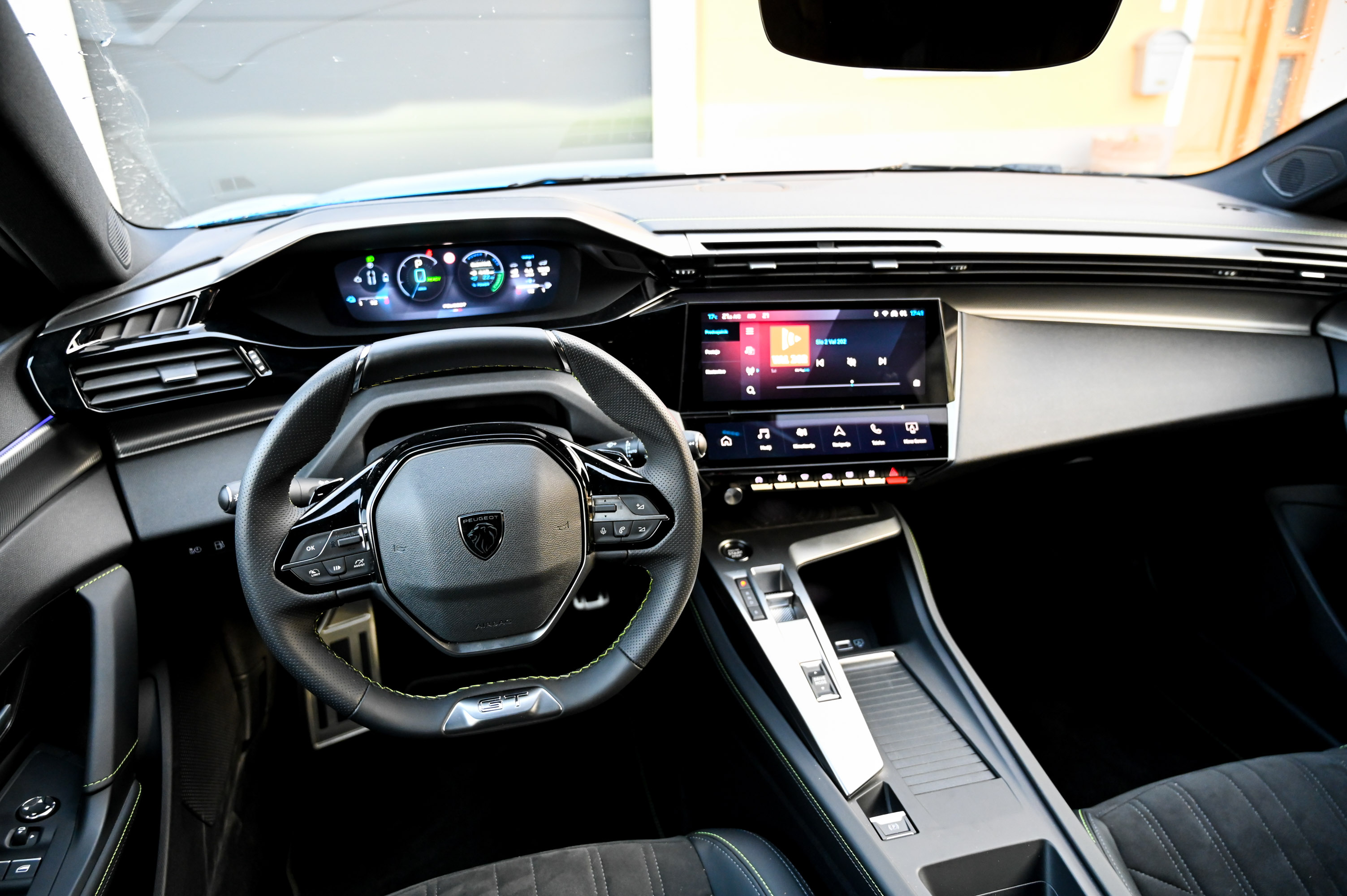 Oblikovna drznost se nadaljuje tudi v notranjosti. Razgibano oblikovana in kakovostno izdelana armaturna plošča je videti precej futuristično in spominja na letalski kokpit. Sedi se nizko, a je sedežni položaj za volanom zelo dober. Značilno Peugeotovo vozniško okolje i-cockpit streže z majhnim volanom, ki sicer lepo sede v roke, a nekateri vozniki imamo pri iskanju idealnega položaja nekaj težav, ker nam zgornji rob volana zakrije del pogleda na merilnike. Digitalni merilniki podatke prikazujejo v tridimenzionalnem načinu, a razmeroma majhen in grafično oziroma podatkovno zelo bogat zaslon merilnikov je v določenih prikazih manj pregleden zaradi majhnih številk in črk. Je pa novi 308 prvi med peugeoti, ki celovito digitalno komunikacijo na merilnikih in osrednjem 10-plačnem zaslonu ponuja v slovenščini.