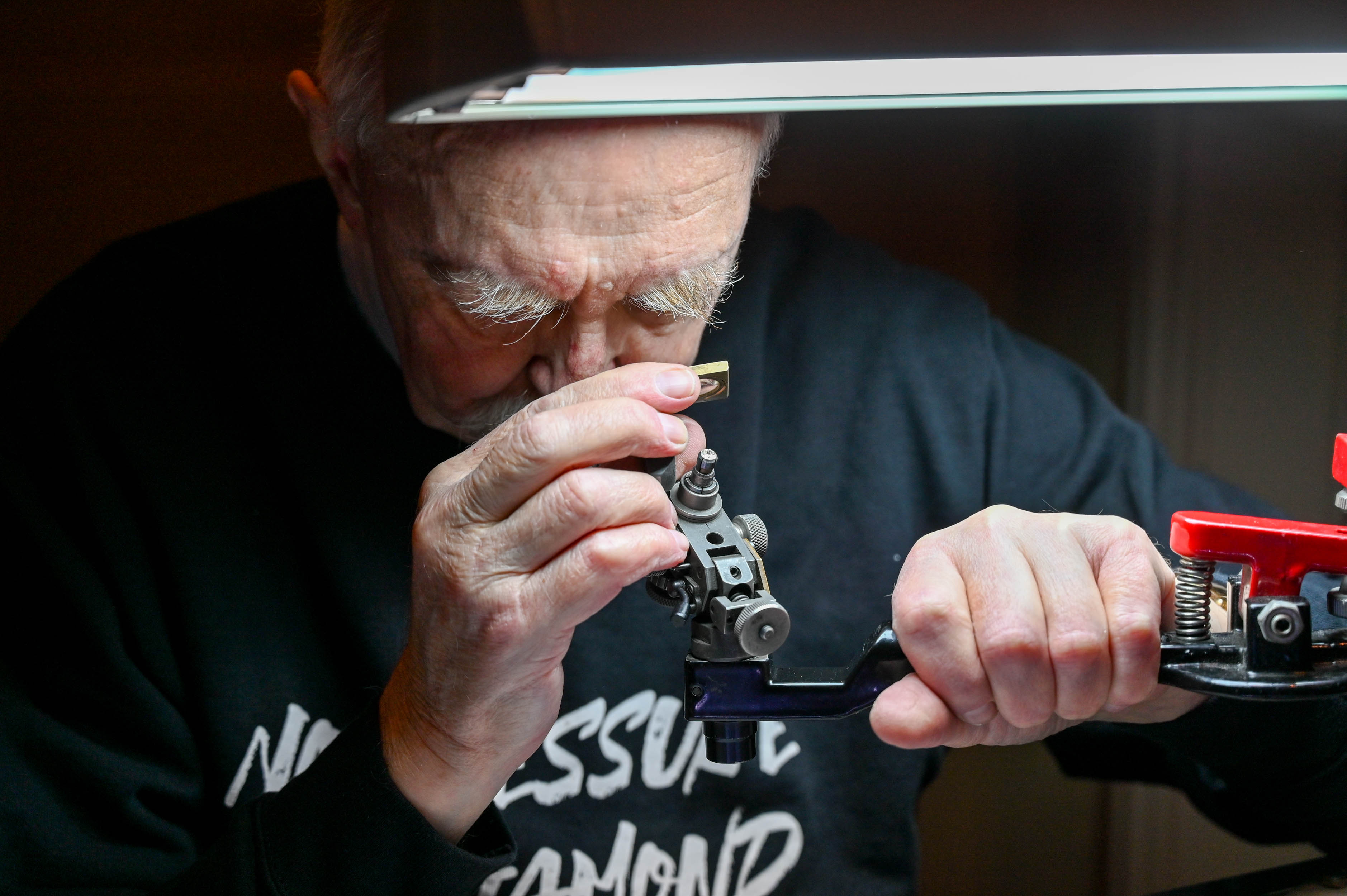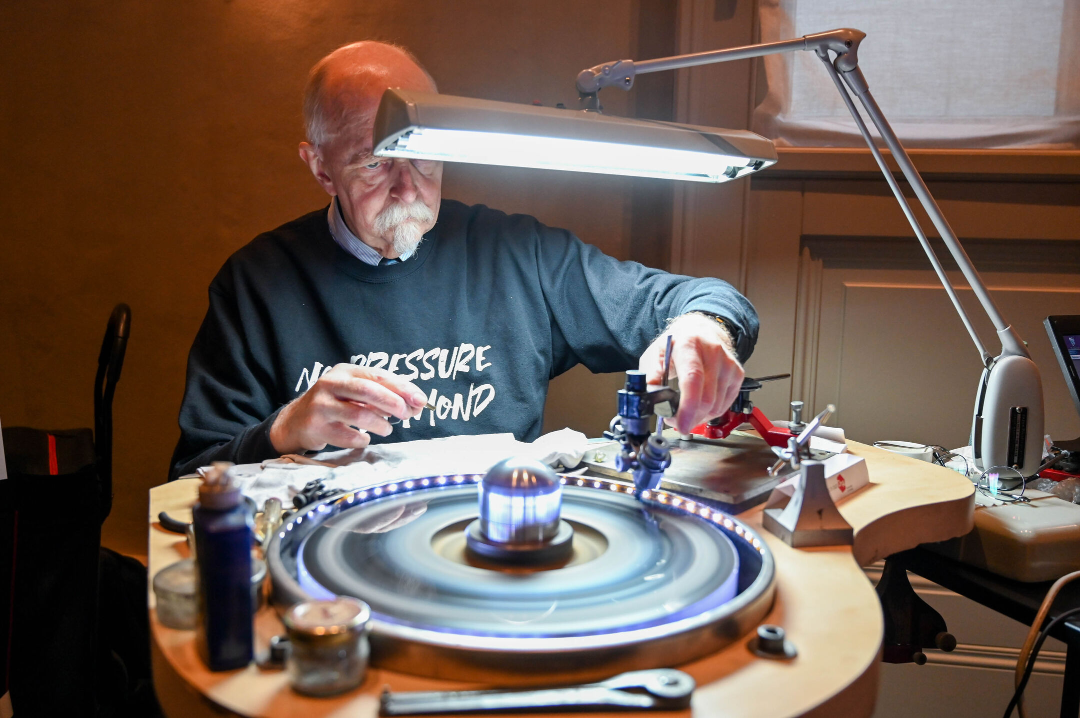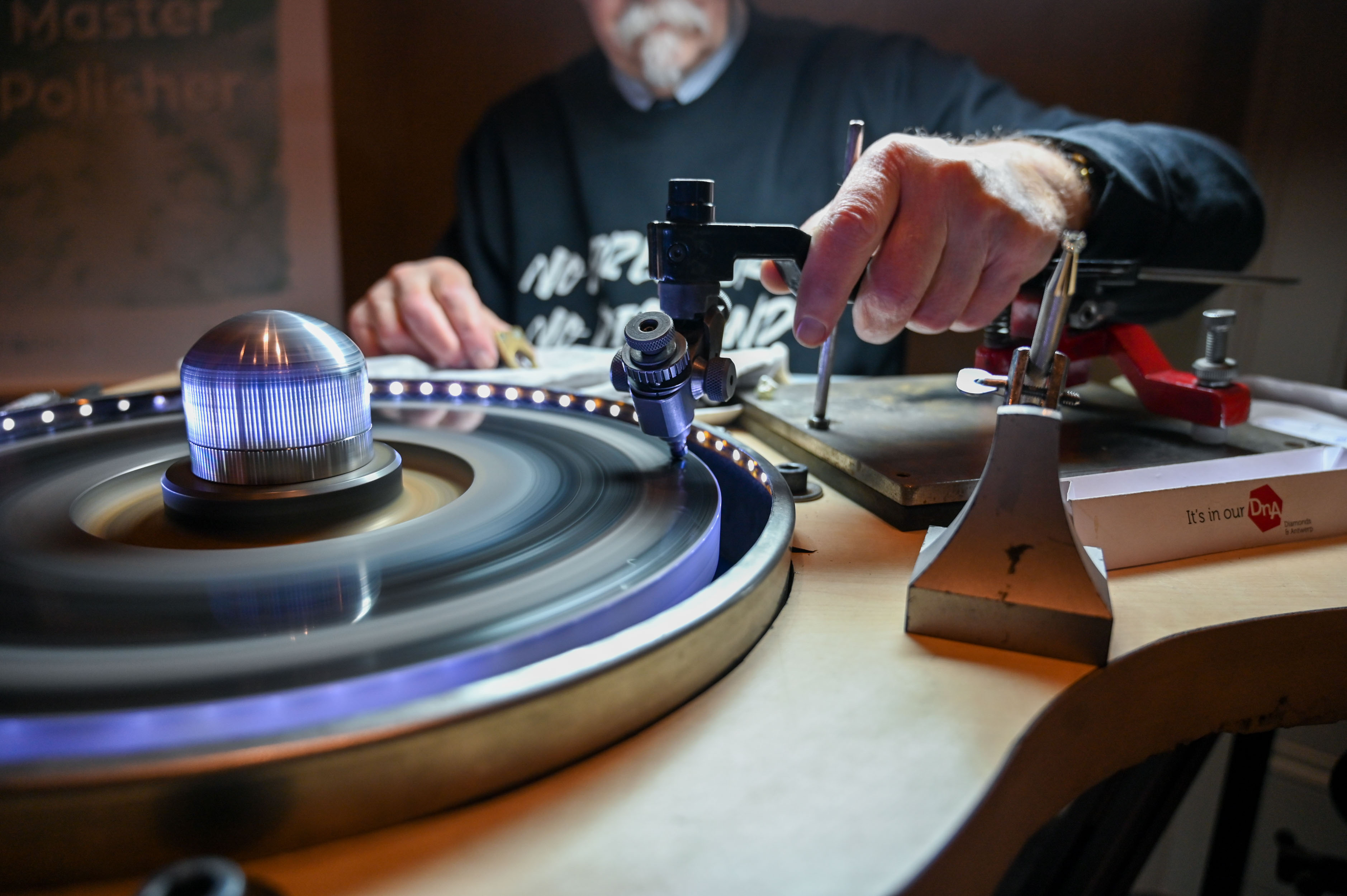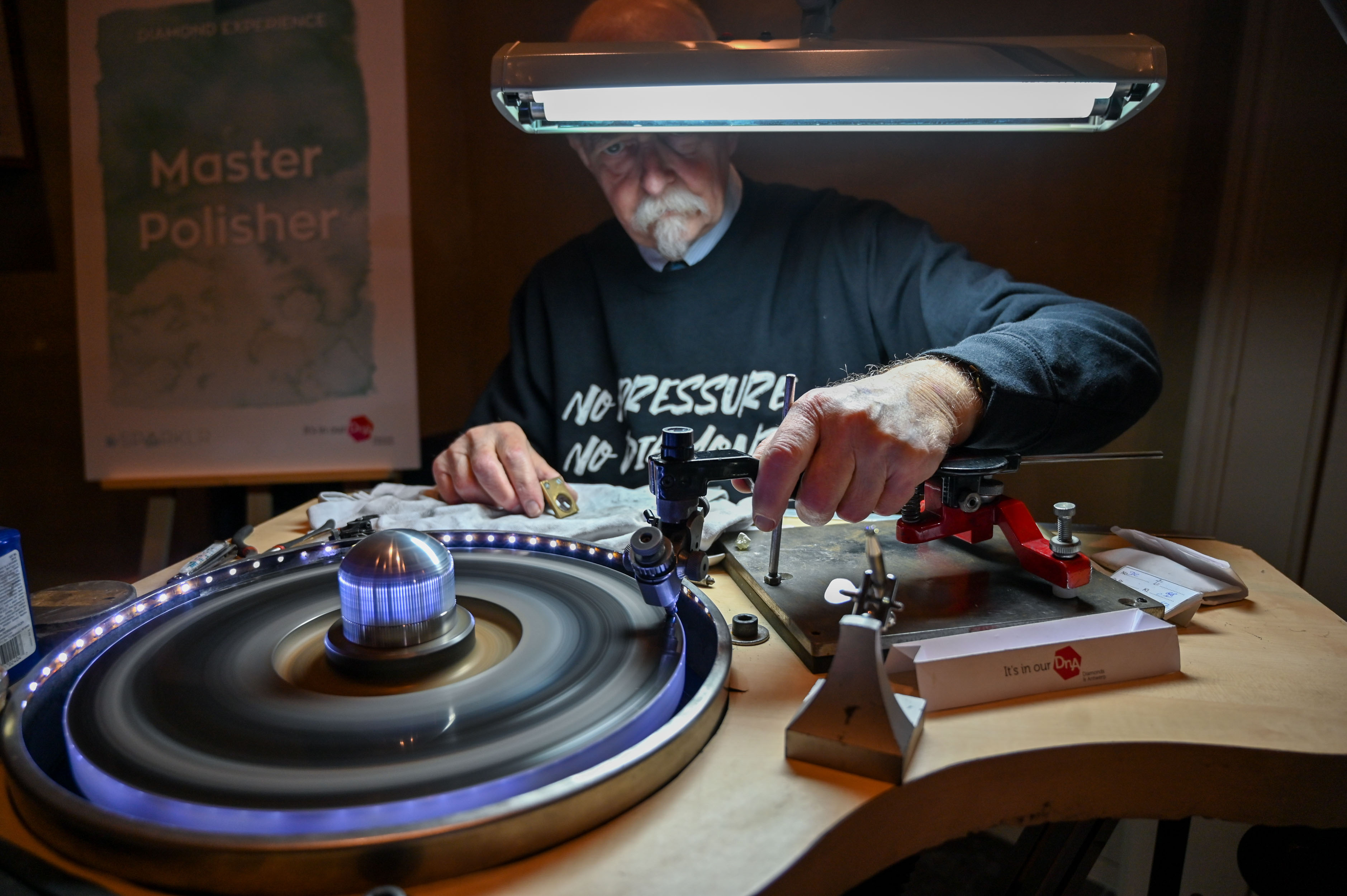 Večino diamantov izkopljejo iz neaktivnih ognjeniških žil, globokih ognjenikov, ki lavo črpajo skoraj iz jedra našega planeta. Več kot 150 kilometrov pod površjem zemeljske skorje so pravi tlačni in temperaturni pogoji za nastanek diamantne materije oziroma kristalizacijo ogljika, ki se zgodi v ohlajenih žilah globokih vulkanov. Od surovega diamanta do razkošja izjemnih oblik s perfektnim sijem loma svetlobe je dolga pot polna izkušenj in znanja rokodelca, ki obrusi to čudo narave in mu vdahne vrednost. Na litoželezni plošči, prevlečeni z diamantno plastjo, ki se vrti s hitrostjo od 2500 do 3000 vrtljajev v minuti, mojster brušenja pod povečevalnim steklom oblikuje strukturo do idealnih kotov loma svetlobe. Pri delu smo opazovali enega najboljših diamantnih rokodelcev Pietra Bombeka. Pove nam, da za povprečno velik diamant potrebuje 10 dni natančne obdelave. Ob impresivnosti natančnega brušenja ene izmed najtrših naravnih snovi, ki poleg znanja zahteva tudi izjemno potrpežljivost mojstra, vprašamo o pritisku, ki ga prinaša morebitna napaka pri obdelavi dragocenega kristala. Nasmehne se in pokaže na svojo majico, kjer je zapisana besedna igra, ki dobro povzame to, kar dela: “No pressure, no diamond!” V prevodu je posrečeni slogan mogoče razumeti: “Brez pritiska na mojstra in brez pomoči tlaka narave ni diamantov!”