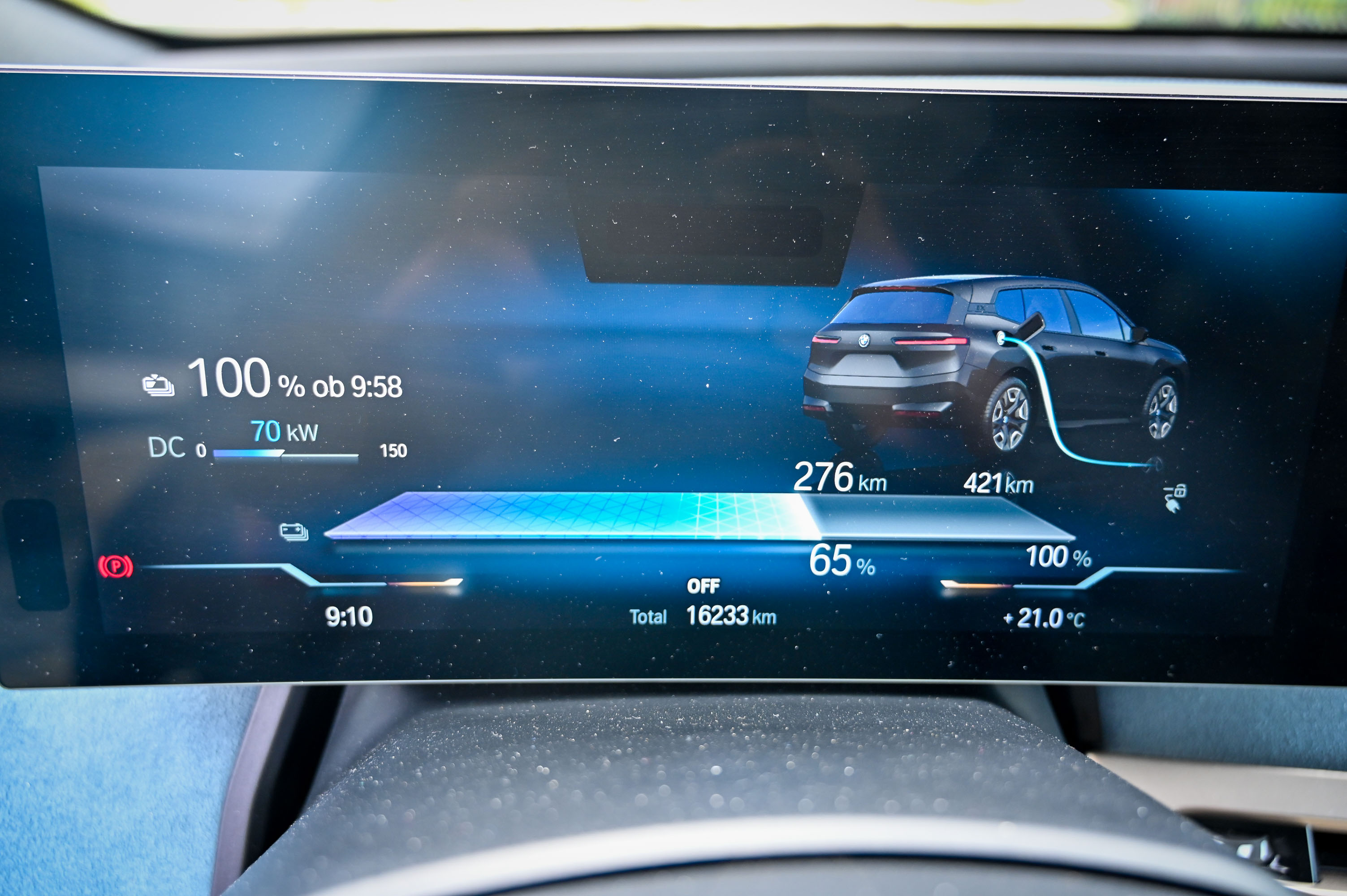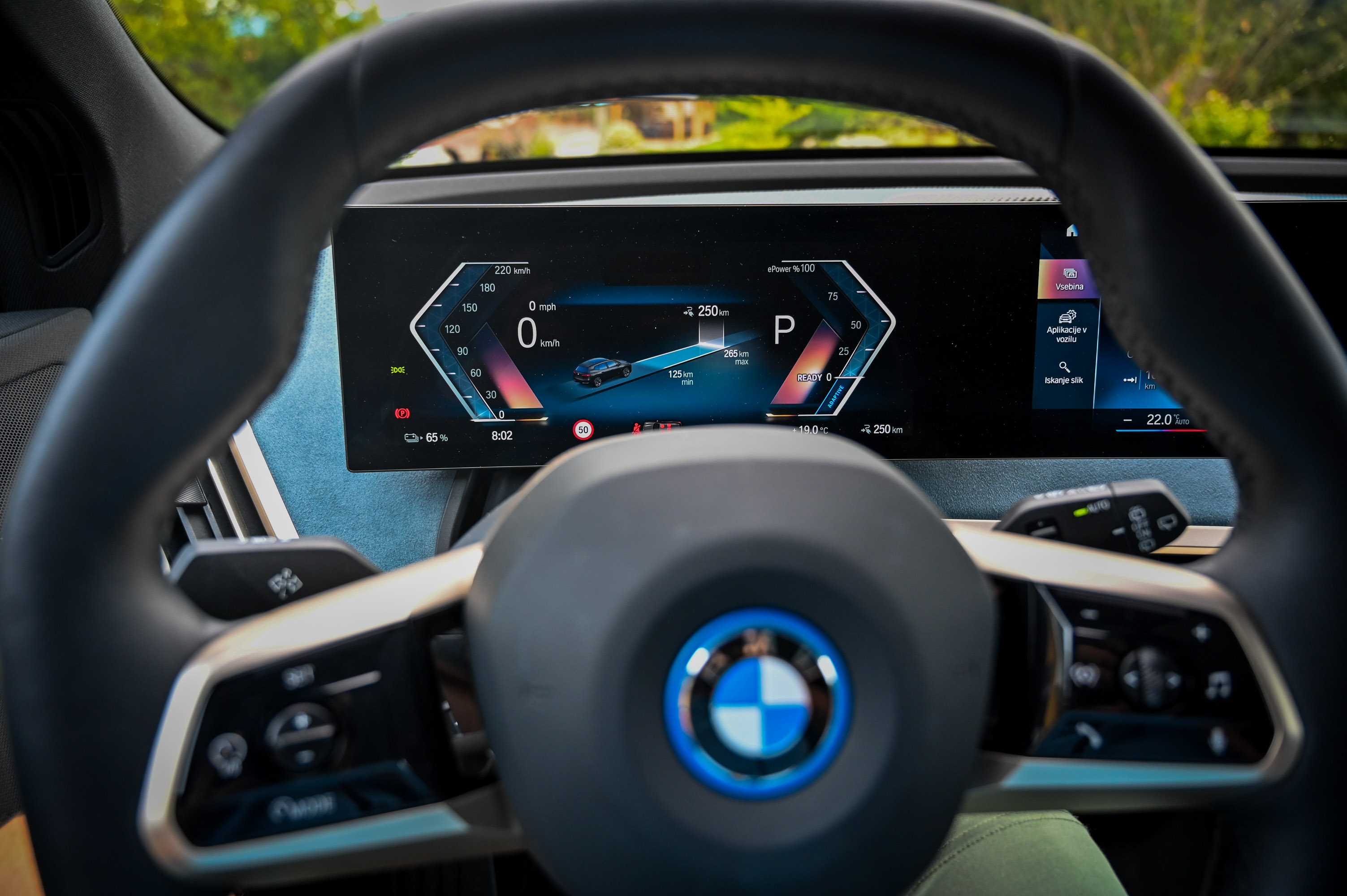 BMW iX ima vgrajeno 5. generacijo električnega pogona eDrive. To pomeni, da ima vsaka os svojo kompaktno pogonsko enoto, ki znotraj ohišja združuje elektromotor, pogonsko elektroniko in menjalnik. Električna motorja sta odlično odzivna, saj njuna rotorja namesto stalnih trajnih magnetov sproži sunek vzbujevalnega toka. To v praksi pomeni, da je celoten navor 630 Nm na voljo že ob zagonu. Piko na i hipni distribuciji navora dodaja prilagodljivo rekuperacijsko zaviranje. Stopnjo elektrodinamičnega zaviranja smo prepustili umetni inteligenci, ki jo odlično prilagaja slogu vožnje in cesti. Pogon si zasluži čisto petico, pravzaprav dvojno za oba motorja. V pikolovskem slogu bi pri oskrbi z energijo želeli večjo moč polnjenja z izmeničnim tokom. Z 11-kilovatnim polnilnikom bo povsem prazen iX potreboval 8 ur za polno povrnjeno zalogo energije. Na običajno gospodinjsko vtičnico pa iX-a nima smisla pripenjati, saj polnjenje traja predolgo.