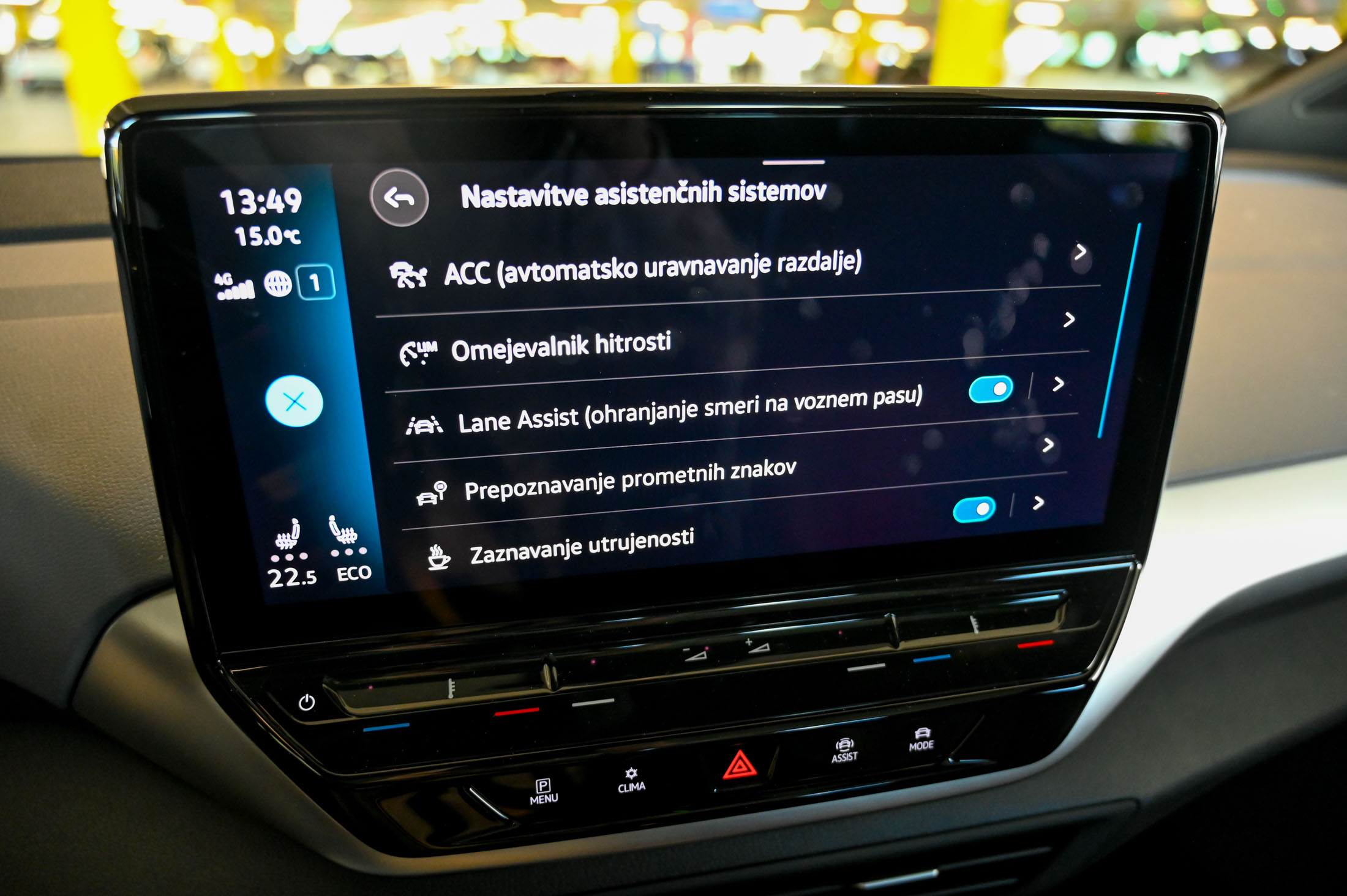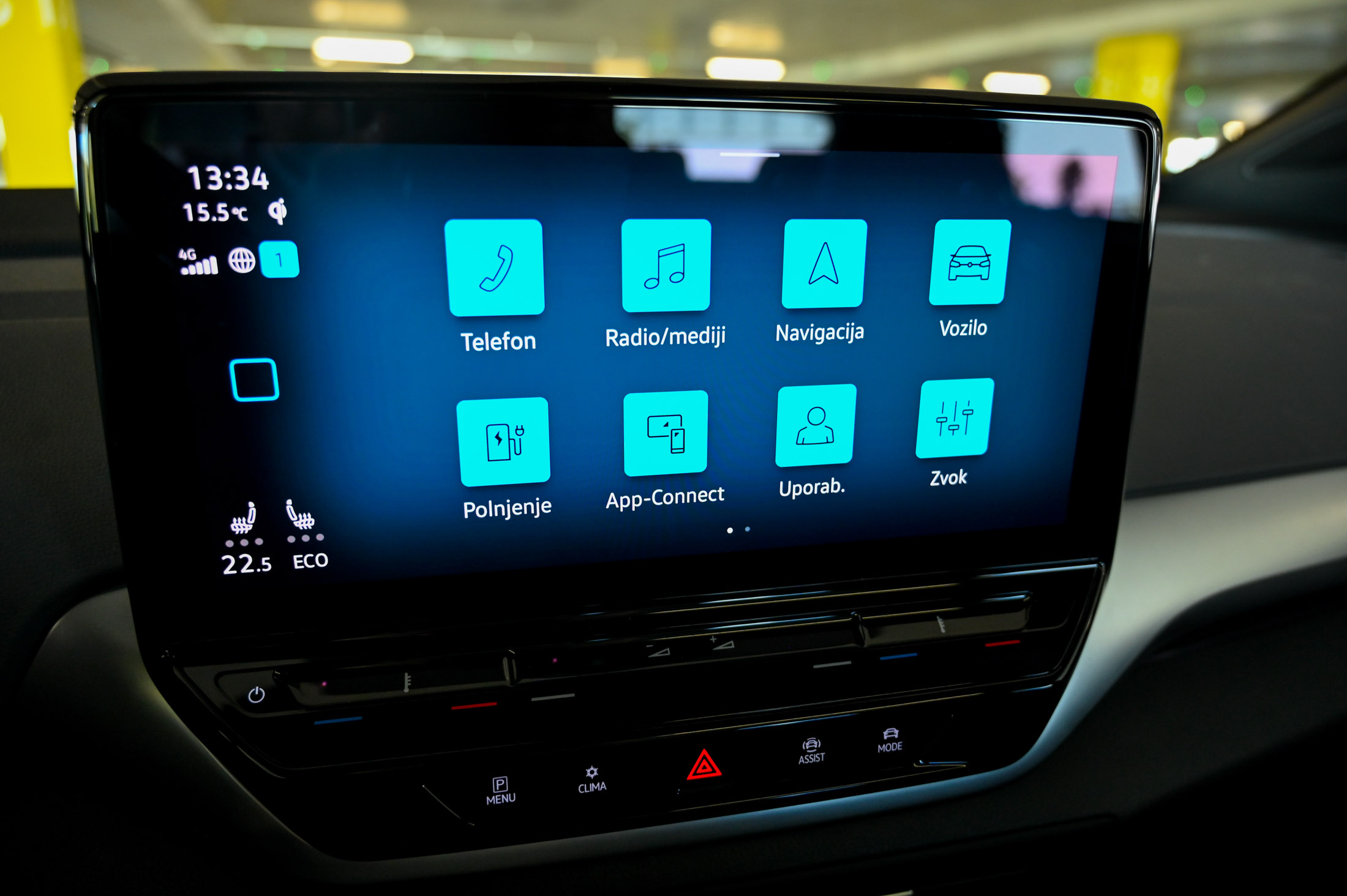 Na testu smo hitro ugotovili, da so pri Volkswagnu izpolnili obljubo o izboljšanju programske opreme, ki nadzira digitalne veščine tega avtomobila. To se najbolj očitno pozna v odzivnosti osrednjega zaslona, ki predvsem pri brezžičnem povezovanju s telefonom in uporabi sistema apple car play deluje precej bolj stabilno. Boljše, hitrejše in natančneje delujejo tudi vgrajena navigacijska naprava, pa bližnjice za nastavljanje klimatske naprave in vozniška pomagala. Na značilno digitalno okolje družine ID. smo se že privadili in z izboljšanim delovanjem ukazov na dotik vse skupaj zagotavlja prijetno uporabniško izkušnjo. Ob tem pohvalimo tudi zgledno prevedene slovenske izbirnike in vsa sistemska sporočila.