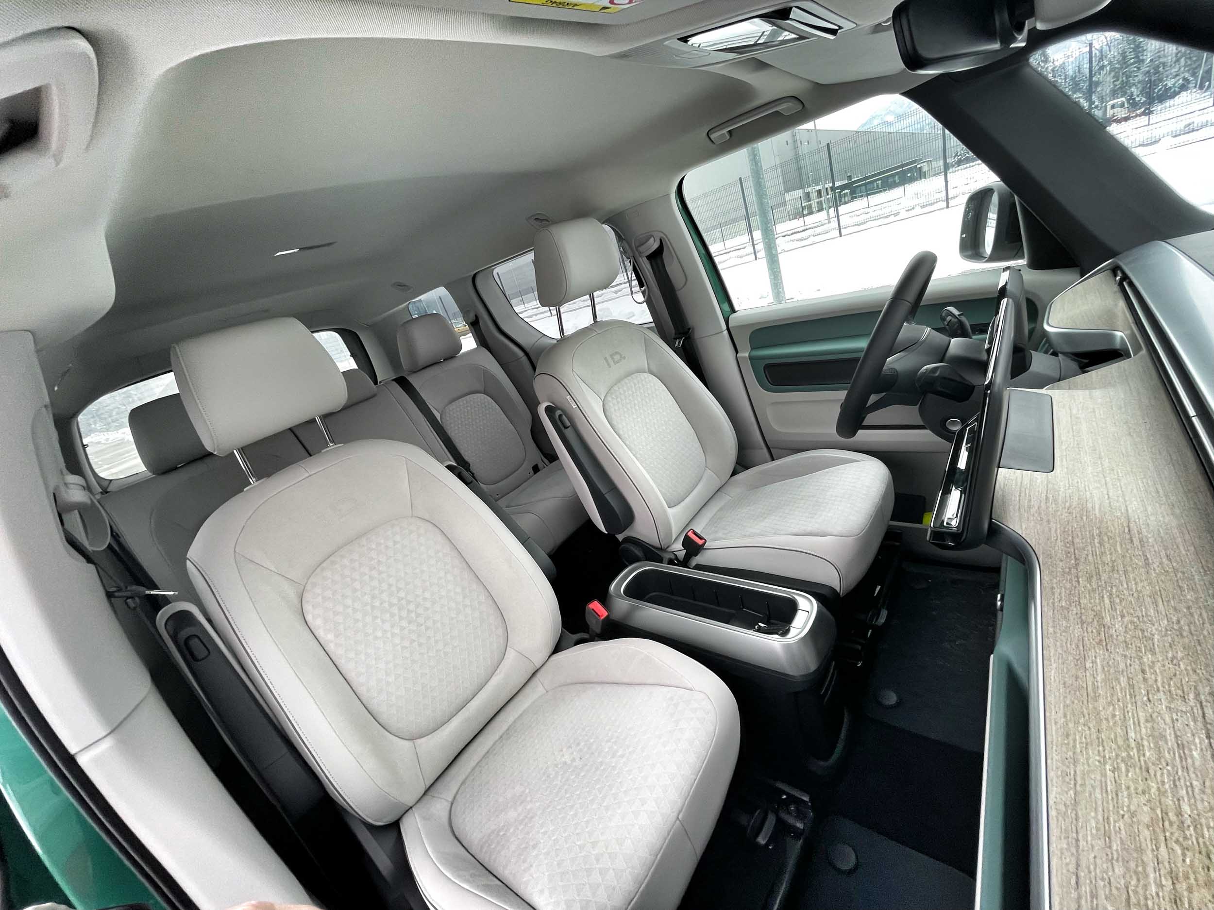 V potniškem delu buzzove kabine je za prednjima sedežema in premično ter odstranljivo sredinsko konzolo prostor za tri potnike; a ne na treh ločenih sedežih, pač pa na čvrsti klopi, ki je vzdolžno pomična za 15 centimetrov in ima nastavljiv naklon naslonjala. V širino buzz v kabini meri udobnih 171 cm, nad sedeži pa je več kot meter prostora do stropa; s prostorom za kolena tako ni nikoli zadrege, le na pokrčenost zaradi nizke višine sedežev se je treba navaditi.