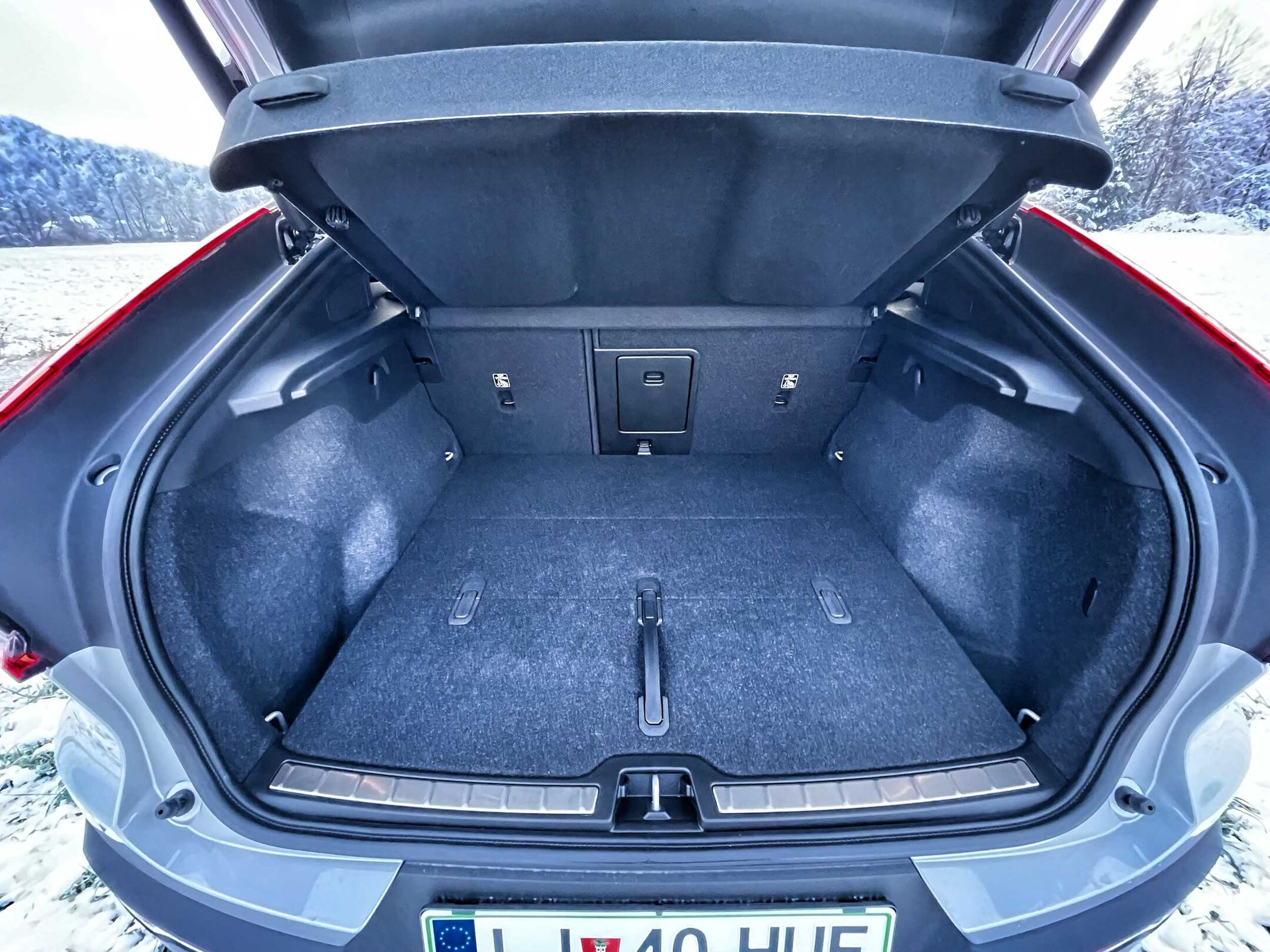 270-centimetrska medosna razdalja je dovolj za dokaj radodarno odmerjene notranje mere, notranjo prostornost - in malce tudi prtljažnik - pa vsaj malo skazi rahlo padajoča kupejevska streha zadaj. Če je nad zadnjo klopjo XC40 do strehe 99 cm prostora, ga je v C40 93 cm, kar pomeni, da bodo višji od 185 cm z glavo hitro ob stropu. Prtljažnik je s 413 litri prostornine (1205 litrov, če naprej prekucnemo naslonjalo zadnje klopi) le za 6 litrov manjši kot pri XC40. K prostoru zadaj je treba prišteti še uporaben prostor pod prednjim pokrovom, kamor lahko zložimo vse mogoče kable. Na še eno posledico kupejevskega zadka velja opozoriti: ozko zadnje steklo in precej debela zadnja stebrička močno omejujejo pogled nazaj.