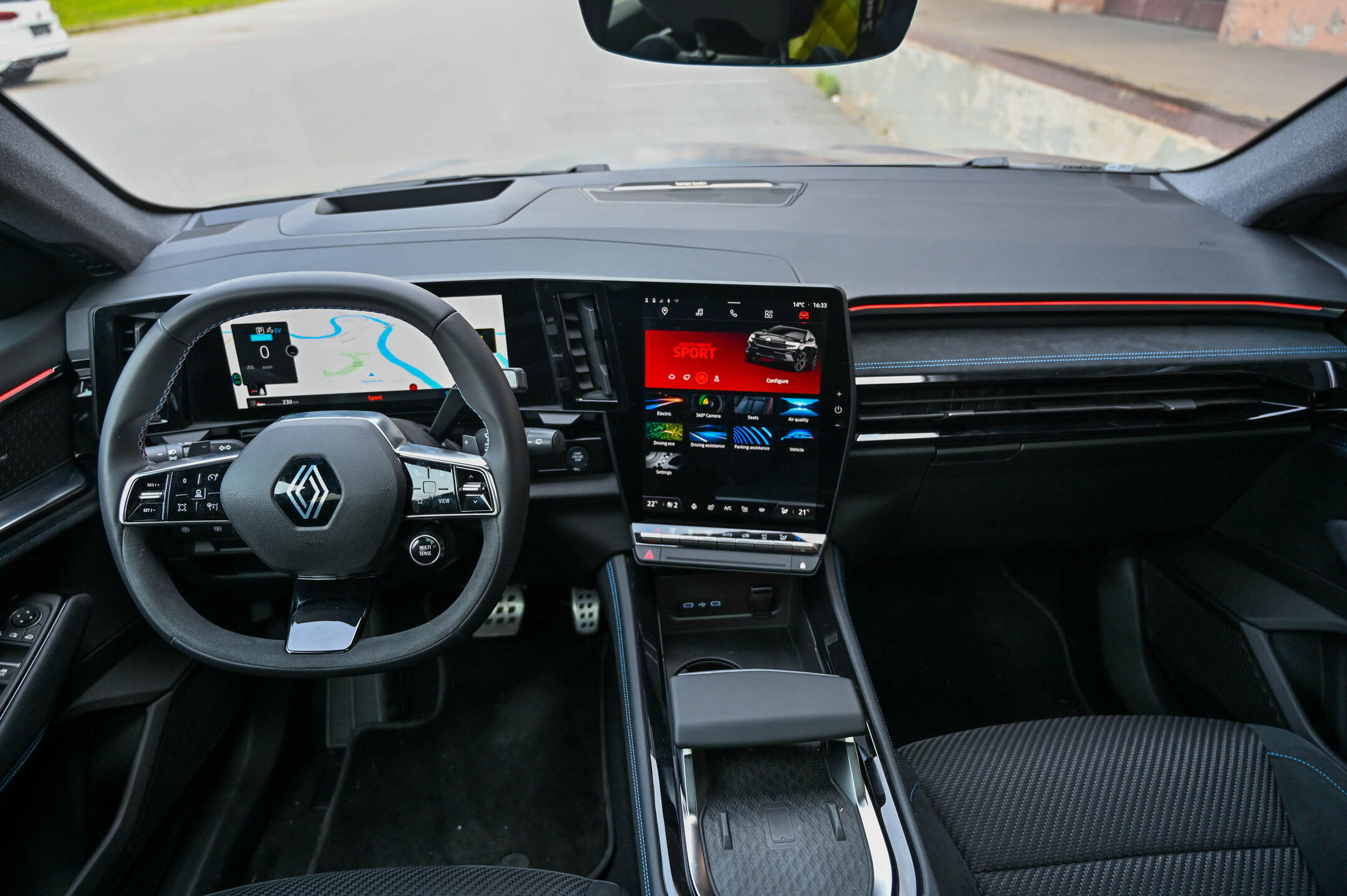 Renault si nedvomno zasluži pohvalo za novo generacijo armaturne plošče in digitalno poroko z informacijskim spletnim velikanom Googlom, ki je na osrednji zaslon 12-palčnega zaslona prinesel številne svoje storitve - od vrhunske navigacije, odličnega glasovnega vmesnika, do glasbe … Znotraj izstopajo še nadpovprečno kakovostni materiali, pa priročna stikala zunaj zaslona na dotik in uporabne odlagalne površine oziroma predali ter pilotsko oblikovan naslon za roko, pod katerimi je še indukcijska ploščad za brezžično polnjenje telefona. Odlična sta tudi prednja sedeža - in položaj za volanom. Pri ergonomiji zmoti le postavitev obvolanske ročice menjalnika. Ta je zaradi gneče, ker je tam še ročica brisalnikov in modul za krmiljenje radia, postavljena malce previsoko in tudi ne deluje tako natančno kot na primer ročica menjalnika v mercedesih.