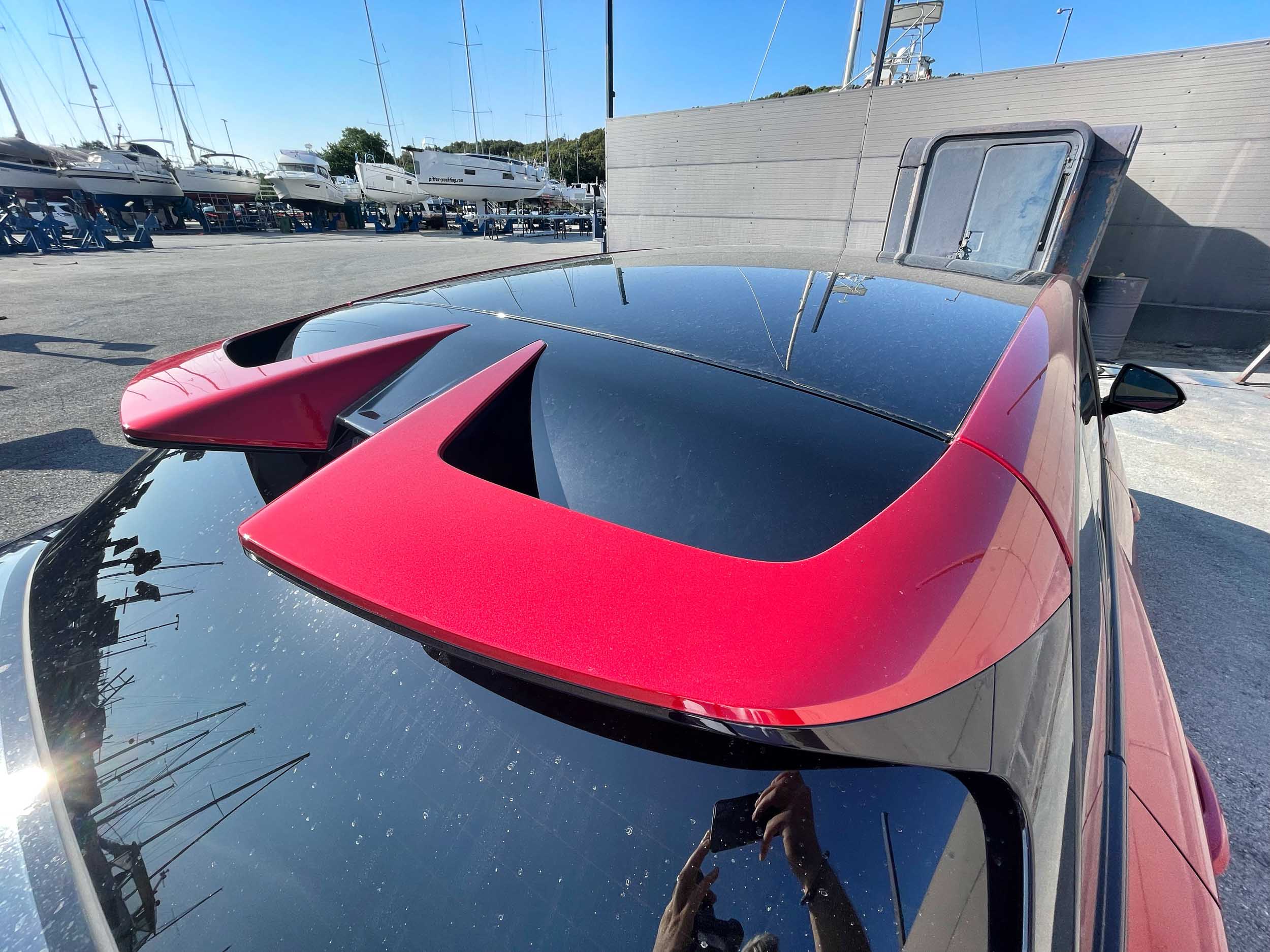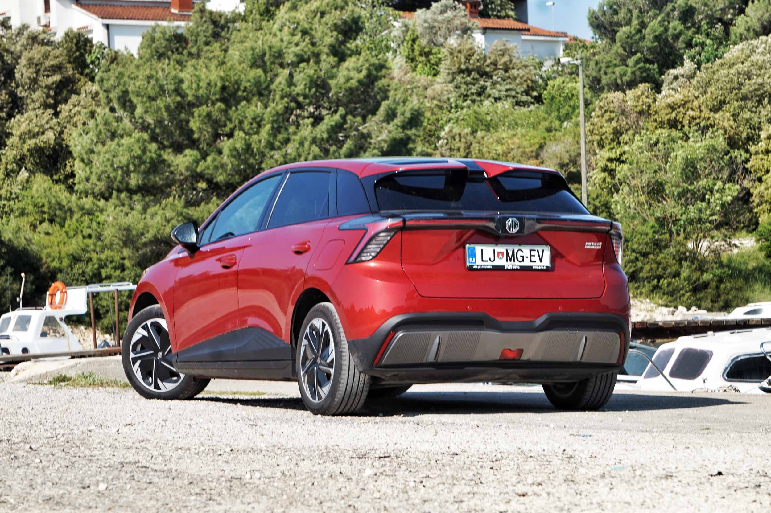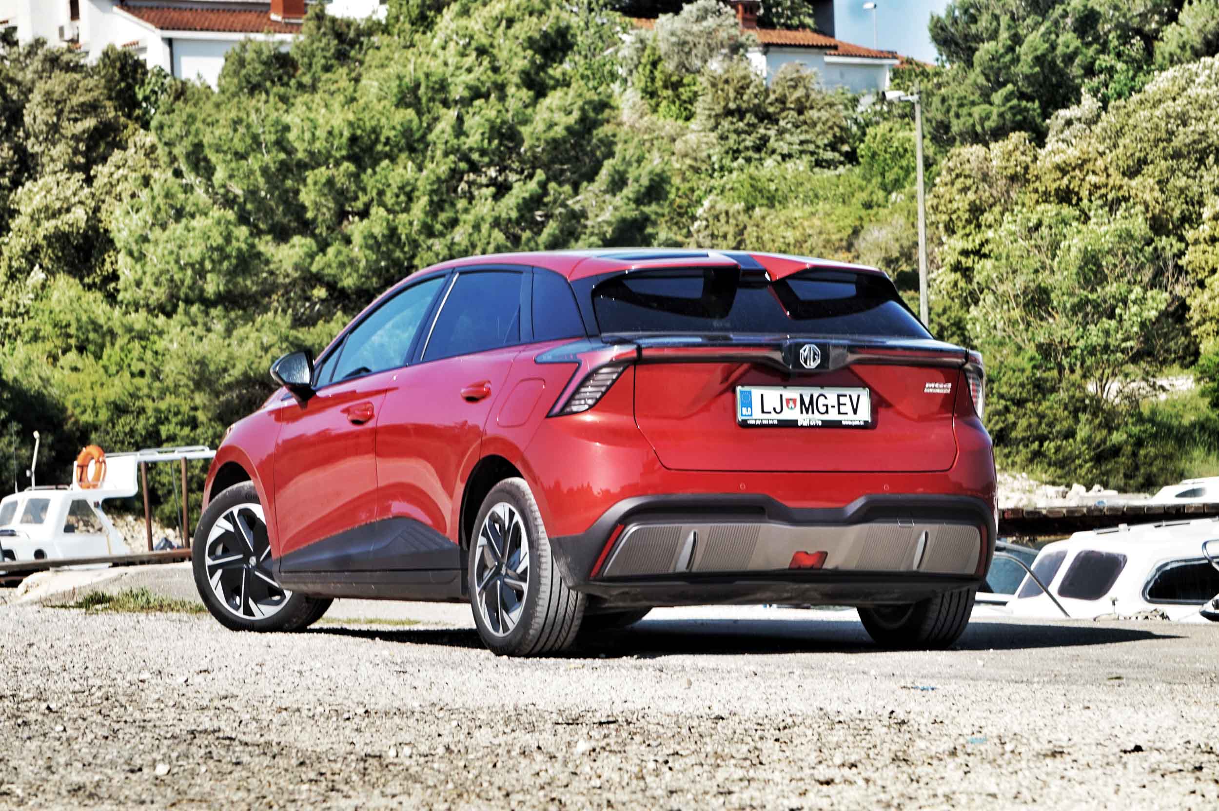 A če Volkswagnovo družino ID lahko prepoznamo že od daleč, ima MG4 z identiteto in prepoznavnostjo več težav: od spredaj je z zašiljenim nosom, z navzdol zaobljenim pokrovom motornega prostora in z ozkima žarometoma videti zelo dinamično, zadaj pa pozornost krade preizrazit deljeni spojler nad zadnjim steklom, na katerem smo v dežju pogrešali metlico brisalnika. Ozki in v boka zarezani zadnji luči ter svetlobni trak med njima dodajo svoje k oblikovni zmešnjavi: avta na cesti ne boste prepoznali, nedvomno pa ga boste opazili.