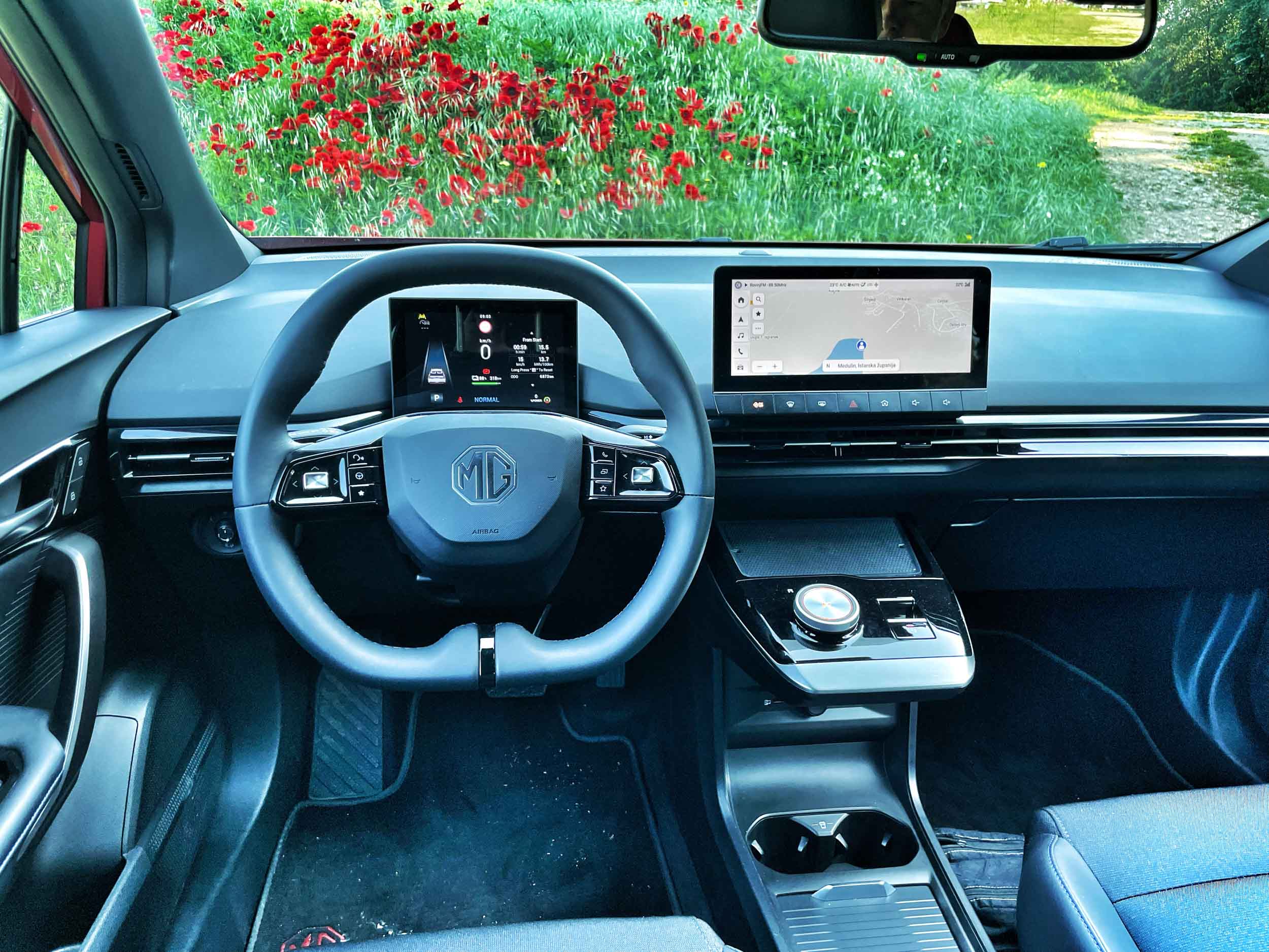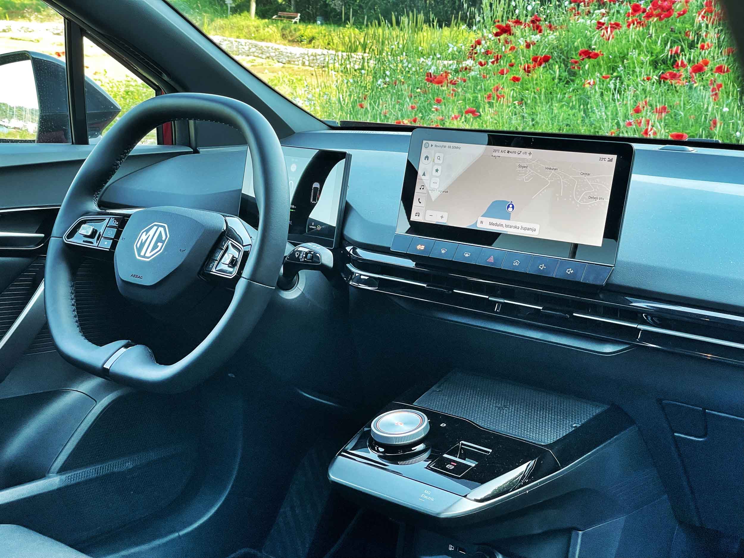 V notranjosti MG4 sledi digitalni avtomobilski mantri: pred voznikom je majhen digitalni zaslon z bogatimi vozniškimi podatki, na sredini pa je nad zašiljenim nadstreškom z vrtljivim gumbom menjalnika prostostoječ zaslon multimedijske naprave, ki pa nam je med preskusom povzročal veliko sivih las. Uporabniški vmesnik je nepregleden, slabo čitljiv, predvsem pa slabo odziven: na digitalna stikala je treba pritisniti večkrat, izbirniki so nelogični, kar nekaj funkcij je nerazumno skritih oziroma slabo dostopnih. Če k temu dodamo še naključne izklope radijskega sprejemnika in zahteve po uparjanju s pametnim mobilnikom vsakič, ko sedemo v avto, je naša jeza zagotovo bolj razumljiva in upravičena: kot da bi bil digitalni vmesnik v MG4 še v preskusni (“beta”) različici. Glede na to, da programsko opremo v avtu posodabljajo brezžično, upamo, da bo avto deležen temeljite posodobitve uporabniškega vmesnika, ko bo v različici luxury septembra na voljo tudi kupcem.