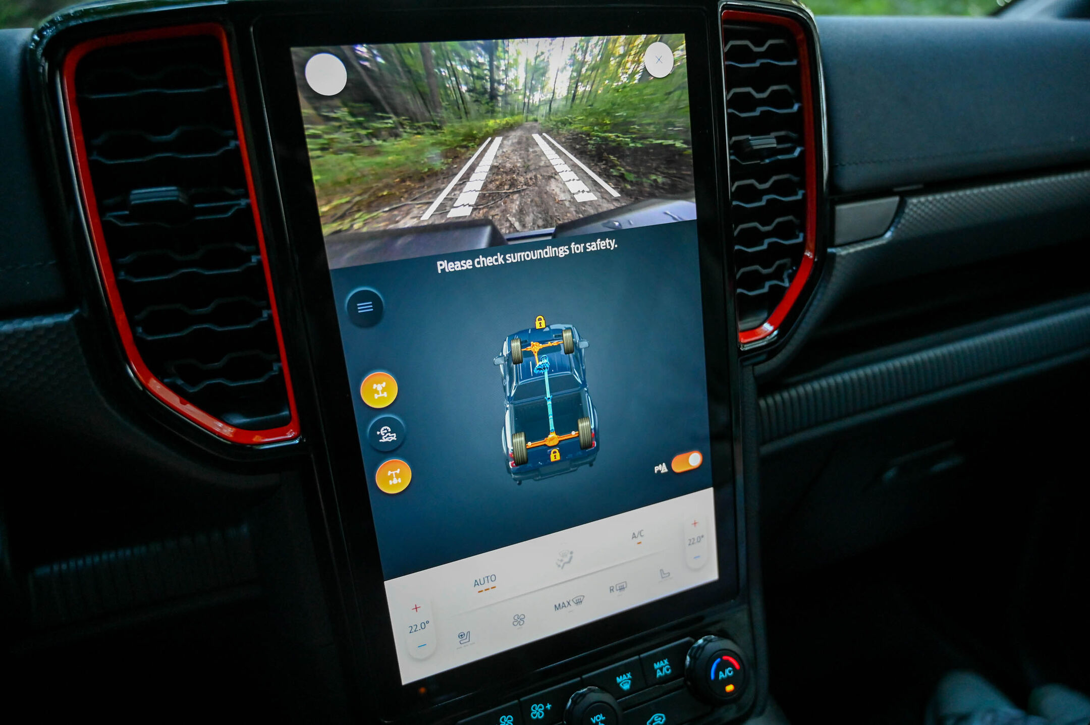 Tudi glede terenskih zmogljivosti mu nihče ne more očitati tehnološko-mehanske nedoslednosti. Od tal je oddaljen skoraj 27 centimetrov in na dnu prednjega dela ima jekleni ščit debeline 2,3 milimetra. Pri plezanju po strmini, plazenju čez korenine in kamenje mu poleg reduktorja in diferencialnih zapor spredaj ter zadaj izdatno pomagajo tudi napredni elektronski sistemi, kot je nov terenski tempomat. Ta vozniku omogoča samodejno nastavitev hitrosti nižje od hitrosti pešca (3 km/h) pa vse do 32 km/h. Tako se voznik lahko osredotoči na natančno usmerjanje avta po terenu in na velikem pokončnem 12-palčnem zaslonu vklopi še 360-stopinjski nadzor okolice z natančnimi kamerami na vseh izpostavljenih delih karoserije.
