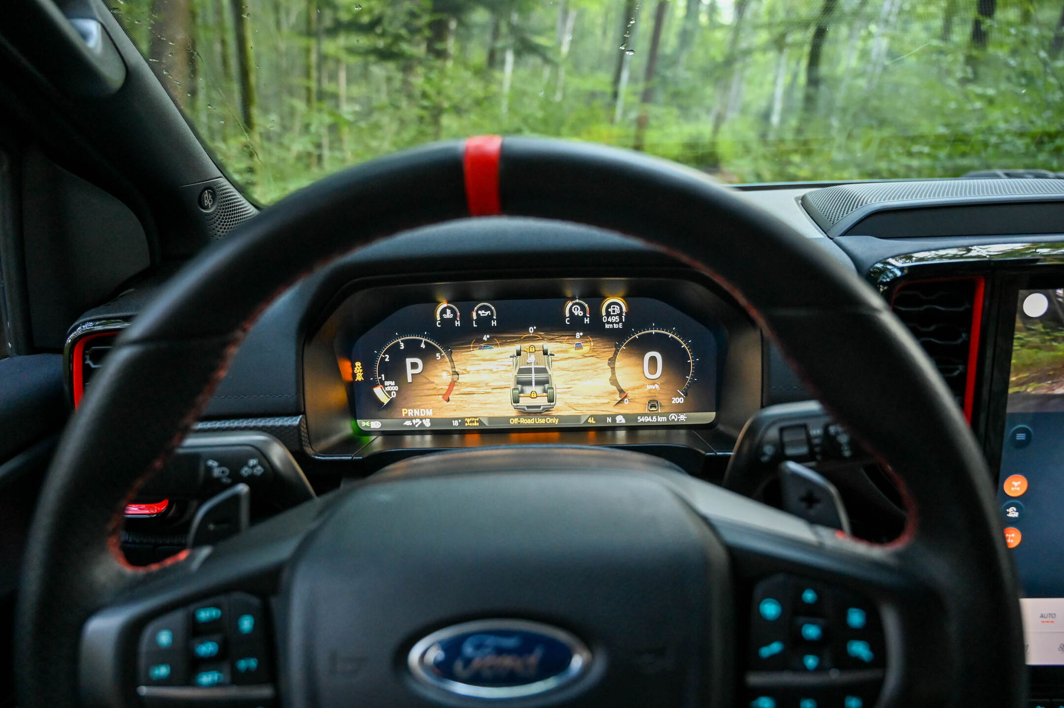 Pristop v kabino bi bil brez široke jeklene stopnice precej težji. V kabini voznika in sovoznika pričakata udobna športna sedeža, oblikovana po vzoru pilotskega iz lovskega letala F22 raptor, ki zelo dobro objameta telesi. Ravno prav velik in debel športni volanski obroč lepo sede v roke, vse skupaj je oplemeniteno z usnjem in rdečimi šivi. Kabina je zaradi visokega položaja sedenja odlično pregledna in zaradi 3,27 metra dolge medosne razdalje tudi bolj prostorna. Raptor je izdatno založen s tankočutnimi digitalnimi sistemi za varnejšo vožnjo in celovito komunikacijo, zato je tudi v mestu razmeroma dobro obvladljiv, a precej bolj okoren kot na odprti cesti. Odličnemu digitalnemu vmesniku sync4 zamerimo, da ni preveden v slovenščino.