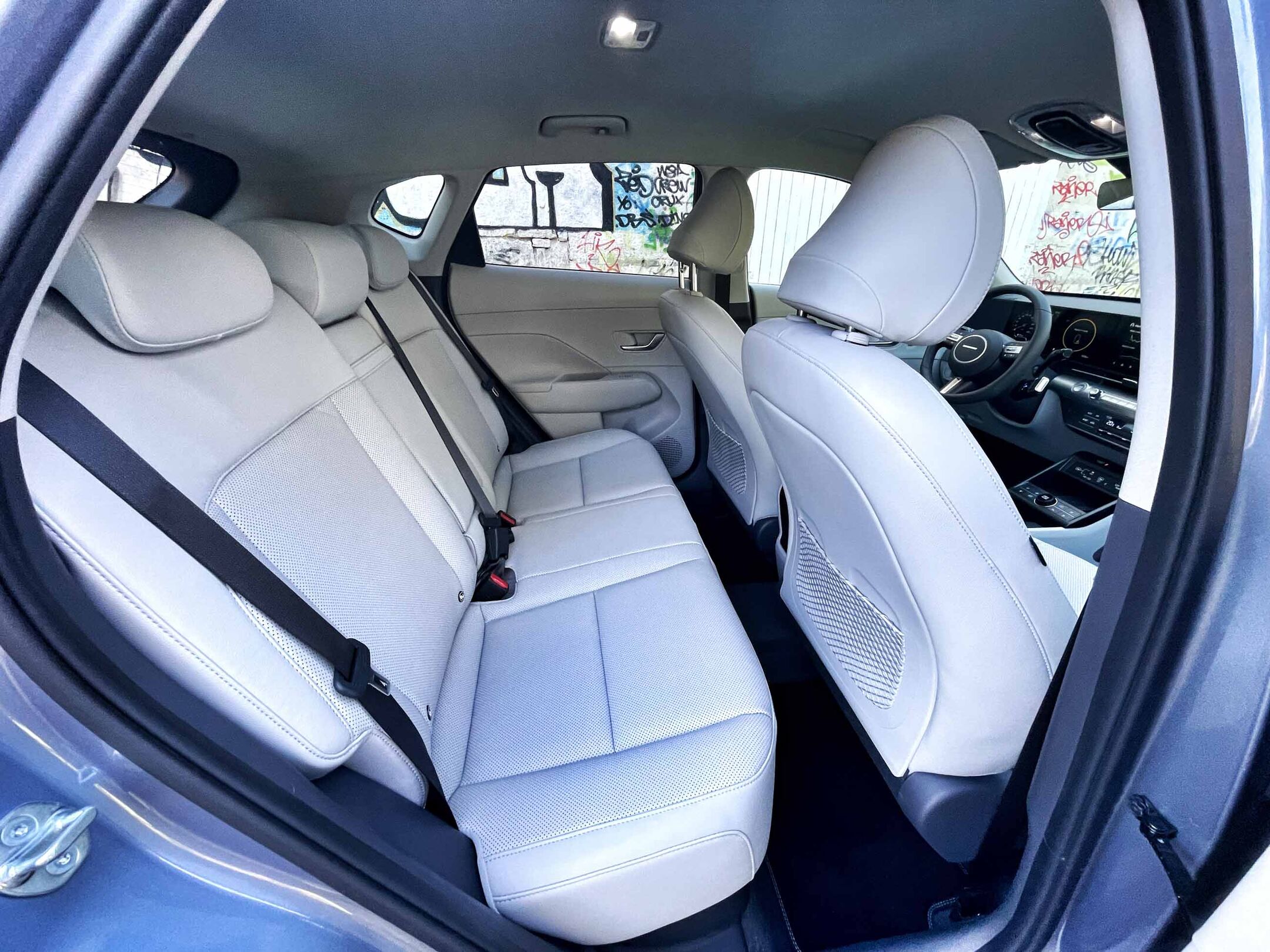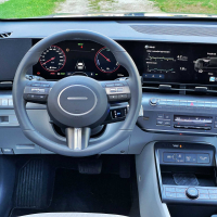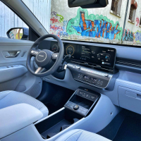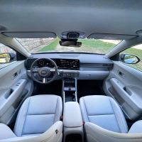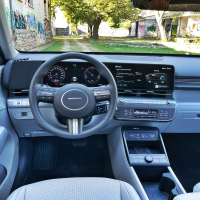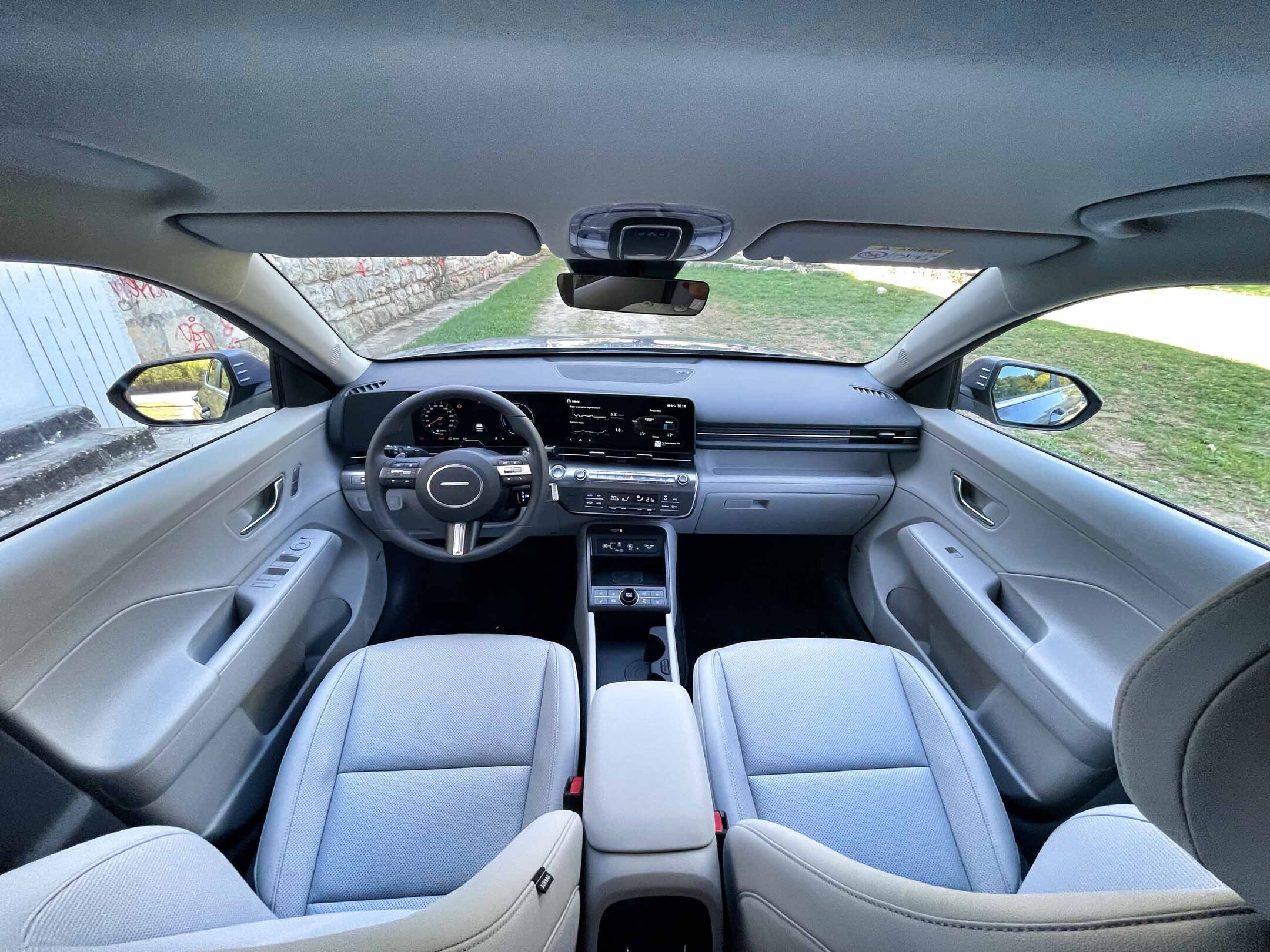 Ta “električna” oblikovna rdeča nit se vleče tudi v notranjosti, ki spominja na notranjost v ioniqih 5 in 6; skupna sta jim v panoramski panel združena 12,3-palčna digitalna zaslona, eden na mestu klasičnih merilnikov, drugi kot zaslon multimedijske naprave. Sodobna in odzivna grafika poudarja futurističen videz, a ne zahteva preveč voznikovih dotikov in pozornosti: stikalna vrstica pod osrednjim zaslonom in ločeno upravljanje gretja ter zračenja omogočata hitro izbiro bližnjic in nastavitev funkcij (skoraj) brez nevarnega iskanja bližnjic v izbirnikih uporabniškega vmesnika. Ta je sicer odziven, a s kakšno ukazno potezo preveč, zaradi česar si zasluži majhen odbitek pri oceni, tako kot dejstvo, da pri zmogljivejši multimedijski napravi z navigacijo ni možna brezžična Applova CarPlay (ali Android Auto) povezava; ta naj bi prišla z eno od posodobitev na daljavo (Over-The-Air updates). Prestavno ročico avtomatiziranega šeststopenjskega menjalnika so prestavili s sredinske konzole pod volanski obroč, zaradi česar ima kona zdaj še uporabnejšo sredinsko konzolo z veliko prostora za drobnarije in induktivno ploščico za polnjenje mobilnikov. Izboljšana kakovost vgrajenih materialov in različne teksture površin notranjosti dajejo prestižnejši ter kakovostnejši vtis, je pa svetla barvna shema vendarle malce monotona - pa še hitreje umazana. Mimogrede: z obvolanskima “prestavnima” ročicama v voznem programu “eco” upravljamo z močjo rekuperacije, v programu “sport” pa ročno pretikamo med prestavami.