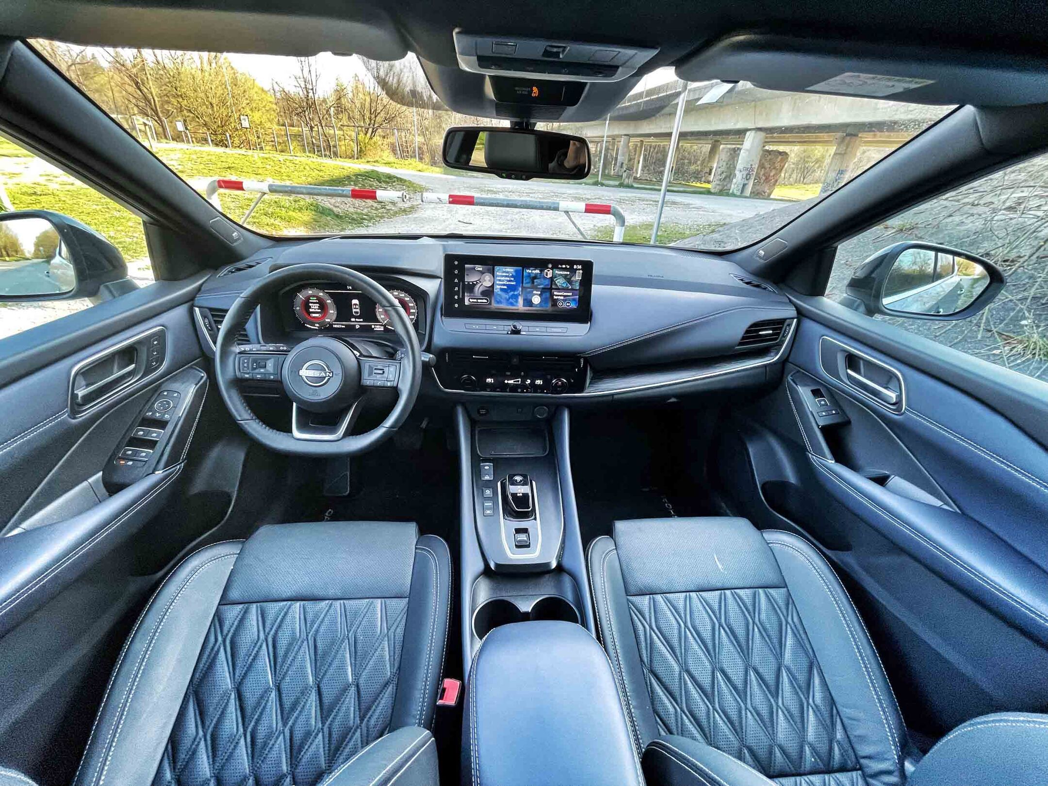 Tudi v notranjosti qashqai pusti prijeten občutek: prostostoječ zaslon multimedijske naprave so pomaknili v gornji del armaturne plošče, pod njega vstavili gumbe in stikala klimatske naprave, merilnike zamenjali z zaslonom, vse skupaj pa obdali z na pogled in na otip prijetno obliko. Multimedijski sistem je temeljito povezan s svetom, vozniška ergonomija je vzorna, digitalizacija je narejena na pravilen način in ne pleni (preveč) pozornosti. Presenečajo zelo soliden oziroma čvrst občutek kakovosti, ki smo ga vajeni iz prestižnejših avtomobilov in dobra prednja sedeža, ki sta v opremskem paketu tekna oblečena v prijetno ter všečno kombinacijo blaga in umetnega usnja.