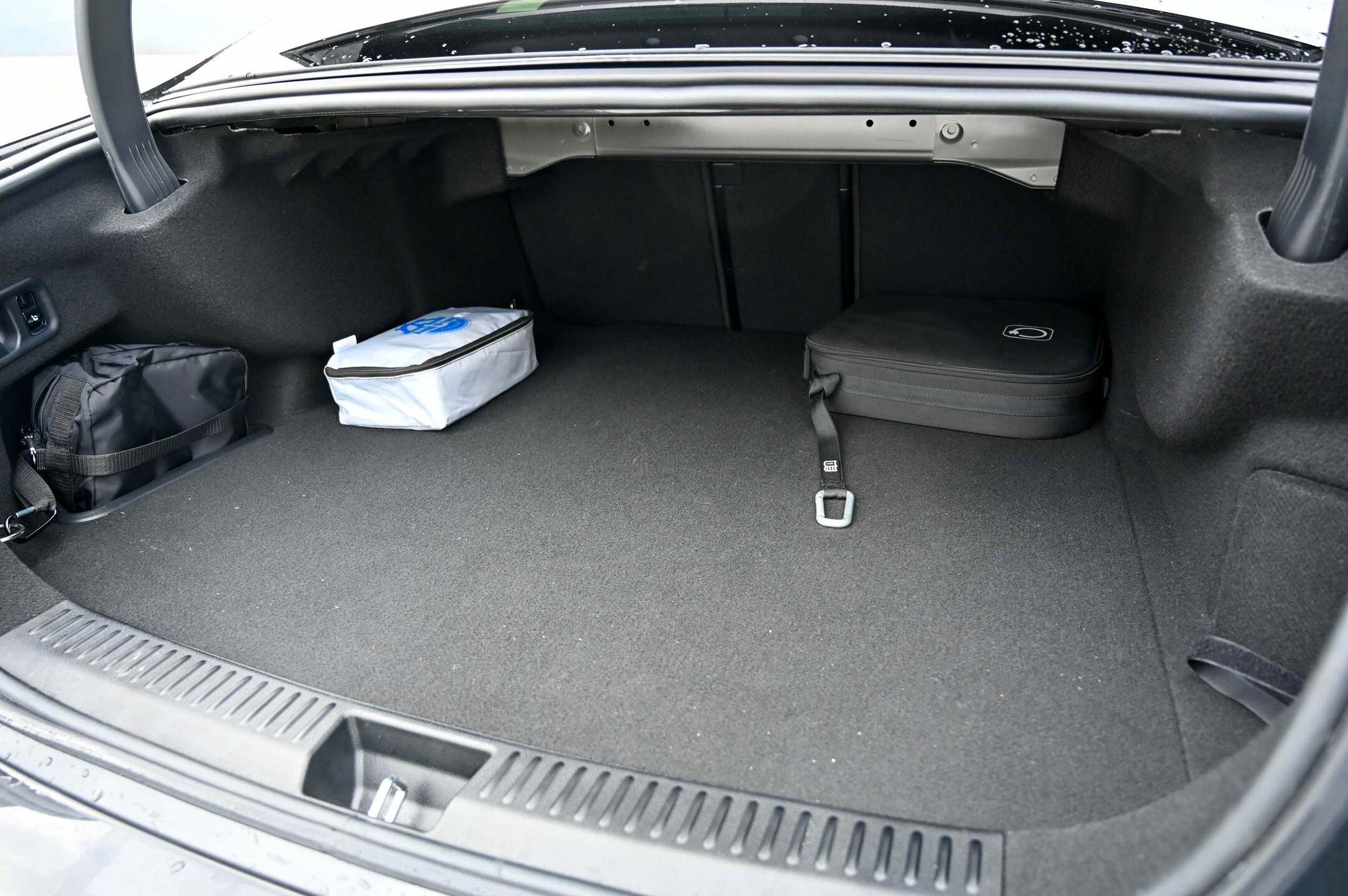 Največjo kritiko si ta limuzina zasluži za prostornino prtljažnika. Zaloga elektrike vzame (pre)velik davek pri njegovi uporabnosti: prtljažnik je dolg, a izjemno plitek. Ponudi vsega 370 litrov prostora, kar je, denimo, 10 litrov manj od prostornine prtljažnika Škodine fabie. Del skromno odmerjene prtljažne prostornine - sploh glede na velikost avtomobila - zasede še polnilna oprema.