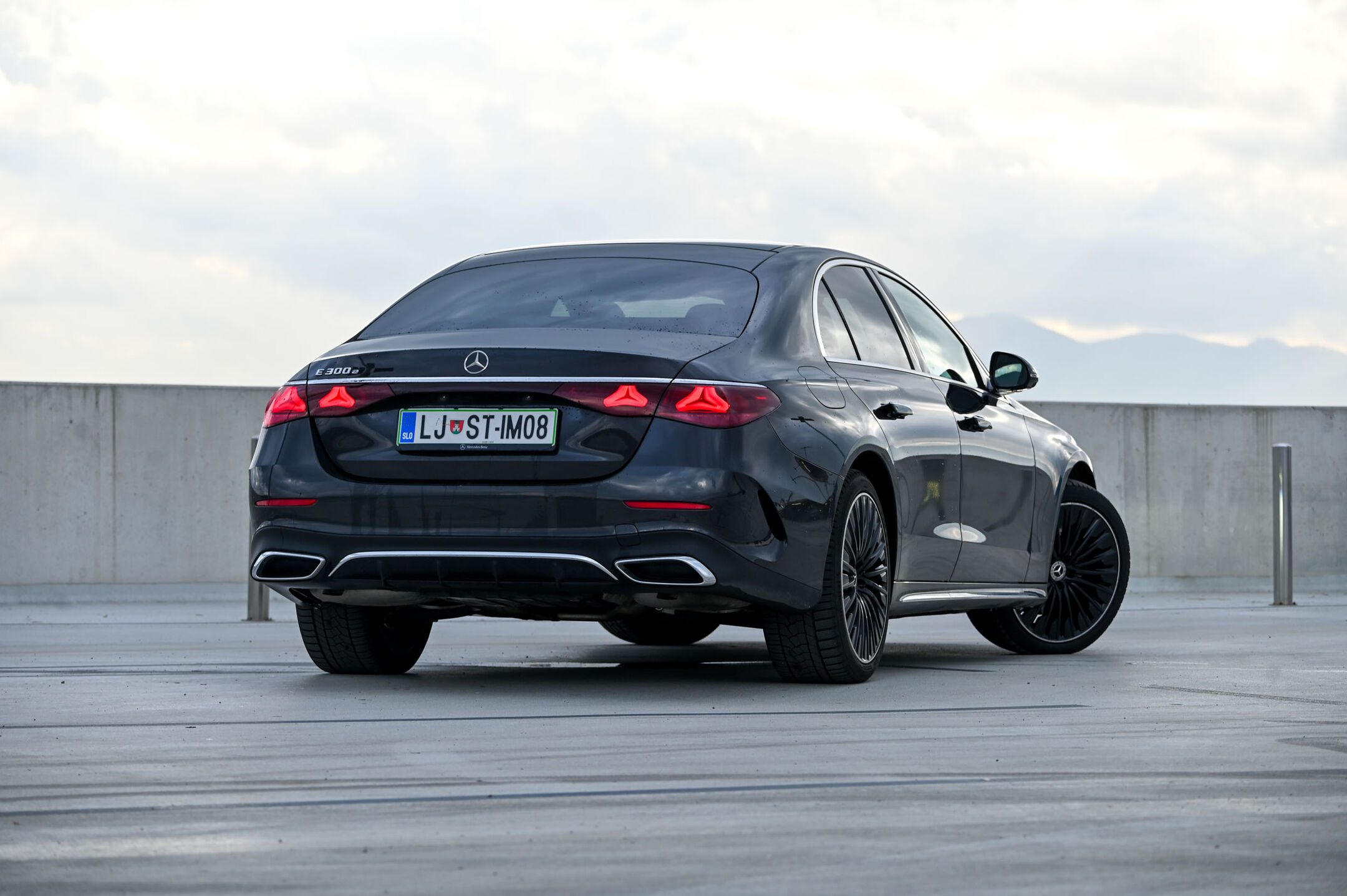 K udobju in predvsem učinkovitosti veliko dodata še zmogljiv priključno-hibridni pogon in 9-stopenjski samodejni menjalnik. V njegovo ohišje so dodali diskasti električni motor (95 kW), ki je v primerjavi s prejšnjo generacijo močnejši za 5 kW, predvsem pa ima za pogon na voljo občutno večjo zalogo elektrike in zmogljivejši polnilnik. Z novim pogonskim akumulatorjem zmogljivosti 25,4 kWh zmore novi E v gostem mestnem ali primestnem prometu z nekaj pazljivosti prevoziti približno 100-kilometrsko razdaljo z izklopljenim bencinskim motorjem, a tudi pri hitrejši vožnji lahko zgolj na elektriko prevozi dobrih 80 kilometrov. Večja zaloga elektrike se je odlično izkazala tudi v hibridnem načinu vožnje, namenjenemu potovanju na daljše razdalje z višjimi potovalnimi hitrostmi. Na testu smo prevozili precej avtocestnih relacijskih kilometrov in pri tem je avto v 743-kilometrskem meritvenem ciklu zabeležil 4,8-litrsko porabo bencina na 100 kilometrov. Pri tem je sočasno v povprečju porabil še 7,2 kWh elektrike na 100 kilometrov. Z novo generacijo bencinske različice priključnega hibrida novega razreda E je avto v povprečju na 100-kilometrski razdalji porabil 6 decilitrov manj goriva kot pri dizelski različici priključnega hibrida v prejšnji generaciji razreda E. Pri kombinirani mestni in medkrajevni vožnji po magistralkah je ob dosledni uporabi električnega priključka povprečna poraba goriva padla na vsega 2 litra na 100 km.