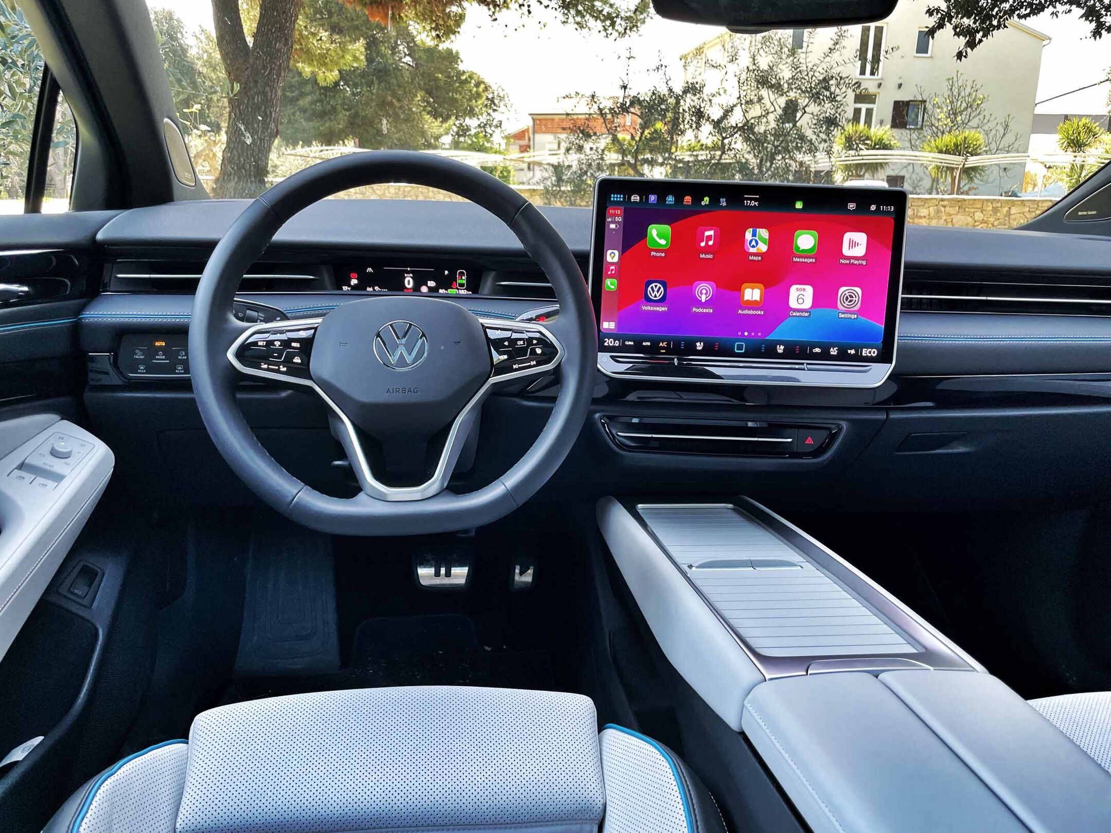 ID.7 bi le težko uvrstili v razred prestižnih električnih limuzin, a vseeno ponuja vrhunsko počutje v avtu. Po izbiri, naboru in kakovosti materialov se res ne more meriti s prestižnimi znamkami, po uporabnosti, udobju in preglednosti pa se lahko. Z novim 15-palčnim zaslonom na dotik in majhnim digitalnim merilnikom pred voznikom ID.7 od znotraj ponuja podobne občutke kot recimo Teslini avtomobili, a tudi več domačnosti in topline - in zato manj špartanskega minimalizma. O temeljito izboljšani programski opremi multimedijskega sistema v najnovejših volkswagnih smo že pisali, po štirinajstdnevnem testu pa lahko potrdimo, da (končno) deluje brezhibno. In da so drsna stikala za glasnost in nastavitev temperature ob vznožju sredinskega zaslona zdaj zares - in končno - osvetljena.