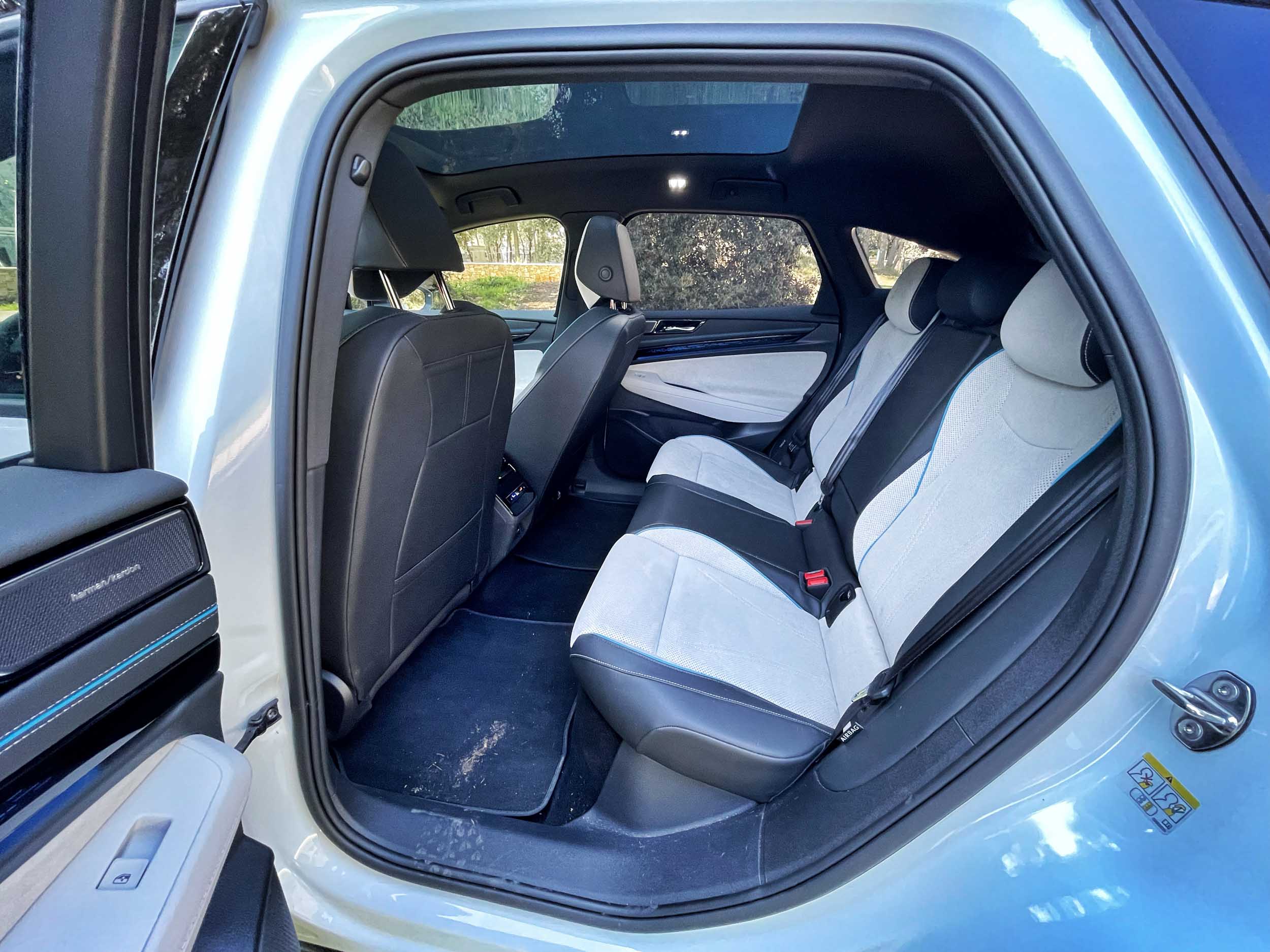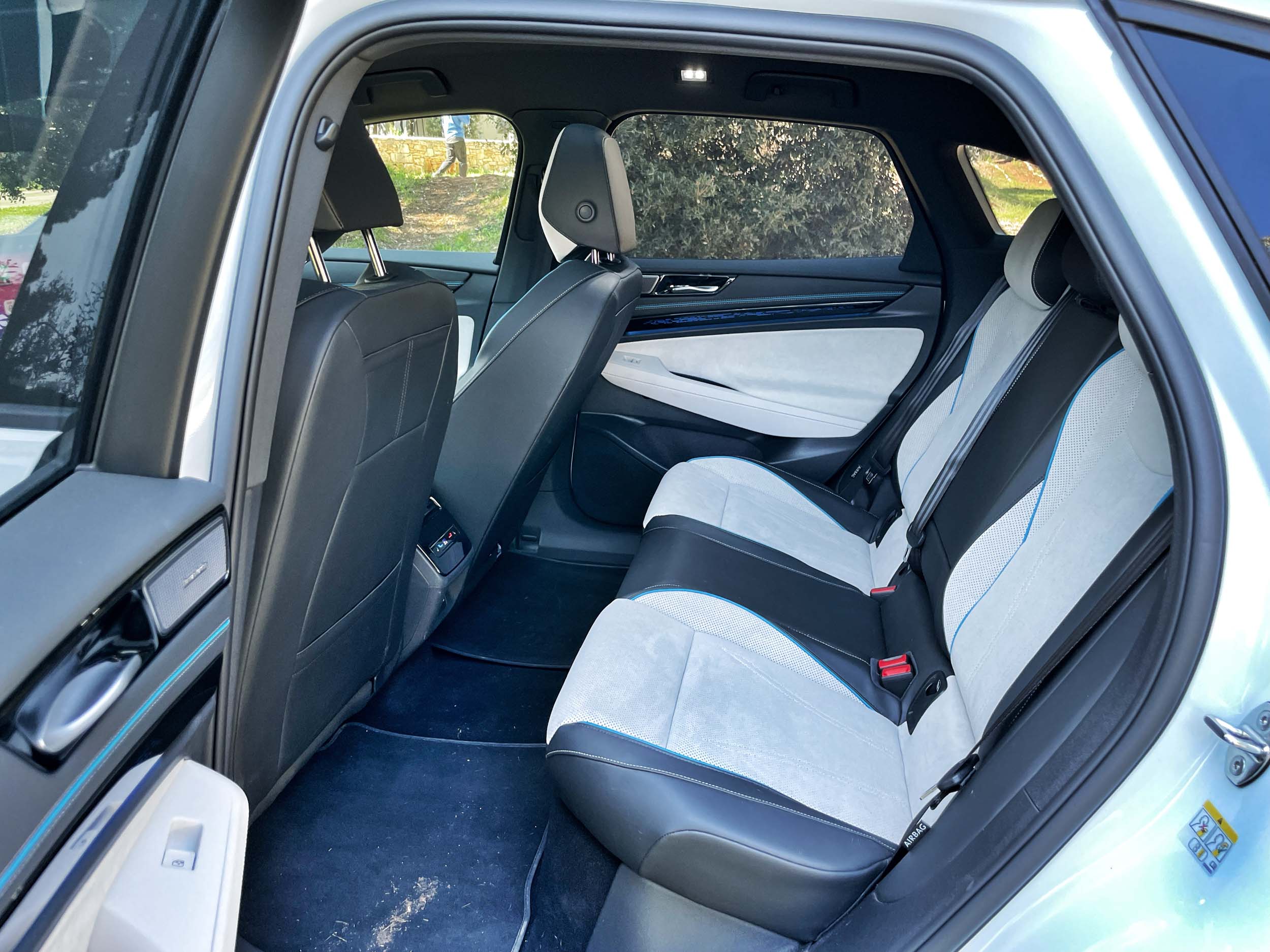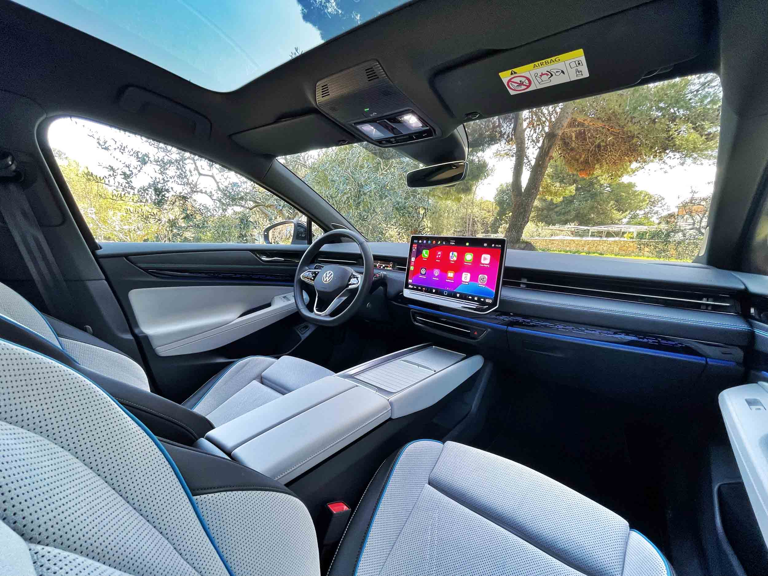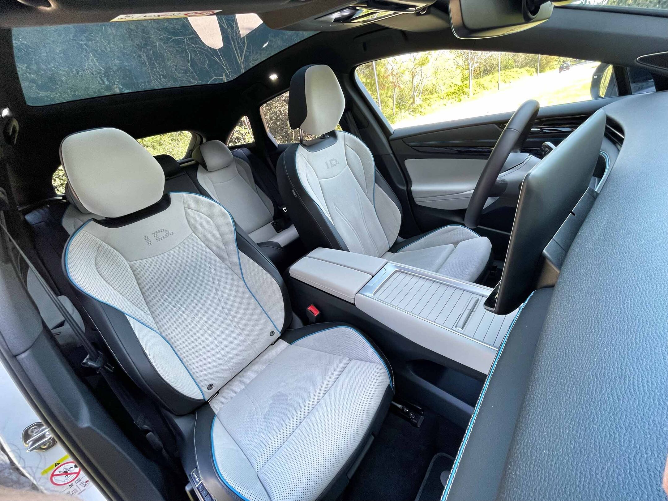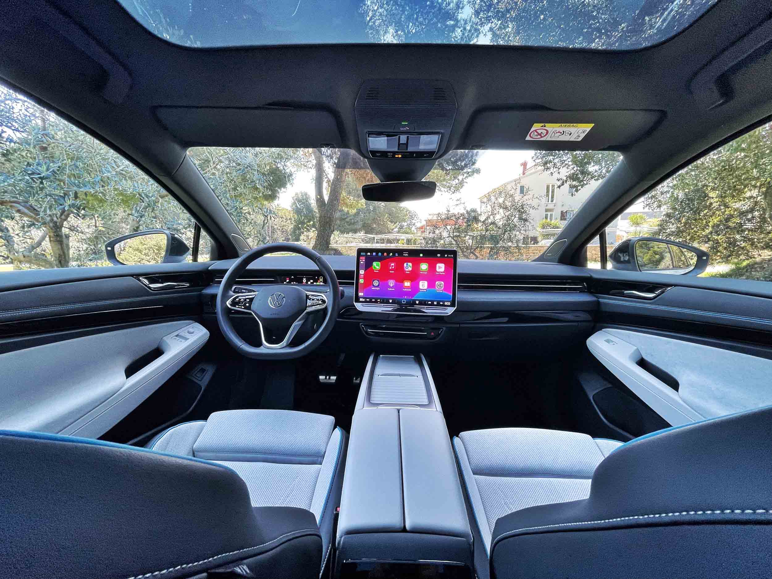 Le v redkih električnih (pa tudi bencinskih oziroma dizelskih) avtomobilih se v notranjosti sedi tako udobno in prostorno kot v ID.7; s skoraj tremi metri razdalje med obema osema in ob odsotnosti sredinskega (kardanskega) grebena je prostora za kolena potnikov seveda v izobilju. Za razliko od nekaterih tekmecev, kot sta mercedes EQE ali BMW i4, je v ID.7 v izobilju tudi prostora za glave potnikov, k svetli in zračni notranjosti pa veliko pripomorejo tudi svetli odtenki v kabini in sončna streha s samodejno zatemnitvenim steklom.
