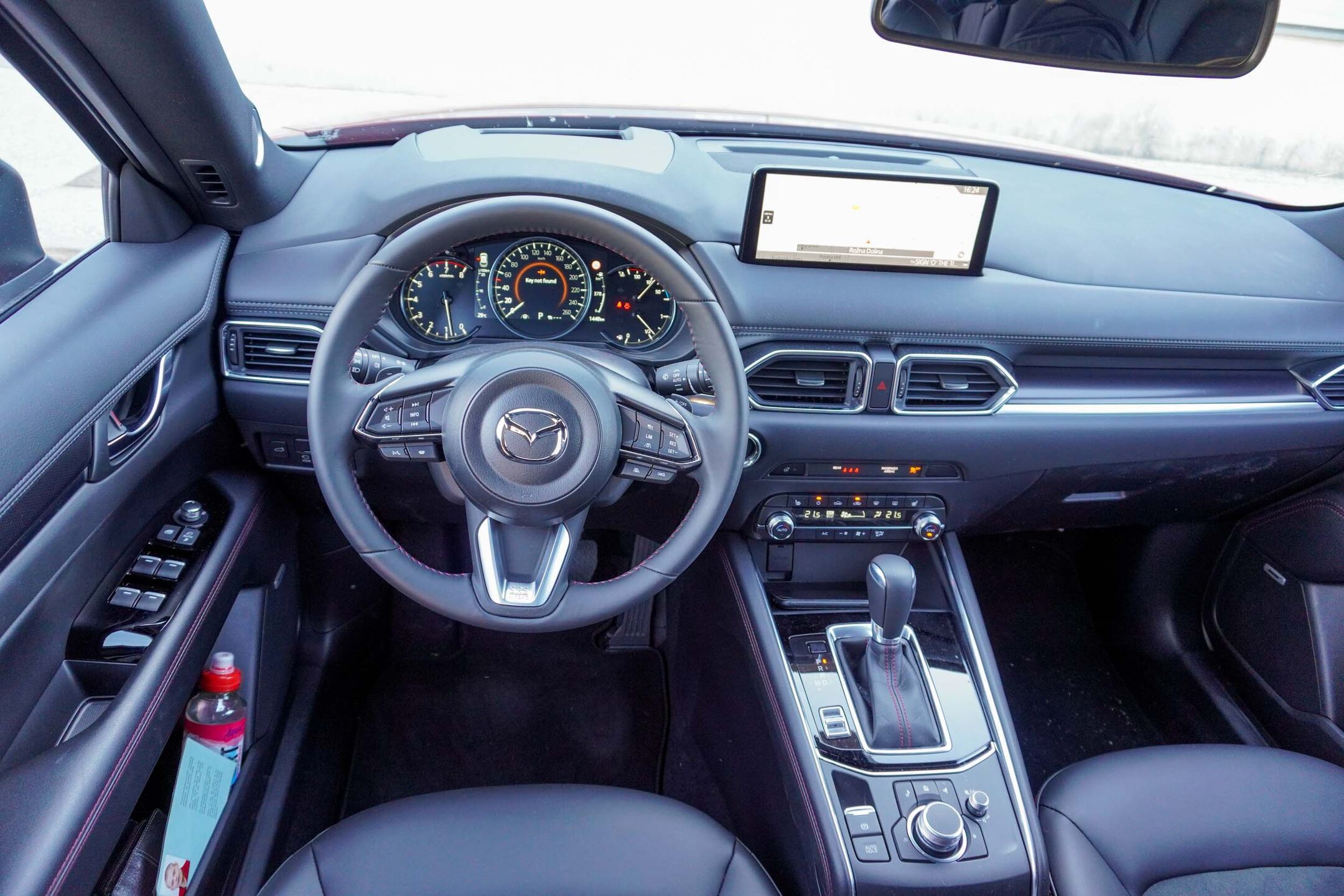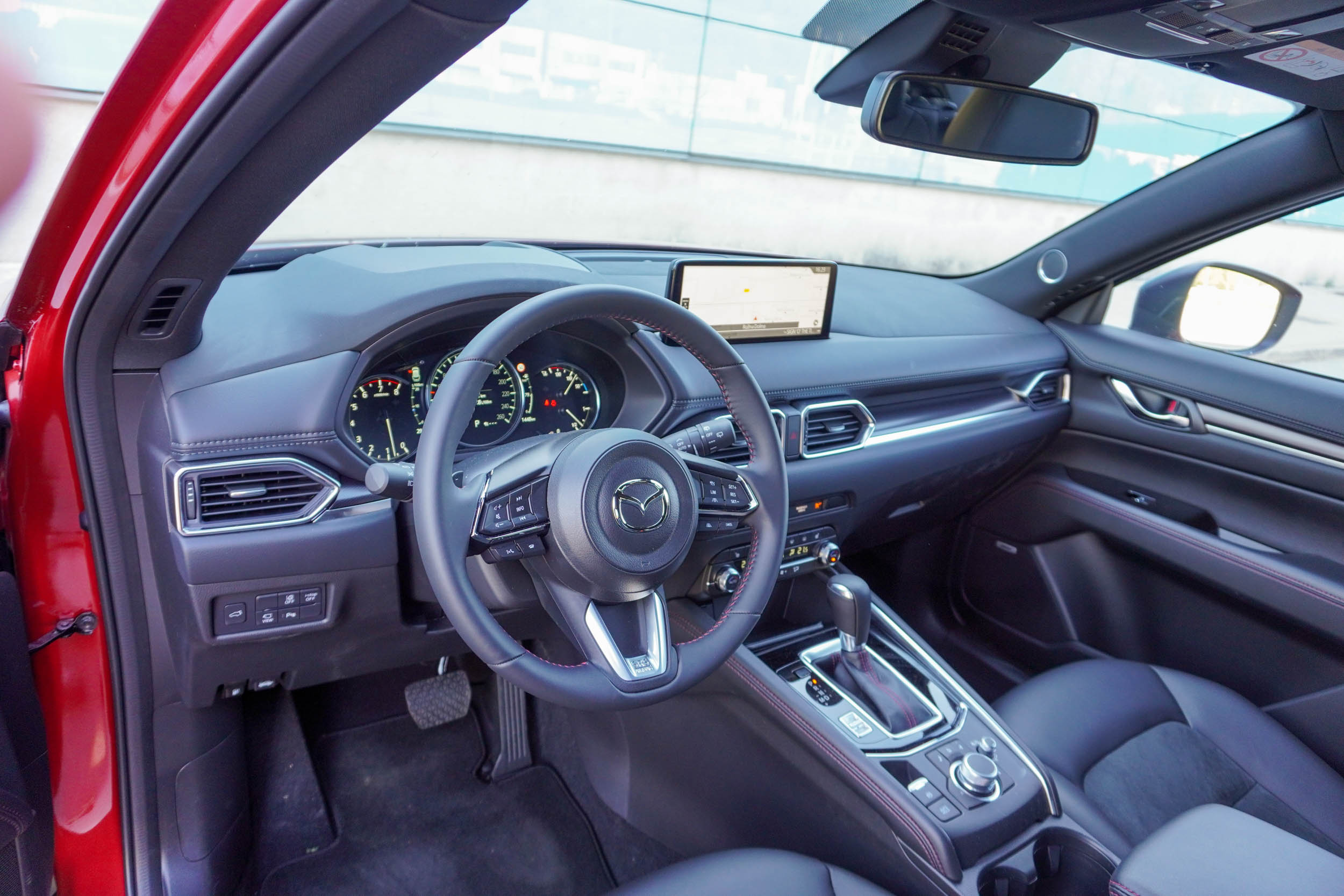 Voznikovo delovno okolje ne ponuja presenečenj, prej nekaj nostalgije. Merilniki na instrumentni plošči so še klasično, okroglo oblikovani, nastavitev osvetlitve instrumentne plošče je še z vrtljivim paličastim gumbom. Na sredini armaturne plošče je osrednji, 10,25 palčni zaslon, ki je dokaj ozek, kar še zlasti vpliva na prikaz zemljevida tako prek vgrajenega navigacijskega sistema kot prek brezžične povezave prek sistemov Apple car play ali Android auto. V primerjavi z izjemno velikimi zasloni, ki so na voljo v nekaterih tekmecih, Mazdin zaslon deluje skoraj miniaturno, ne da bi to bistveno zmanjševalo njegovo uporabnost. Največja prednost je upravljanje s podatki na zaslonu, ki je pri stoječem avtu lahko na dotik na zaslonu, med vožnjo pa zgolj z vrtljivim in potisnim gumbom ter tipkami na sredinski konzoli. Upravljanje je zelo enostavno, pregledno, predvsem pa varno, saj voznik z roko ne sega na zaslon in s tem ne zmanjšuje pozornosti na dogajanje v prometu. Voznikova ergonomija za volanom je zelo dobra, k osredotočenosti na dogajanje v prometu pripomore projecirni zaslon pred voznikom, kjer so na voljo najpomembnejši podatki. Upravljanje radarskega tempomata je priročno prek stikal na volanu. Opremo homura v potniški kabini ponazarjata temna stropna obloga in rdeči šivi na sedežih. Izstopata kakovost vgrajenih materialov in natančnost izdelave. Še vedno pa mazda CX-5 ne zna slovensko.