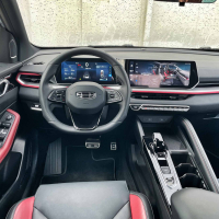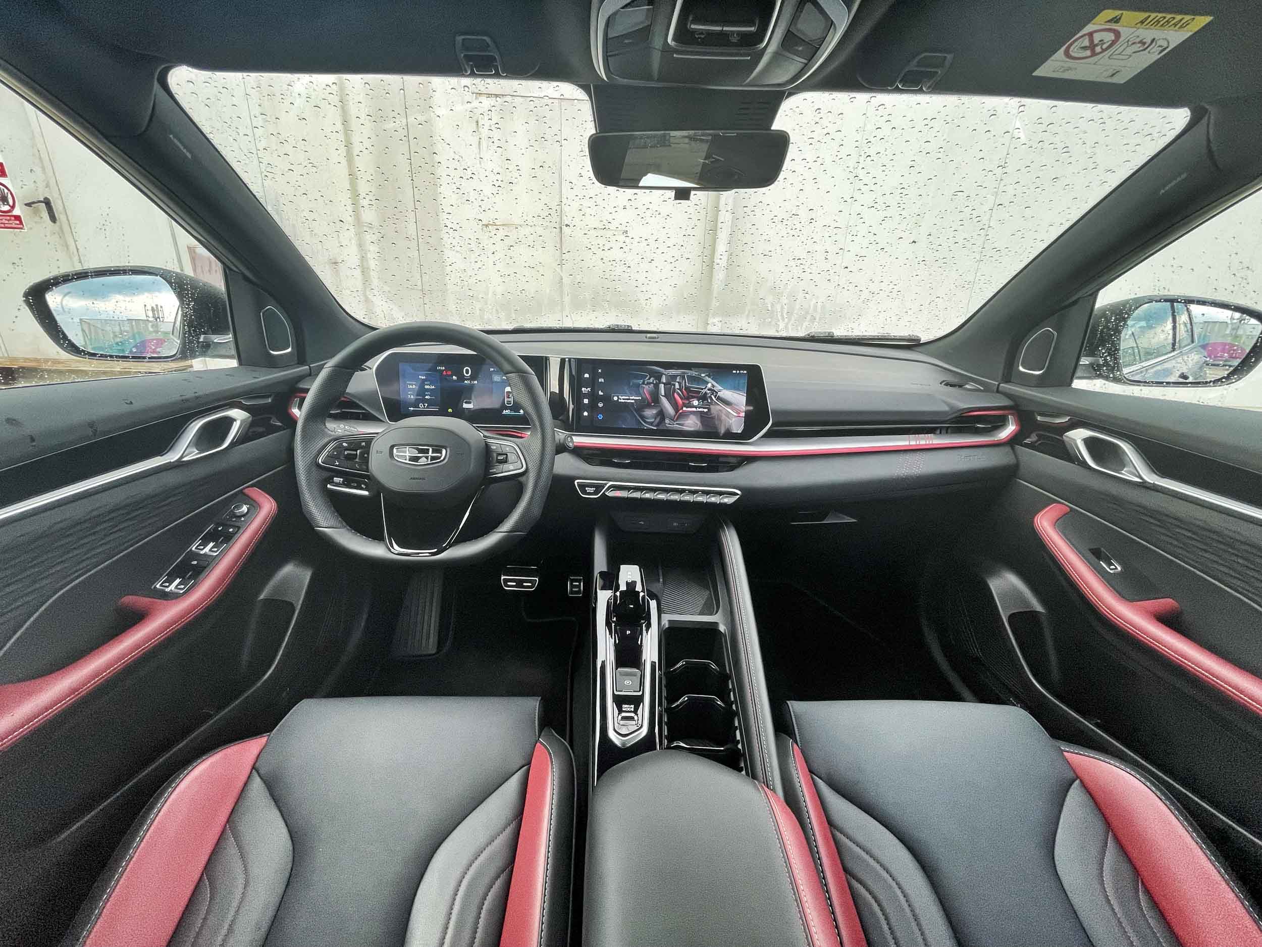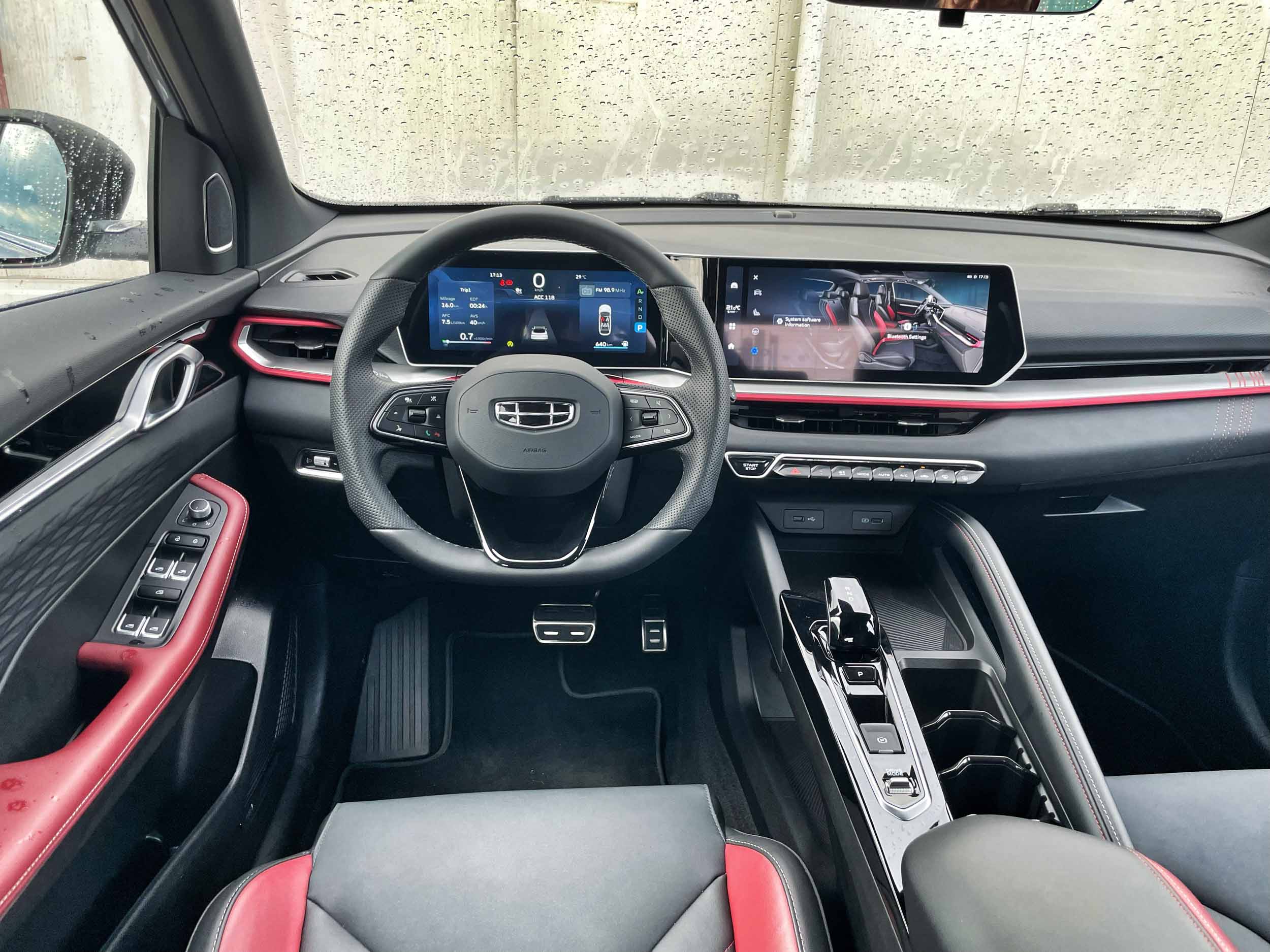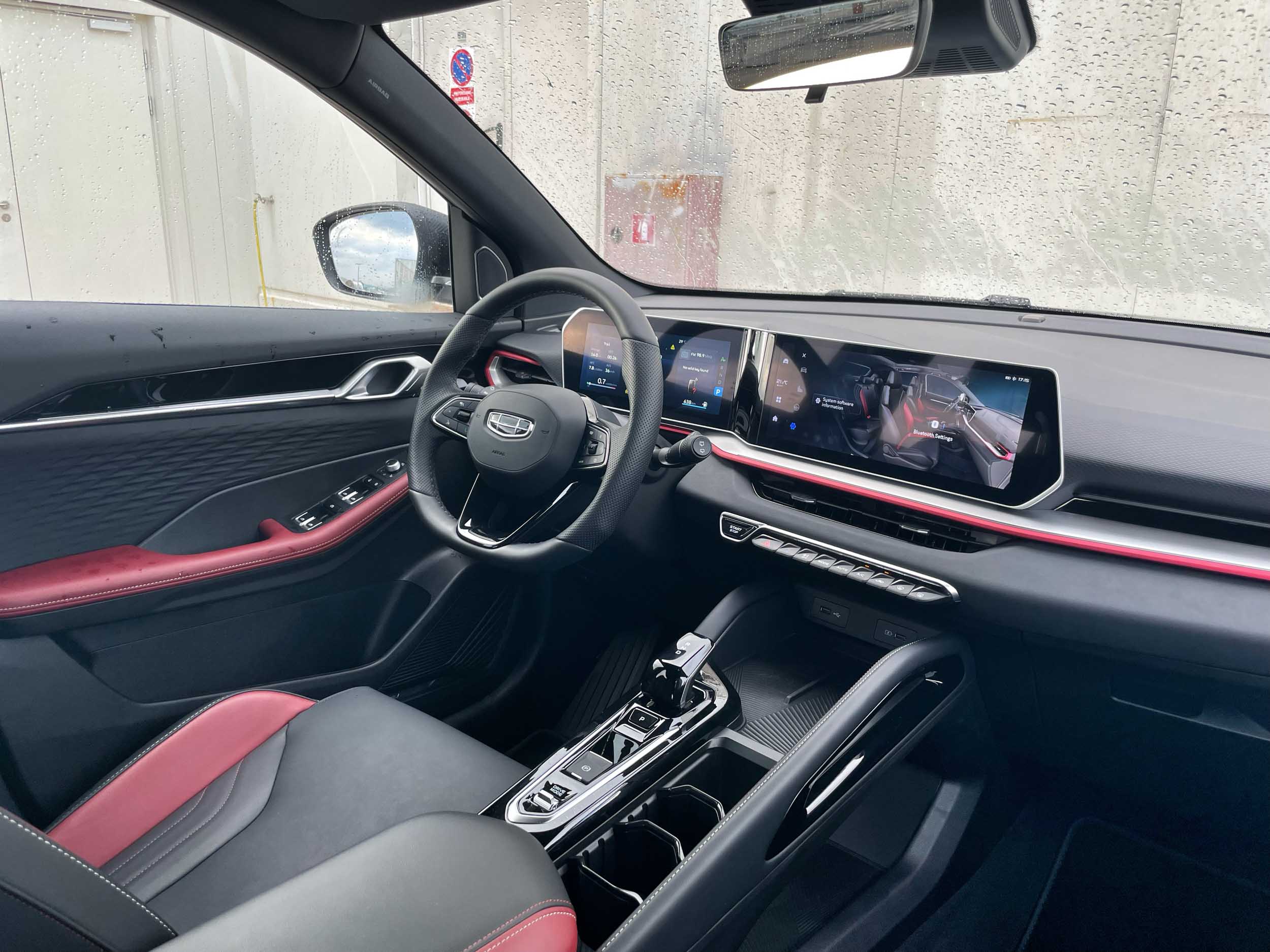Coolray v resnici ni nov avto; na nekaterih vzhodnih trgih je prisoten že kar nekaj let, na slovenske ceste pa je zapeljal po kozmetični in tehnični prenovi. Ta je zajela tudi notranjost, ki ponuja nov razlog za navdušenje; (zelo) digitalna armaturna plošča, športna prednja sedeža in uporabno razvejana sredinska konzola sestavljajo zelo sodobno in presenetljivo kakovostno narejeno potniško kabino, ki ima v opremski različici GF+ tudi usnjena sedeža in nekaj barvitih vložkov v notranjosti. Coolray za evropskimi tekmeci prav nič ne zaostaja niti po vozniški ergonomiji; sedenje za spodaj prirezanim volanskim obročem je udobno in ergonomsko pravilno, vidljivost naprej in vstran pa dobra.