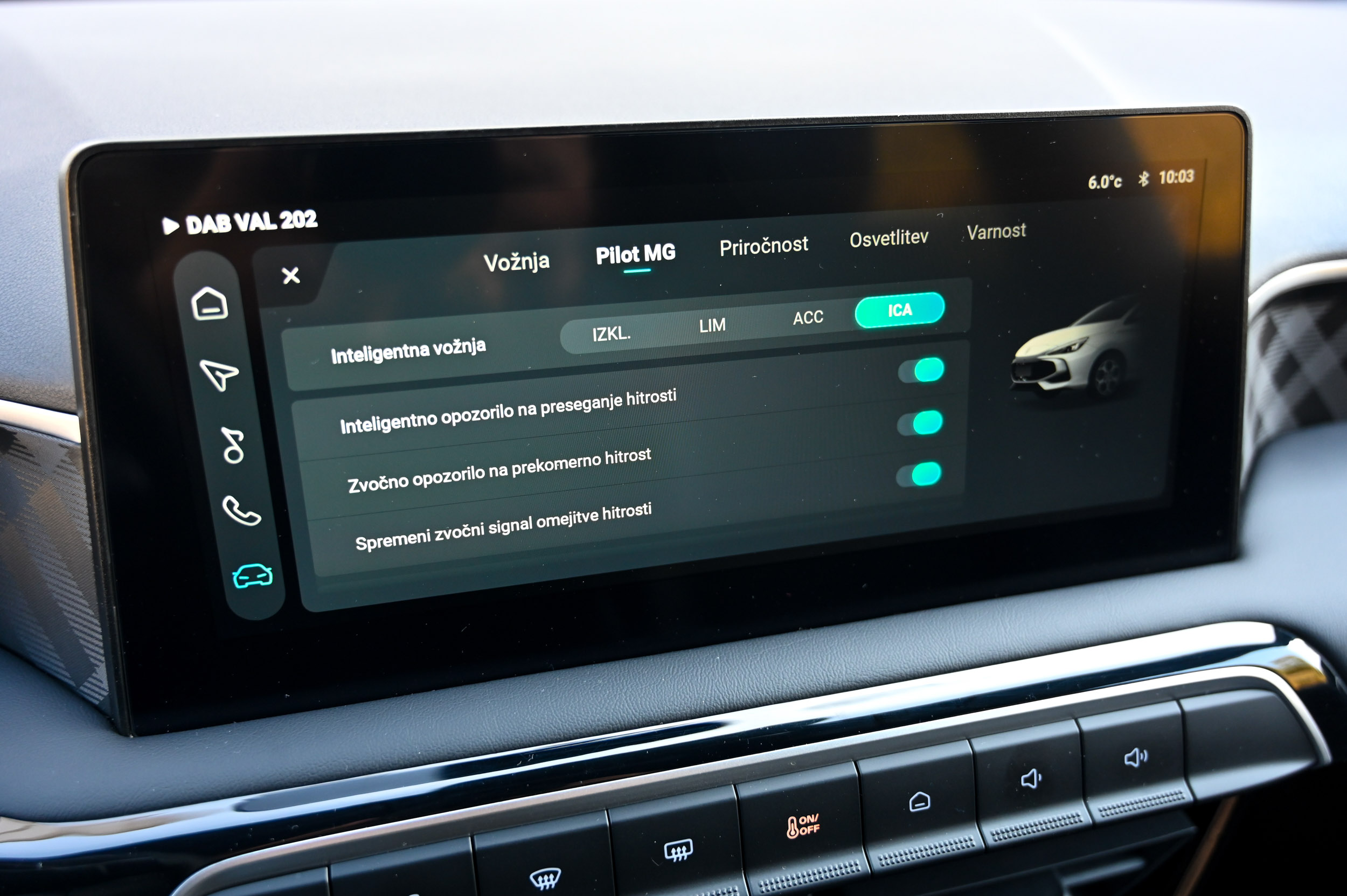 Kljub temu, da ima MG3 za samooskrbni hibridni pogon precej zmogljiv pogonski akumulator z 1,83 kWh, smo na testu dosegli slabše razmerje med “bencinskimi” in “električnimi” kilometri kot pri njegovih obeh glavnih hibridnih tekmecih - cliu in yarisu. To pomeni, da je s povprečno porabo 6 litrov goriva na 100 km MG3 na 100 prevoženih kilometrov porabil za vsaj dober liter več kot oba omenjena tekmeca in precej več, kot obljublja njegova uradna WLTP meritev.