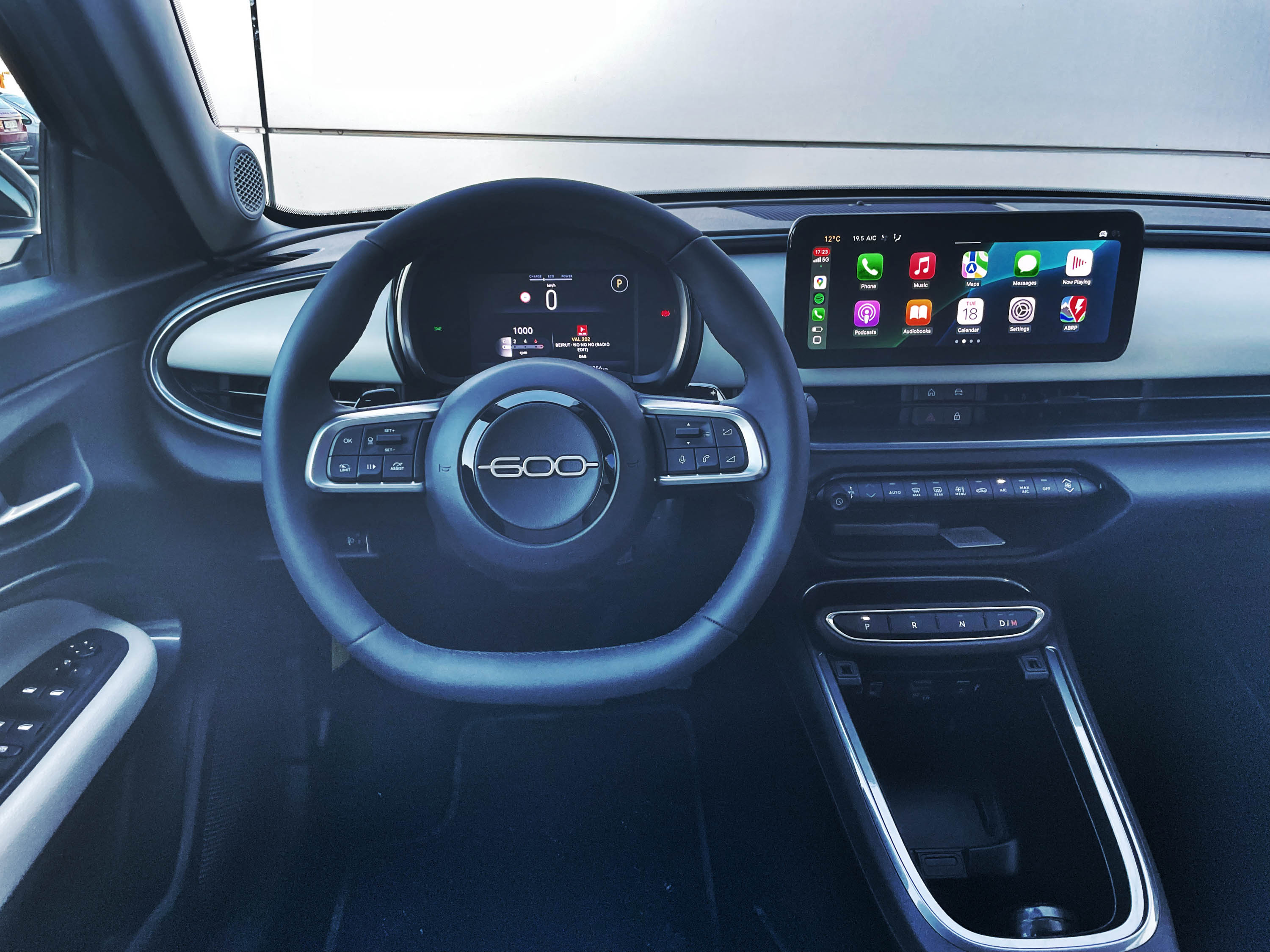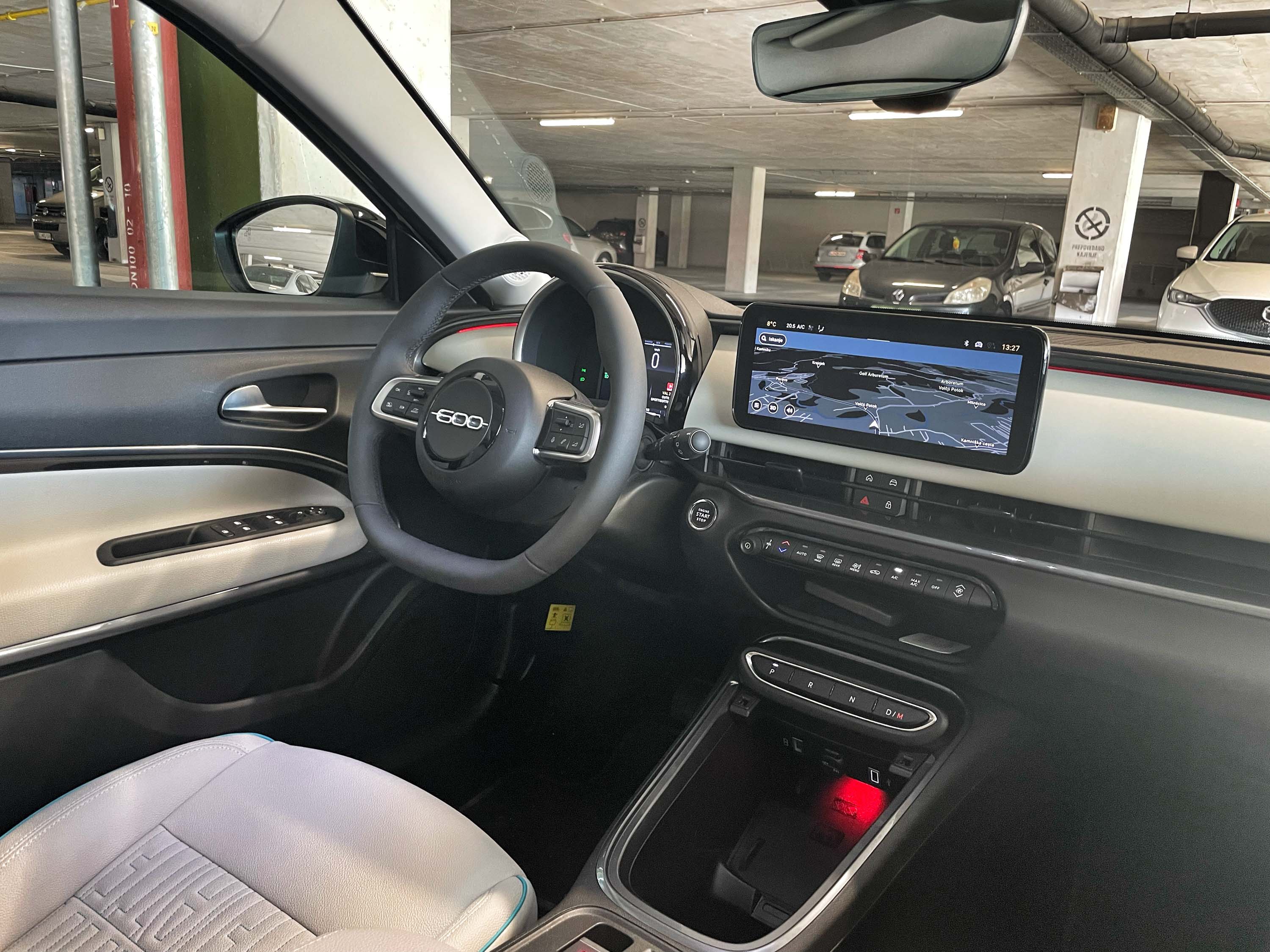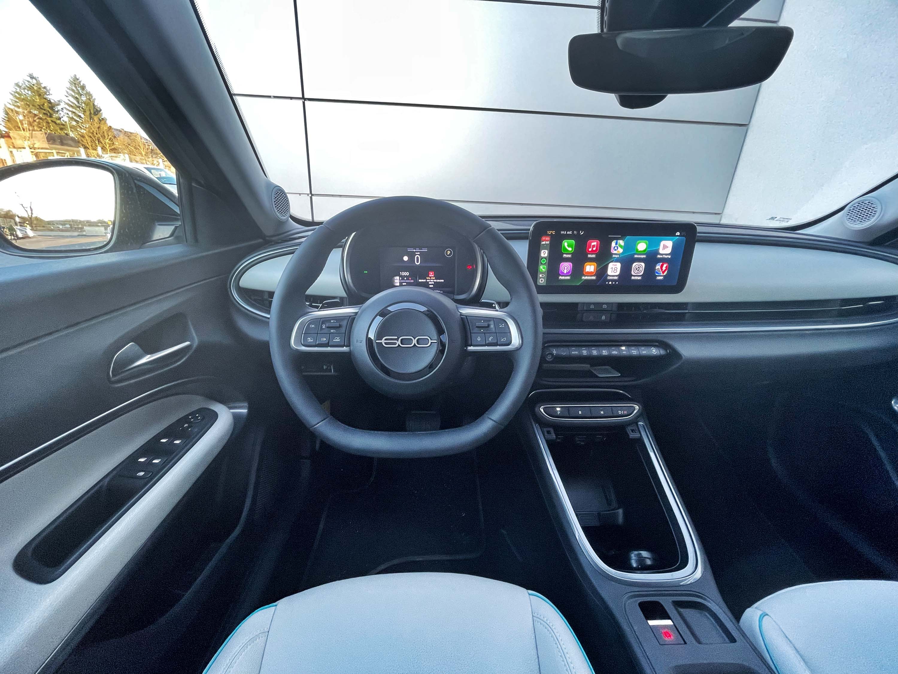 Preproste in prečiščene, a prepoznavne oblike se nadaljujejo tudi v notranjosti avta. Polkrožni nadstrešek digitalnih merilnikov, prostostoječ pravokoten zaslon multimedijske naprave in gumbi namesto ročice avtomatiziranega menjalnika ponujajo minimalistično, a pregledno voznikovo okolje, ki ponuja dobro sedenje za volanom in dobro preglednost iz avta. Z veliko trde plastike notranjost avta ne deluje prav prestižno, a zaradi dvobarvne zasnove tudi ne dolgočasno. Veseli, da so pri Fiatu ohranili nekaj fizičnih stikal za dostop do glavnih funkcij gretja in zračenja; multimedijska naprava sicer ponuja uporaben nabor informacij, predvsem pa uporabno brezžično zrcaljenje mobilnika na zaslon. Kot zanimivost velja omeniti, da je notranjost fiata 600 zelo podobna notranjosti jeepa avengerja; nenazadnje oba avtomobila izdelujejo v Fiatovi tovarni na Poljskem.