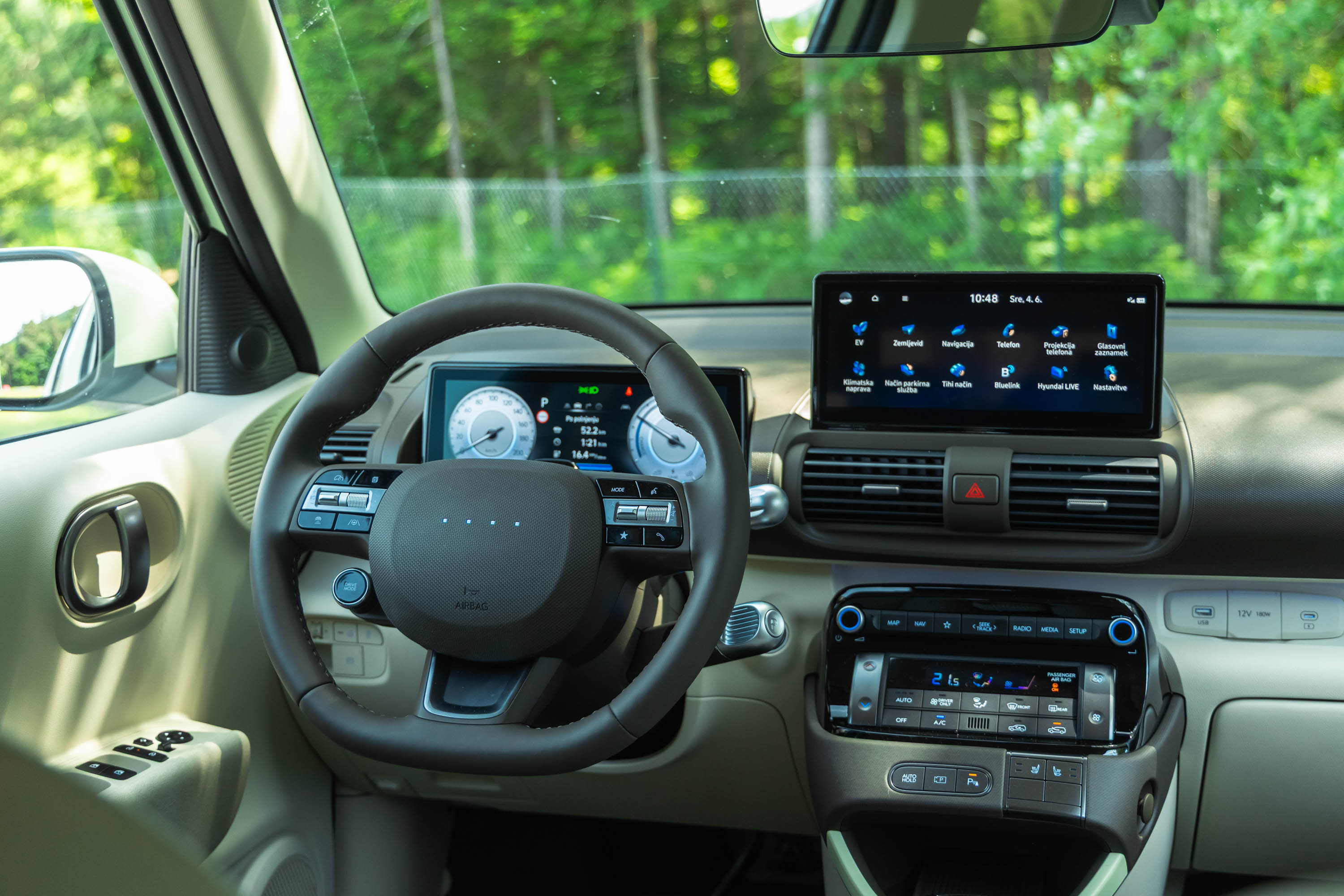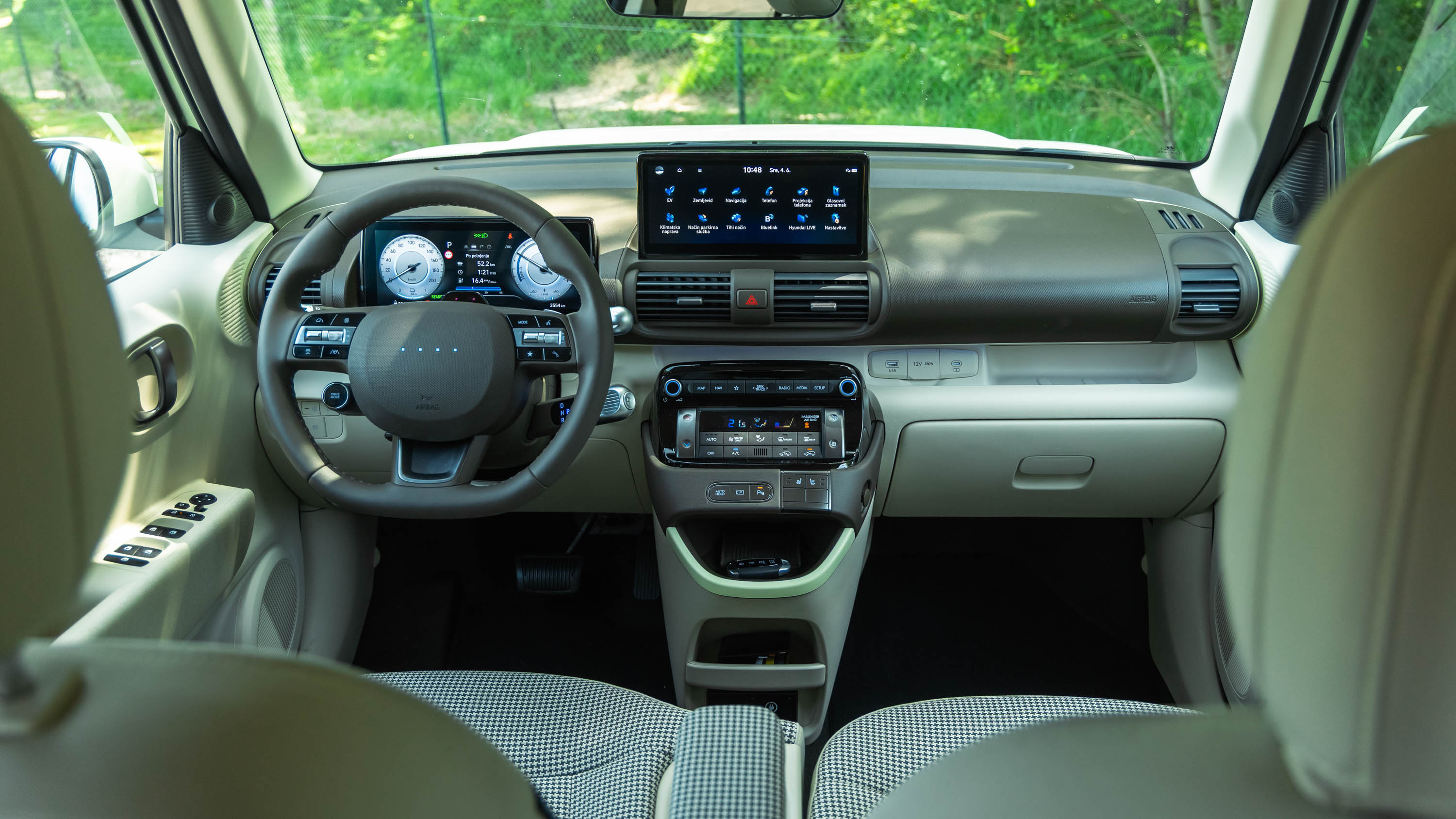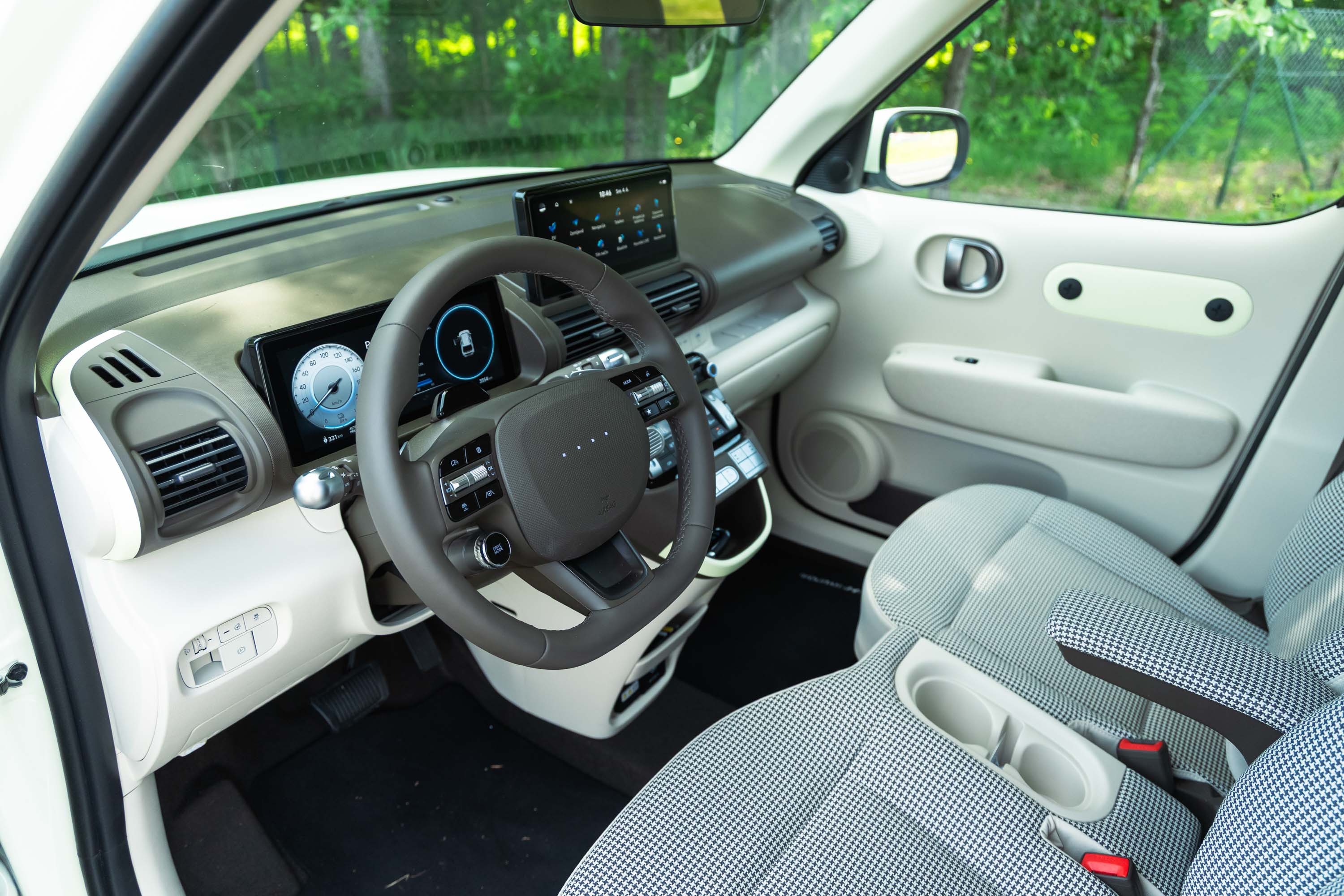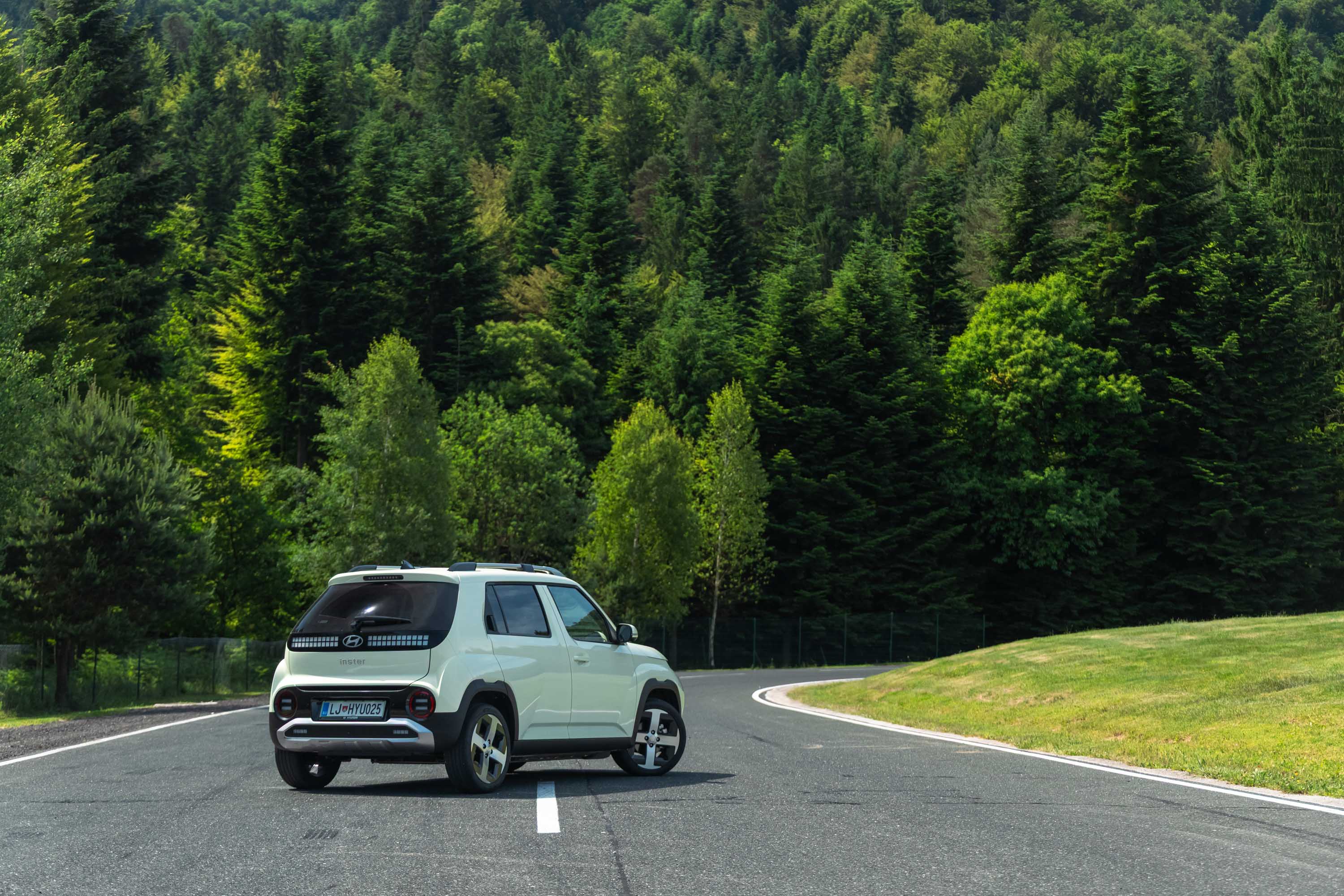 Notranjost avta navduši tudi s kakovostno opremo, preglednim in intuitivnim Hyudaijevim digitalnim uporabniškim vmesnikom ter dobro vidljivostjo iz avta; insterja je otročje lahko parkirati na najtesnejša parkirna mesta, zaradi majhnega obračalnega kroga pa je zelo okreten. Zmogljivosti insterja na papirju niso nič posebnega, v prometu pa zna biti živahen in značilno električno odziven avto(mobilček), ki ga z veseljem zapodimo tudi v ovinke; če bi morali izbrati (električni) avto za tesne mestne ulice, je inster trenutno v samem vrhu primernih kandidatov.