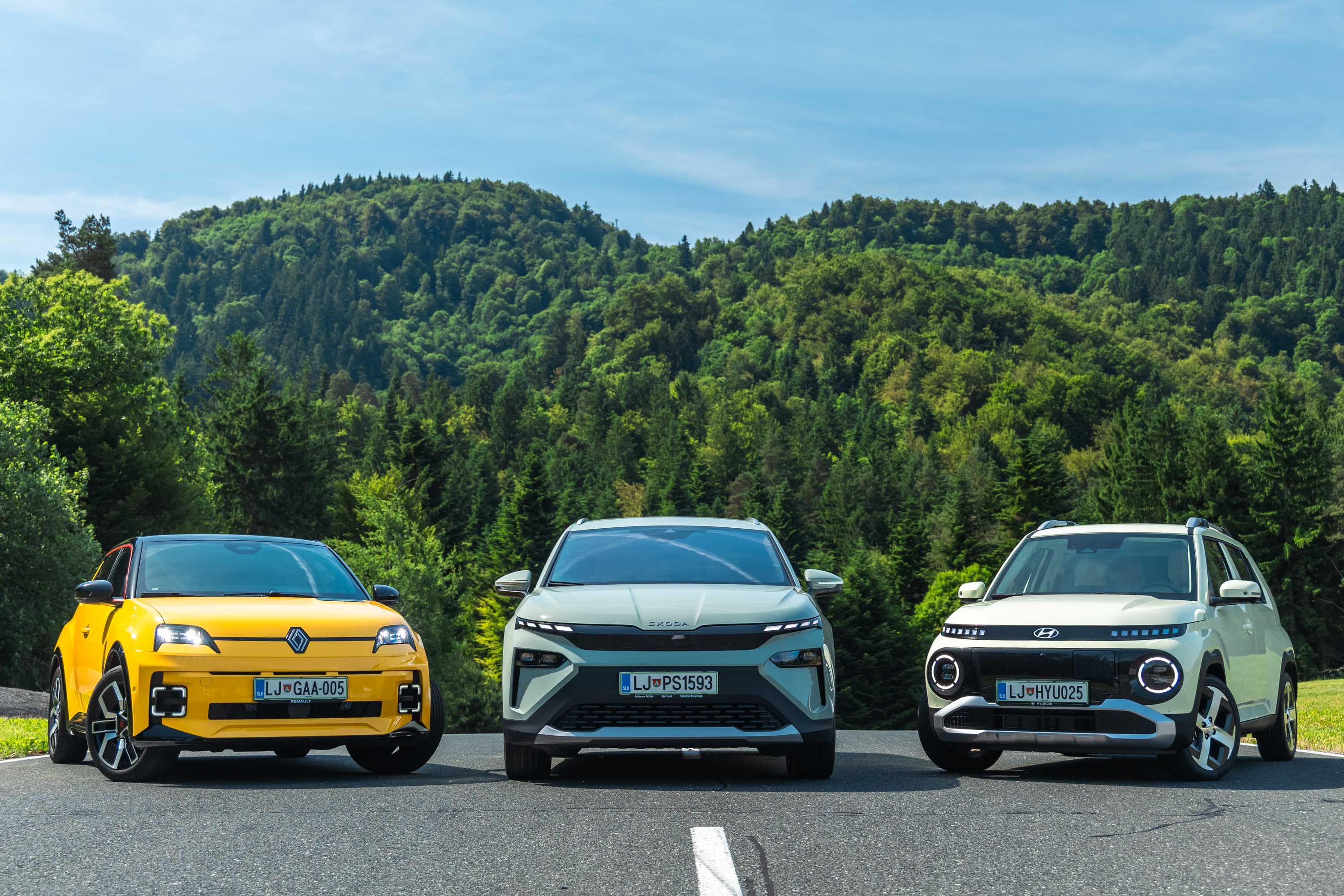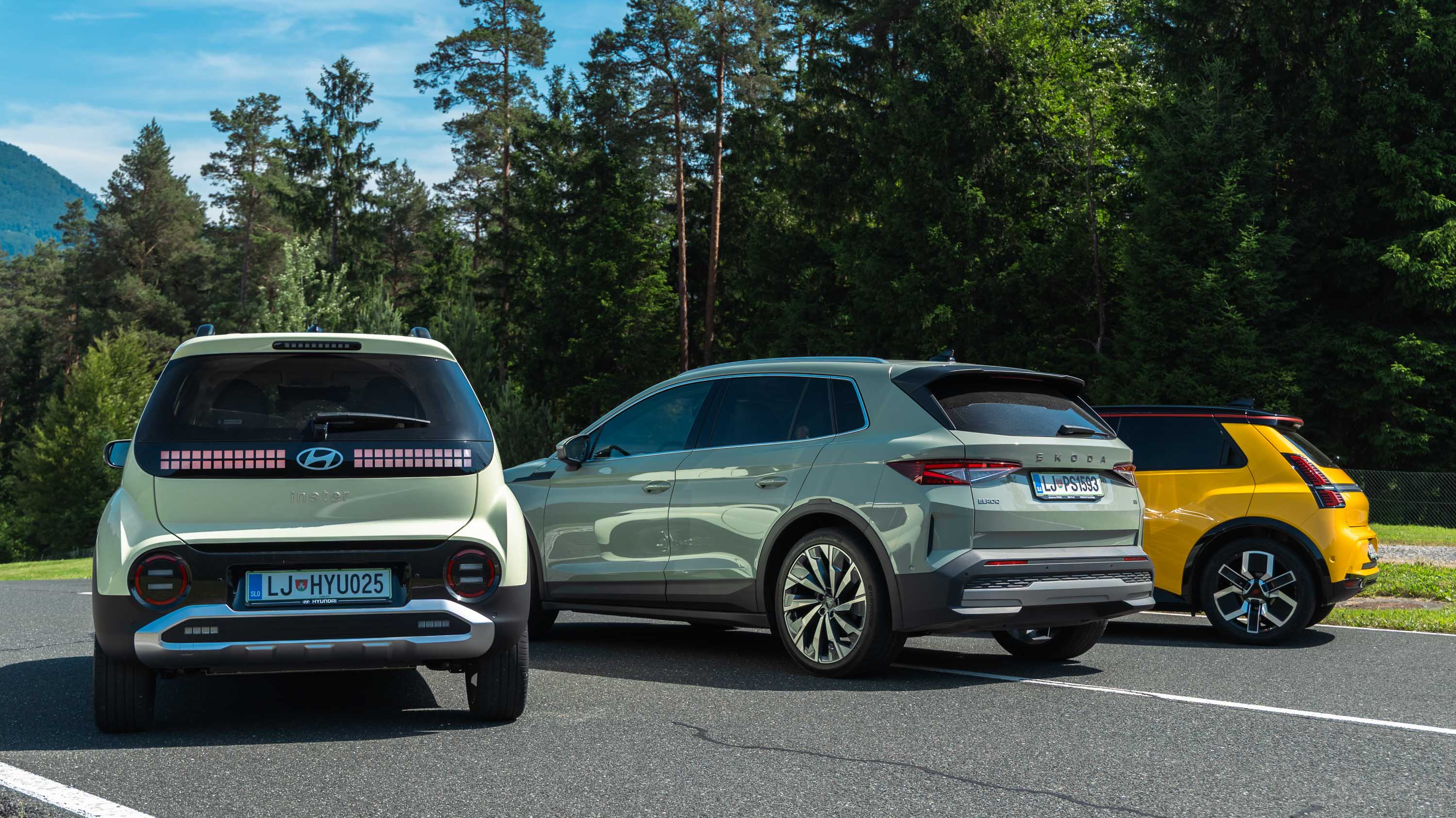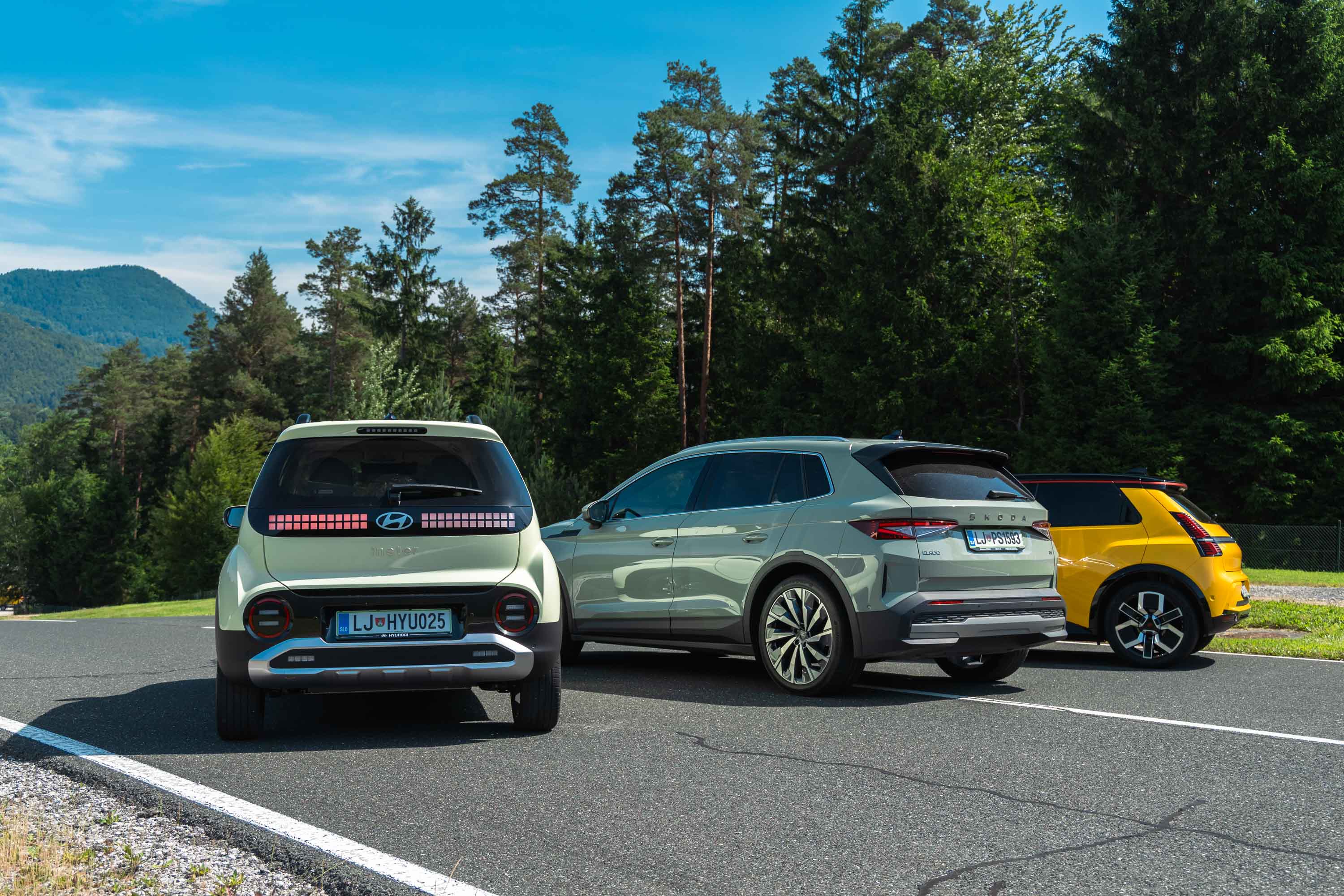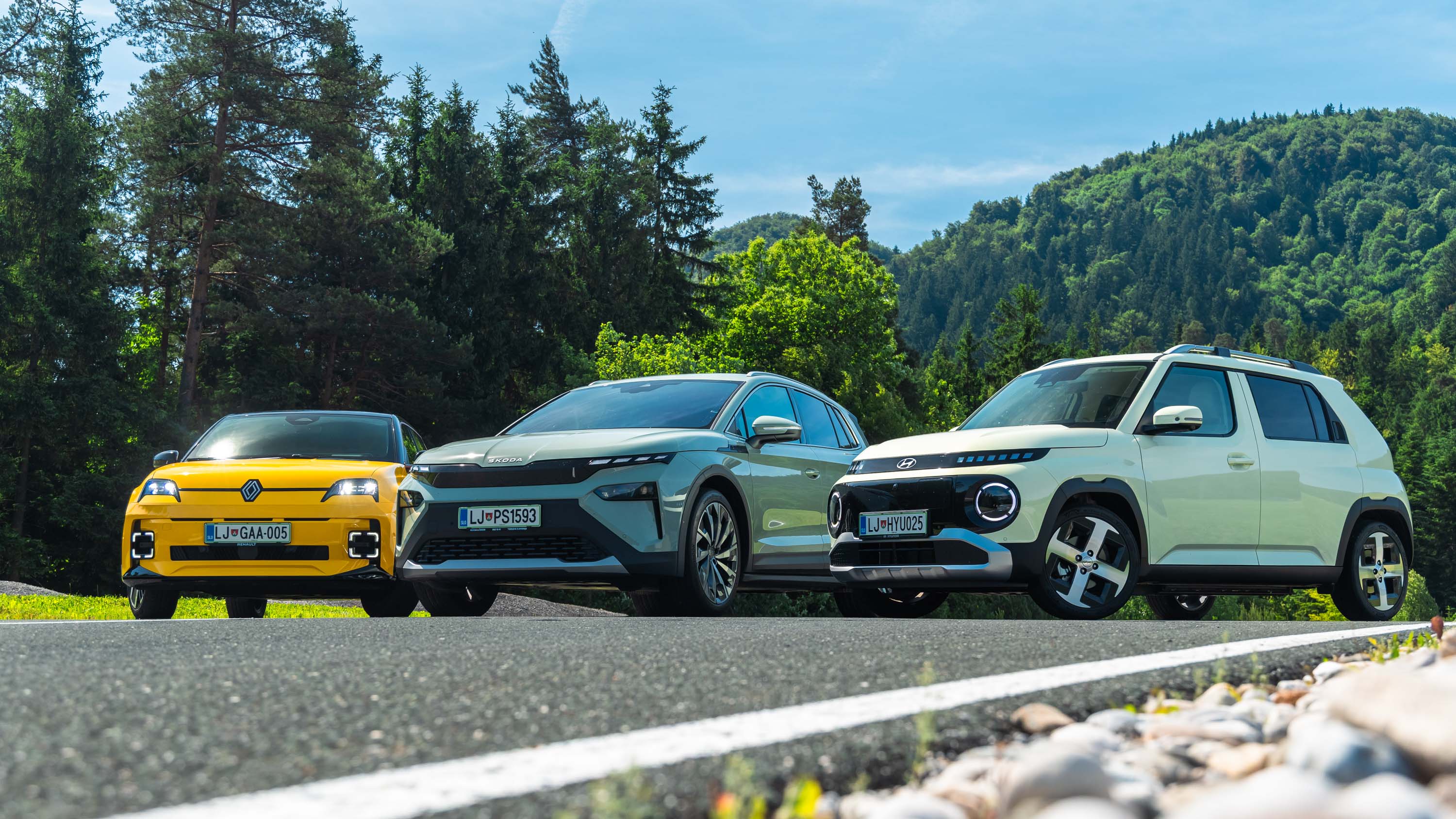 Trg električnih avtomobilov pri nas je letos bogatejši za kar nekaj zanimivih novih avtomobilov, ki bi si vsi po vrsti tudi zaslužili takšno električno druženje, a naš koledar testnih terminov se je zložil le za hkraten preskus teh treh avtomobilov; navzven majhnega, a vsebinsko zelo bogatega Hyundaijevega insterja, oblikovno nostalgično-simpatične in vozniško izjemne Renaultove petice ter presenetljivo suverenega in družinsko uporabnega Škodinega križanca elroqa.