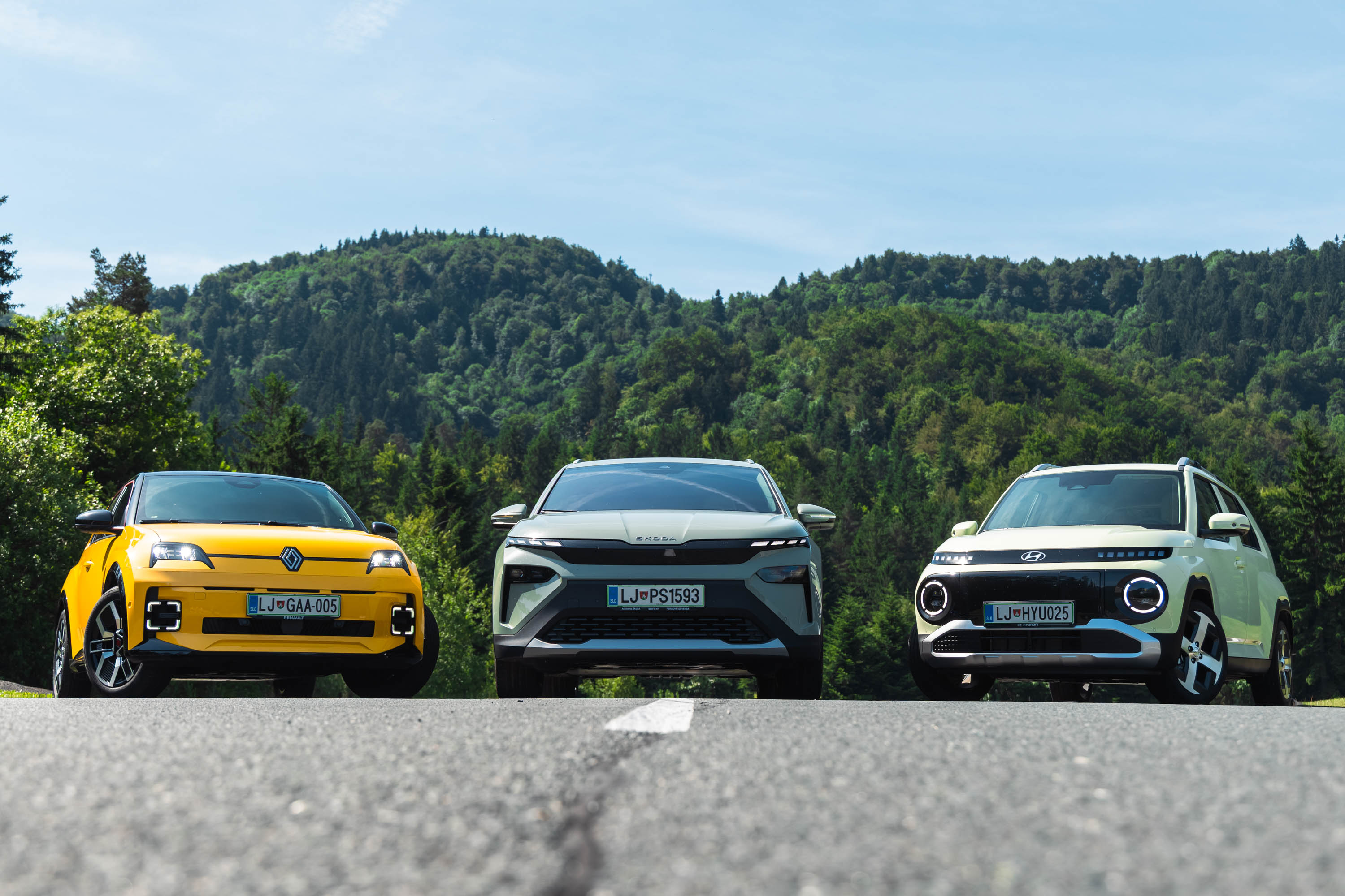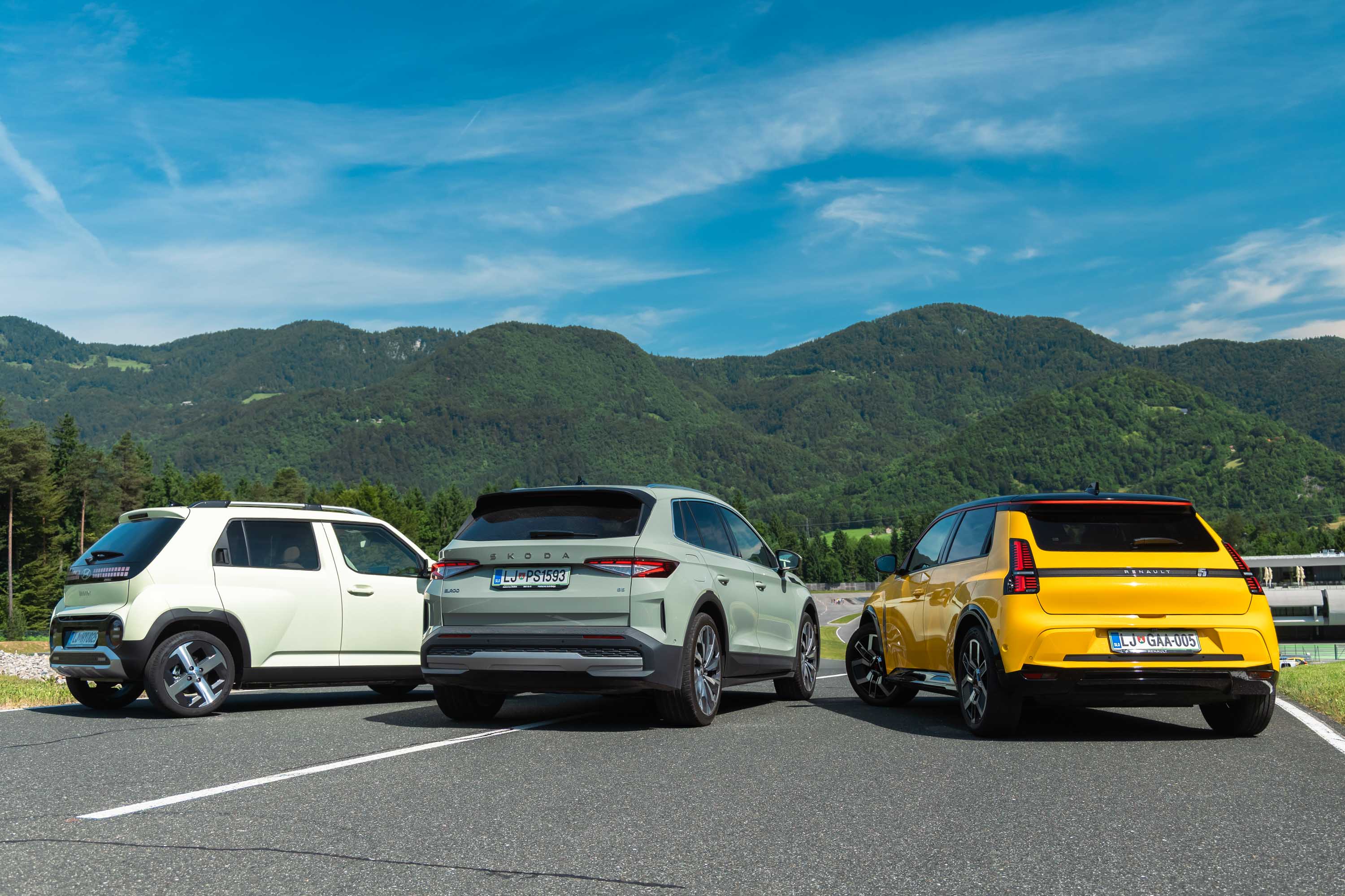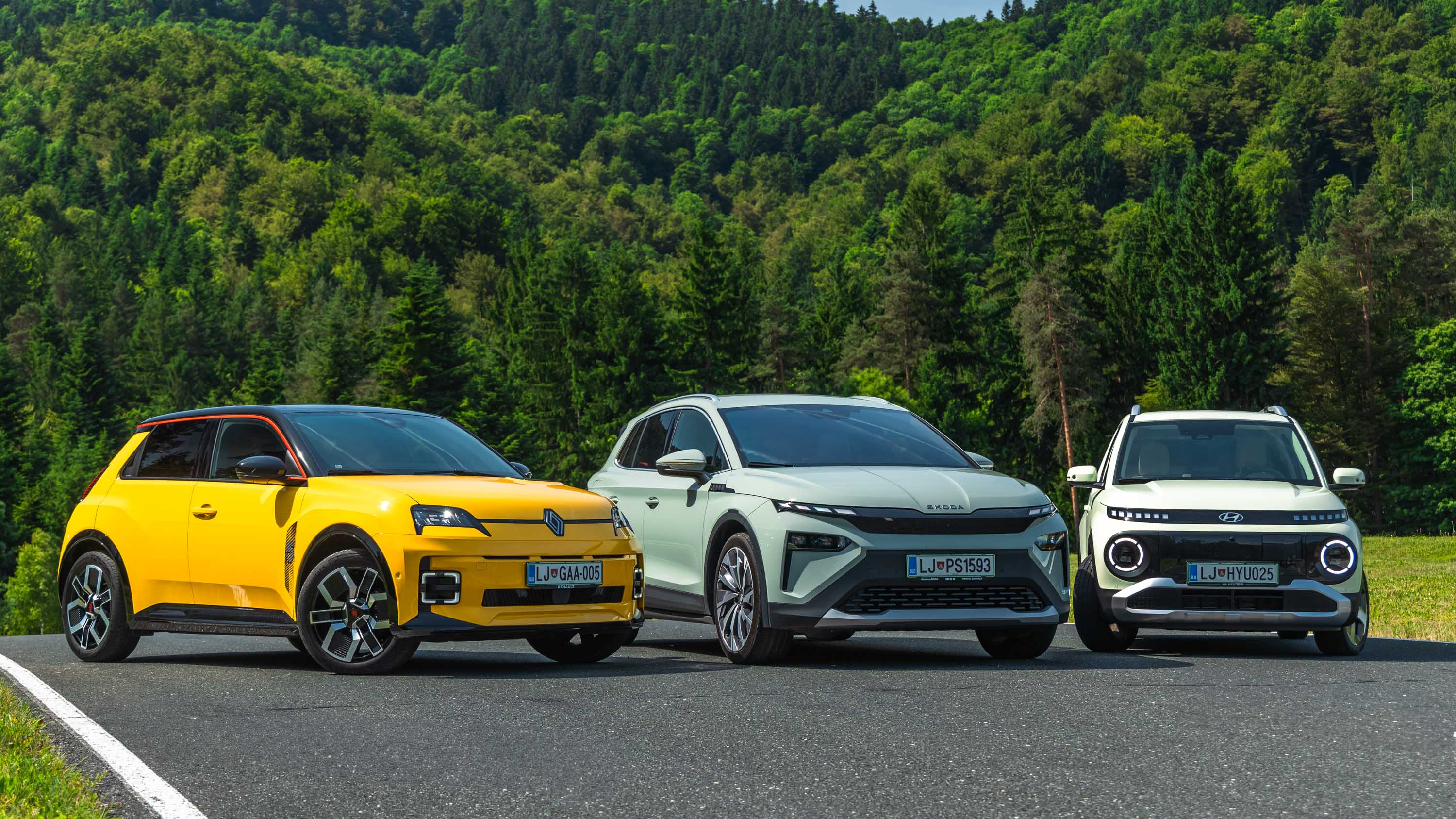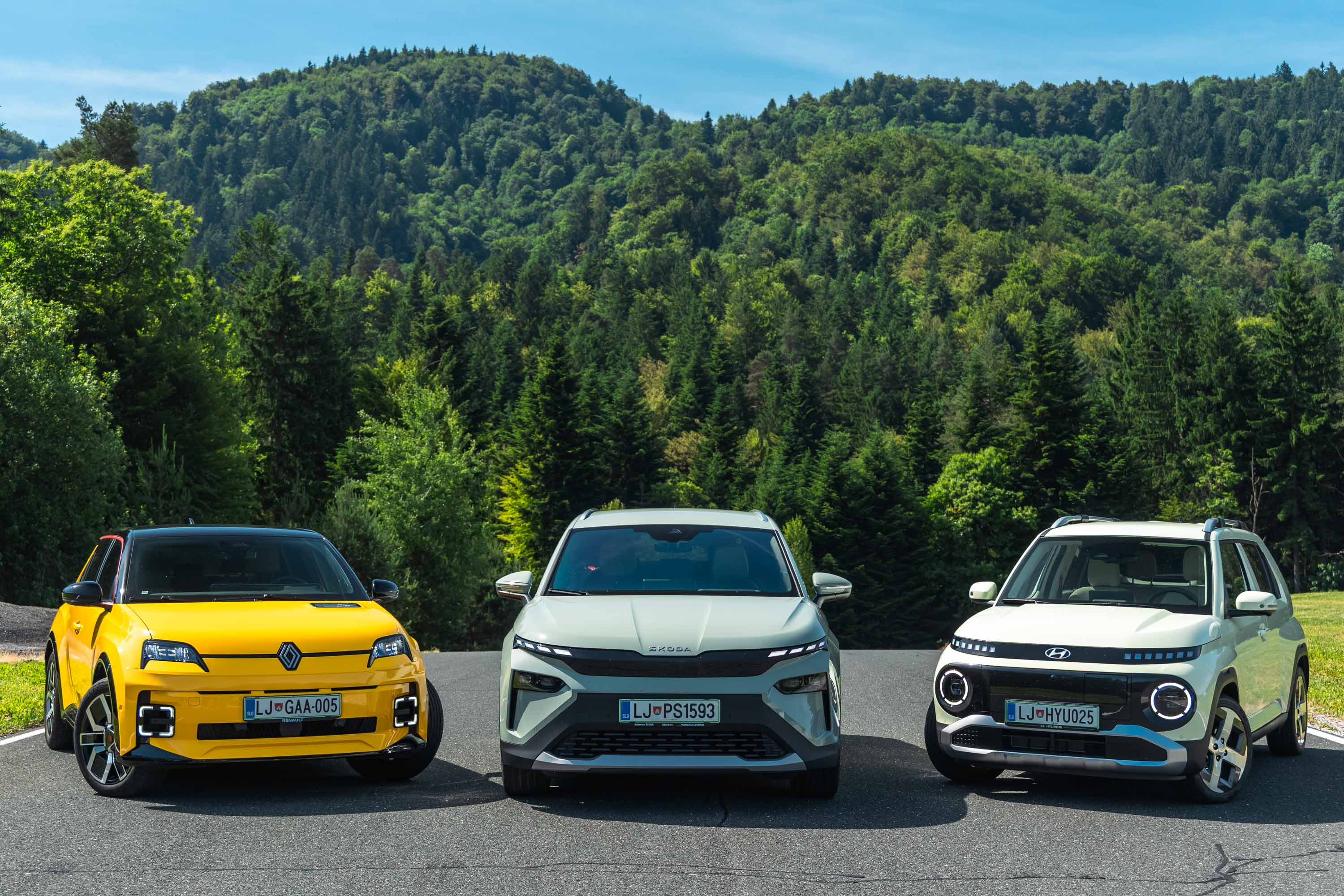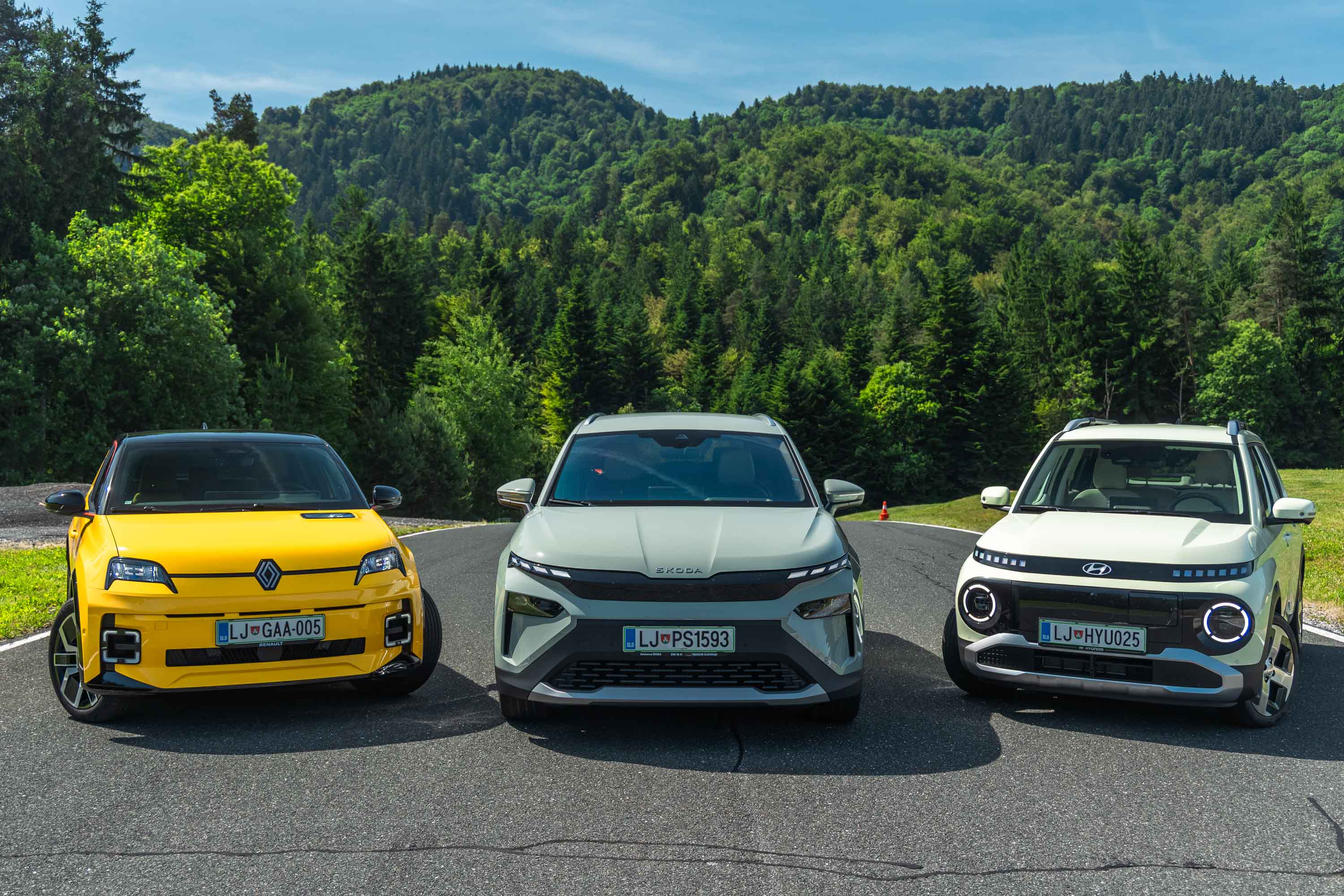 Trg električnih avtomobilov pri nas je letos bogatejši za kar nekaj zanimivih novih avtomobilov, ki bi si vsi po vrsti tudi zaslužili takšno električno druženje, a naš koledar testnih terminov se je zložil le za hkraten preskus teh treh avtomobilov; navzven majhnega, a vsebinsko zelo bogatega Hyundaijevega insterja, oblikovno nostalgično-simpatične in vozniško izjemne Renaultove petice ter presenetljivo suverenega in družinsko uporabnega Škodinega križanca elroqa.