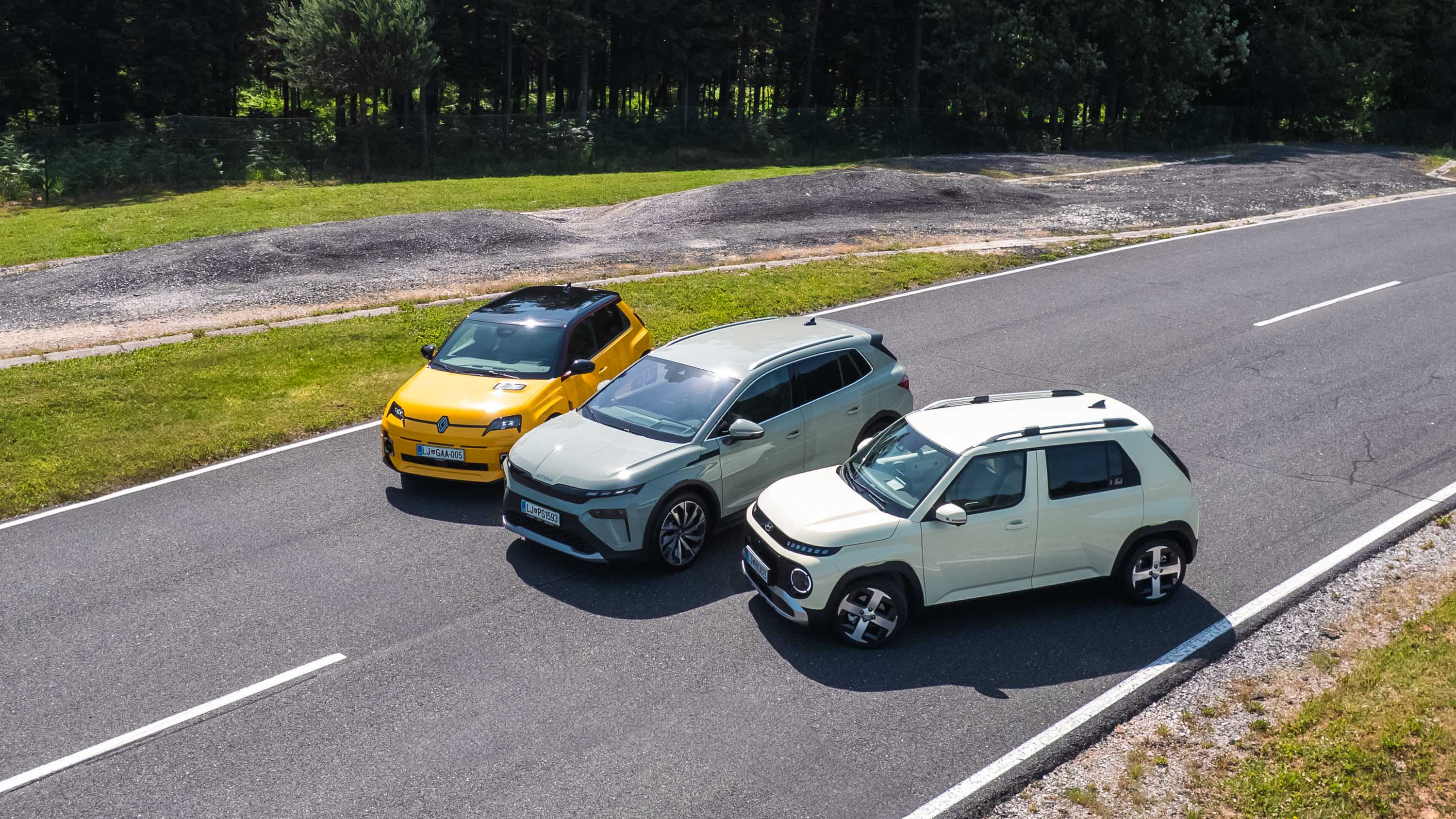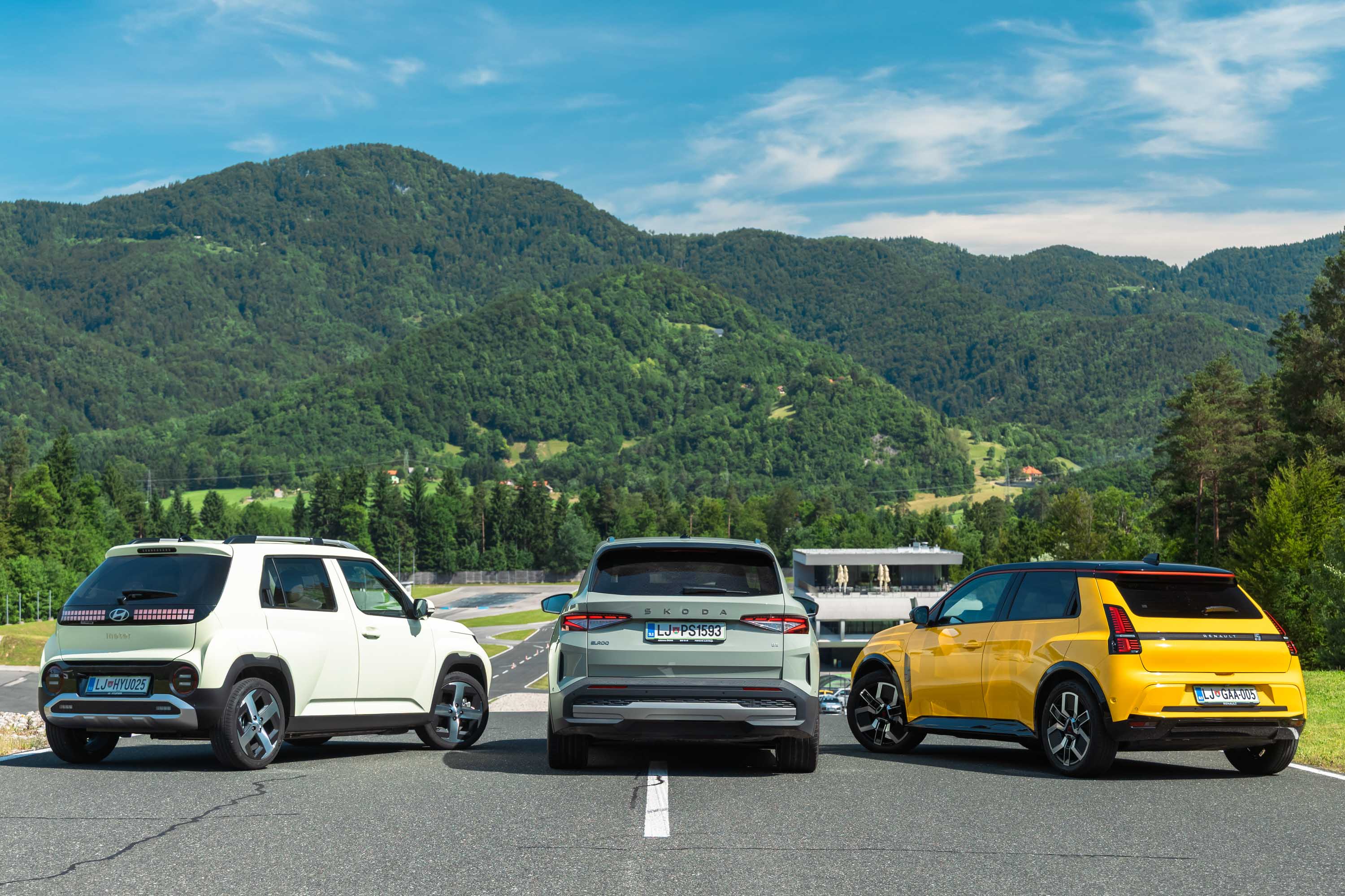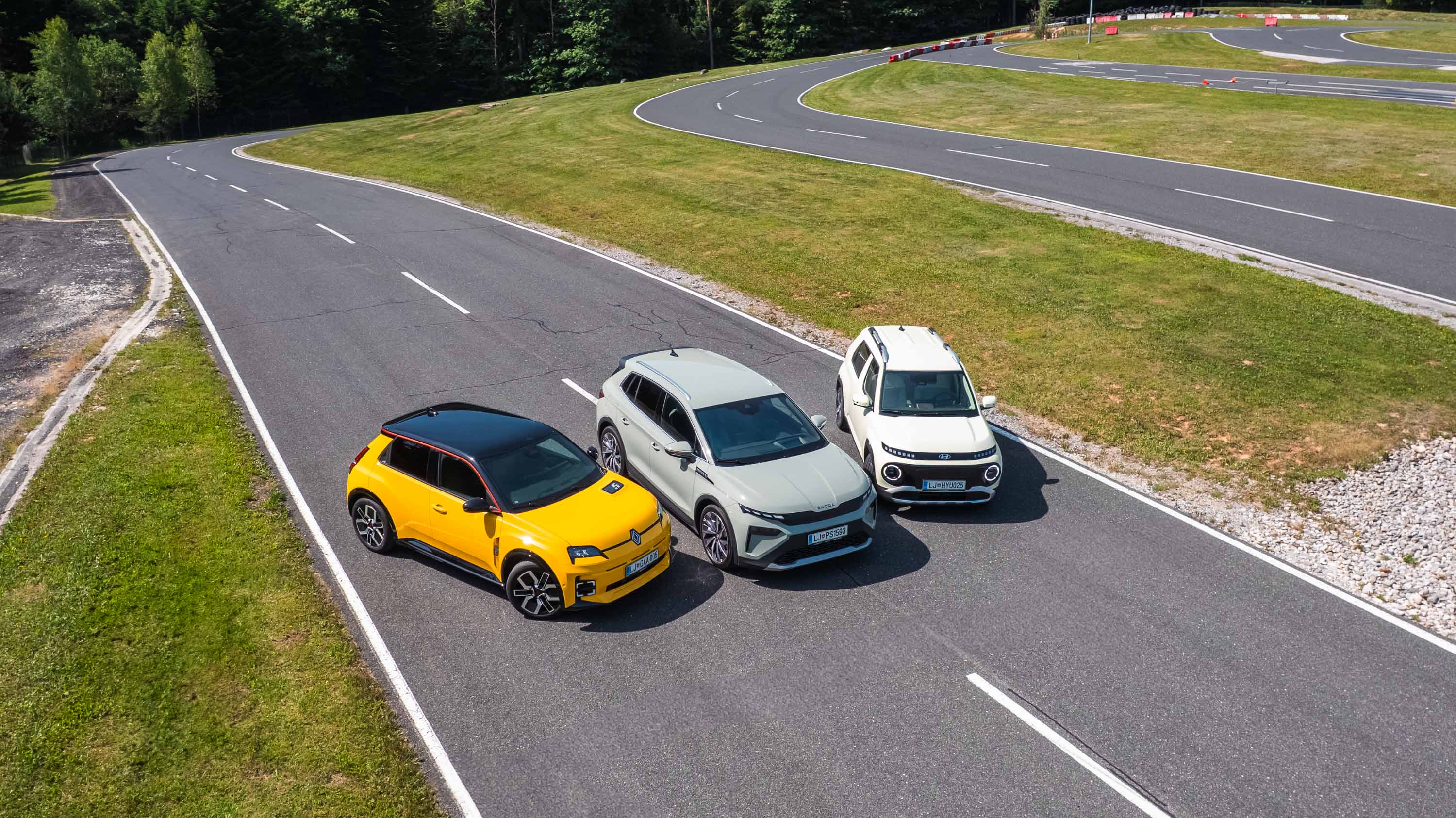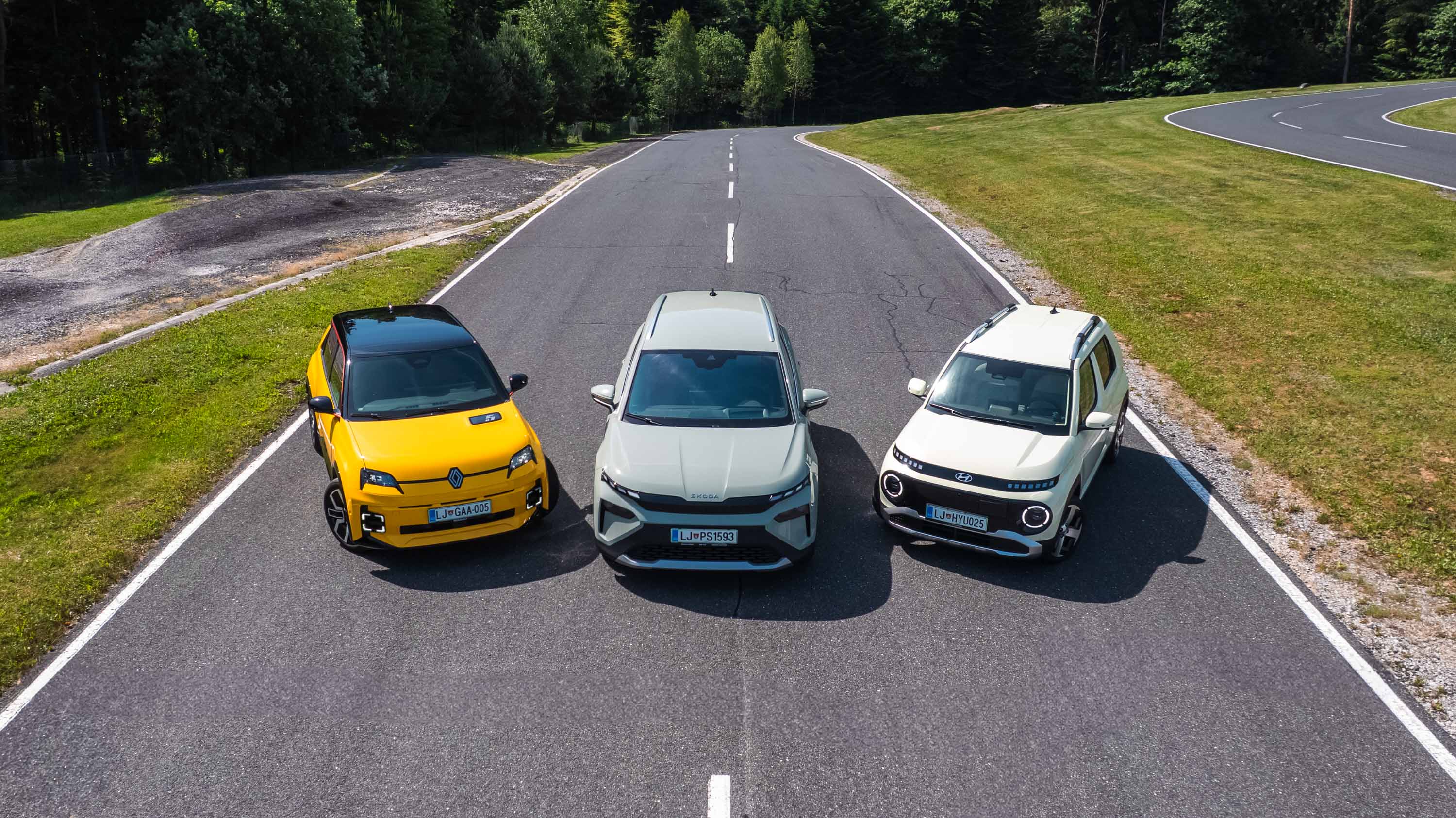 Trg električnih avtomobilov pri nas je letos bogatejši za kar nekaj zanimivih novih avtomobilov, ki bi si vsi po vrsti tudi zaslužili takšno električno druženje, a naš koledar testnih terminov se je zložil le za hkraten preskus teh treh avtomobilov; navzven majhnega, a vsebinsko zelo bogatega Hyundaijevega insterja, oblikovno nostalgično-simpatične in vozniško izjemne Renaultove petice ter presenetljivo suverenega in družinsko uporabnega Škodinega križanca elroqa.