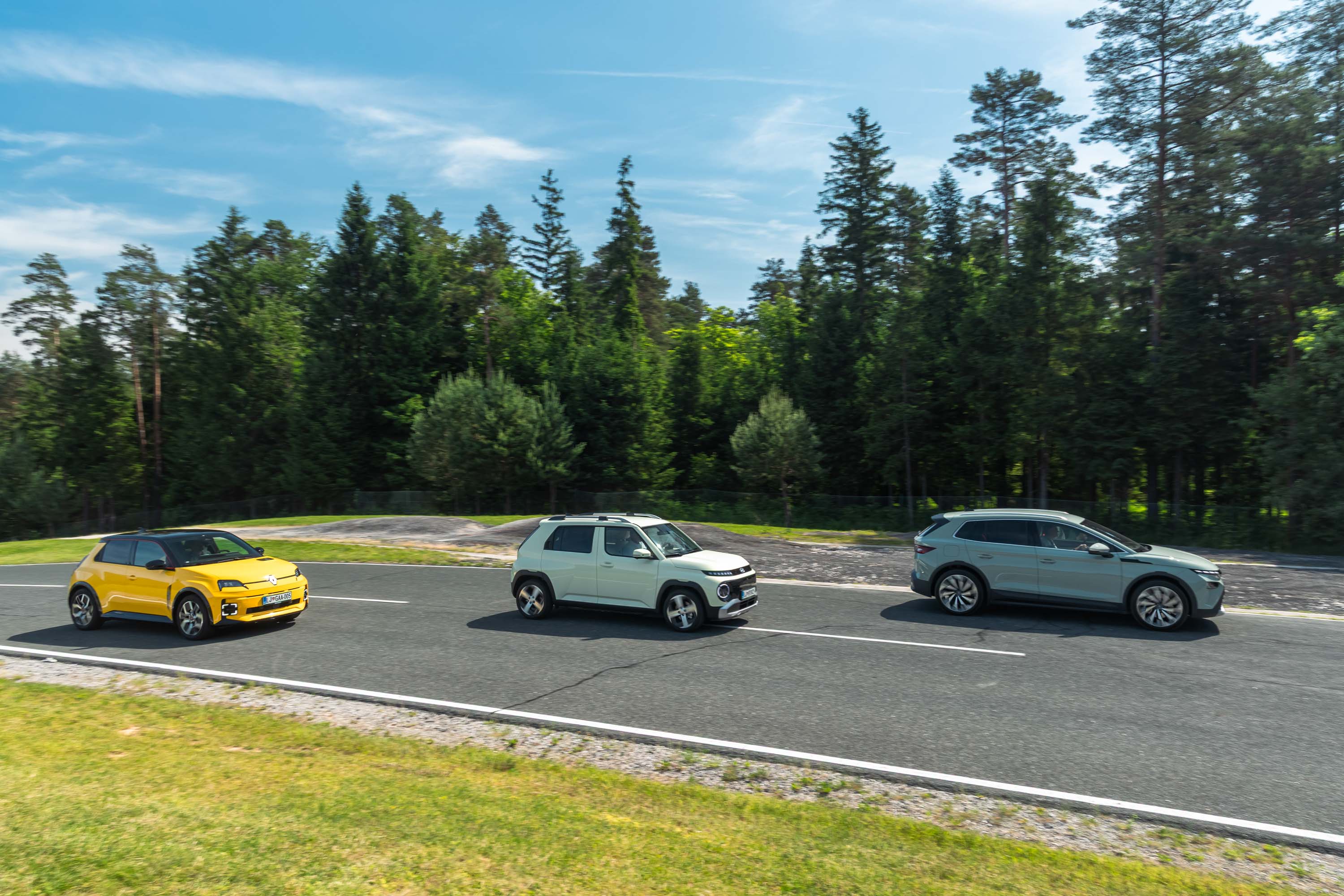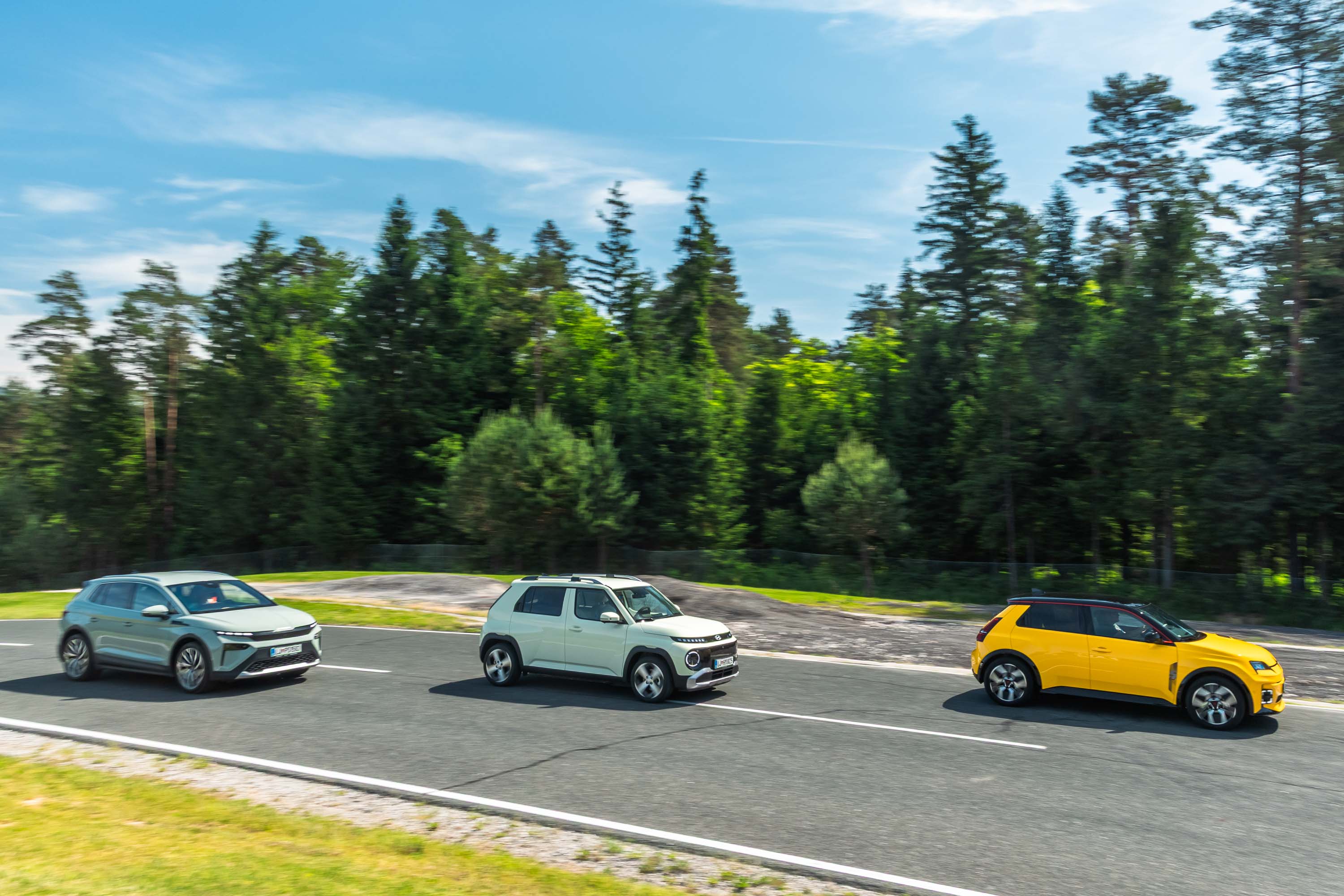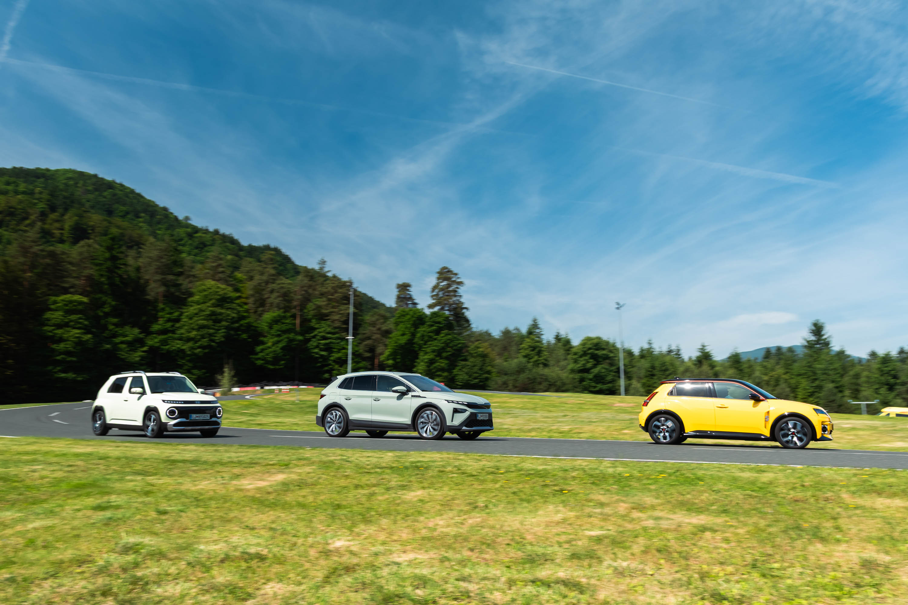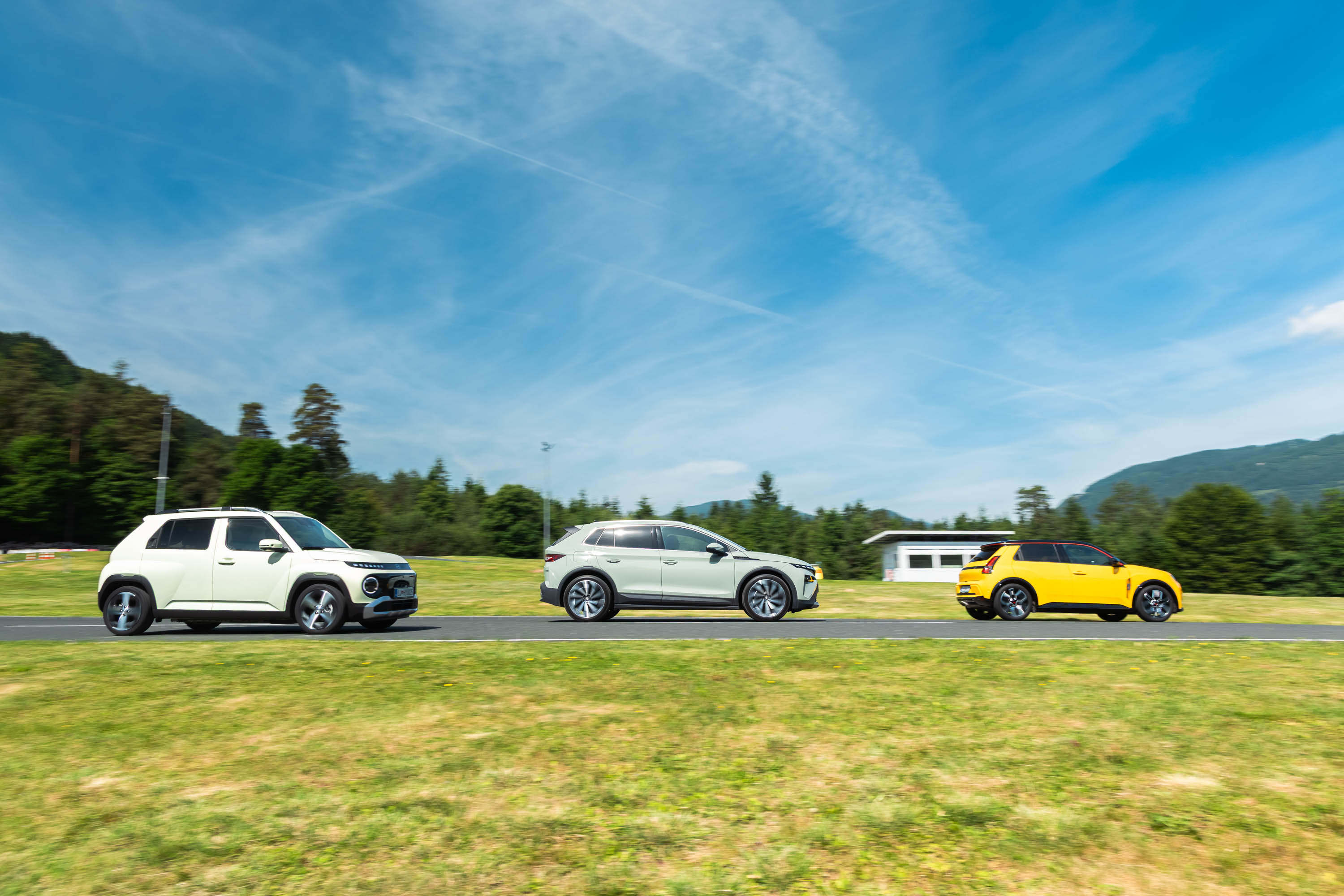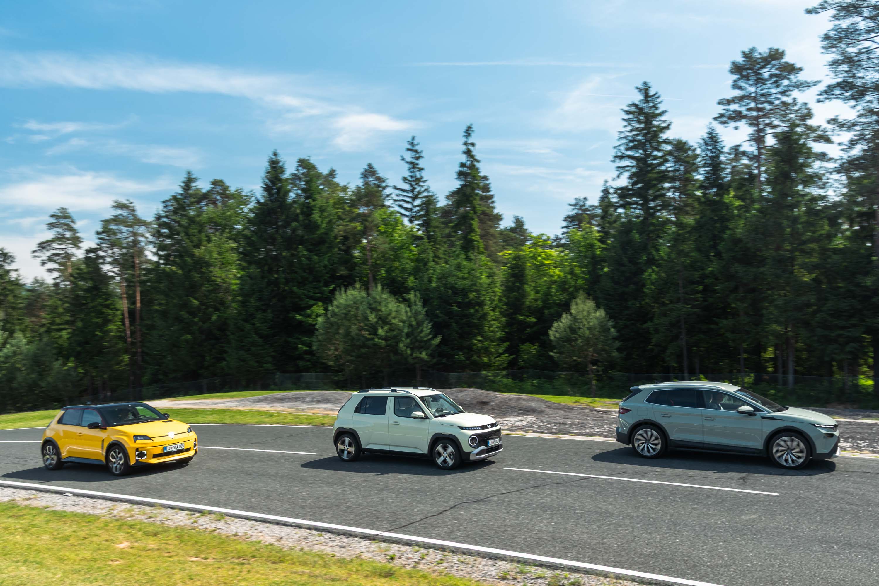 Trg električnih avtomobilov pri nas je letos bogatejši za kar nekaj zanimivih novih avtomobilov, ki bi si vsi po vrsti tudi zaslužili takšno električno druženje, a naš koledar testnih terminov se je zložil le za hkraten preskus teh treh avtomobilov; navzven majhnega, a vsebinsko zelo bogatega Hyundaijevega insterja, oblikovno nostalgično-simpatične in vozniško izjemne Renaultove petice ter presenetljivo suverenega in družinsko uporabnega Škodinega križanca elroqa.