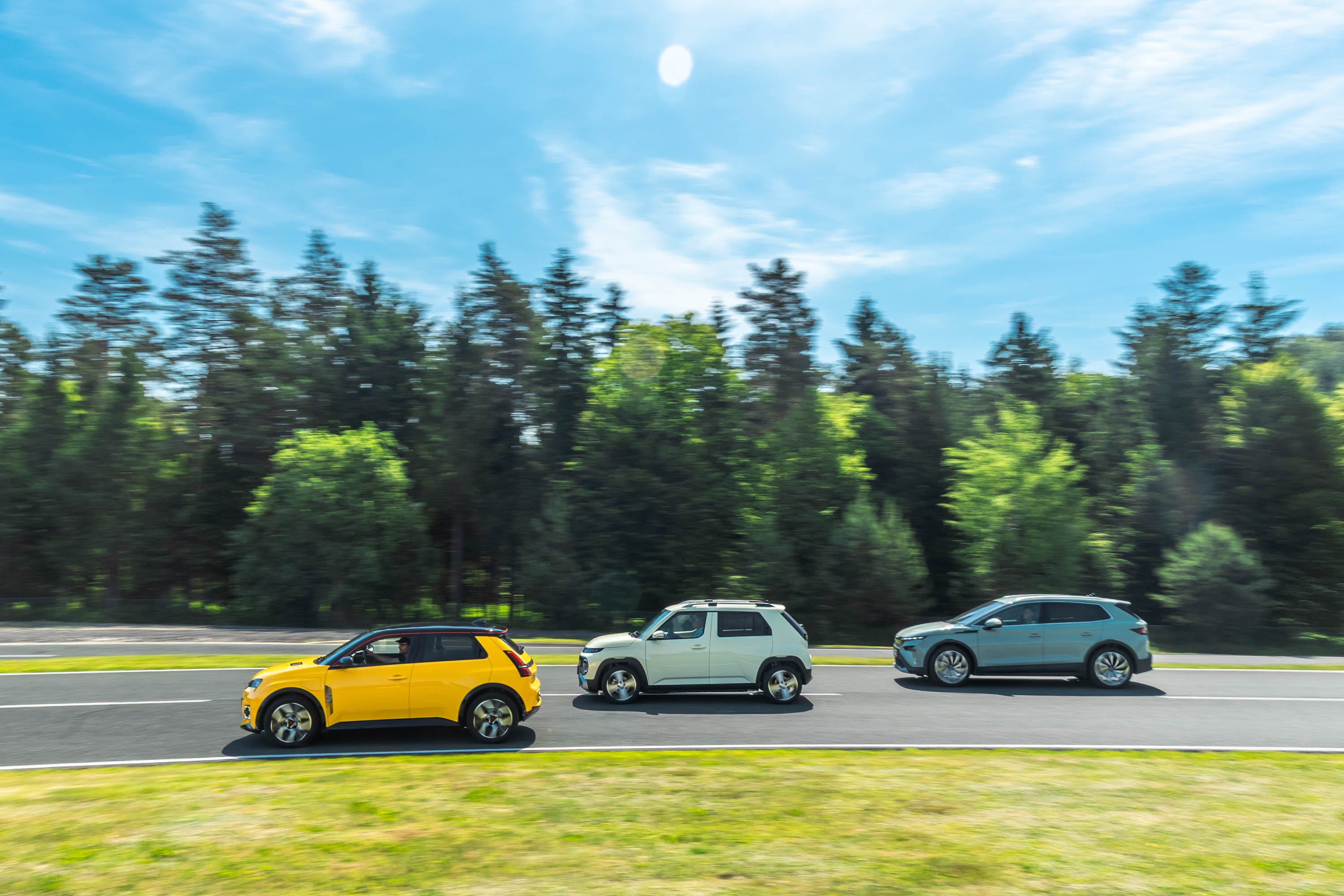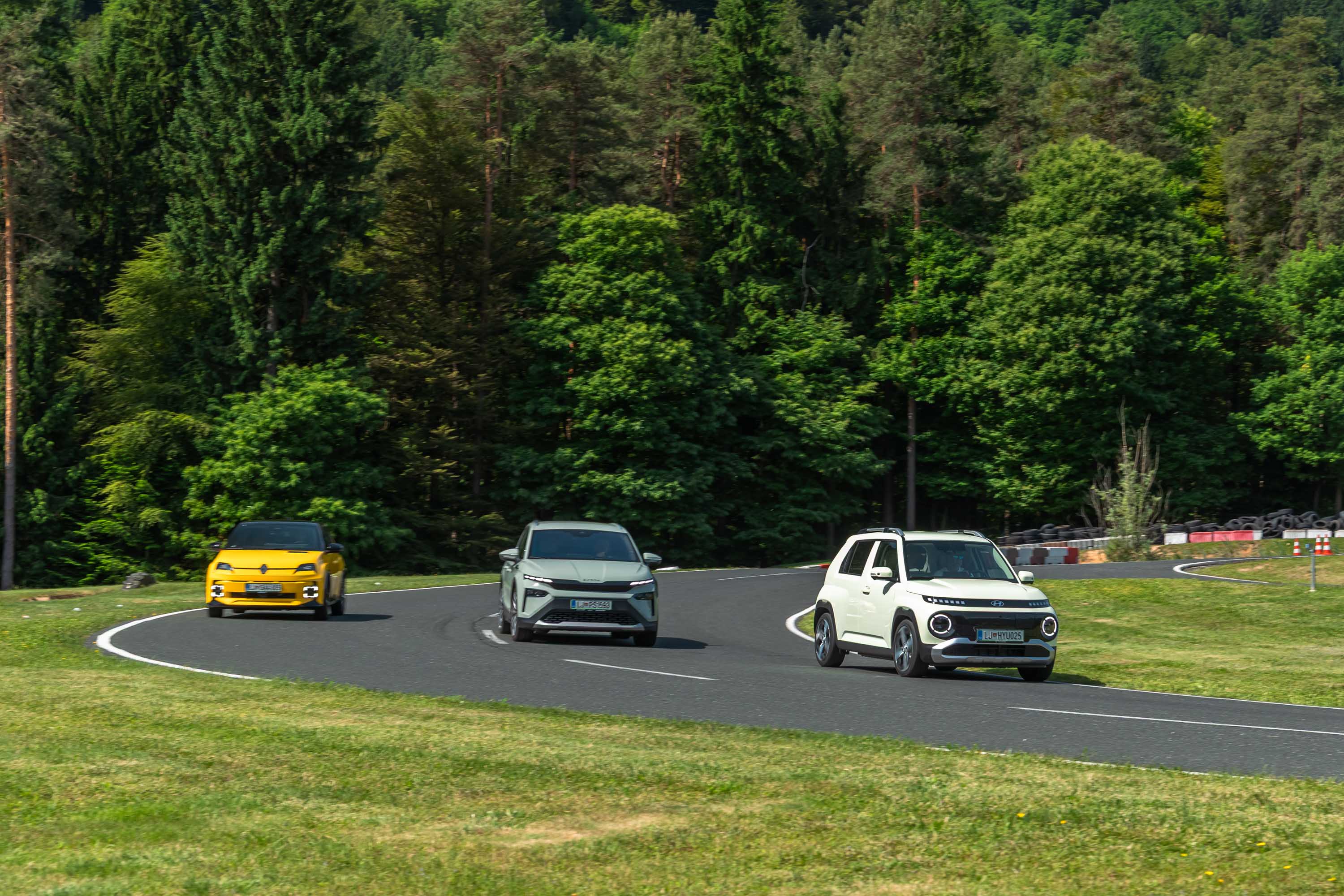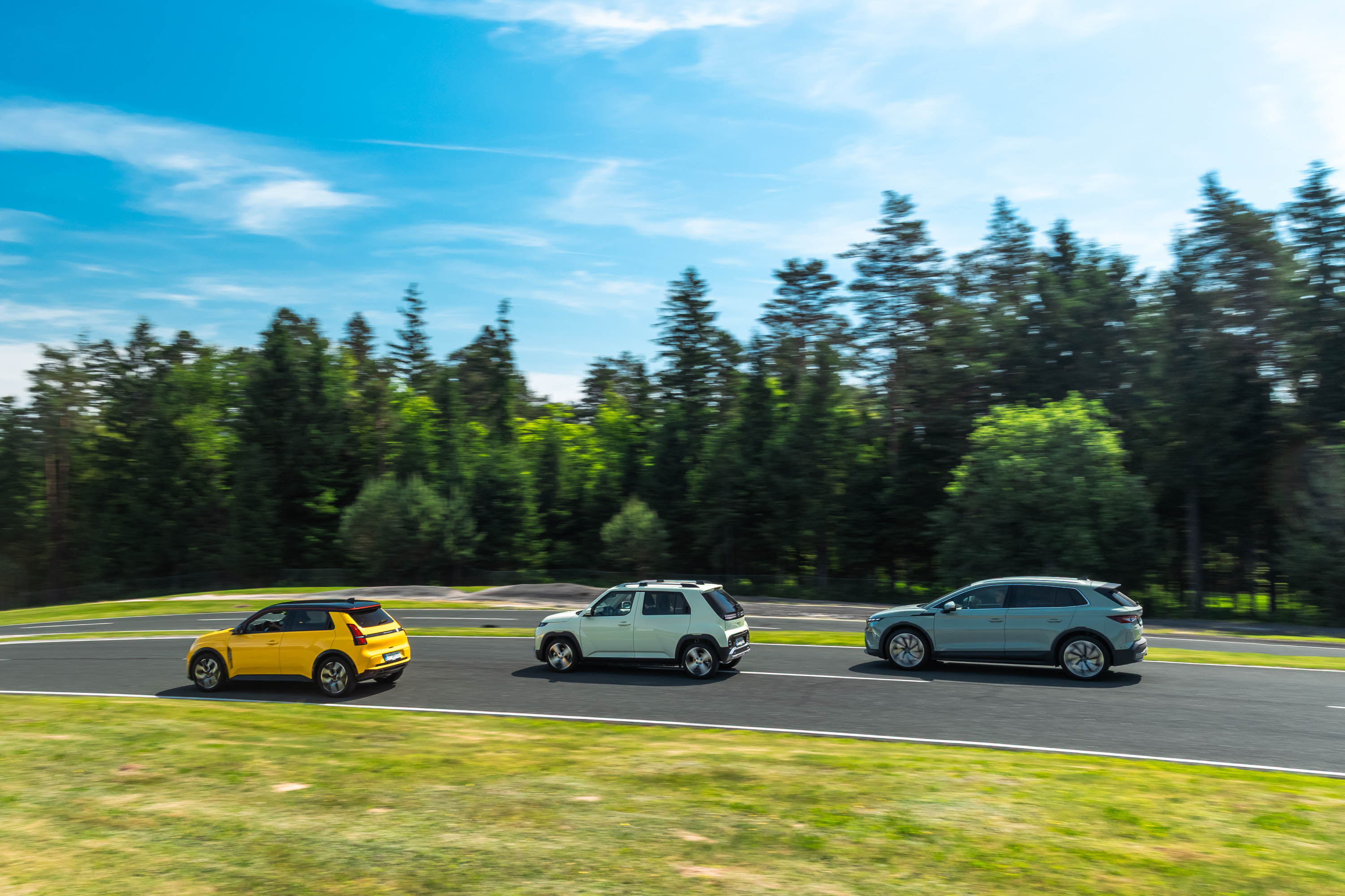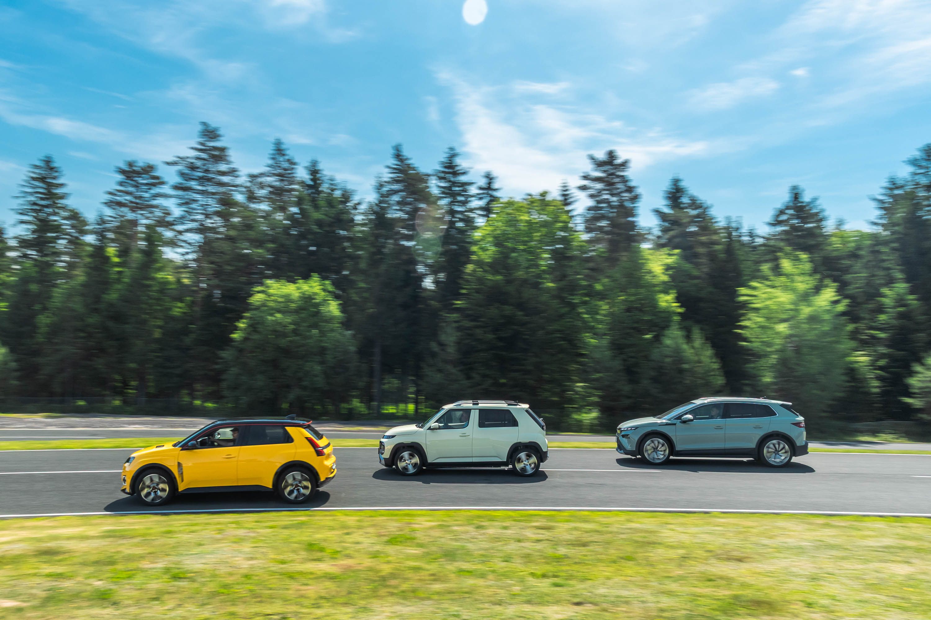 Trg električnih avtomobilov pri nas je letos bogatejši za kar nekaj zanimivih novih avtomobilov, ki bi si vsi po vrsti tudi zaslužili takšno električno druženje, a naš koledar testnih terminov se je zložil le za hkraten preskus teh treh avtomobilov; navzven majhnega, a vsebinsko zelo bogatega Hyundaijevega insterja, oblikovno nostalgično-simpatične in vozniško izjemne Renaultove petice ter presenetljivo suverenega in družinsko uporabnega Škodinega križanca elroqa.