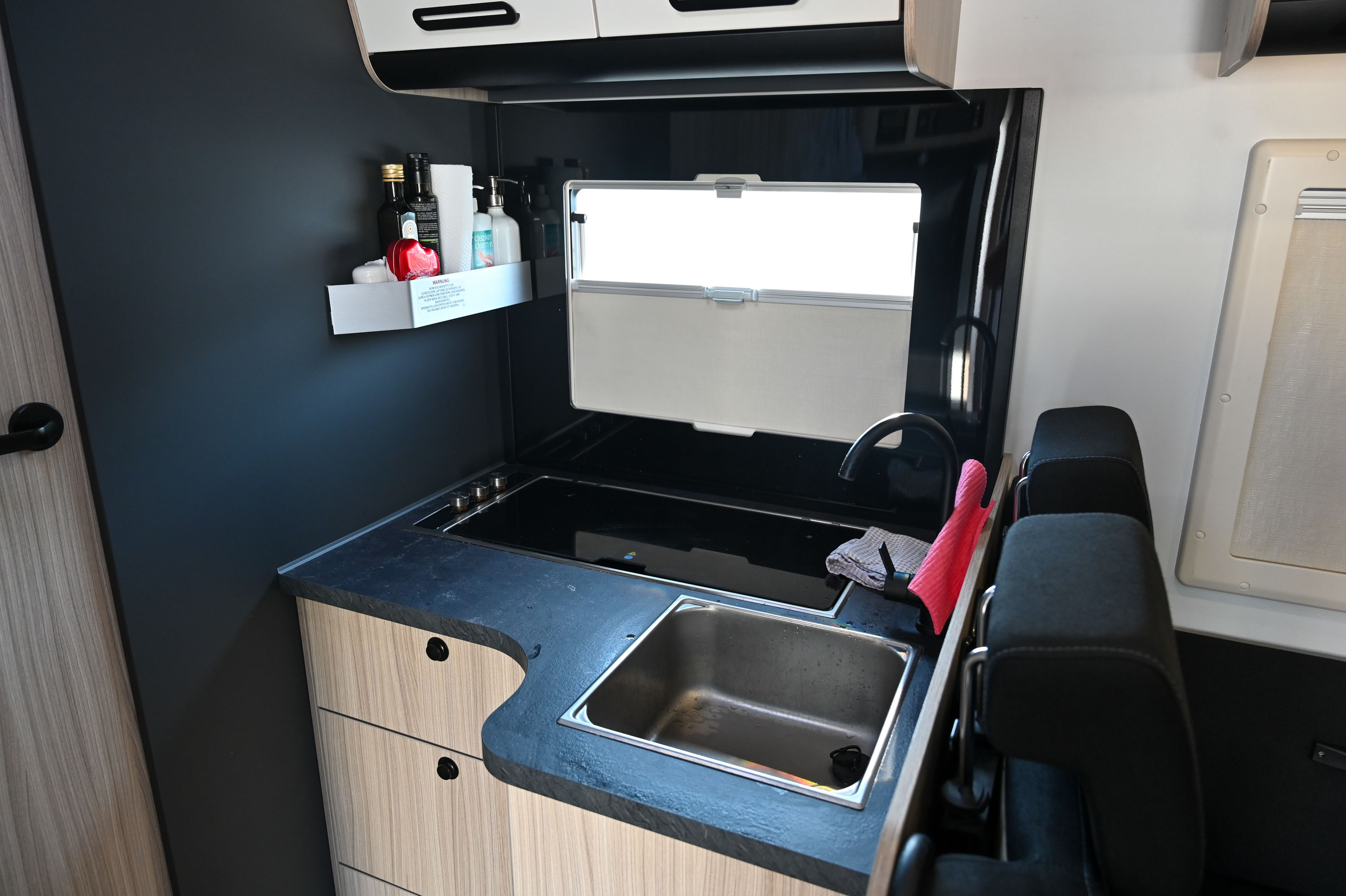 Velika kuhinja in jedilnica s klopjo, dodatnim stranskim sedežem in vrtljivima sedežema vozniške kabine preverjeno omogoča družinsko kosilo brez napadov os, sunkov vetra ali radovednih pogledov na avtocestnem postajališču. Video obiska tega avtodoma si lahko ogledate na družbenem omrežju Instagram na profilu Motorevije.