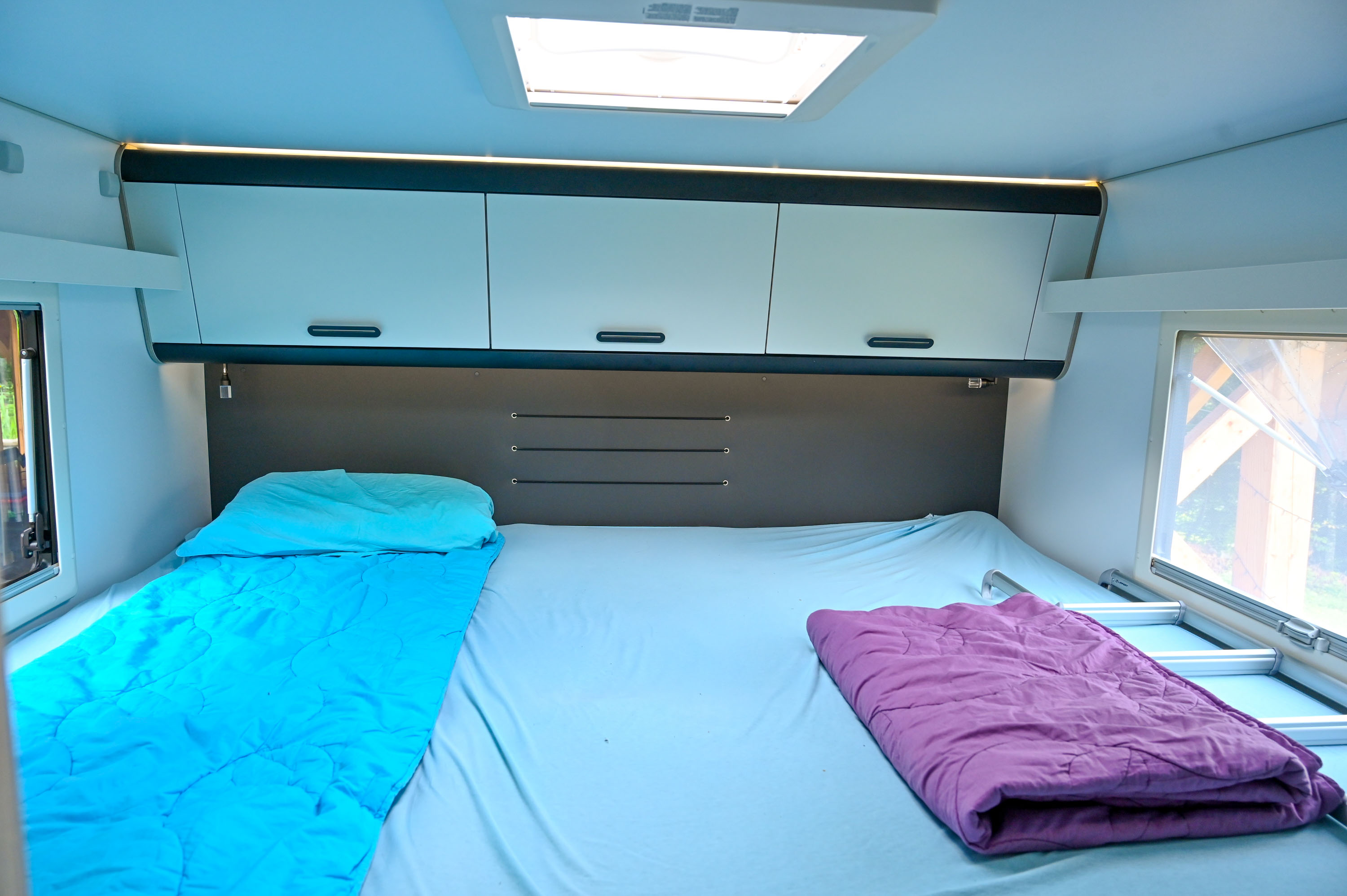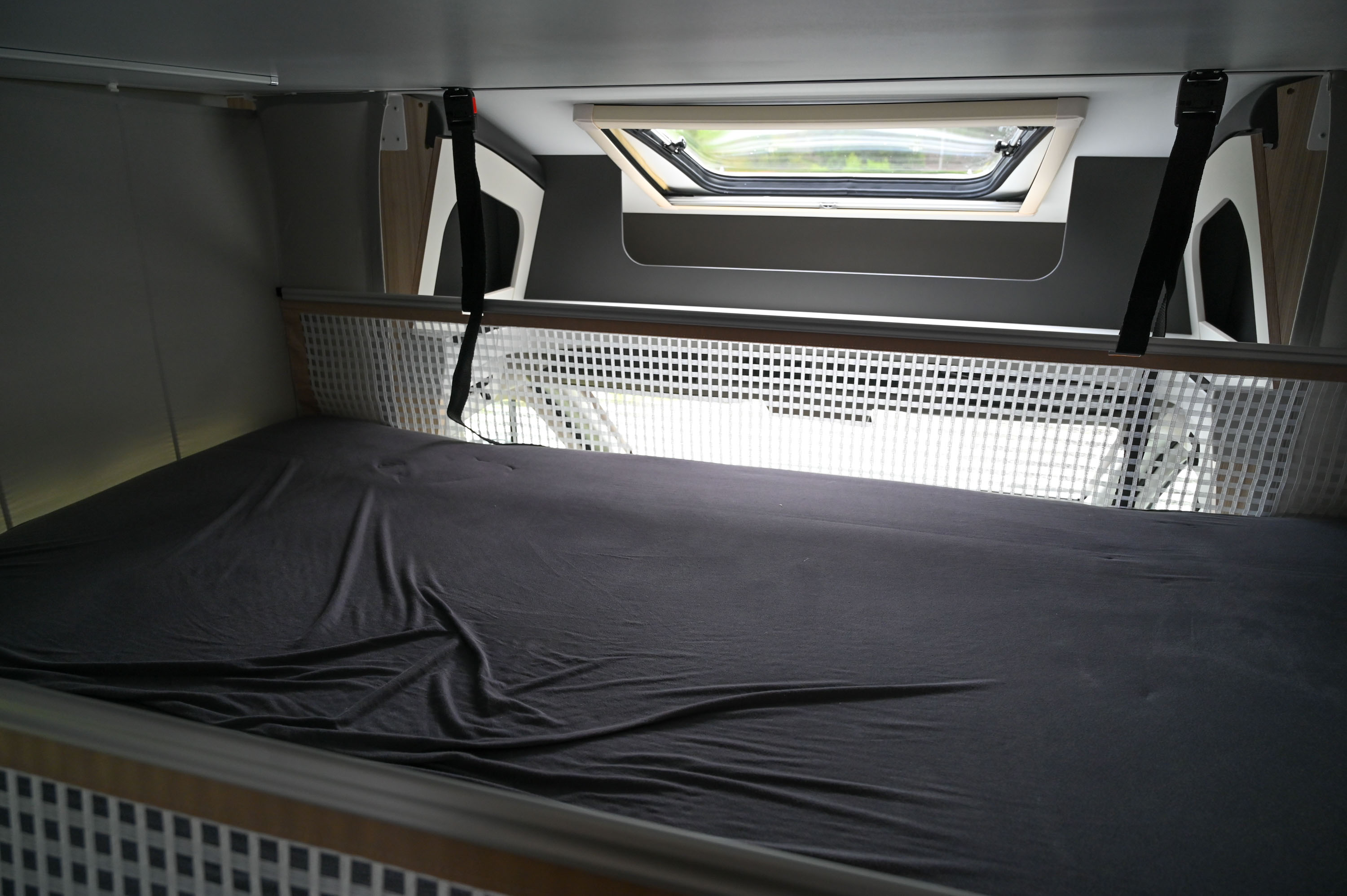 Velika postelja v zadnjem delu ponuja tri ležišča, njen sredinski del, ki se ga zaradi lažjega dnevnega dostopa do velikih omaric pod posteljo ponoči podaljša z izvlečnim dnom, je s 190 cm dolžine in 60 cm širine namenjen otroškemu obisku v spalnici staršev.