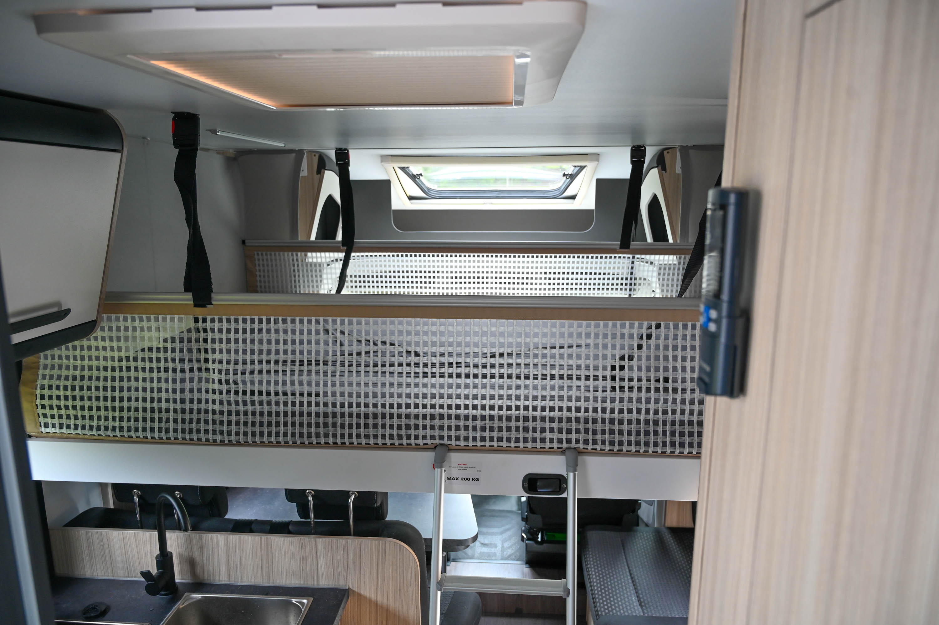 Na skoraj 7,5 metra zunanje dolžine in dobrih 395 centimetrih medosne razdalje sun living S 75SL ponuja pet ležišč, prostorno jedilnico, kuhinjo z velikim koritom, globokimi predali in kopalnico z ločeno tuš kabino ter WC-jem. Na poti navduši predvsem z dvema stalno pripravljenima velikima posteljema. To pomeni, da je avtodom iz dnevnega v nočni tloris in nazaj mogoče spremeniti v dobri minuti. Toliko namreč potrebujete, da odpnete stropni varnostni zaponki in zaklep ter izpod stropa jedilnice spustite dodatno posteljo velikosti 190 x 125 cm z nosilnostjo 200 kg, na kateri brez težav prenočita dva otroka - tudi najstnika. Najboljše pa je, da pri tem ni treba posegati v naslonjala jedilnega kota ali pospravljati mize, saj je tudi pri spuščeni postelji dovolj višine, da je omogočen prehod iz bivalnega dela v vozniško kabino.
