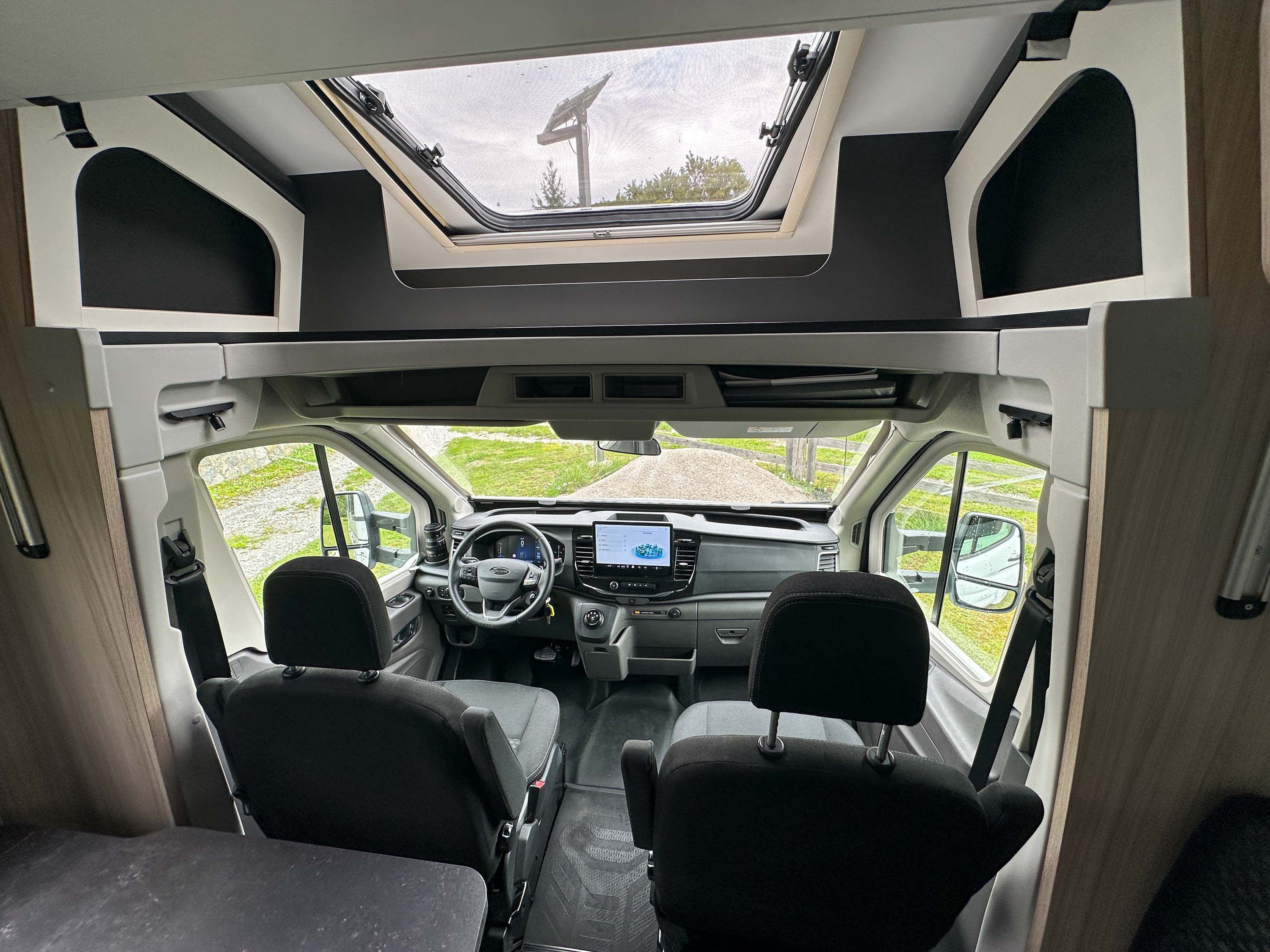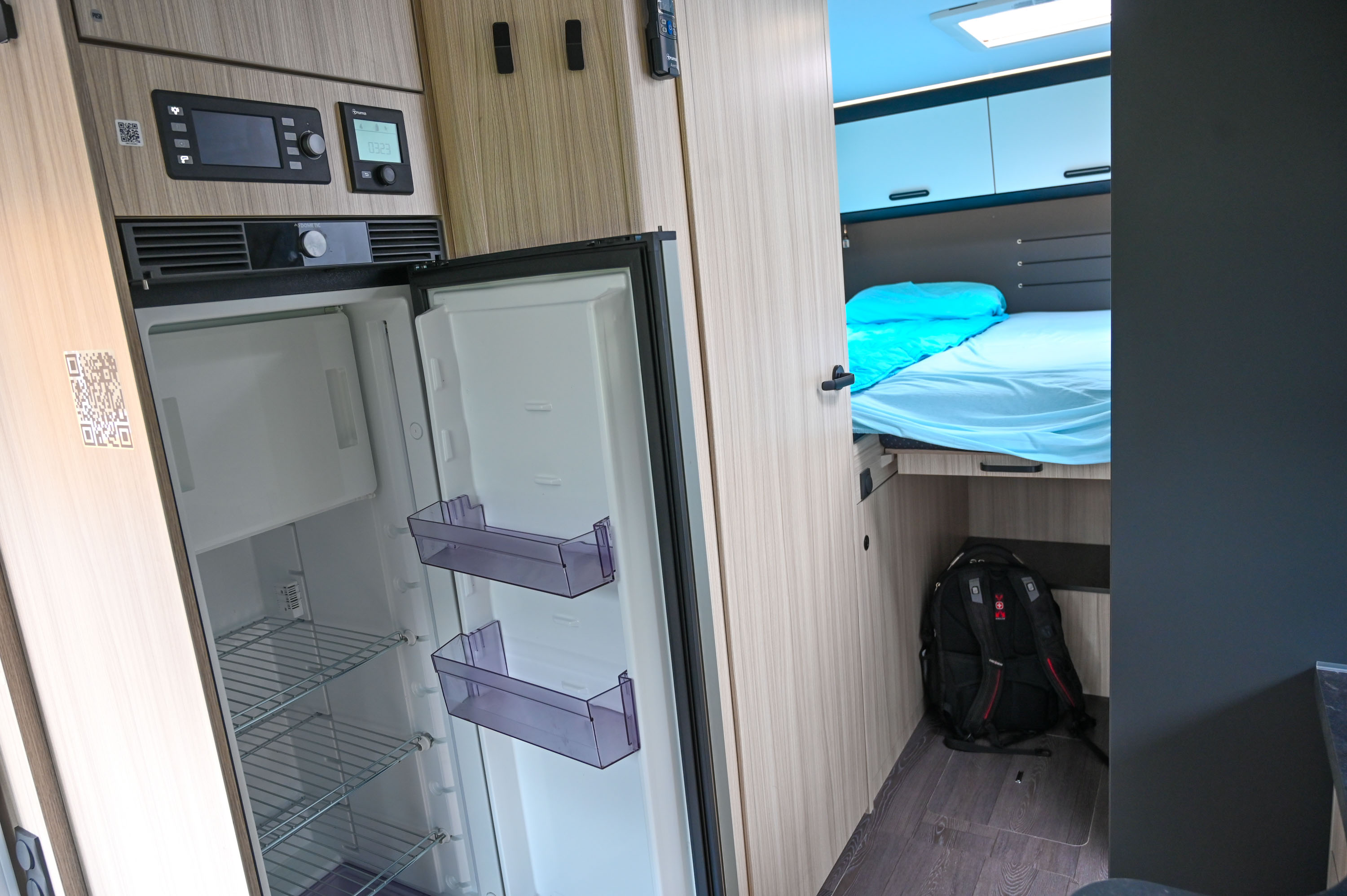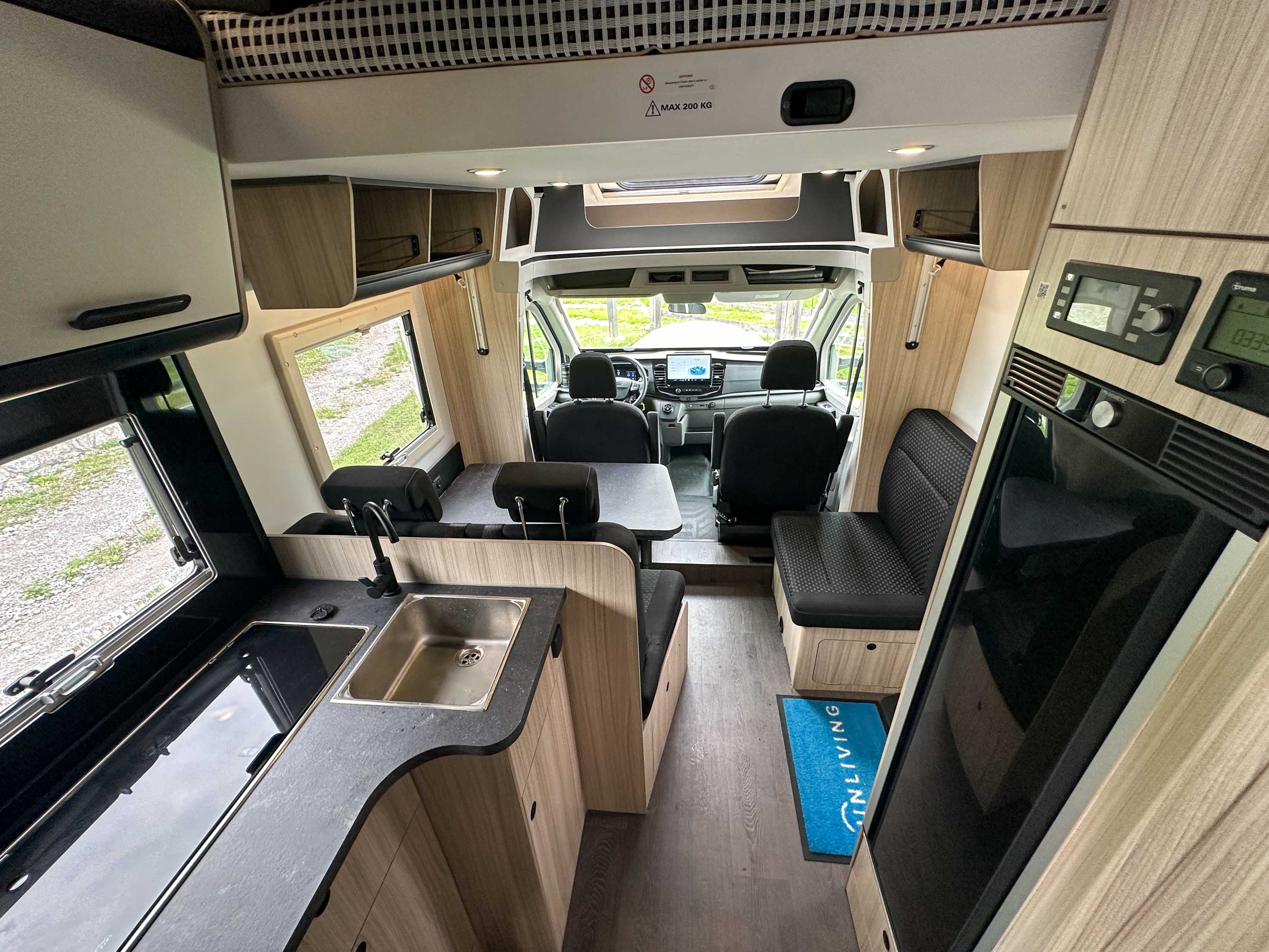 V kuhinji je velik 157-litrski 12-voltni kompresorski hladilnik, ki energijo vedno dobiva le iz bivalnega akumulatorja. Ta se seveda polni med vožnjo in iz zunanjega električnega omrežja, ko nanj priklopimo avtodom. Pri prej omenjenem enojnem dnu bivalnega dela ima na manj kot treh metrih višine avtodoma 210 cm notranje višine. Tudi del pohištvene opreme je zasnovan enostavneje. Na primer viseče omarice nad jedilnico nimajo klasičnih vratic, pač pa zaščito iz elastične mreže ali napetih elastik. To med drugim pomeni manj “čričkanja” med vožnjo.
