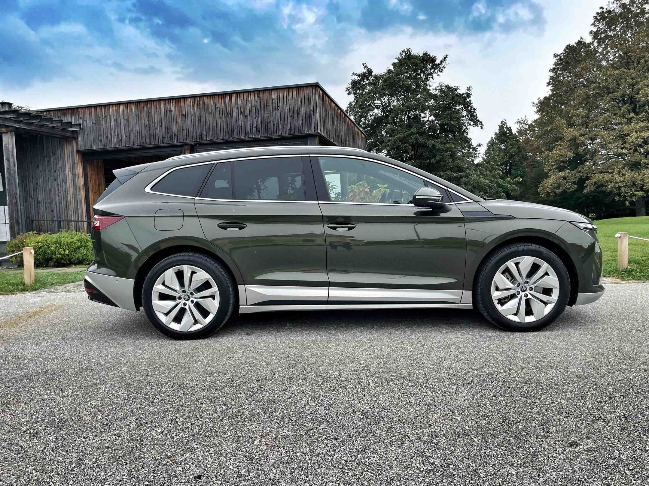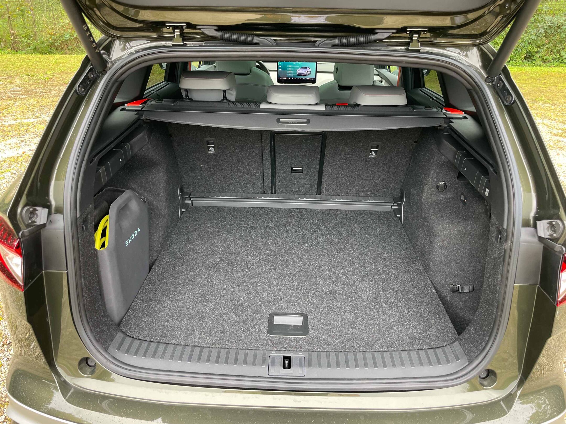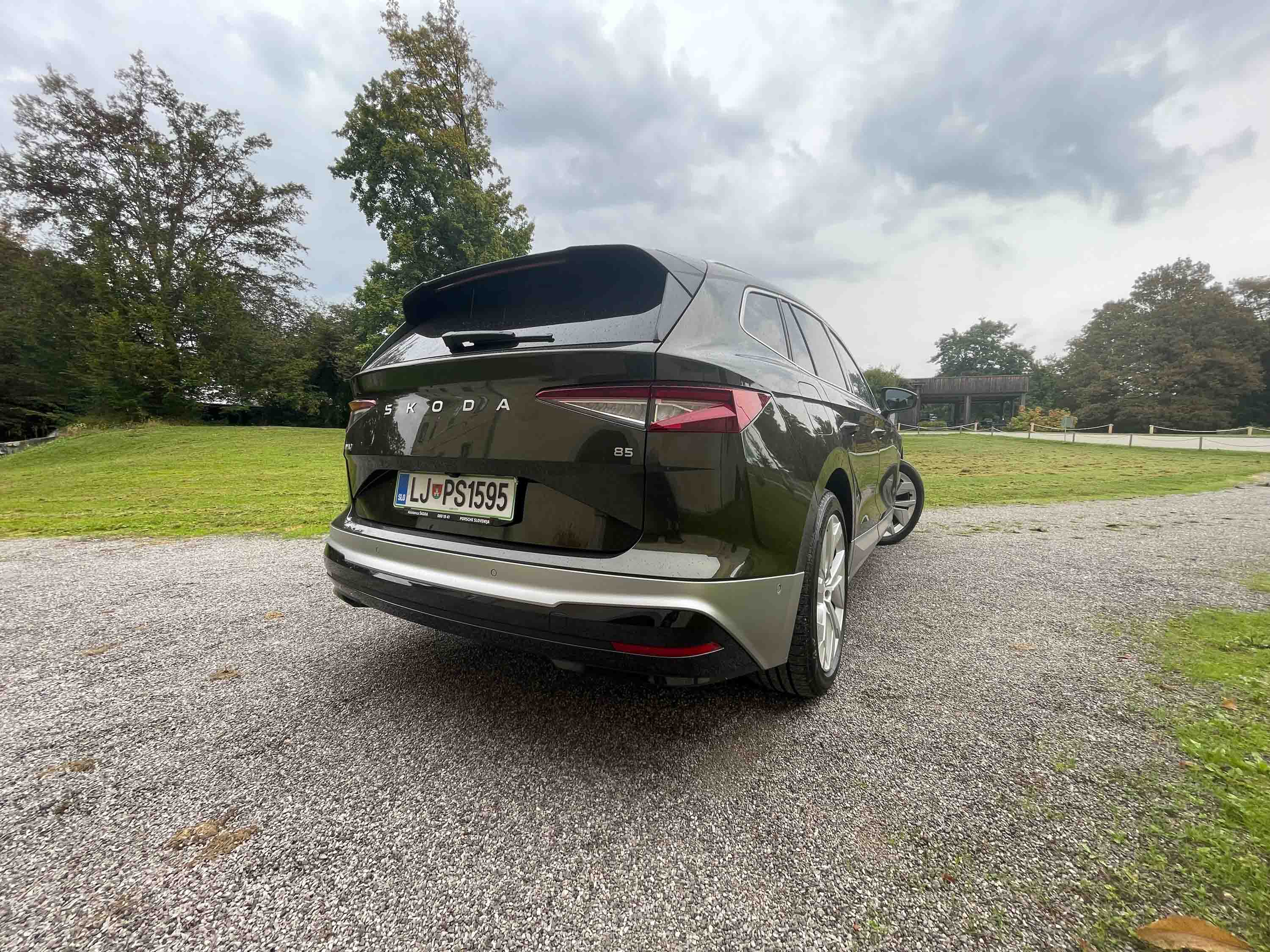 Škoda enyaq temelji na znani MEB platformi koncerna Volkswagen, tako kot na primer VW ID.4, kar seveda pomeni, da ima tudi zelo podobne vozne zmogljivosti. Zasnova karoserije je seveda ostala enaka, kar pomeni zelo prostorno potniško kabino in dokaj visoko oddaljenost dna avta od tal - 18,6 cm, kot se za cestnega terenca tudi spodobi. Enyaq namreč že s črko q na koncu imena izpričuje, da ga pri Škodi uvrščajo med cestne terence tako kot kamiqa, karoqa, kodiaqa in tudi električnega elroqa, ki je manjši od enyaqa. Dokaj visoko sedenje vozniku omogoča zelo dober pregled nad avtomobilom, hkrati pa tudi enostavno vstopanje v avto in izstopanje iz njega. Prtljažnik je s 585 litri prostora več kot dovolj velik za družinske potrebe, je tudi povečljiv s prevračanjem asimetrično deljenega naslona zadnje klopi.