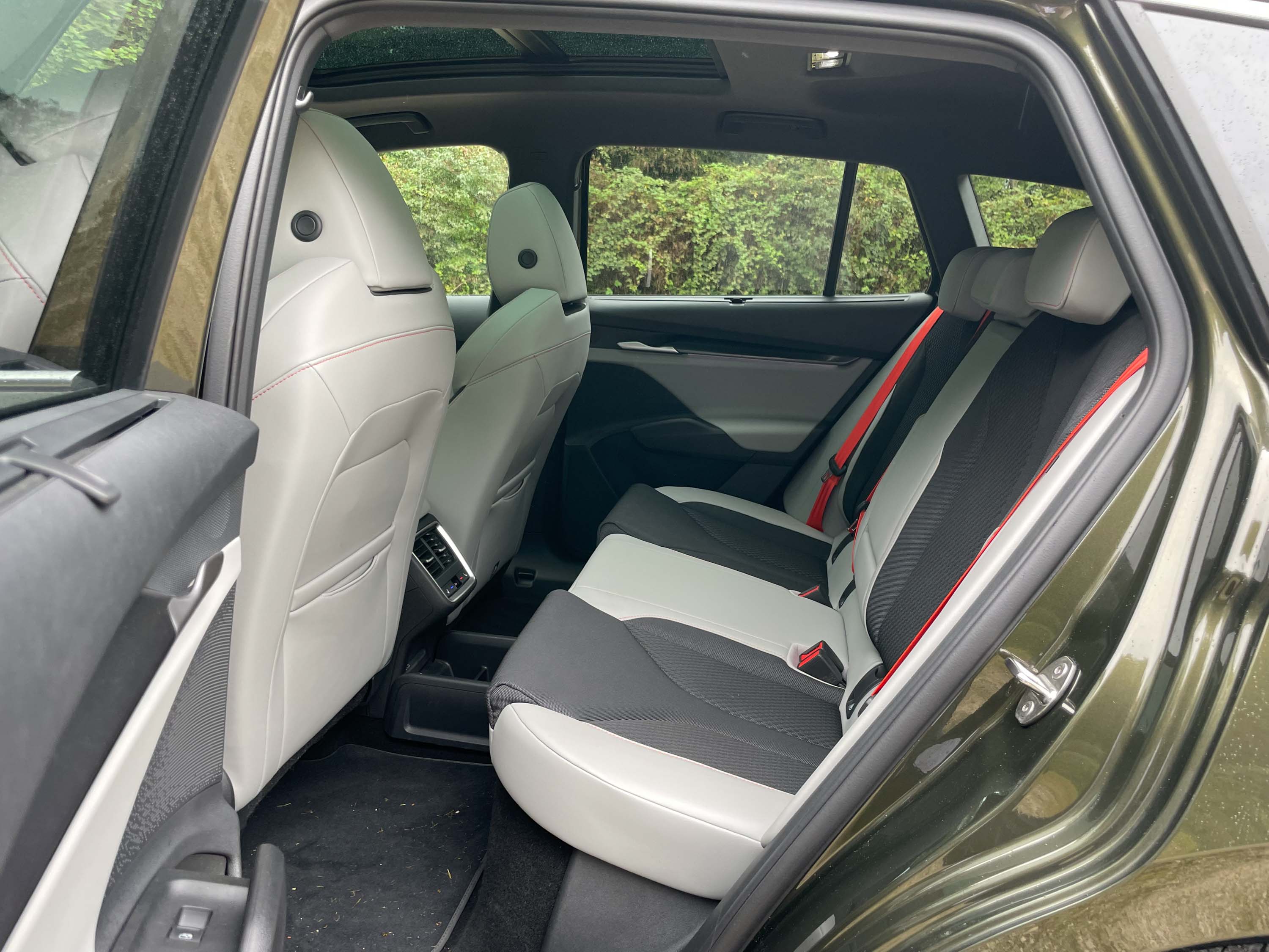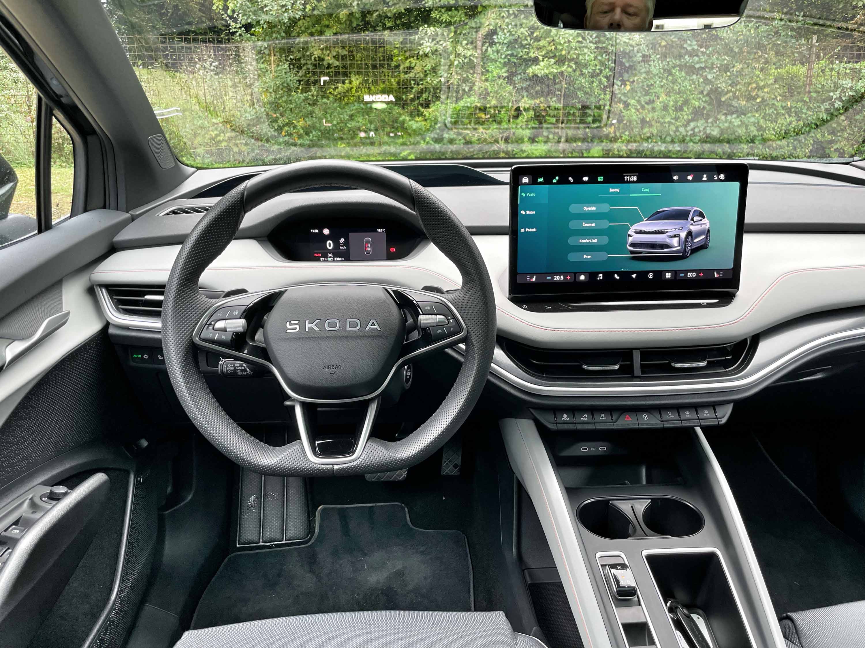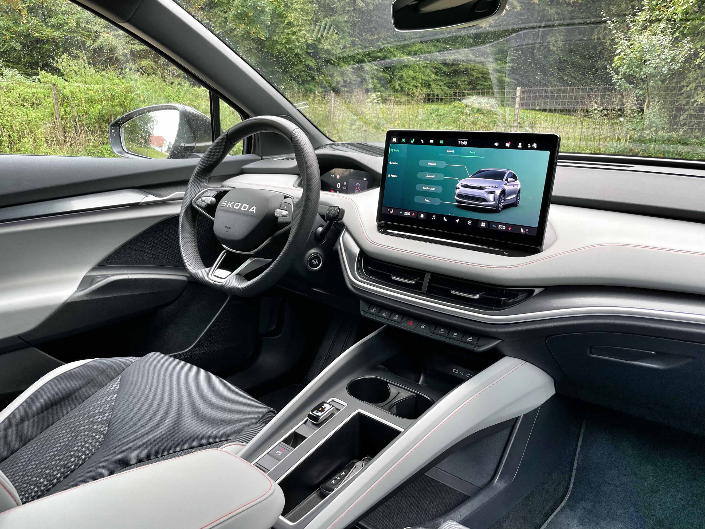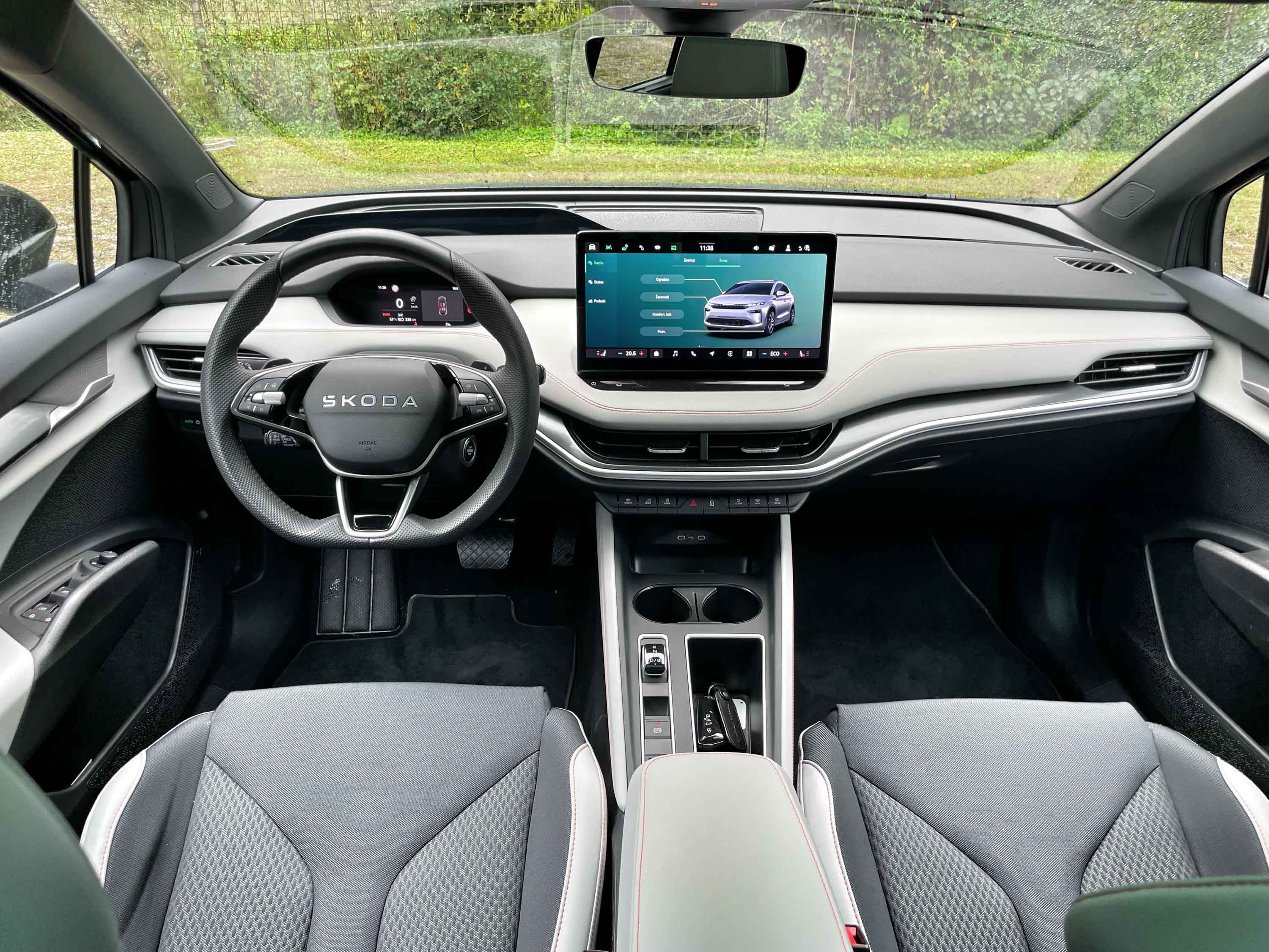 Potniška kabina se odlikuje s prostornostjo, saj se tudi na zadnjih sedežih sedi udobno, prostora je dovolj tako za kolena kot glave potnikov. Enako velja za prednja sedeža z zadostnim pomikom in zelo dobrim oprijemom telesa. Osrednje mesto na armaturni plošči ima velik zaslon infotainment sistema, instrumentna plošča pred voznikom pa je (pre)majhna za tako velik avto, pa tudi njena grafika je zelo enostavna. Še dobro, da ima enyaq tudi projecirni zaslon, na katerem voznik vidi vse najpomembnejše podatke.