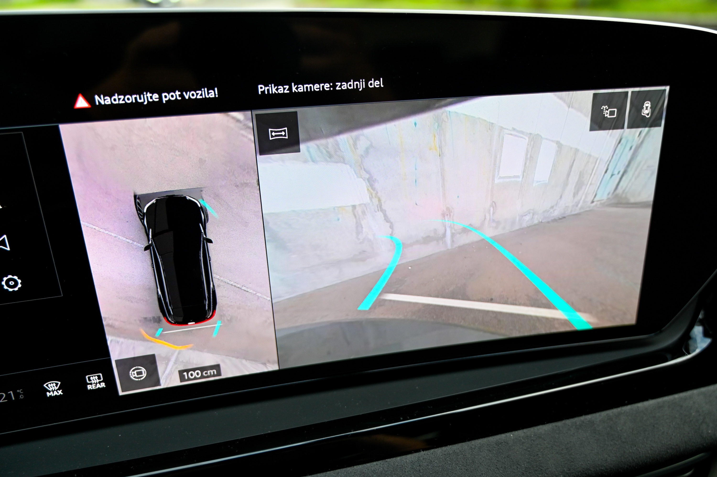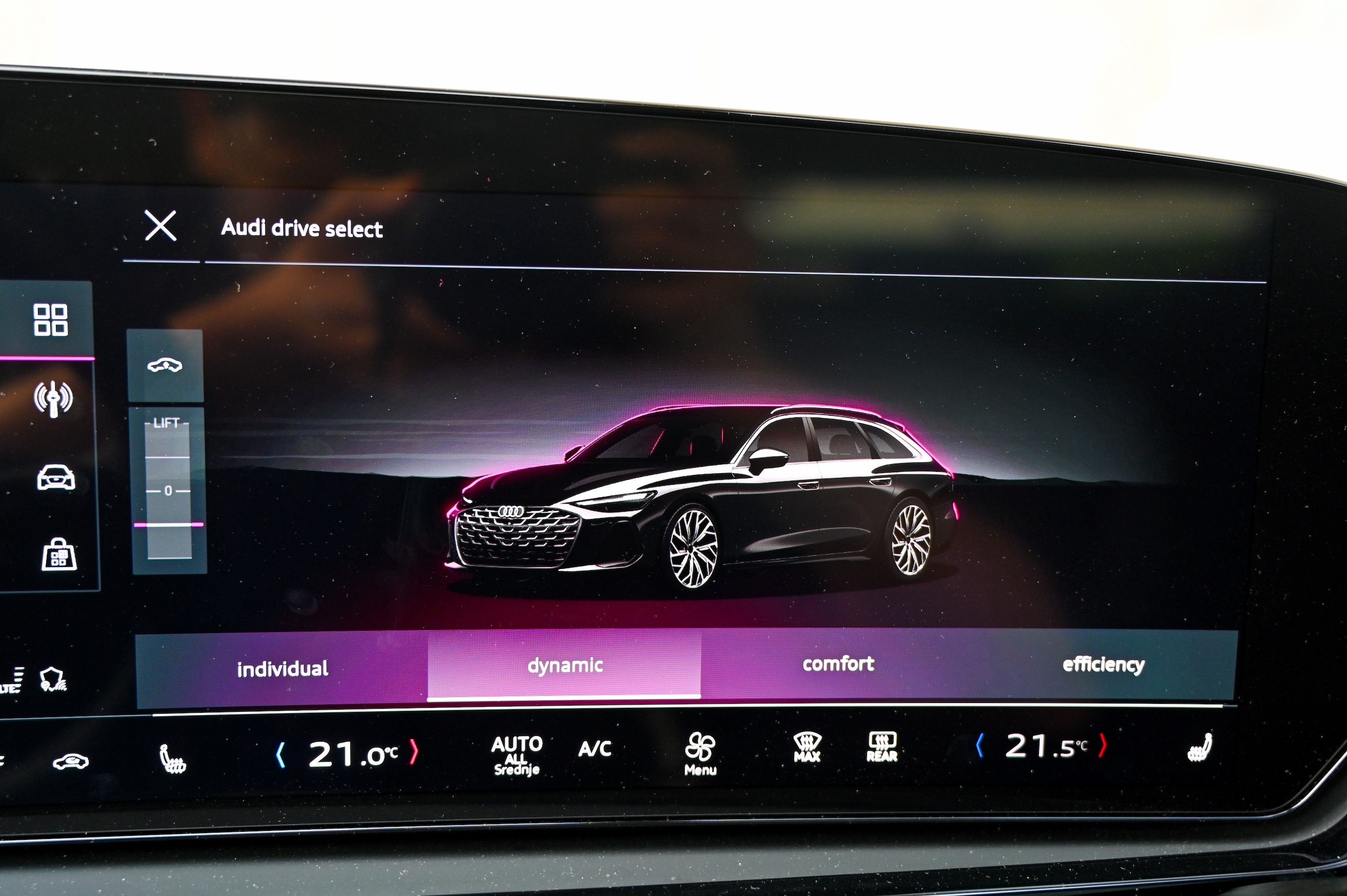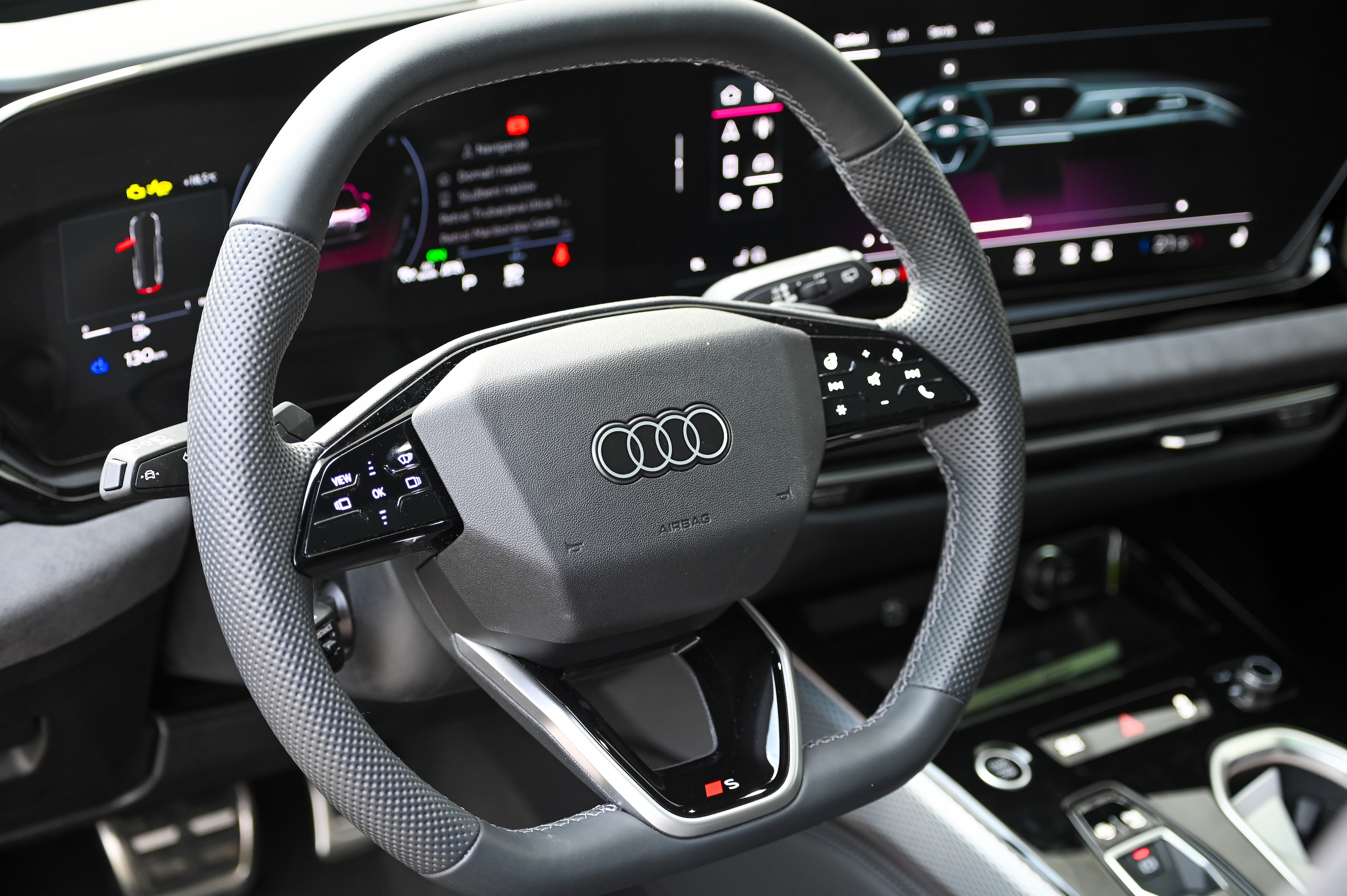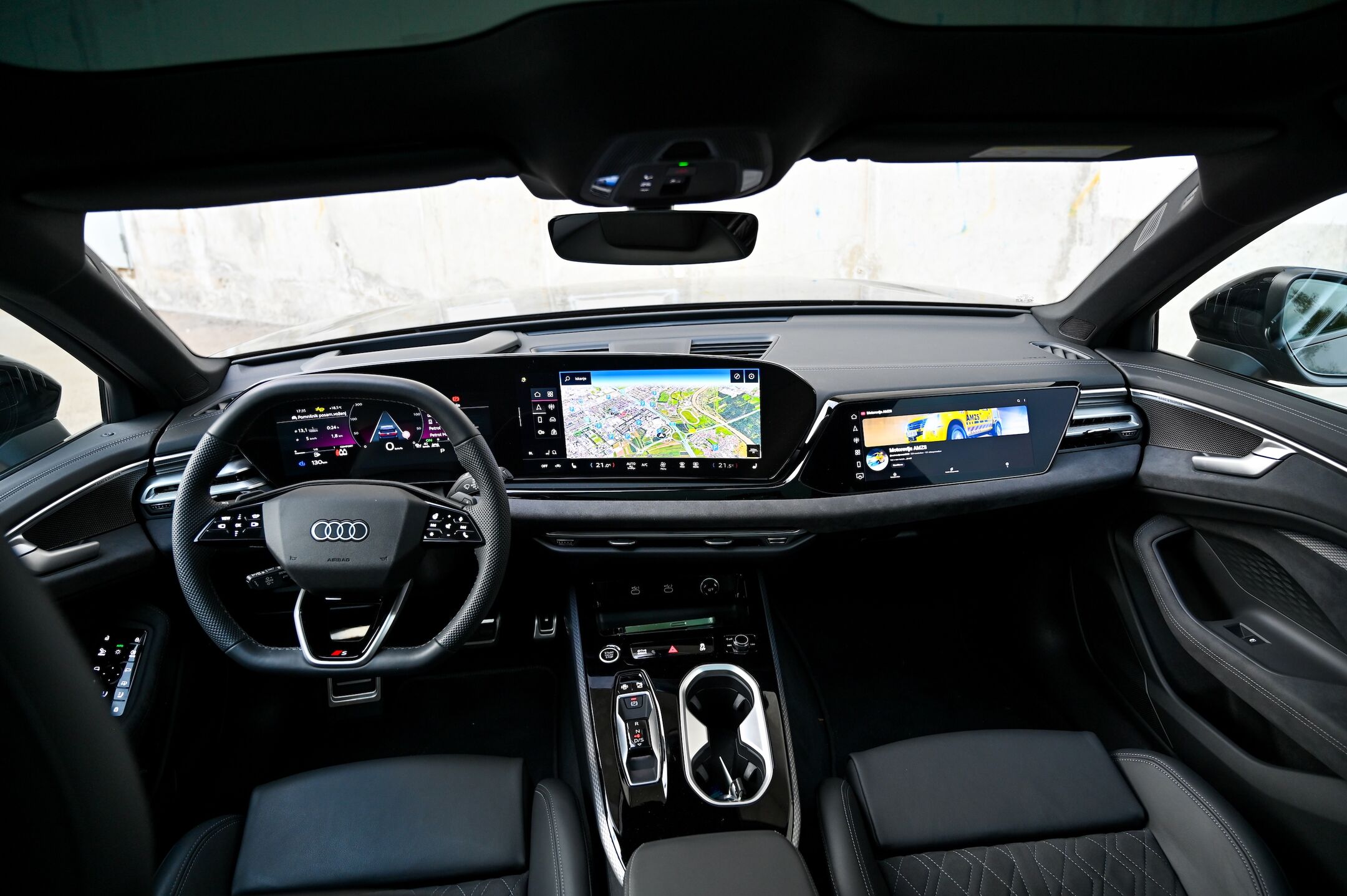 O novi Audijevi trizaslonski digitalni arhitekturi smo v Motoreviji že pisali, zato le ponovimo; gre za pregledno, odzivno in intuitivno digitalno okolje, ki ne daje vtisa, da gre za v avto nameščen tablični računalnik, temveč za avtomobilsko armaturno ploščo z zmogljivim vmesnikom, ki bo všeč tudi bolj analognim, konzervativnim voznikom. Ob tem ima Audijev digitalni vmesnik vse, kar imajo tudi najboljši tablični avtomobilski računalniki, vključno z e-SIM spletno povezavo, bogatim naborom aplikacij (vključno z igricami), Googlovimi zemljevidi in odličnim načrtovalnikom poti. Še vedno nas motijo obloge prekrite s sijočim piano lakom, kjer se pozna vsak prstni odtis.