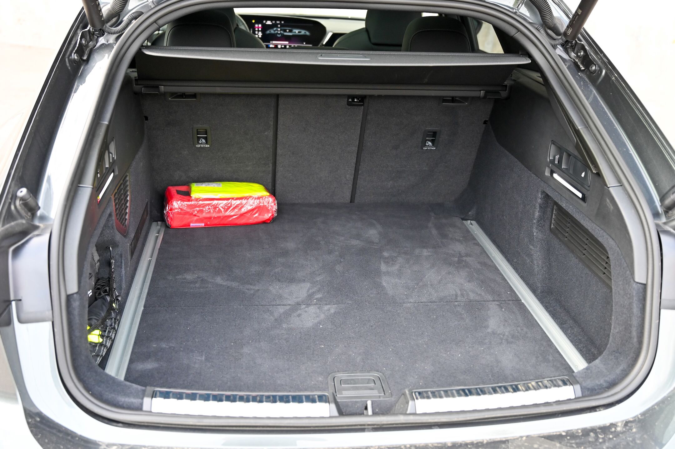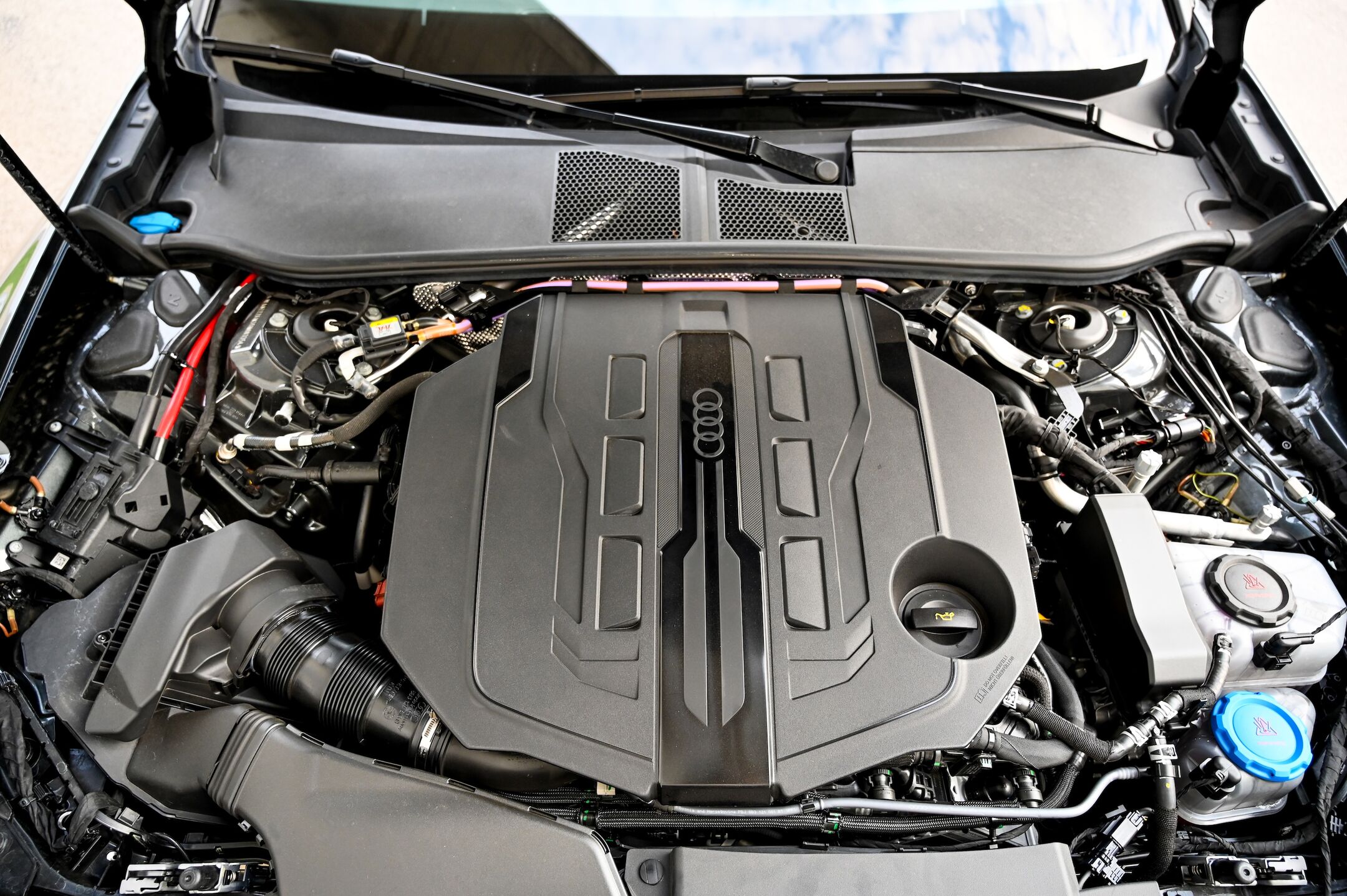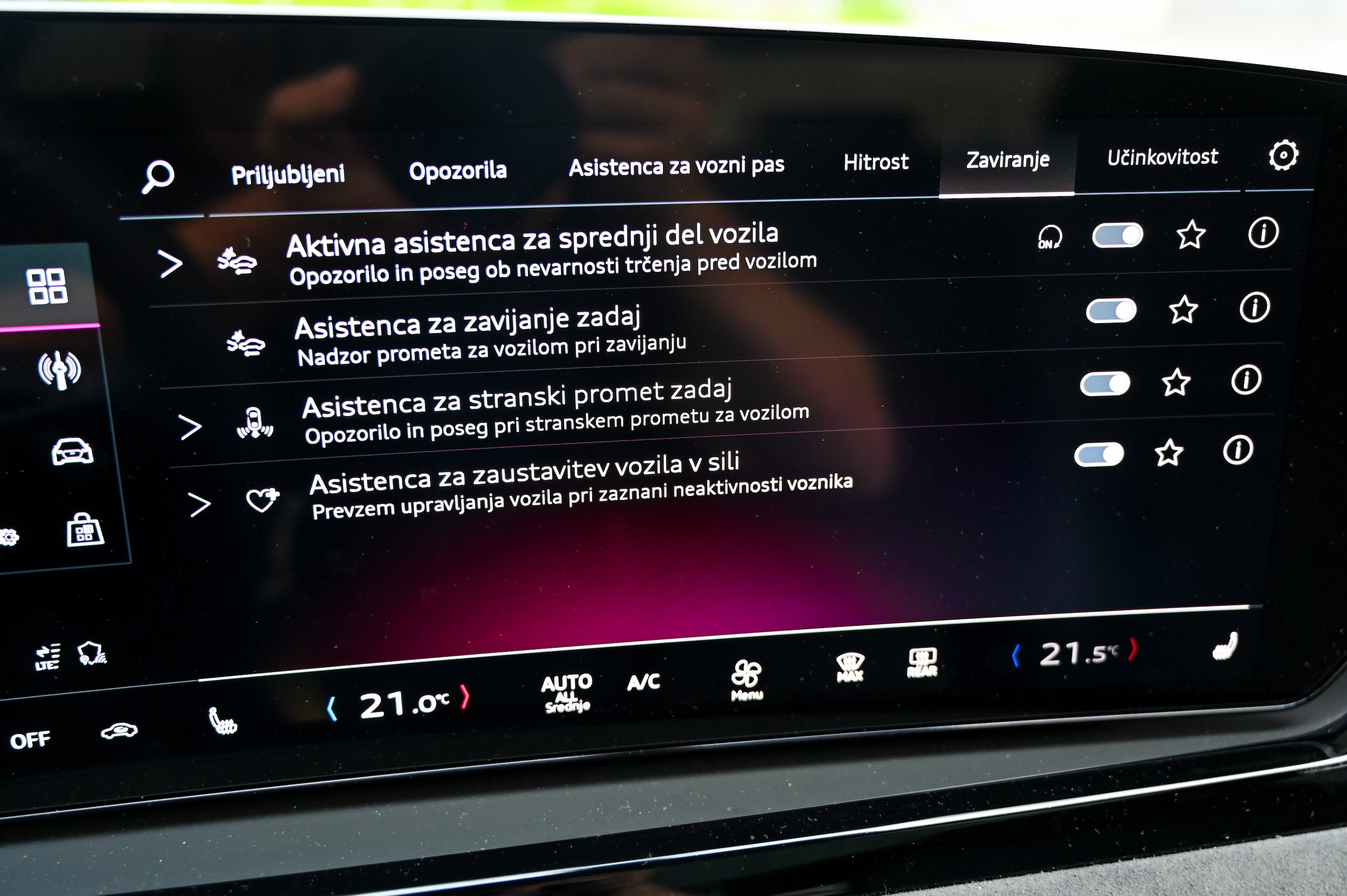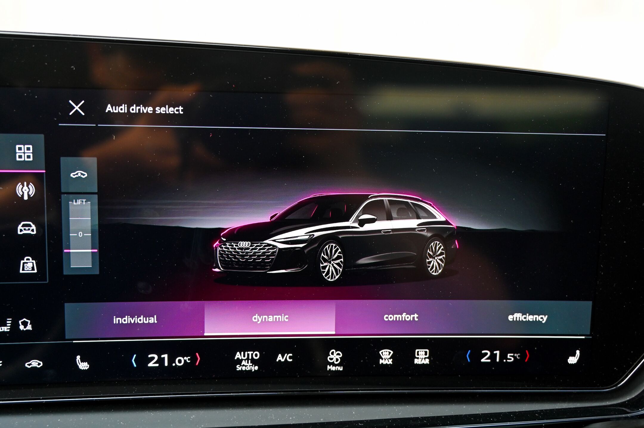O novi Audijevi trizaslonski digitalni arhitekturi smo v Motoreviji že pisali, zato le ponovimo; gre za pregledno, odzivno in intuitivno digitalno okolje, ki ne daje vtisa, da gre za v avto nameščen tablični računalnik, temveč za avtomobilsko armaturno ploščo z zmogljivim vmesnikom, ki bo všeč tudi bolj analognim, konzervativnim voznikom. Ob tem ima Audijev digitalni vmesnik vse, kar imajo tudi najboljši tablični avtomobilski računalniki, vključno z e-SIM spletno povezavo, bogatim naborom aplikacij (vključno z igricami), Googlovimi zemljevidi in odličnim načrtovalnikom poti. Še vedno nas motijo obloge prekrite s sijočim piano lakom, kjer se pozna vsak prstni odtis.
