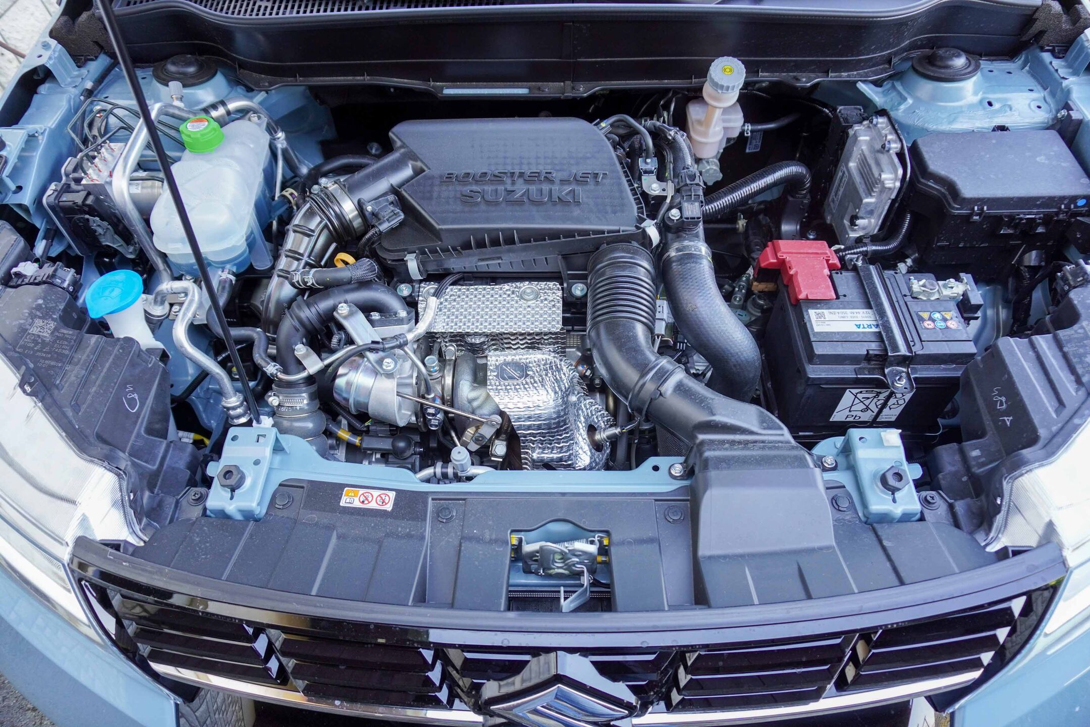 Preskusno vitaro je poganjala šibkejša različica 1,4-litrskega štirivaljnega turbo bencinskega motorja, ki mu je v pomoč blagi hibridni sistem, ki deluje na 48 voltno električno napetost, ki jo ima litij-ionski akumulator pod sovoznikovim sedežem, električni motor pa deluje kot zaganjalnik in generator. Blagi hibridni sistem deluje povsem avtonomno, zagotavlja rekuperacijo energije ob zaviranju in je v pomoč bencinskemu motorju pri speljevanju in pospeševanju. Za prenos moči je v preskusnem avtu skrbel ročni, lahko in natančno prestavljiv 6-stopenjski menjalnik. Ker je vitara lahek avto, saj prazna tehta manj kot 1,4 tone, je tudi šibkejša različica motorja dovolj zmogljiva, da je avto brez težav zahtevam v vsakdanjem prometu, ni pa ravno poskočen: do 100 km/h potrebuje dobrih 12 sekund.