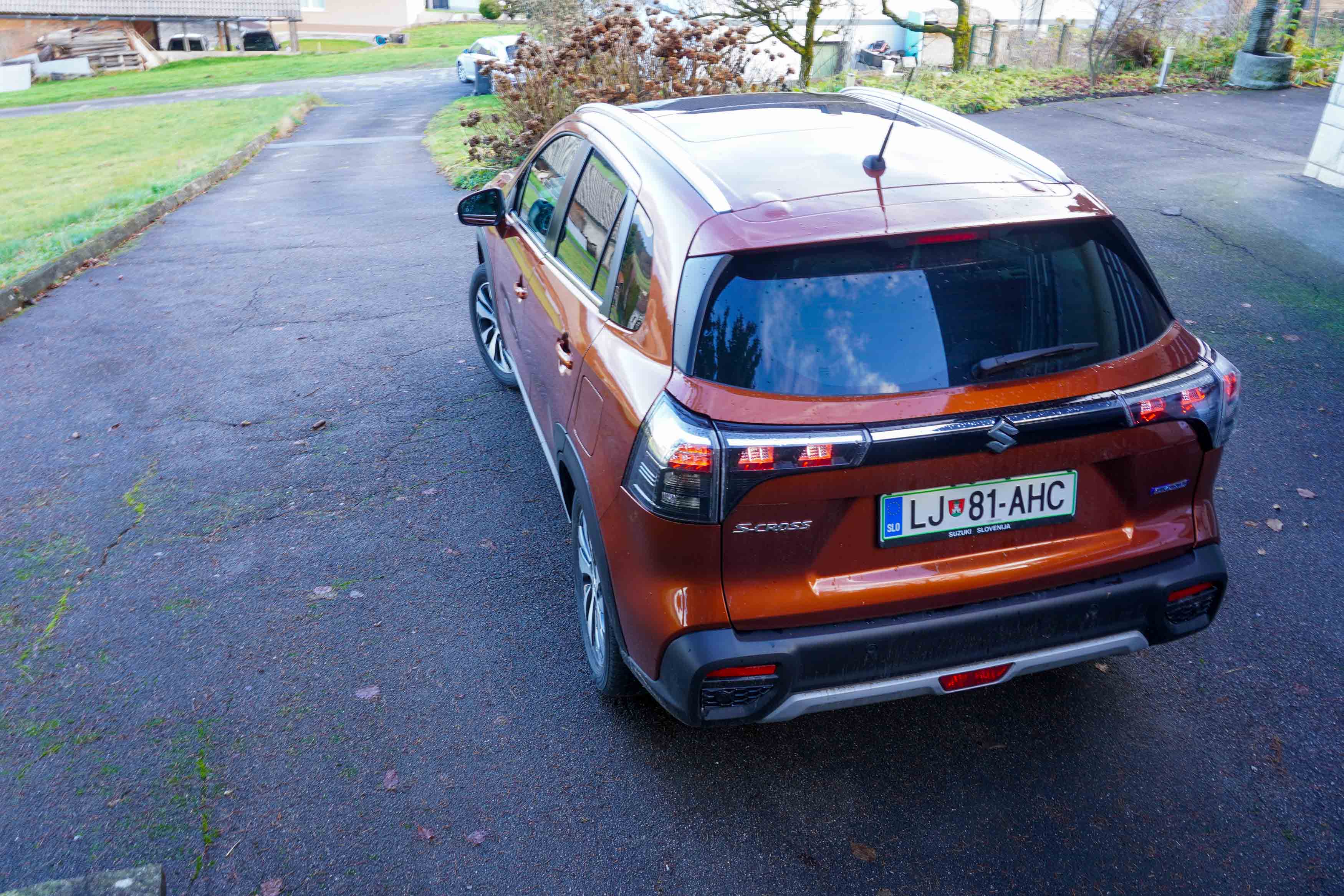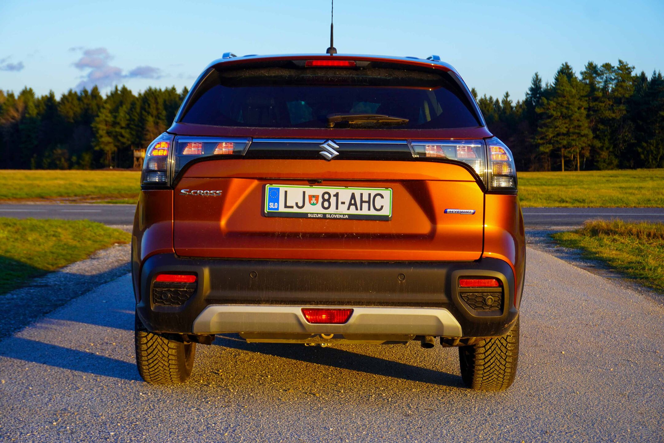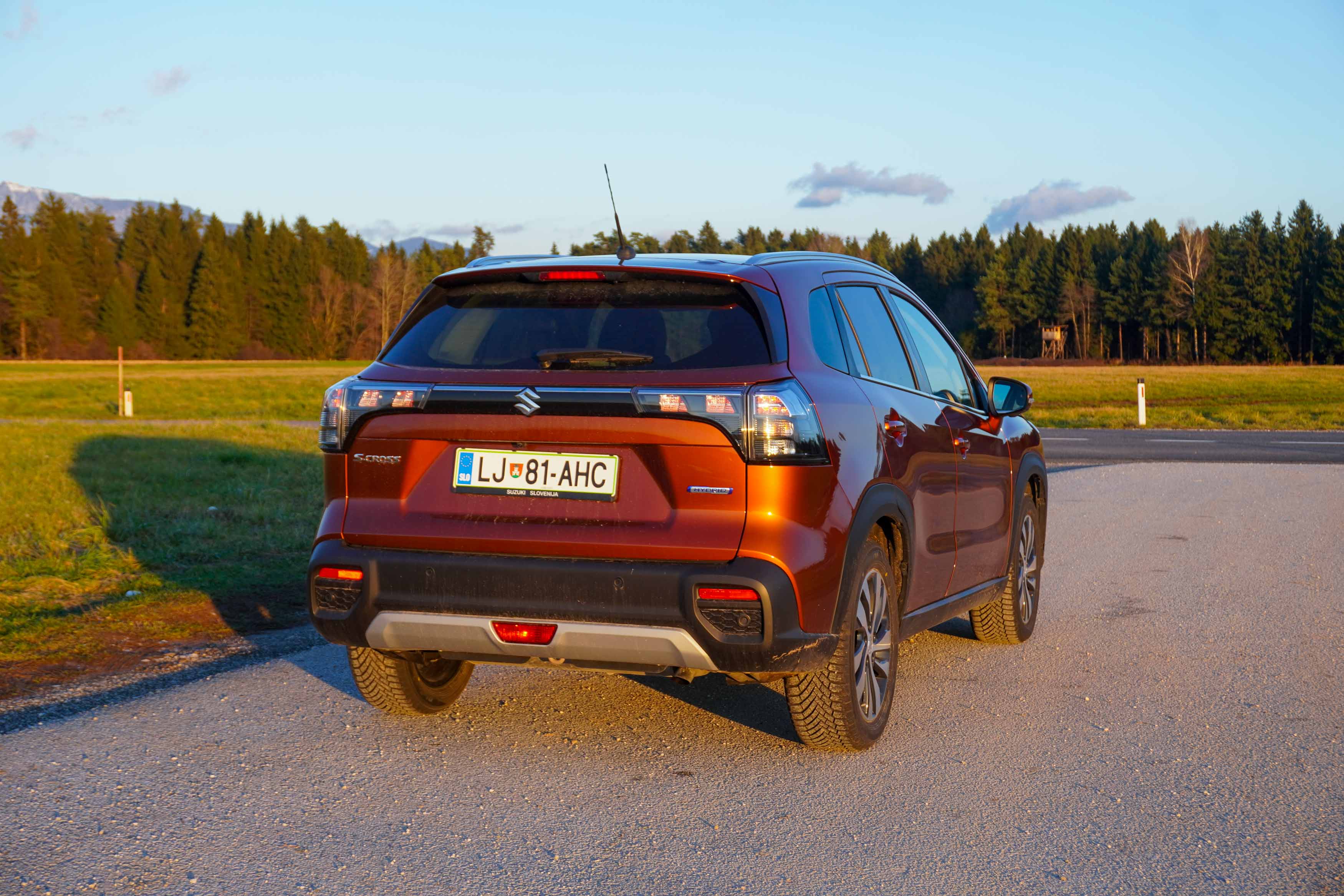 Enako kot vitara je tudi S-cross sedaj dobil nekoliko šibkejši 1,4-litrski turbo bencinski motor z največjo močjo 81 kW, ki mu je v pomoč blagi hibridni sistem, ki ga zagotavlja električni motor z največjo močjo 12,2 kW in deluje kot zaganjalnik in generator. Sistem rekuperira zavorno energijo v električno, ki je shranjena v 48 voltnem litij-ionskem akumulatorju in jo prek pretvornika v 12 voltno napetost uporabi pri speljevanju in pospeševanju pri nizkih vrtljajih bencinskega motorja, ko turbinski polnilnik še ne deluje v polnem obsegu. Sistem rekuperacije deluje samodejno, voznik nanj nima vpliva. Za prenos moči je v preskusnem avtu skrbel 6-stopenjski samodejni menjalnik z neobičajno prestavno kuliso. Ob potegu prestavne ročice do konca namreč prestavite v ročni način prestavljanja, običajni D položaj za vožnjo je stopnjo prej. Nič narobe, le navaditi se je treba, sicer pa menjalnik deluje uglajeno. Odločnejše pospeševanje, ko se motor zavrti z višjim vrtljaji, je glasno. Tudi vožnja po avtocesti je precej glasna, pa ne zaradi vrtljajev motorja, temveč aerodinamike karoserije.