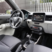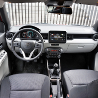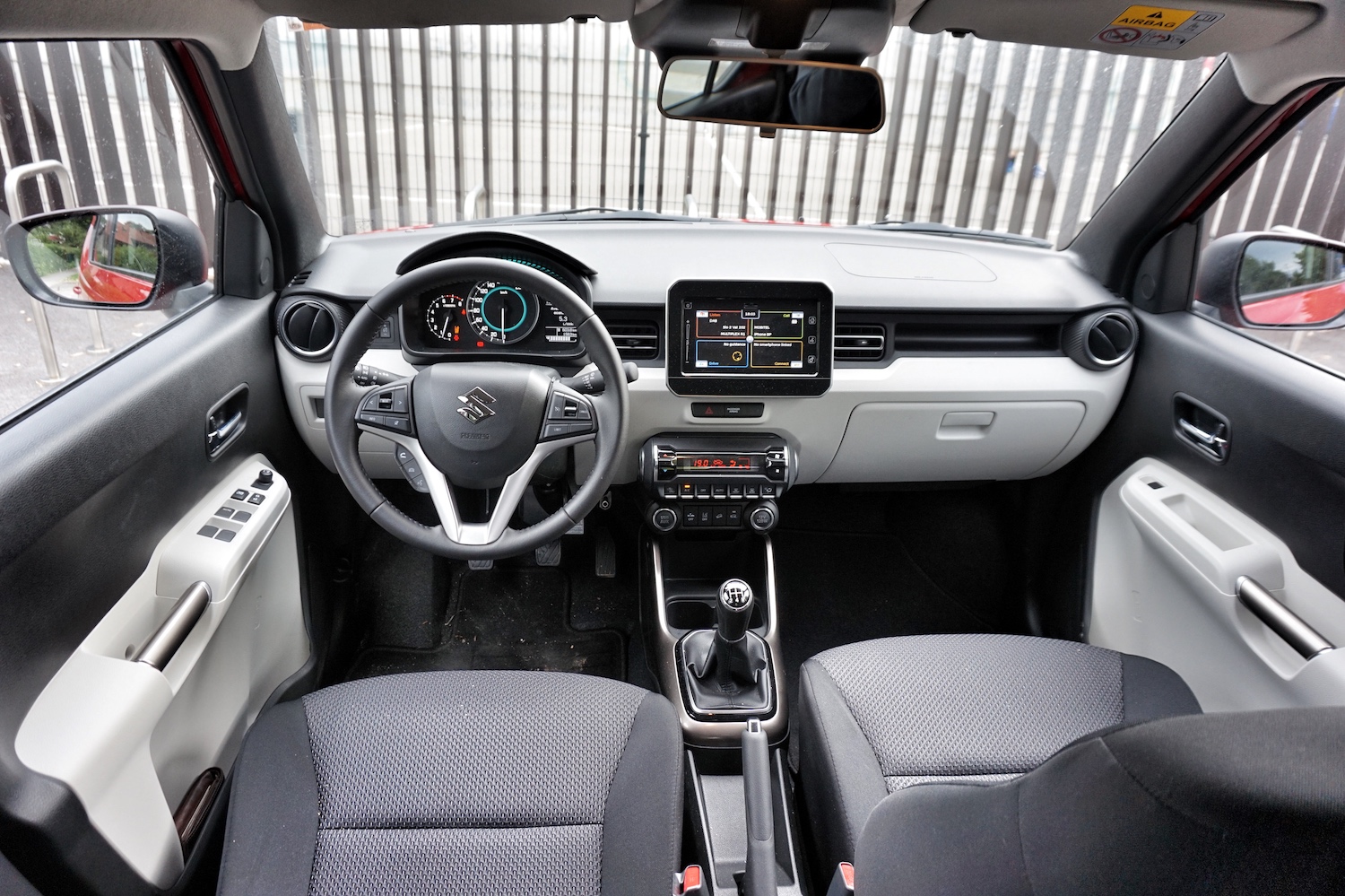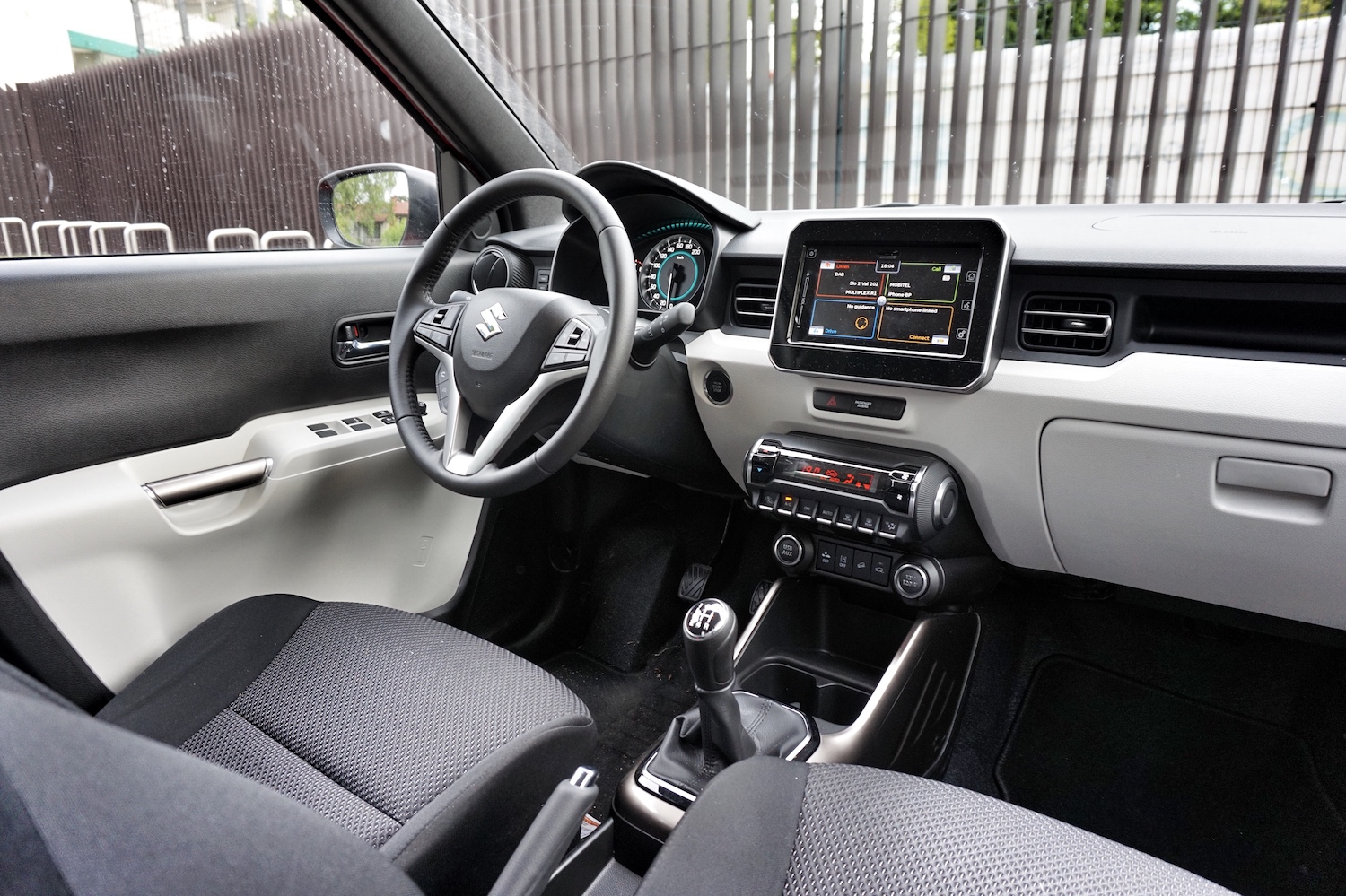 Tudi spredaj je po dolžini dovolj prostora za visokorasle voznike, a volanski obroč je nastavljiv le po višini in zato malce preveč oddaljen od voznika. To je tudi edina pripomba na počutje in ergonomijo, saj je vse ostalo na svojem mestu, pregledno izpostavljeno in lično oblikovano. Samostoječ zaslon multimedijske naprave je na pravem mestu, analogni merilniki so kombinirani z digitalnim prikazovalnikom, prestavna ročica je na pravem mestu, vidljivost iz avta pa ob velikih steklenih površinah na vse strani dobra. V ignisovi notranjosti je veliko trde plastike, a nekaj barvnih vložkov in lično oblikovanje odlično razbije monotonost in cenenost.