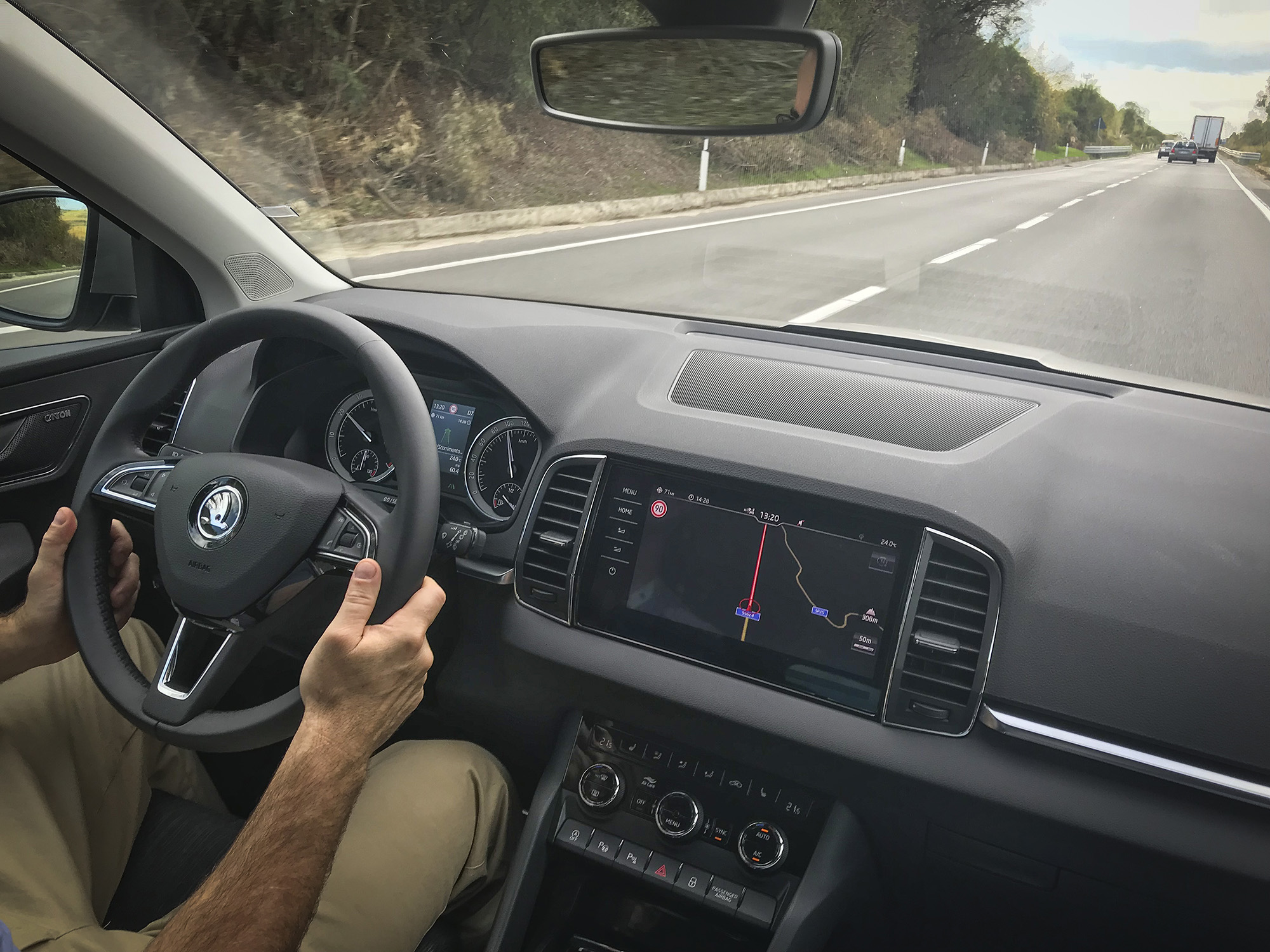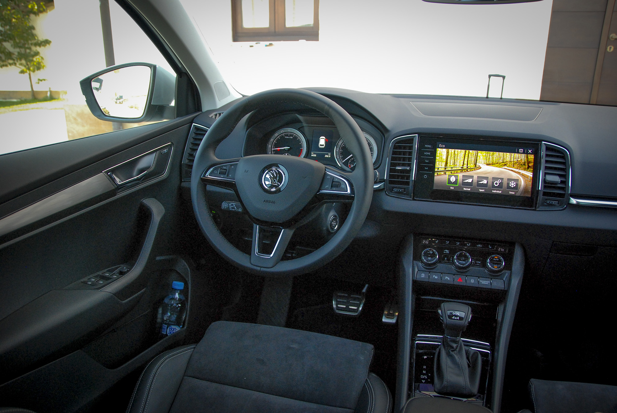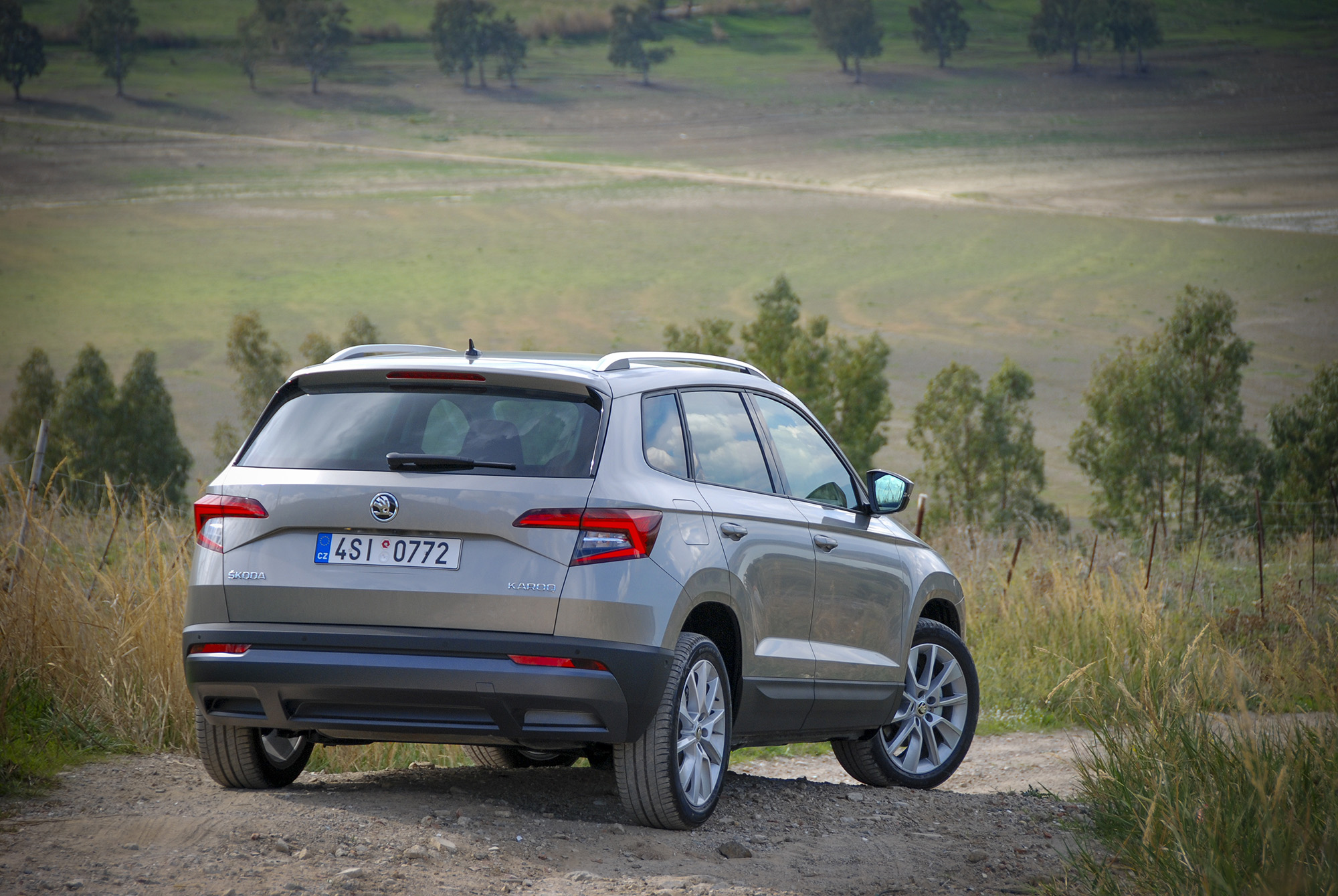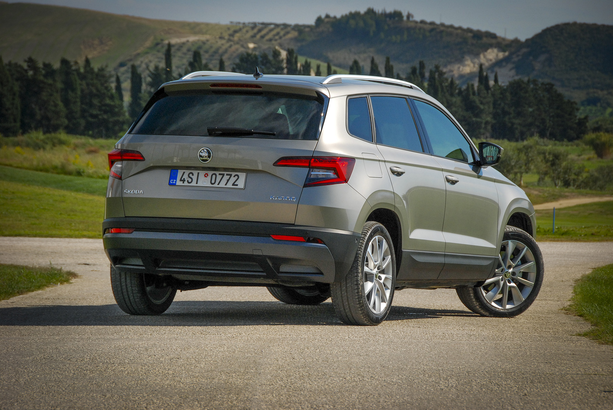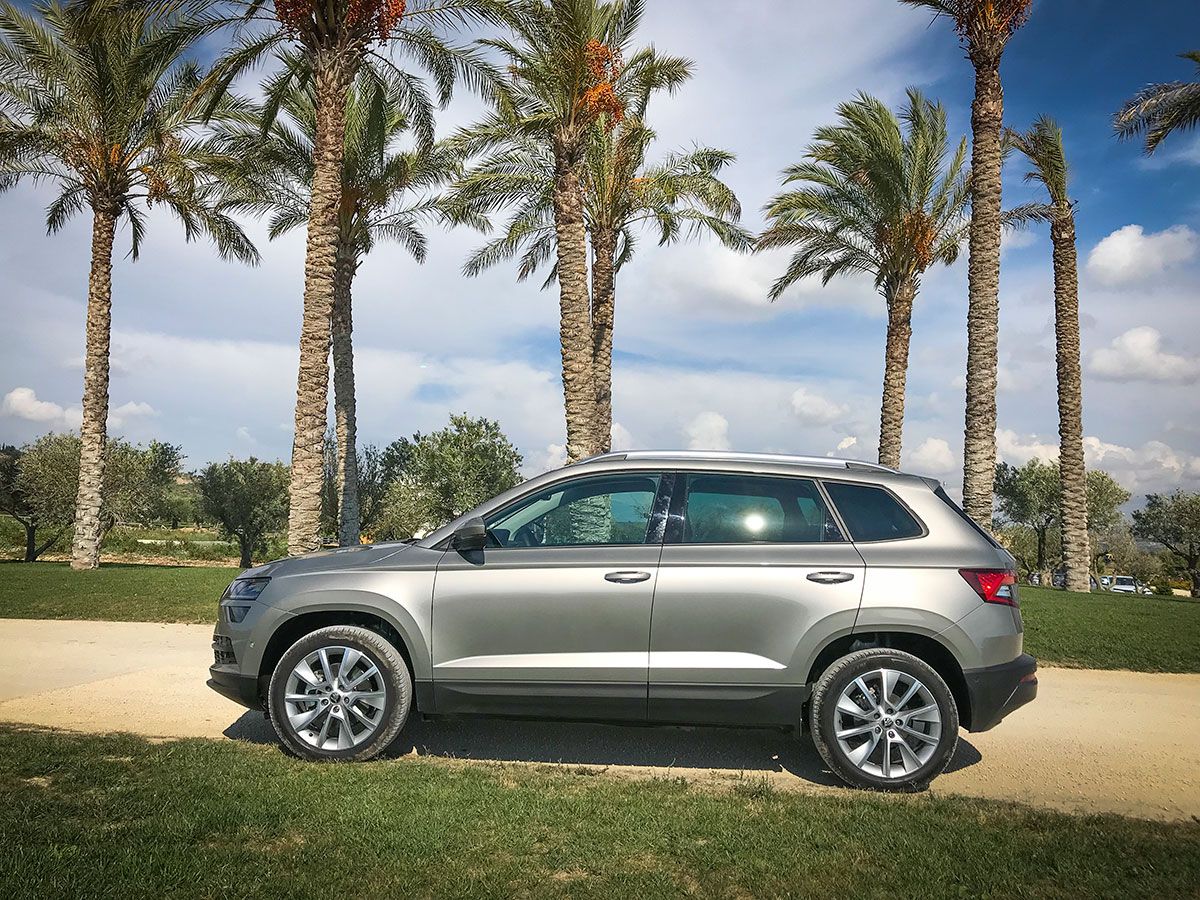 Na mestoma res zelo kočljivih in do mehanike prav nič prizanesljivih cestah Sicilije, se je karoq izkazal z odličnim blaženjem. Inženirji so temeljito nastavili podvozje, ter za vsako opremo in motor zaradi razlik v kilogramih opravili fine nastavitev, kar se še kako pozna na slabi vozni površini. Vožnja je res zelo udobna. Avto je nastavljen nekoliko bolj na mehko, čeprav je zaradi tega nagibanje pri dinamični vožnji malce bolj izrazito. Ni moteče. Treba se je zavedati da, karoq ni športni avto, se pa zna suvereno peljati ne glede na to kako kakovostna je podlaga pod kolesi. Vozno je to zagotovo eden bolj prepričljivih kompromisov v tem razredu cestnih terencev s poudarkom na dejstvu, da v ospredje postavlja udobje in zanesljivo lego. Na voljo je tudi dinamično uravnavanje podvozja s štirimi programi: varčni, običajni, športni in individualno nastavljivi.